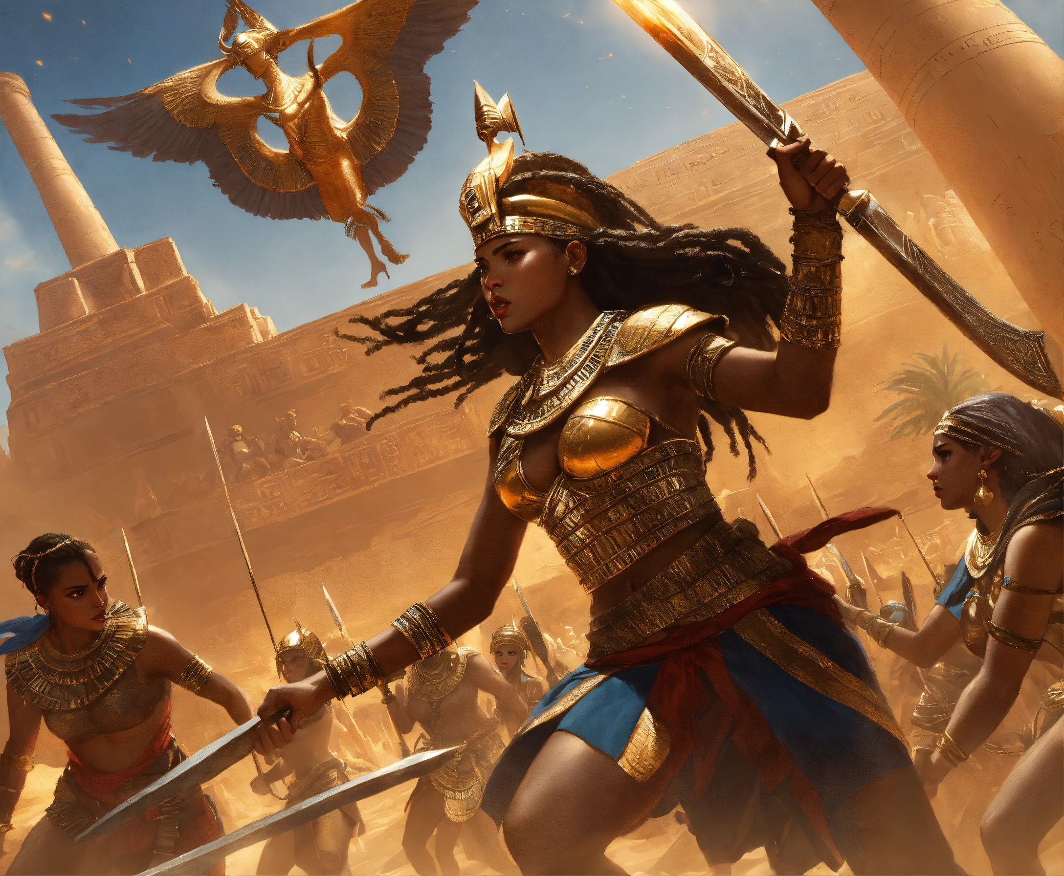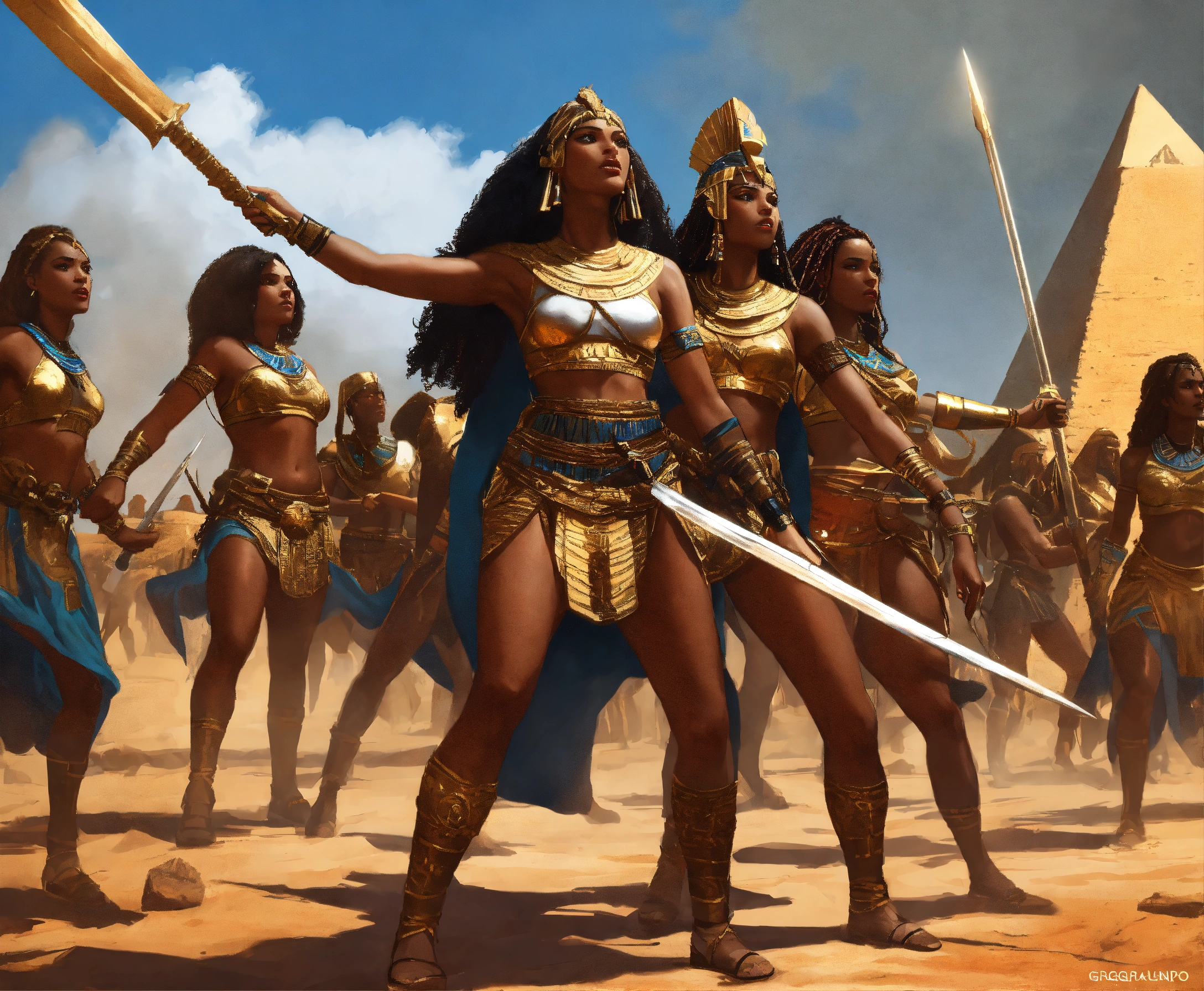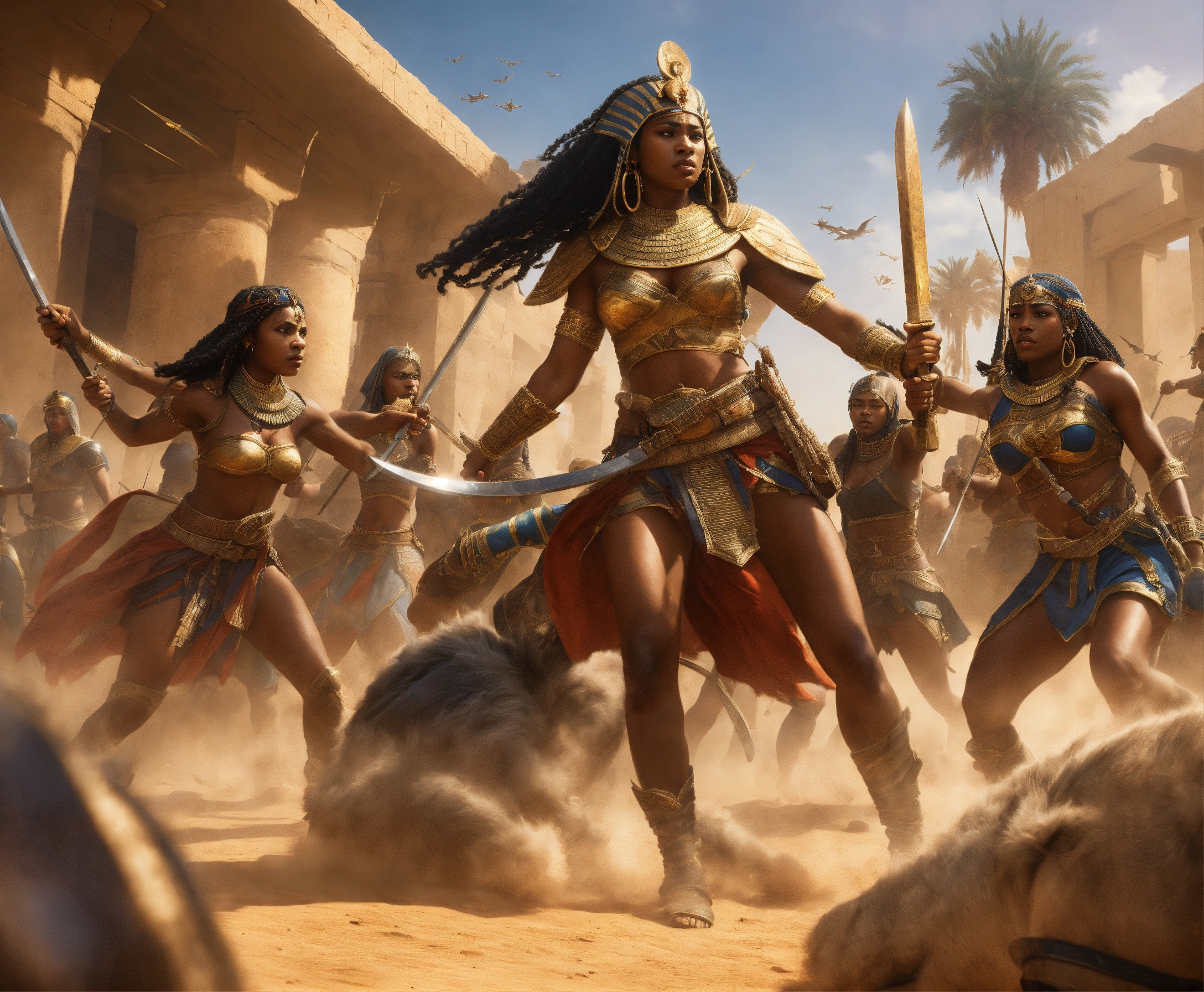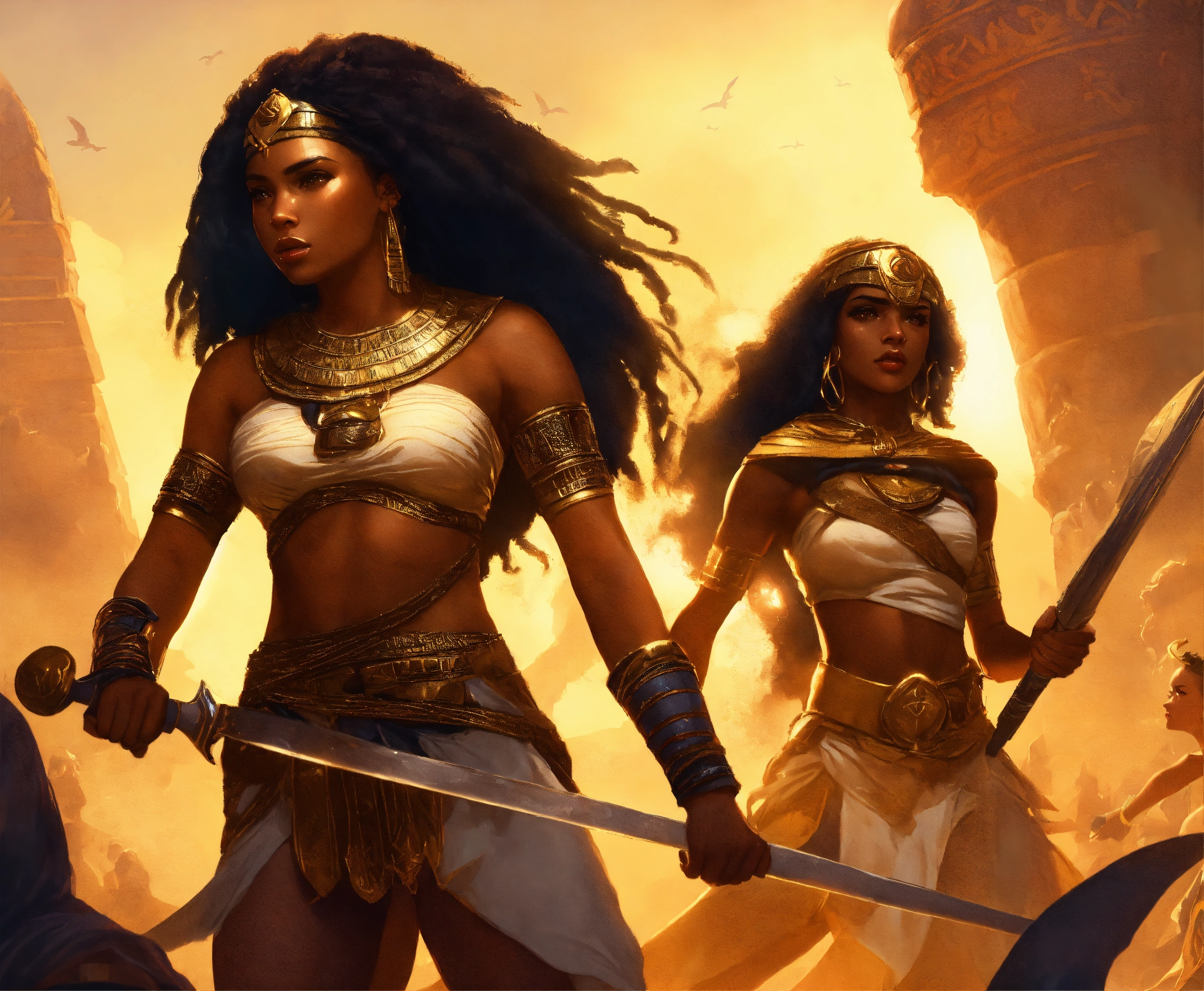 An epic fantasy scene featuring two beautiful nubian female warriors in fierce fighting with egyptian pharaon guards . cinematic view, sharp detail, greg rutkowski, boris valejo style