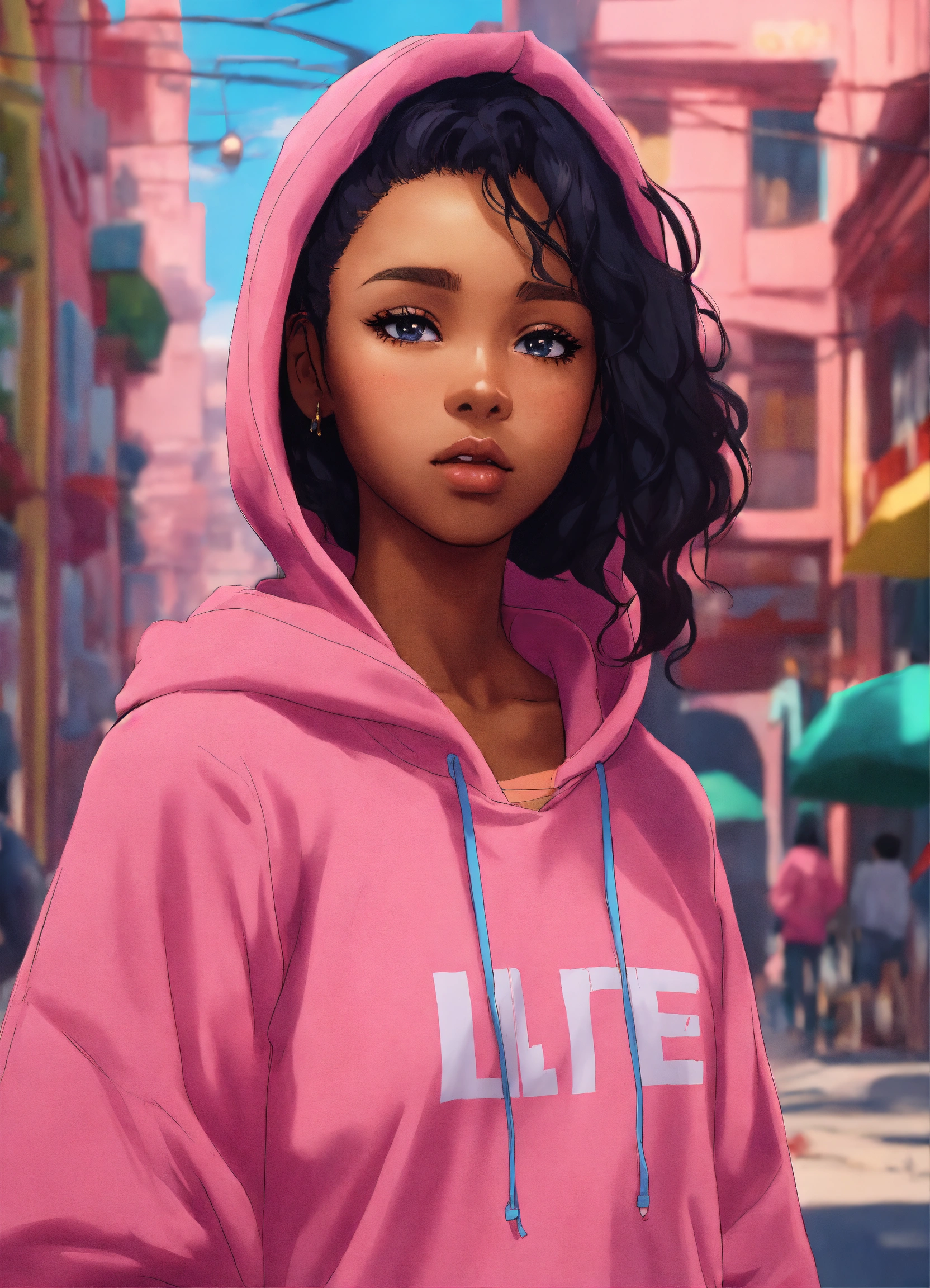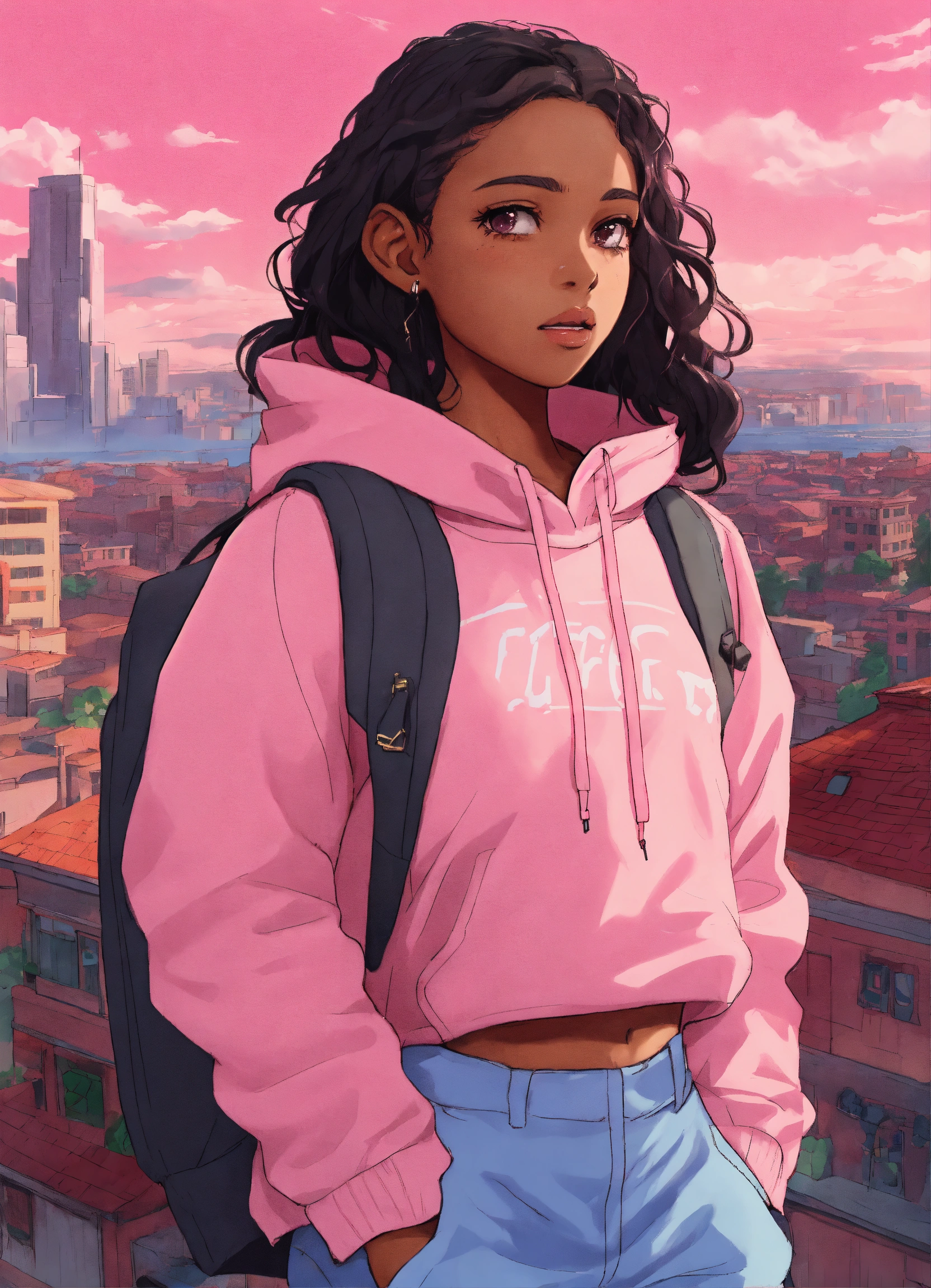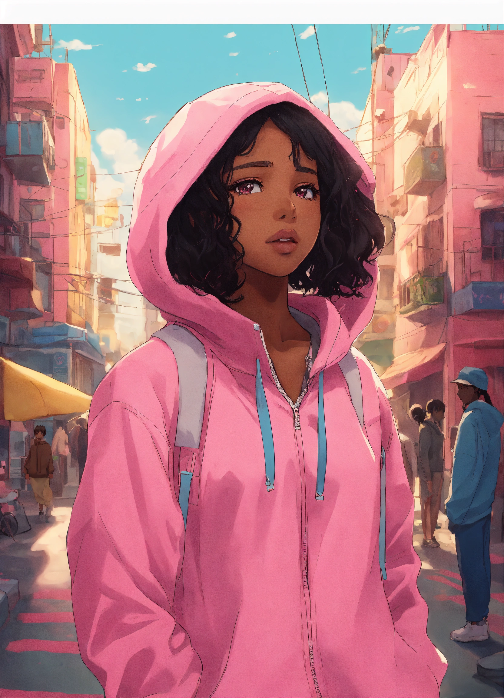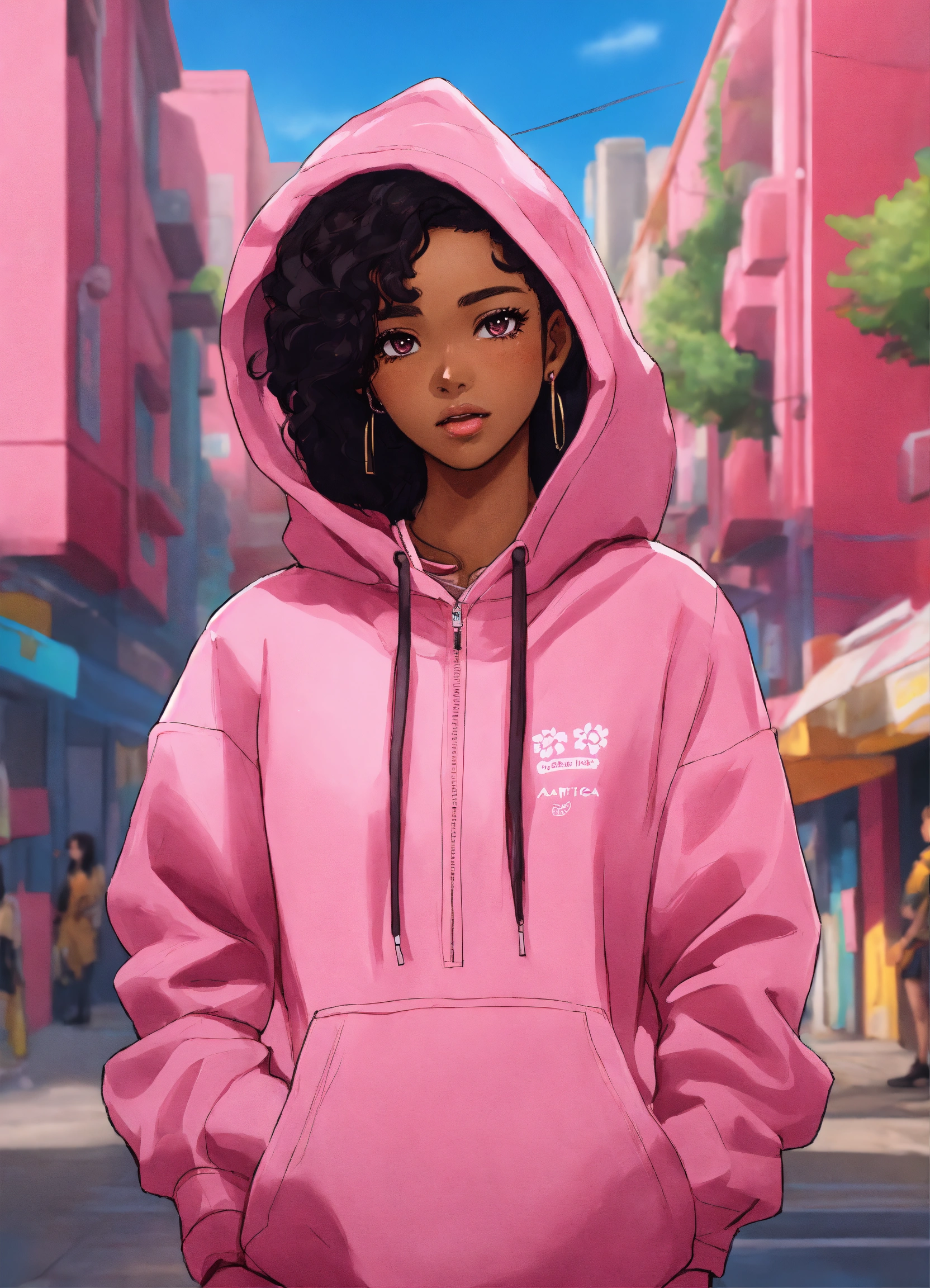 Anime; cartoon; ultra realistic; pink city, young afican girl mixed race, named laura rijo, wearing pink hoodie, wavy black hair; in a anime city, ultra realistic, toca boca life world perfect, no imperfection, 4k, sad, chocked