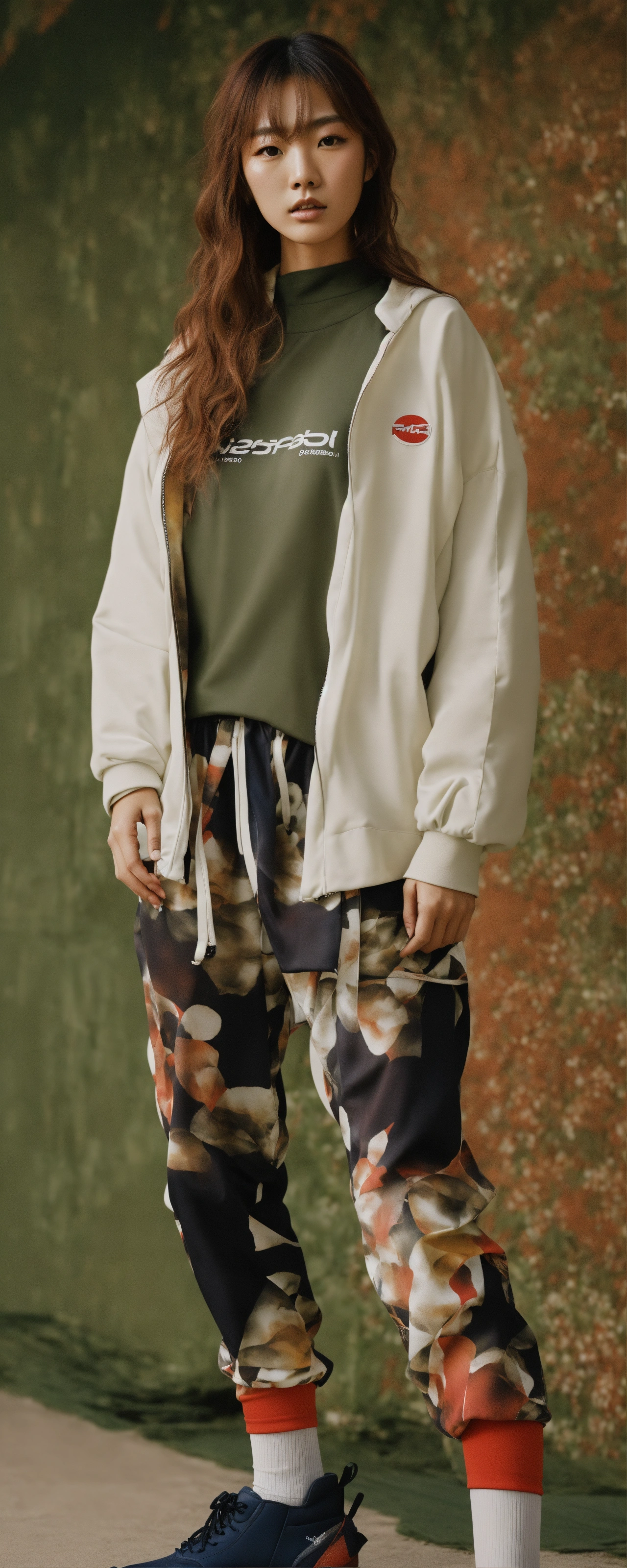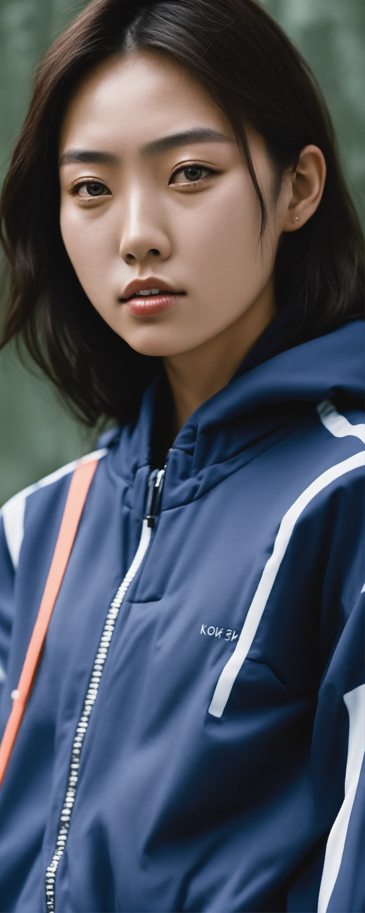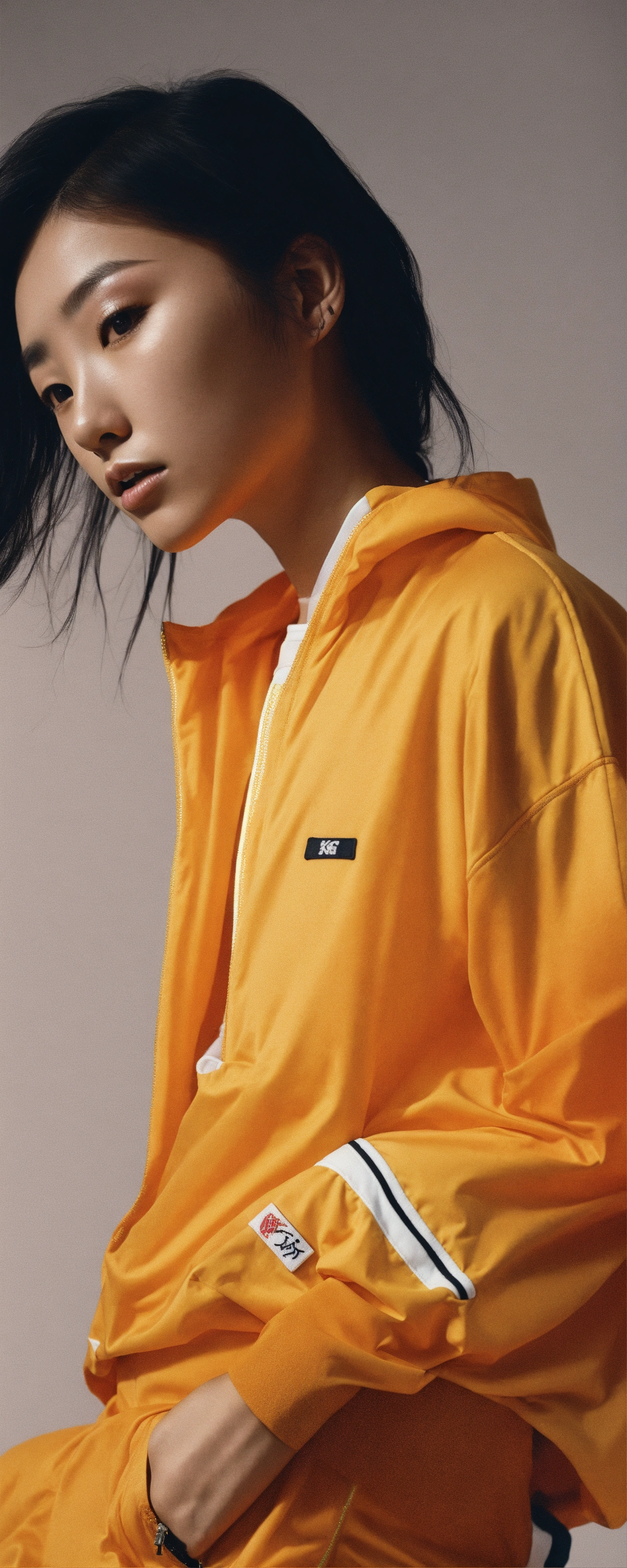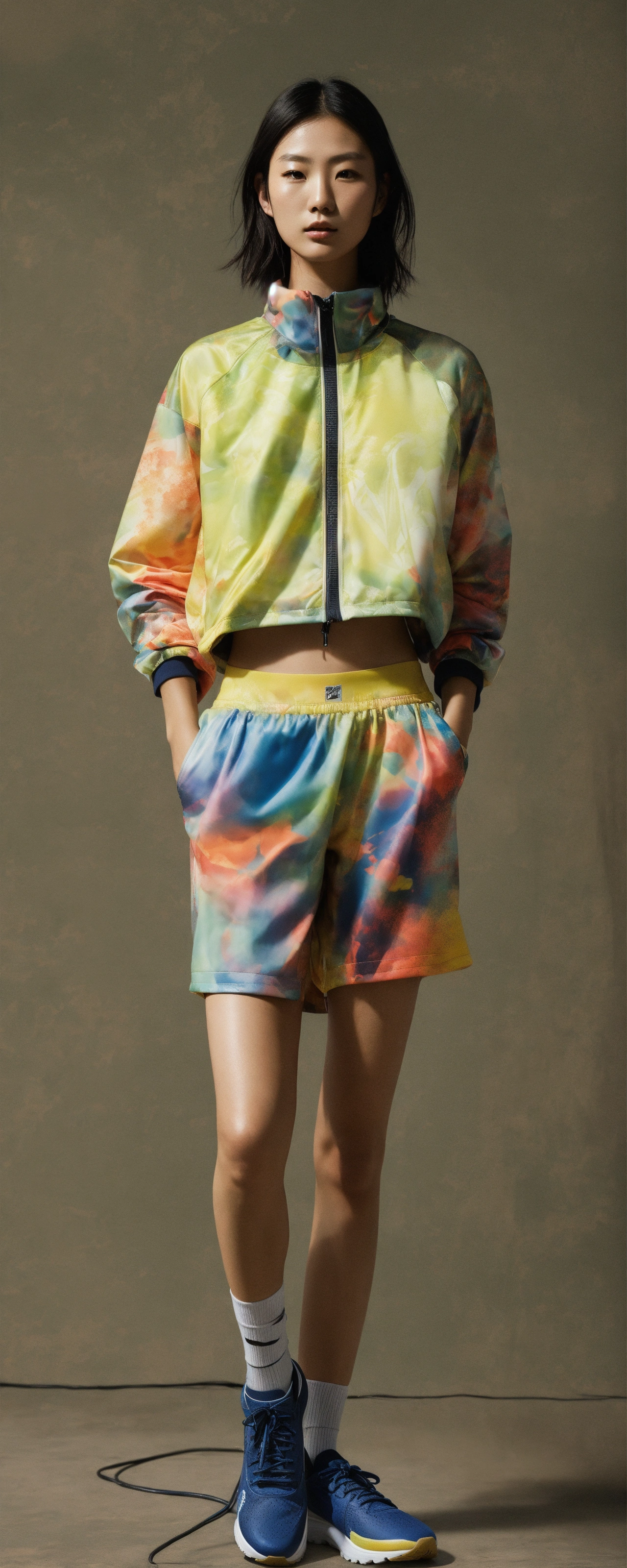 A hyper-realistic photo emulsion transfer of a japanese fashion model in a very creative and unique sportswear outfit, very minimal, 256k, no text.