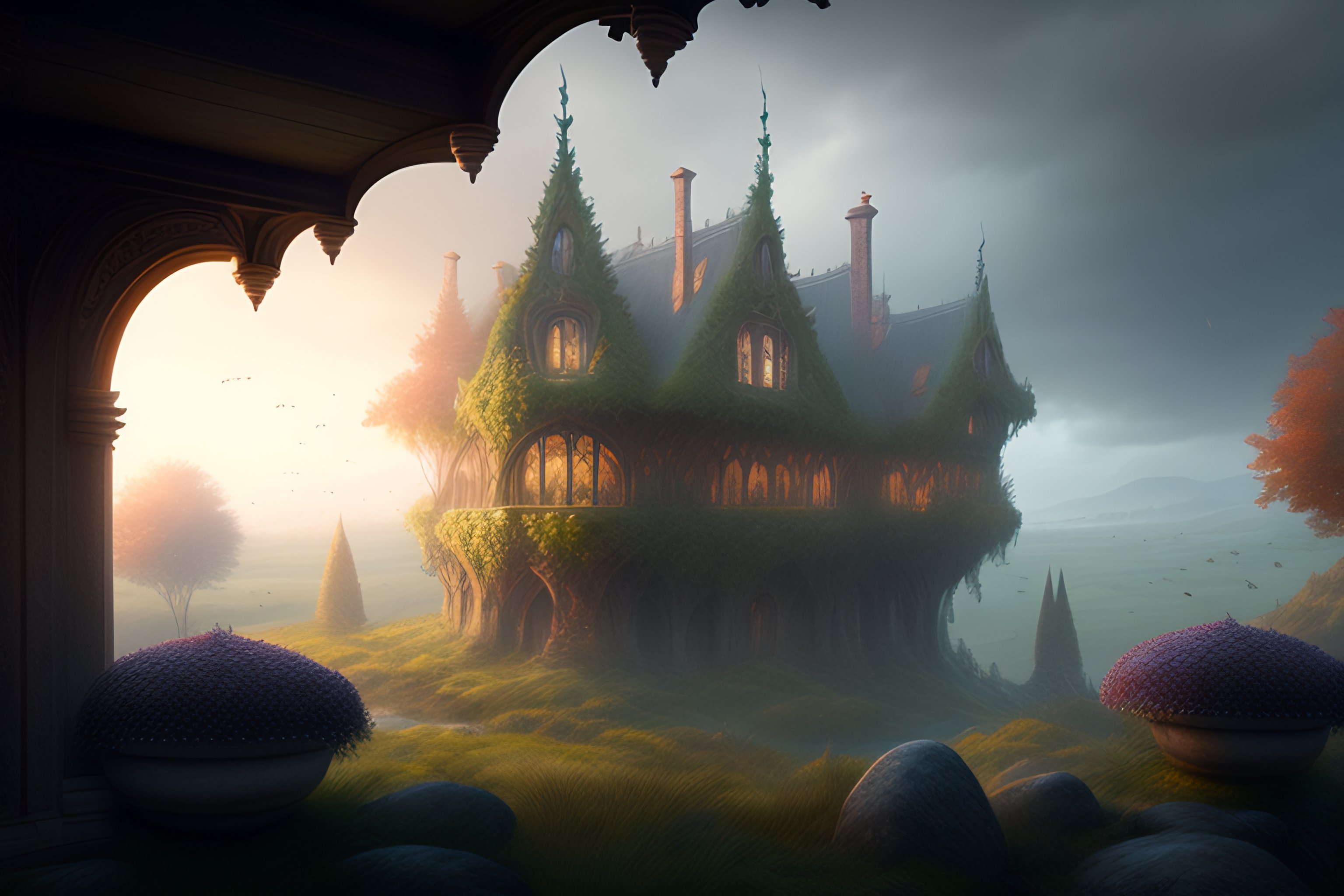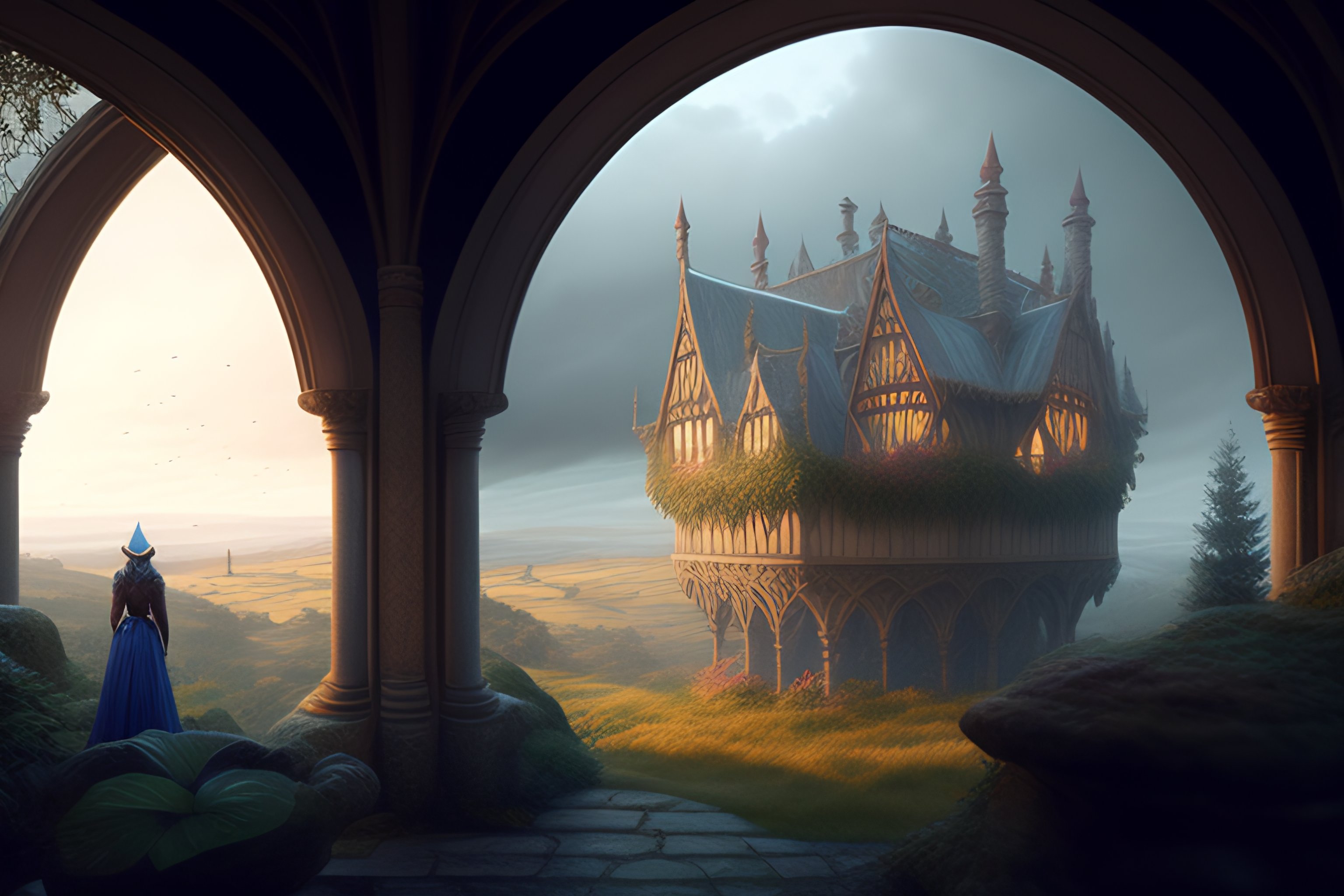 Interior fantasy elven castle looking out window, hyper detailed, rolling hills, buildings, rain, matte painting by marc simonetti, jonathan solter, greg rutkowski, masterpiece, cinematic, hyperdetailed, photorealistic, hyperrealism, architecture, aerial view
