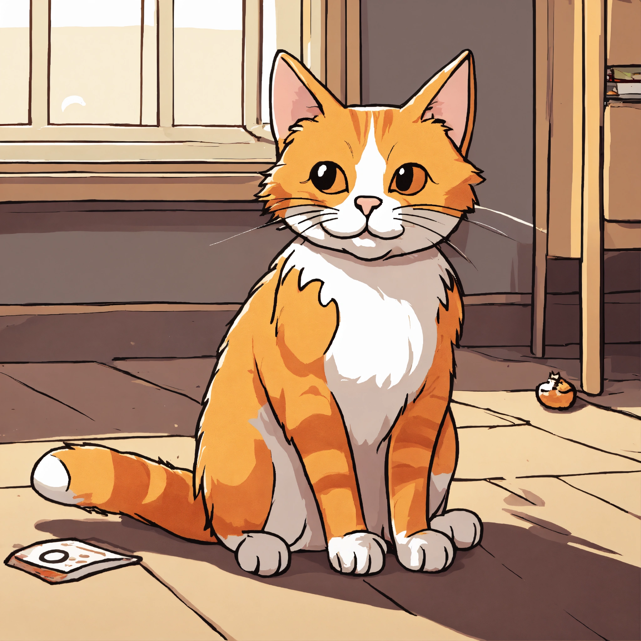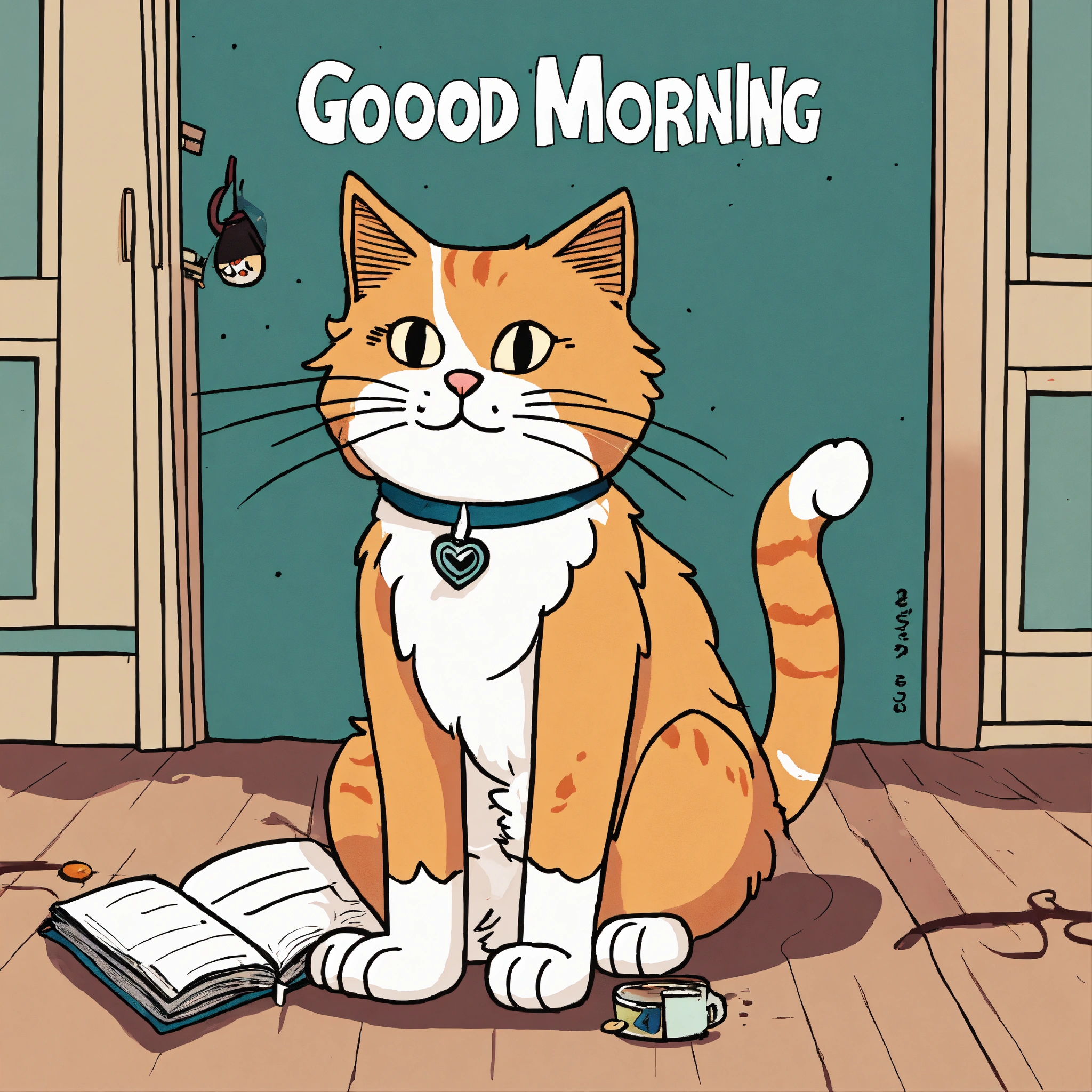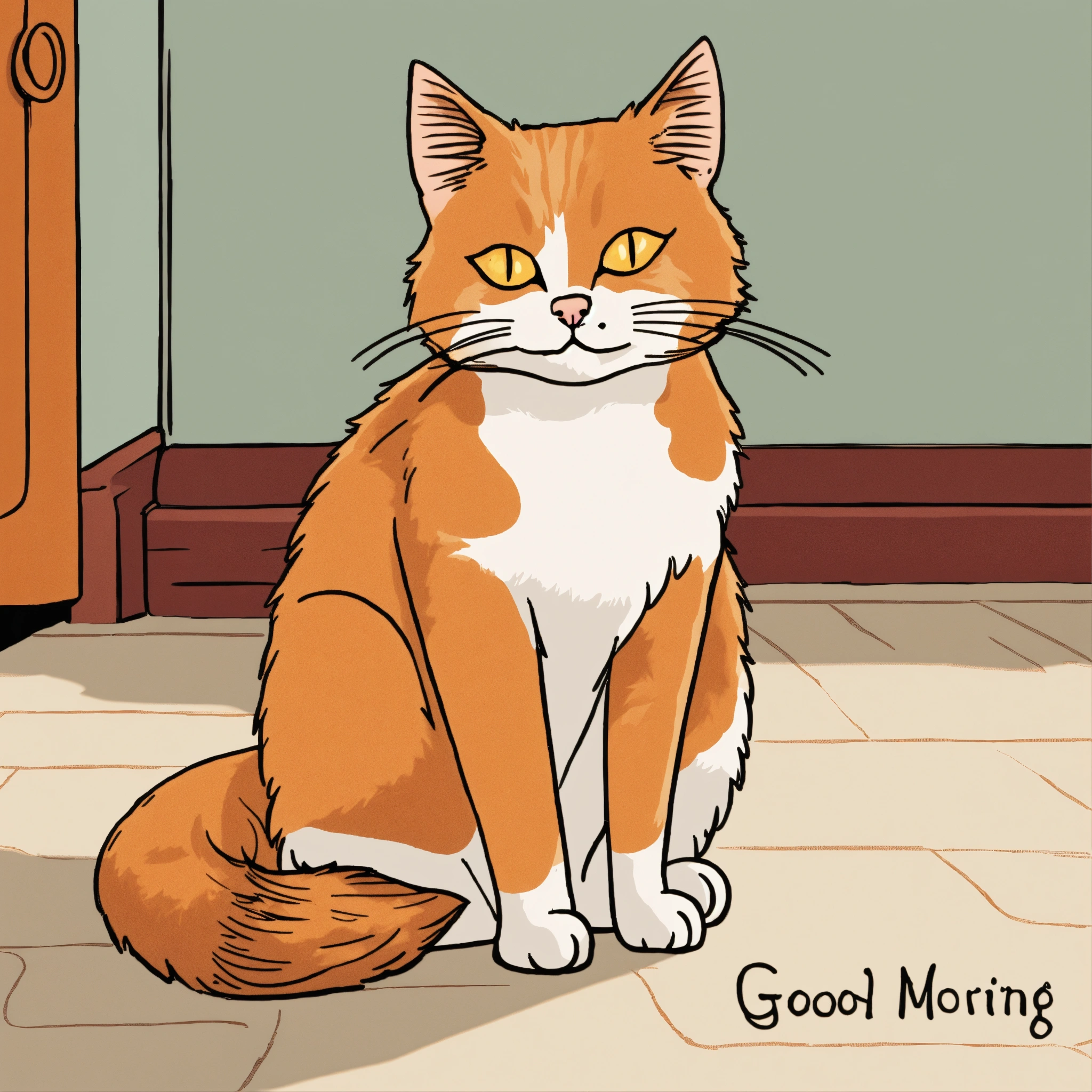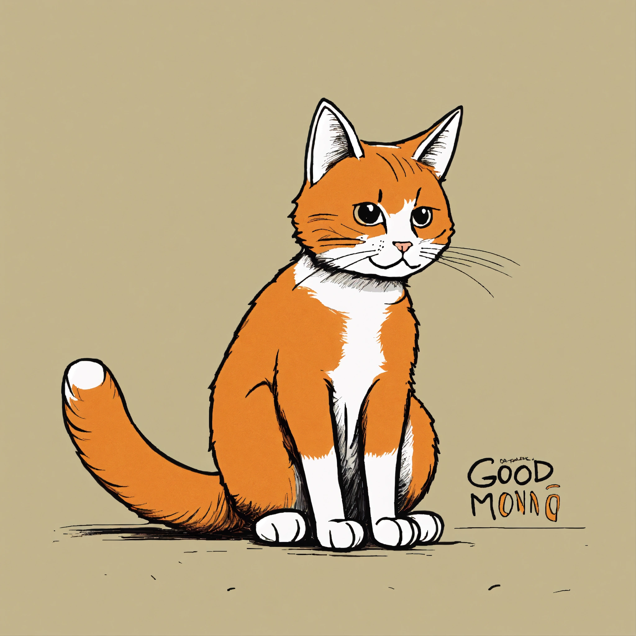An ink drawn ginger and white cartoon cat sitting upright on the floor, text under cat reads 'good morning', 8k