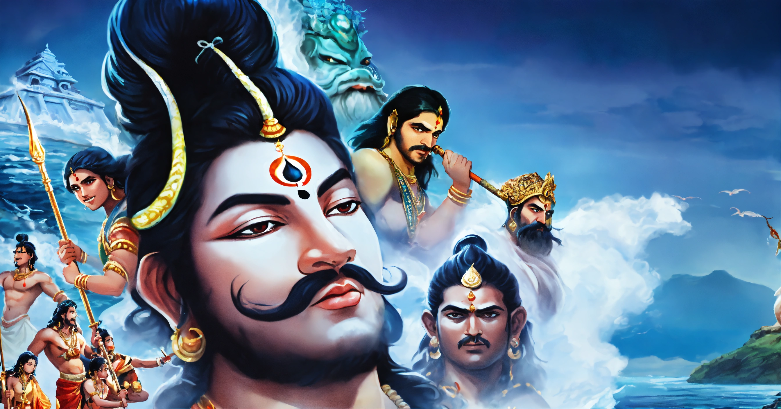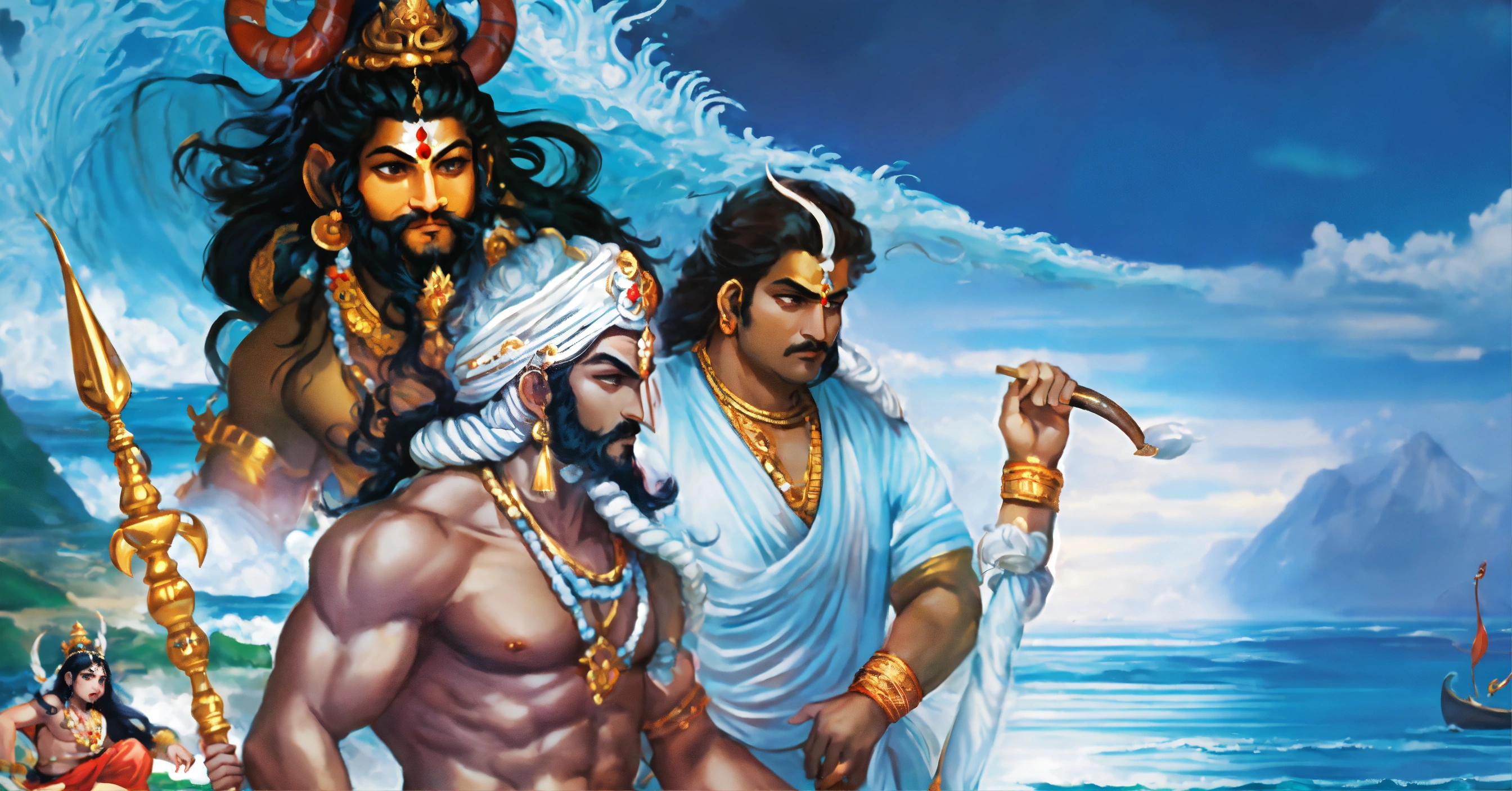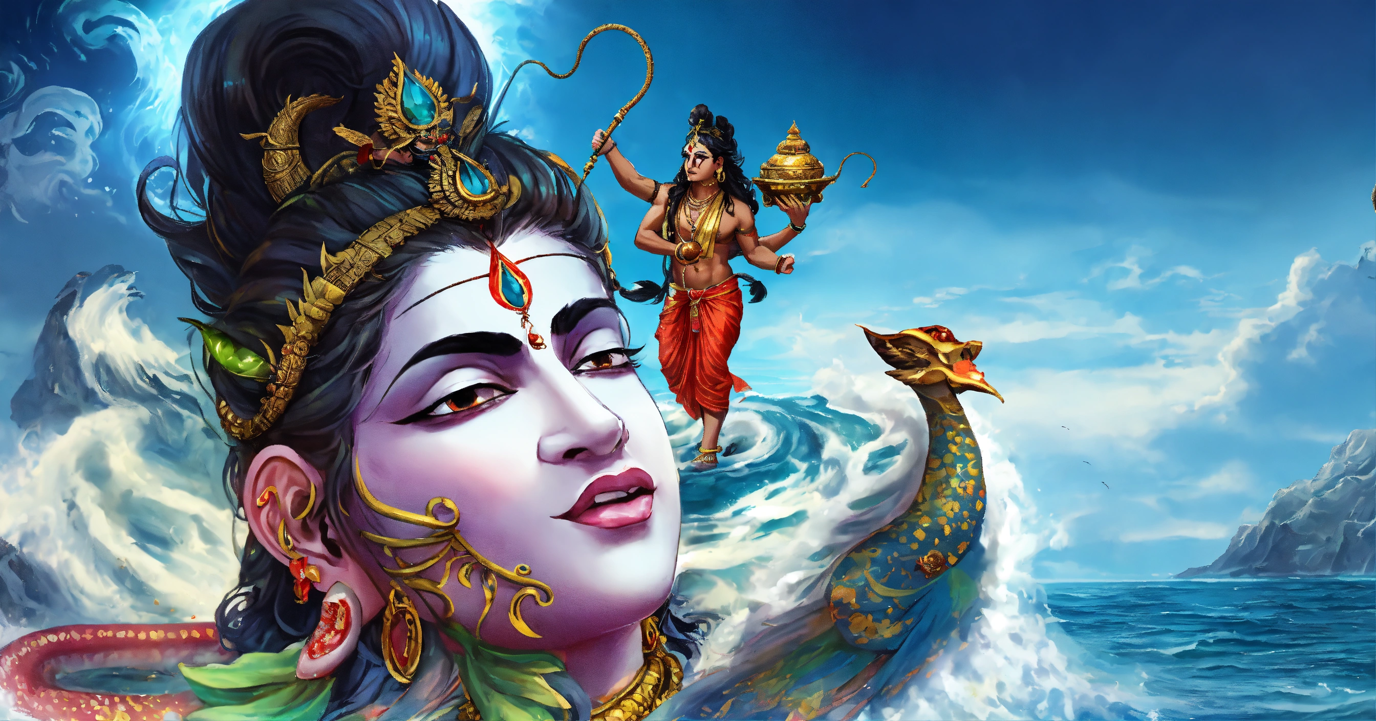 Create an illustration of a mesmerizing indian mythological scene with gods and demons gathered around the ocean, where the gods and demons stand together, ready to embark on their quest to extract the elixir of immortality as the massive mount mandara with the three headed serpent vasuki wrapped around it, ready for the churning, create a visual representation of the dangerous halahala poison emerging from the churning ocean, threatening the world and render an image of lord shiva with a blue throat after consuming the venomous halahala poison.