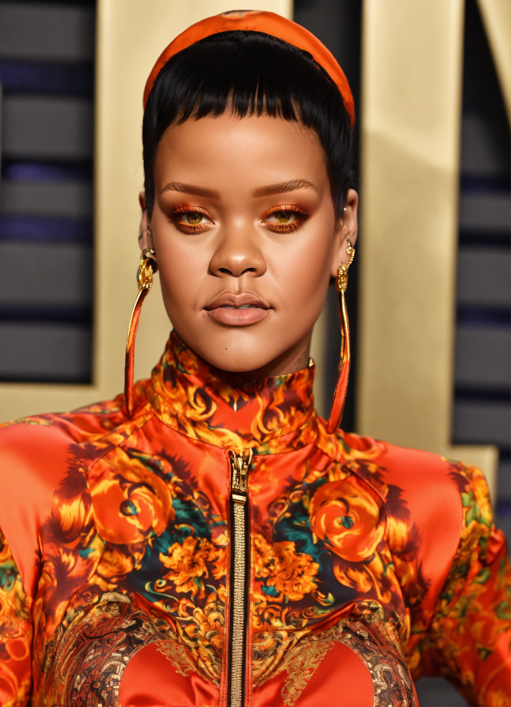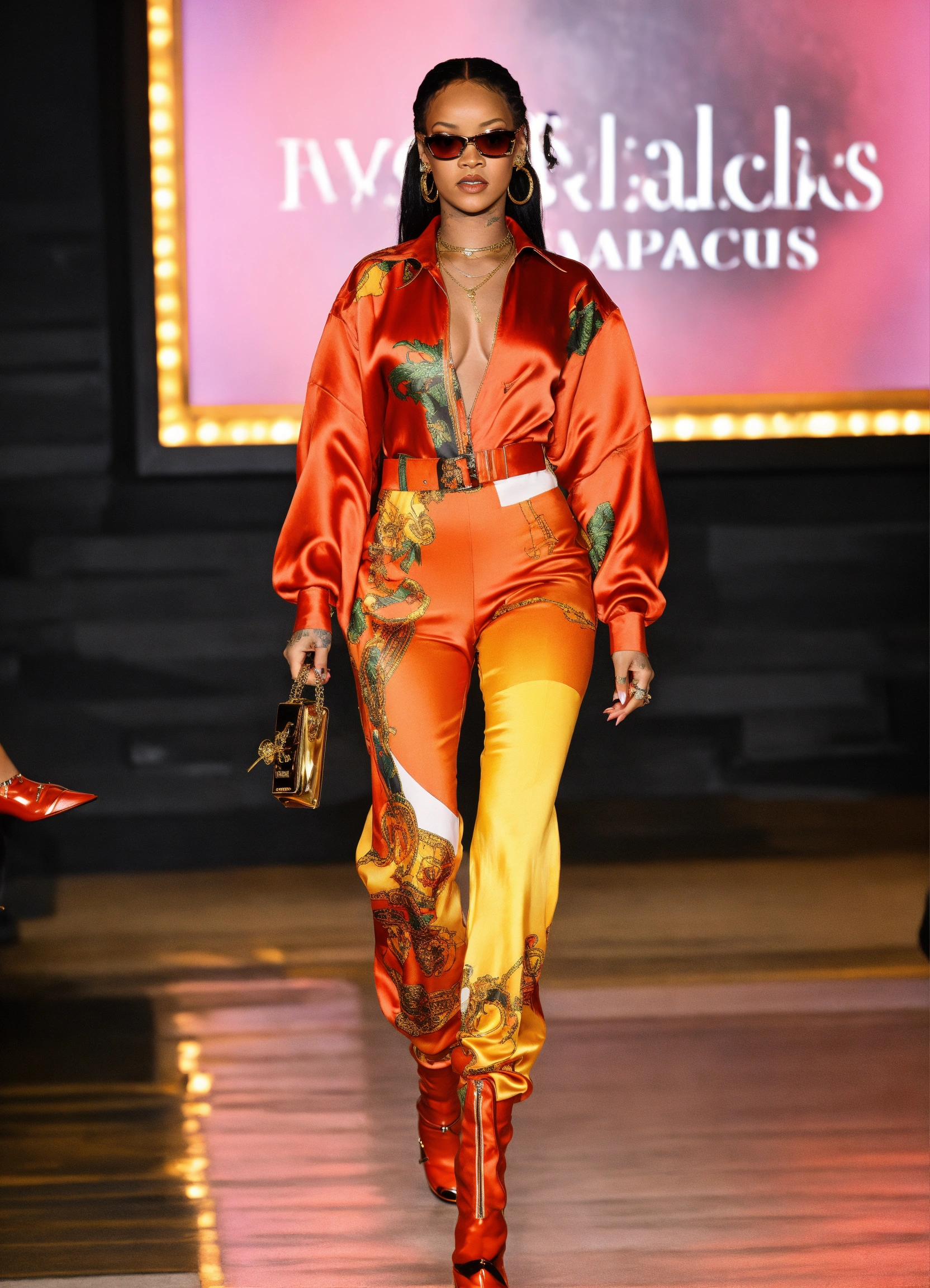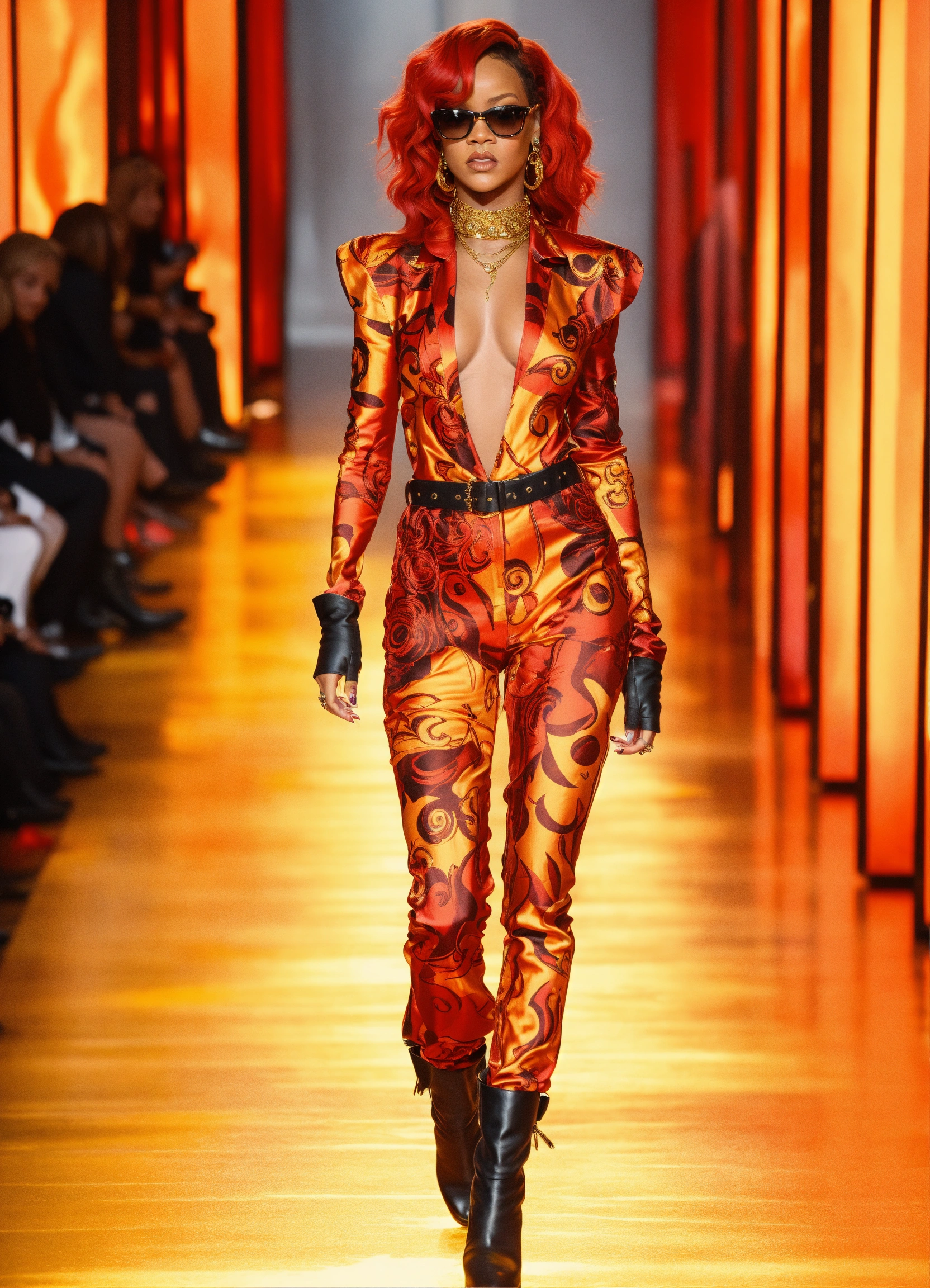 Rihanna glamorous red and orange versace printed fire style silk bodysuit with pants and heeled boots