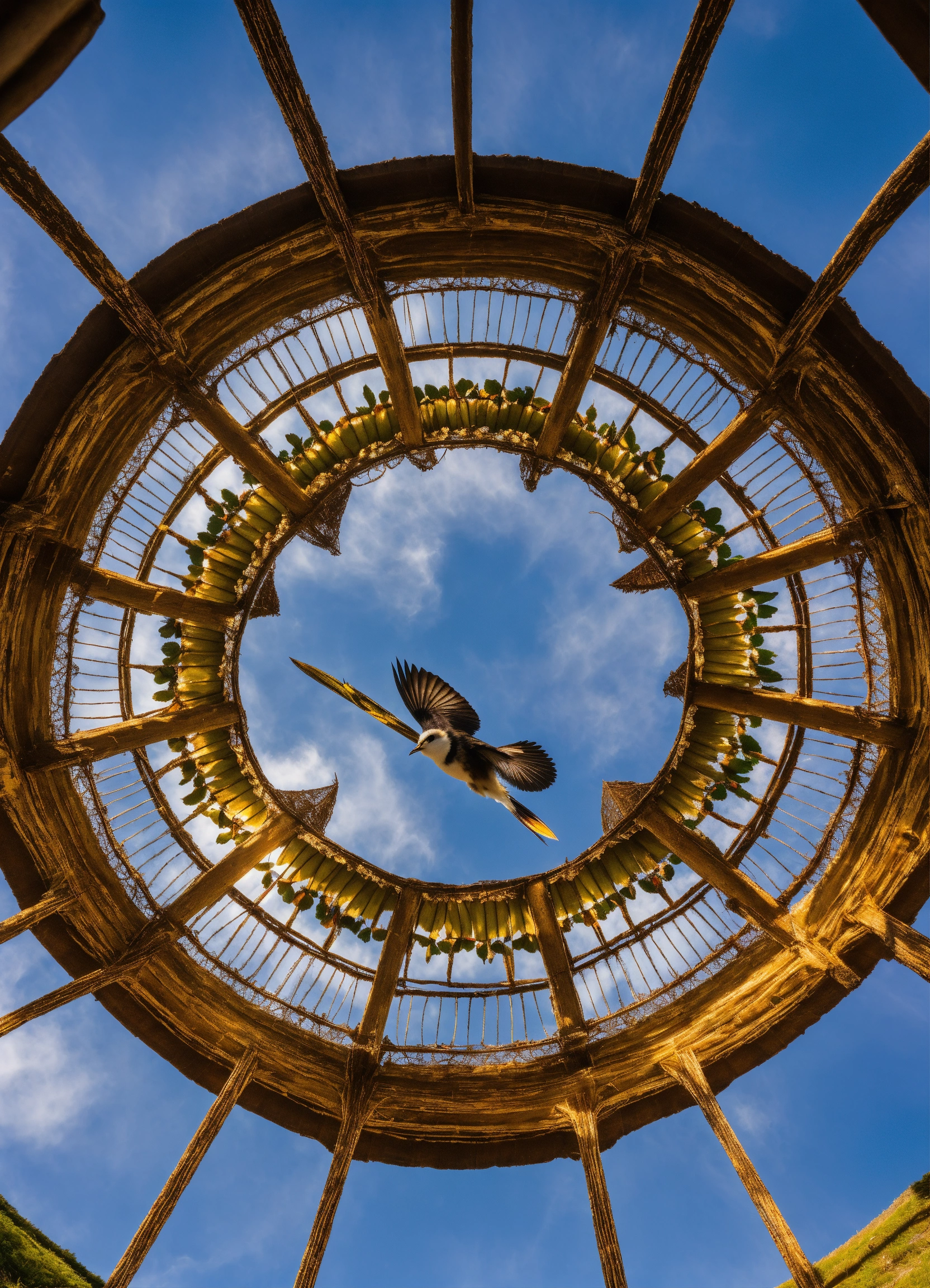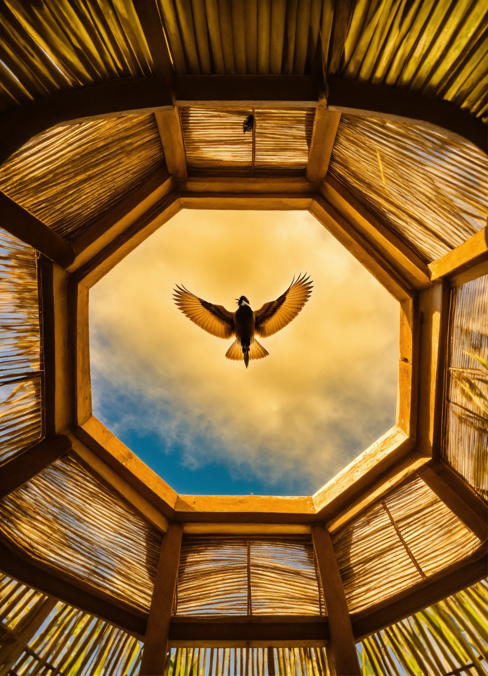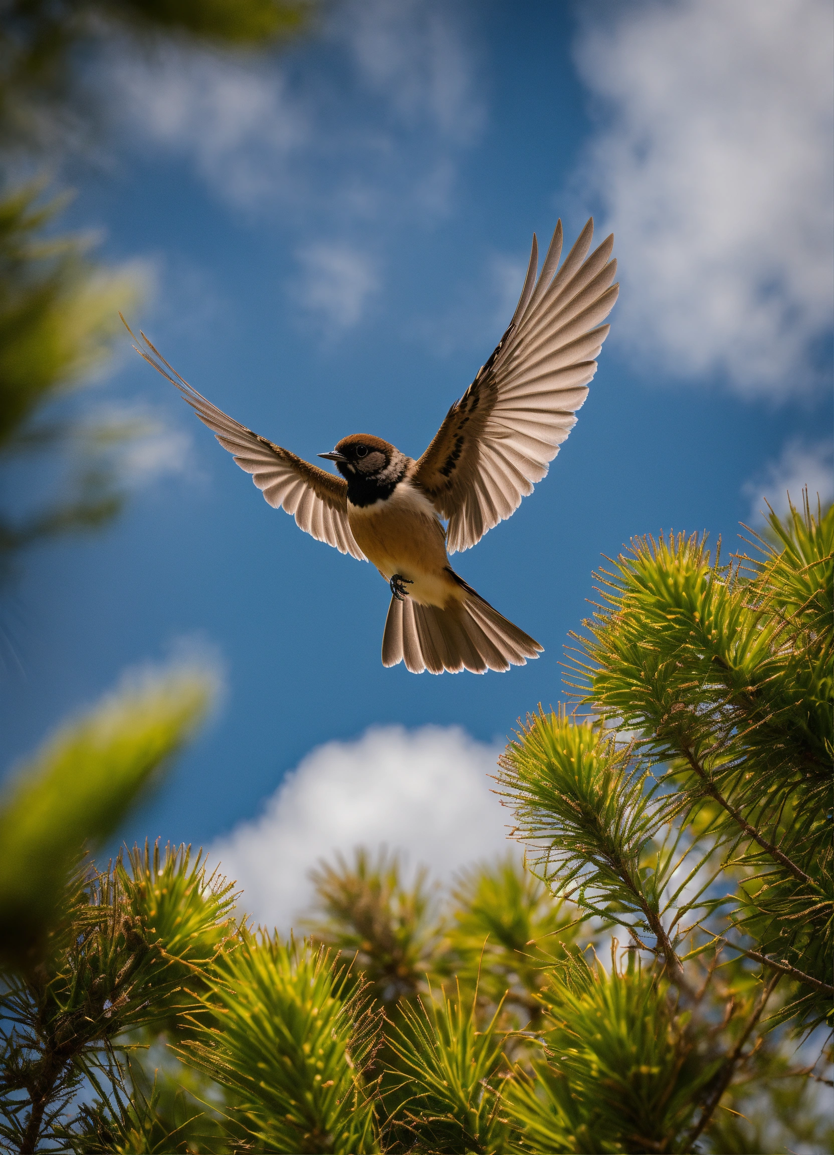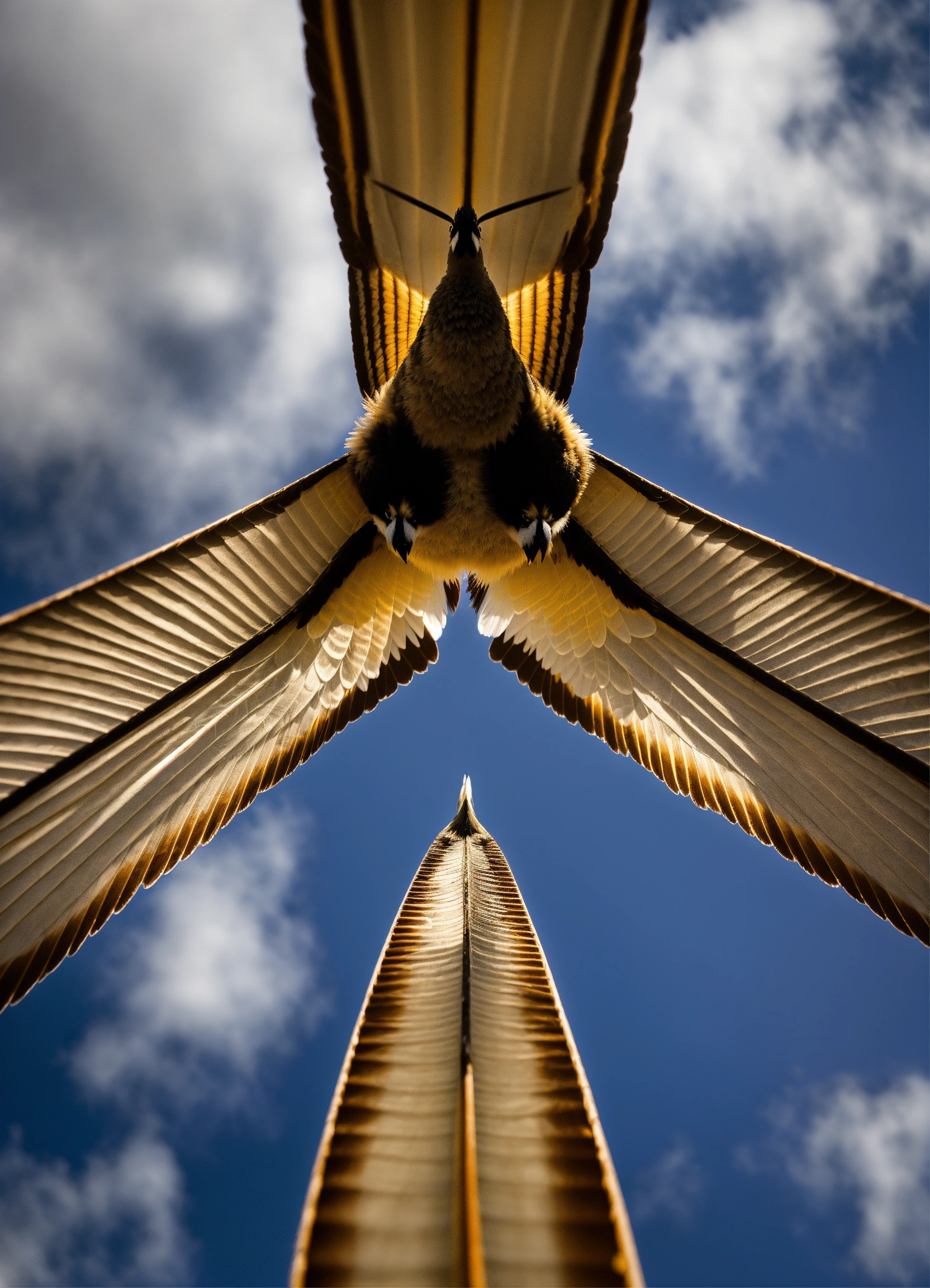 Underside of piwakawaka fantail nz bird flying photo symmetrical sky from below