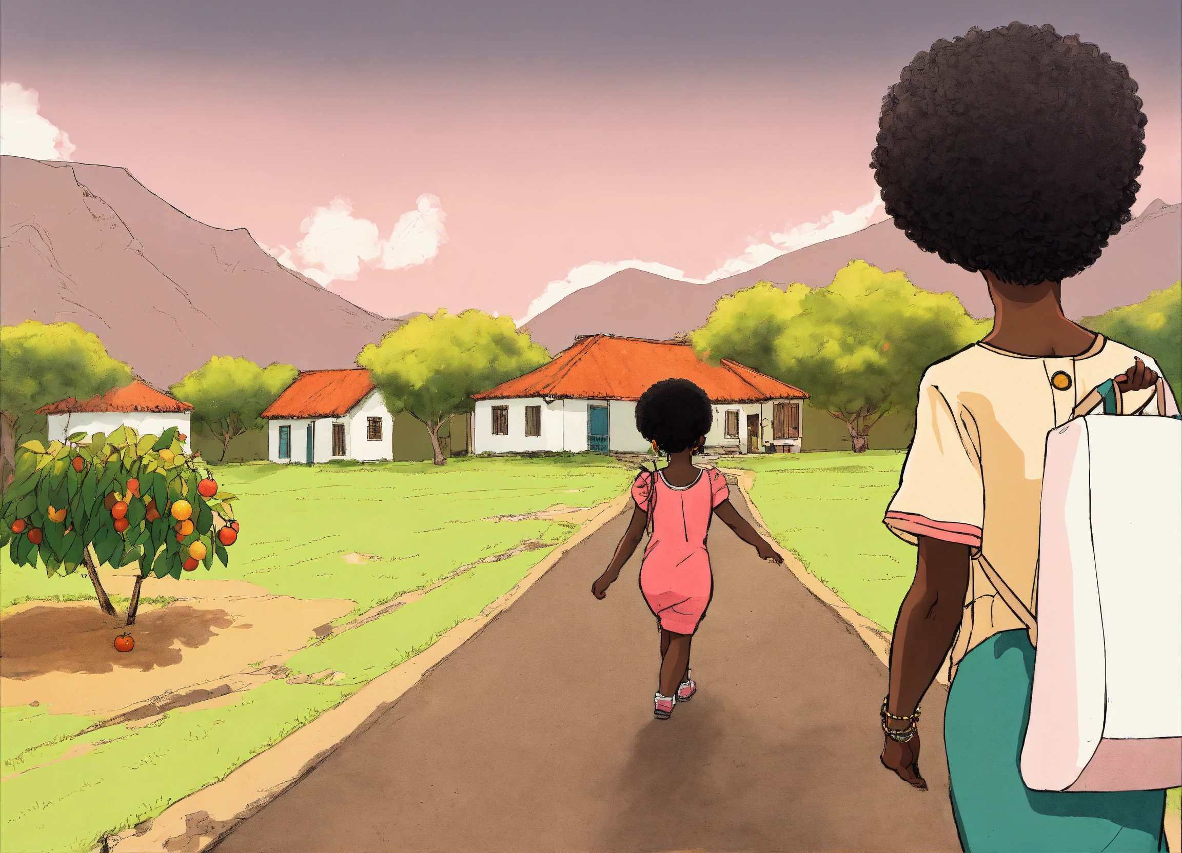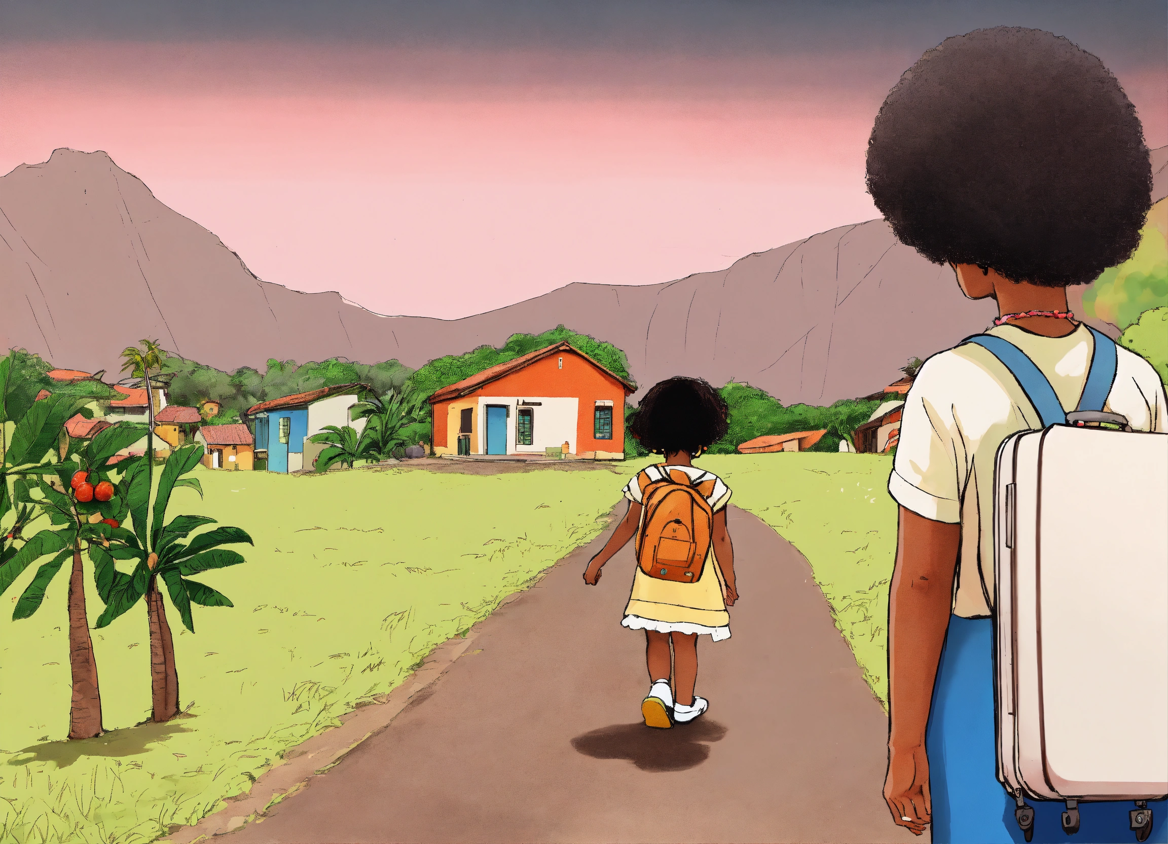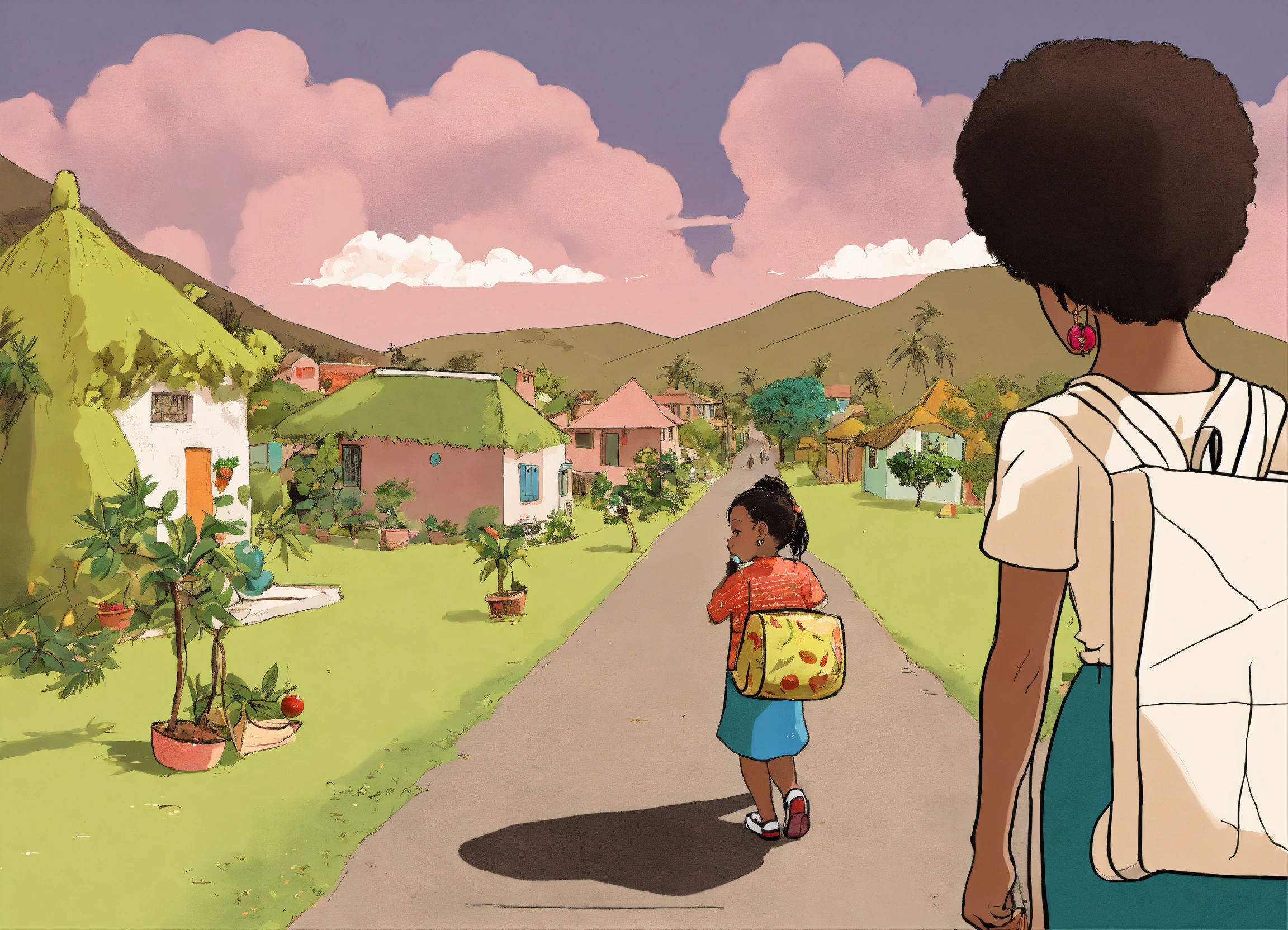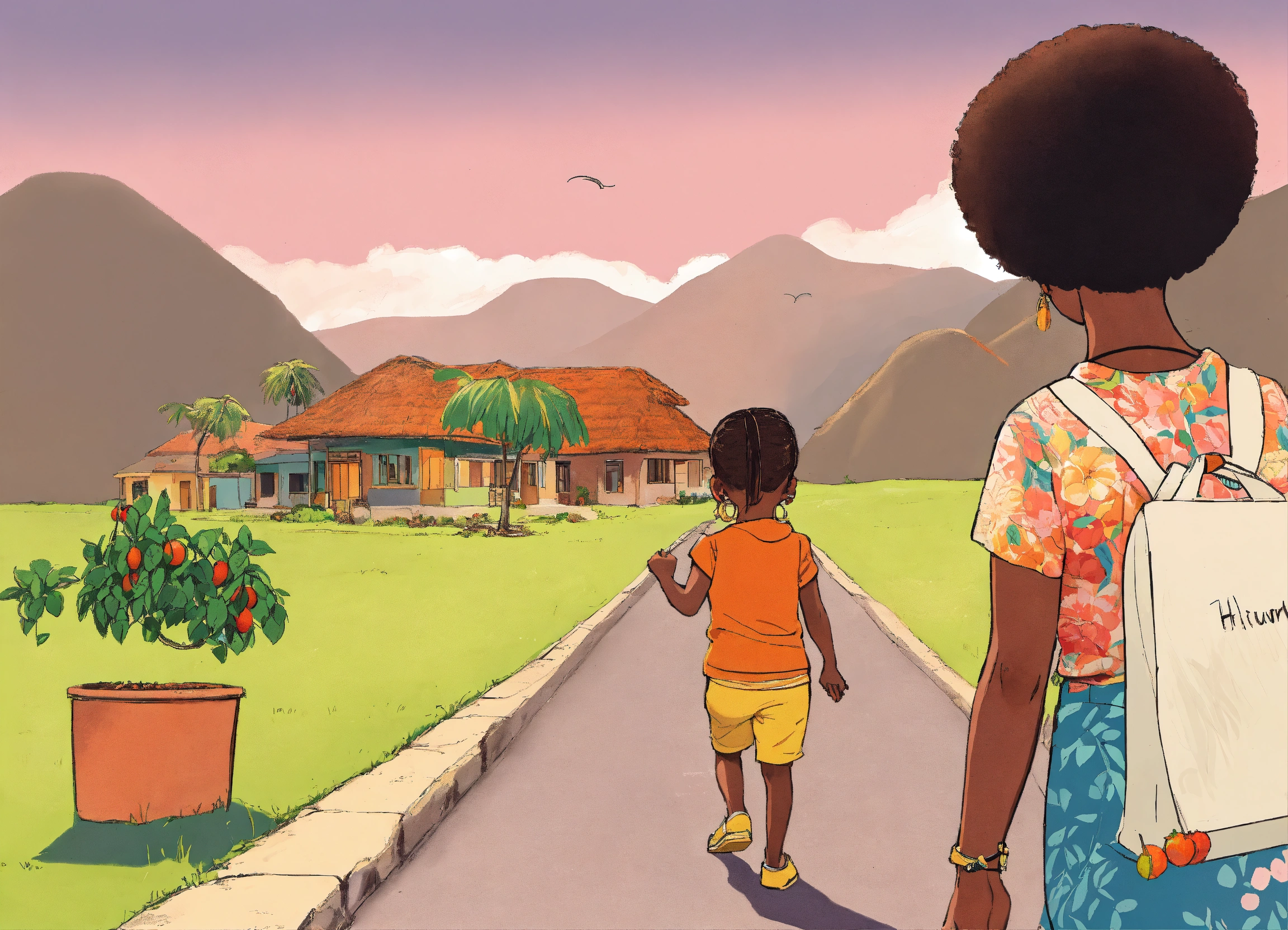 Cartoon of three year old wearing bird earring feathers walking with her mum holding her mum’s hand as they walk the streets of carribean montserrat pulling their suitcases whilst admiring the detached carribean homes each house with three fruit trees and fruit on the grass