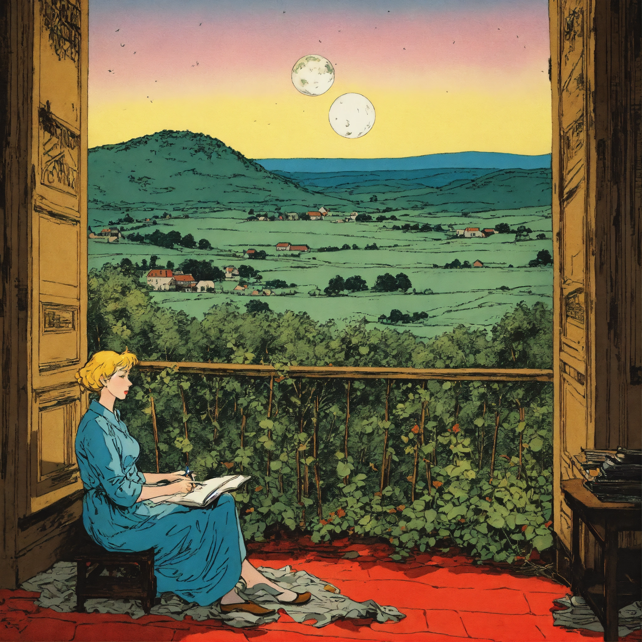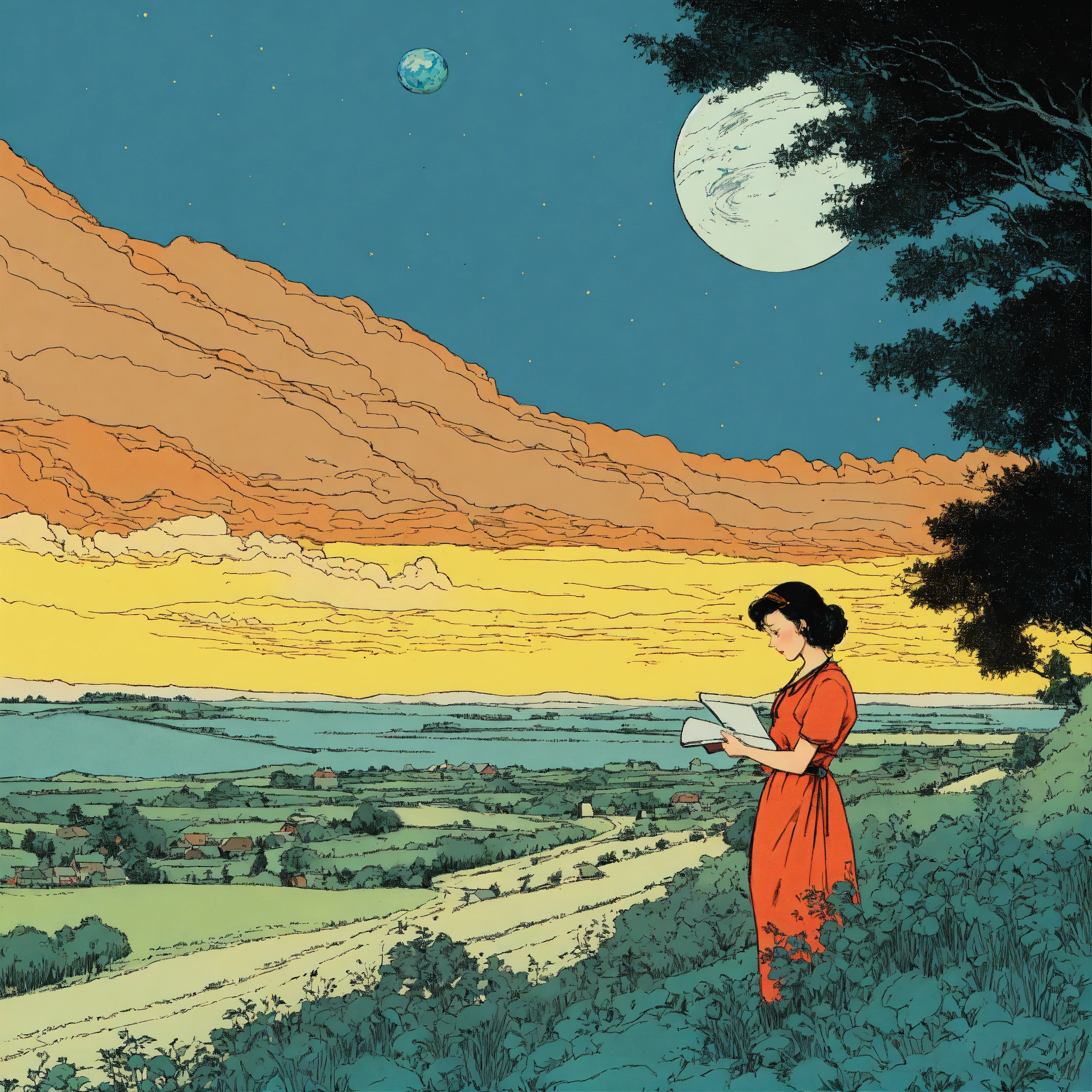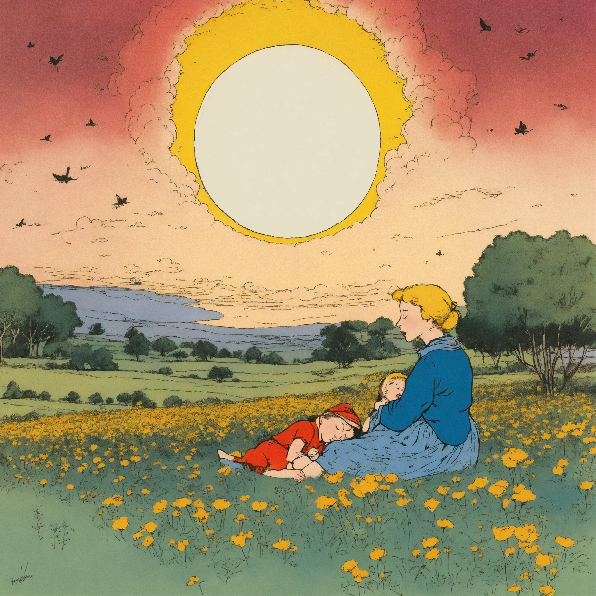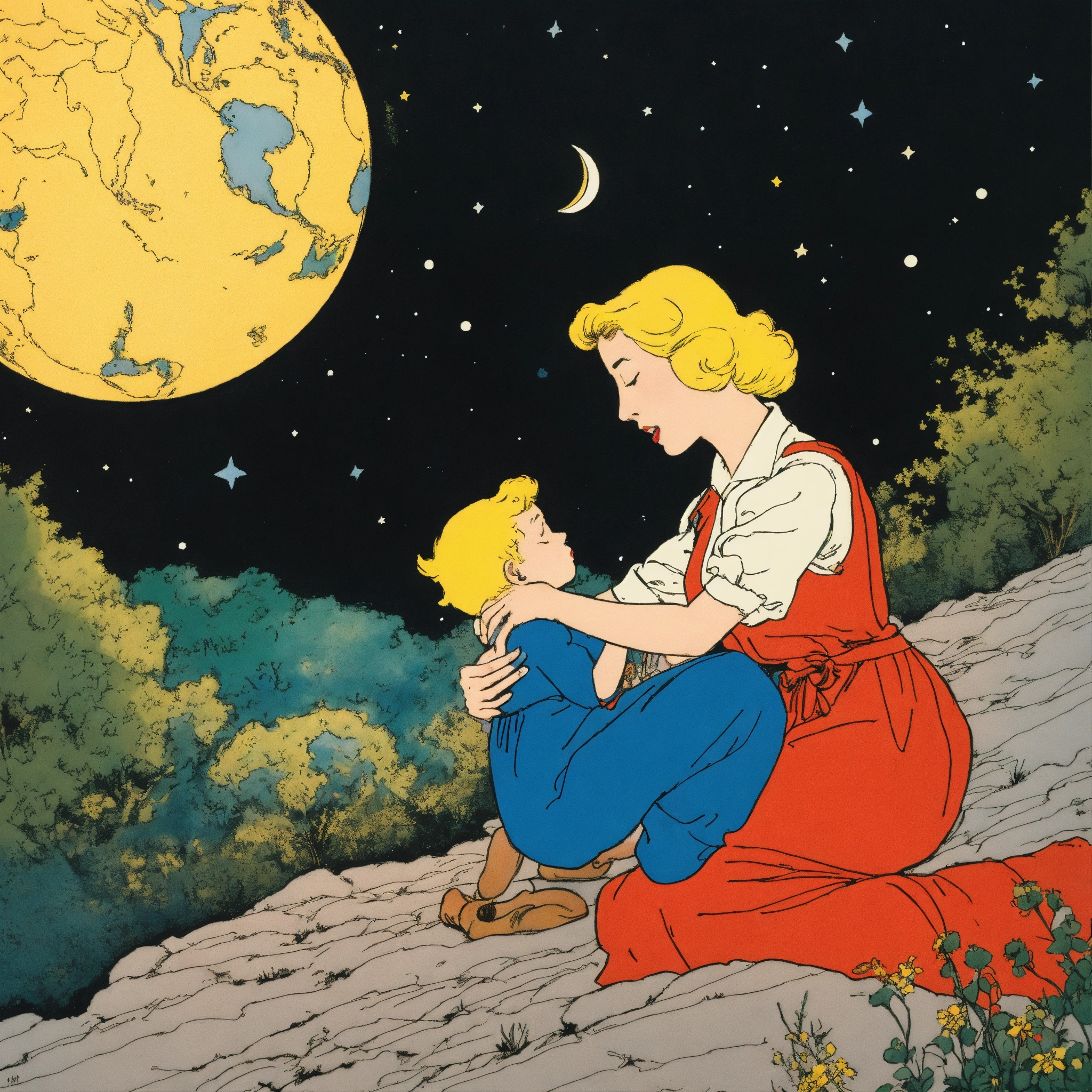 Pen and ink, illustrated by hergé, a beautiful mother singing lullaby, sadness, stunning color scheme, masterpiece, background space and earth.