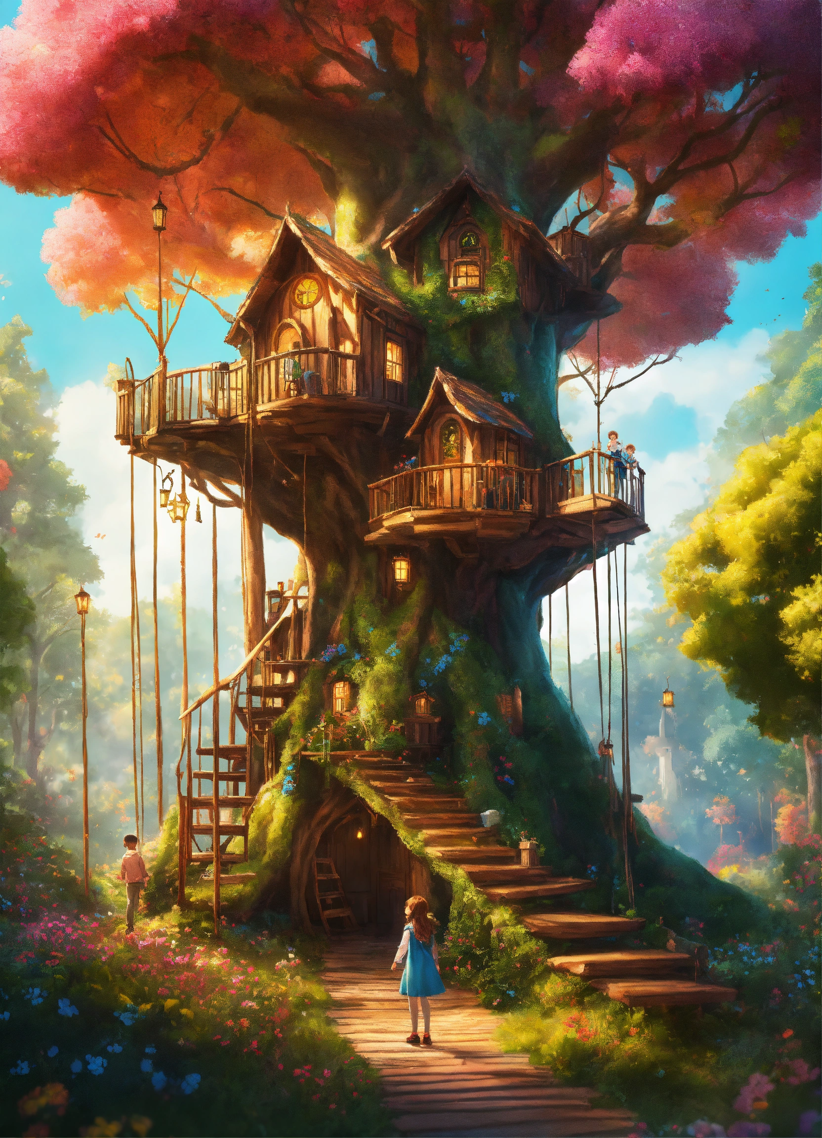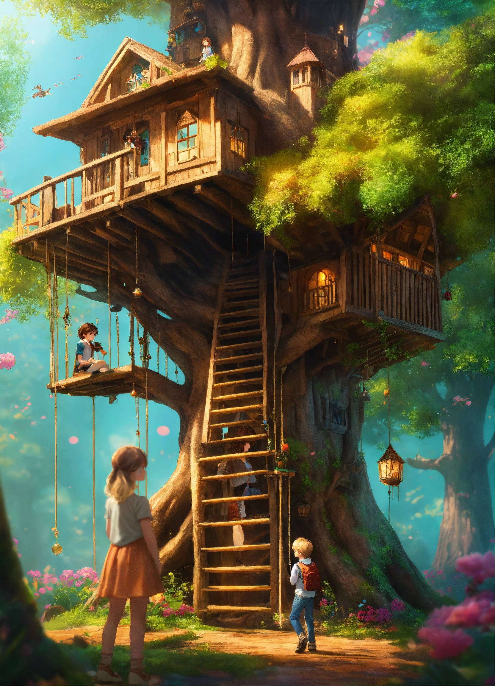Bright and colorful realistic, cute enchanted forest with tall skinny magical tree house, 8 k artistic photography, photorealistic concept art, short young boy with brown hair, and tall girl with long blonde hair looking up at the tall treehouse