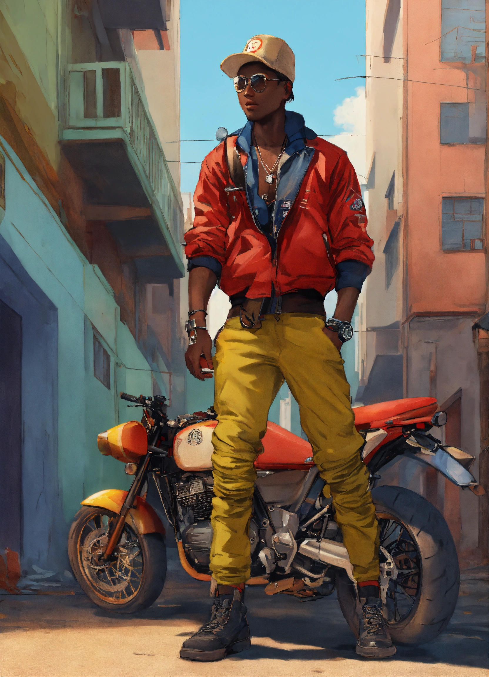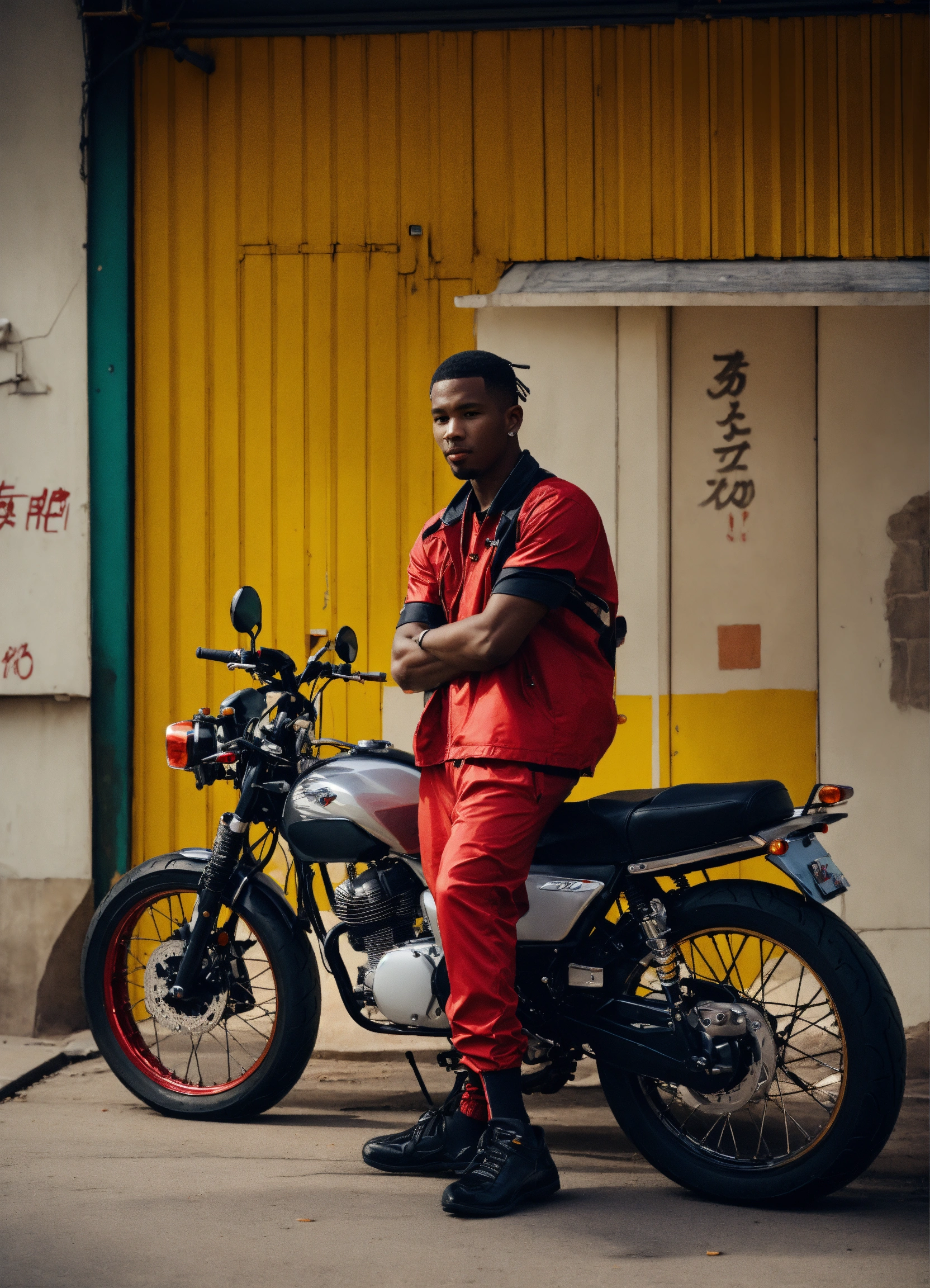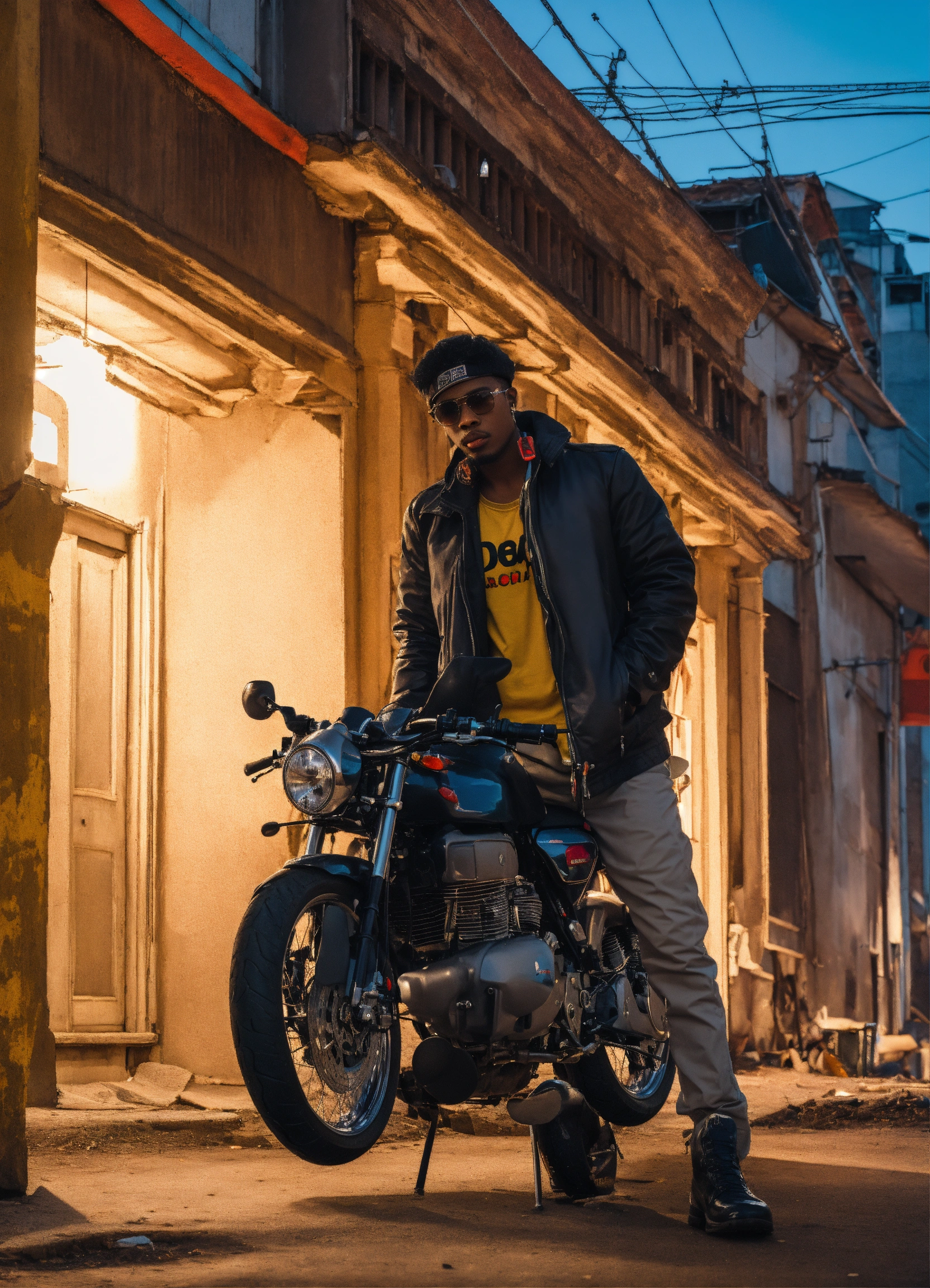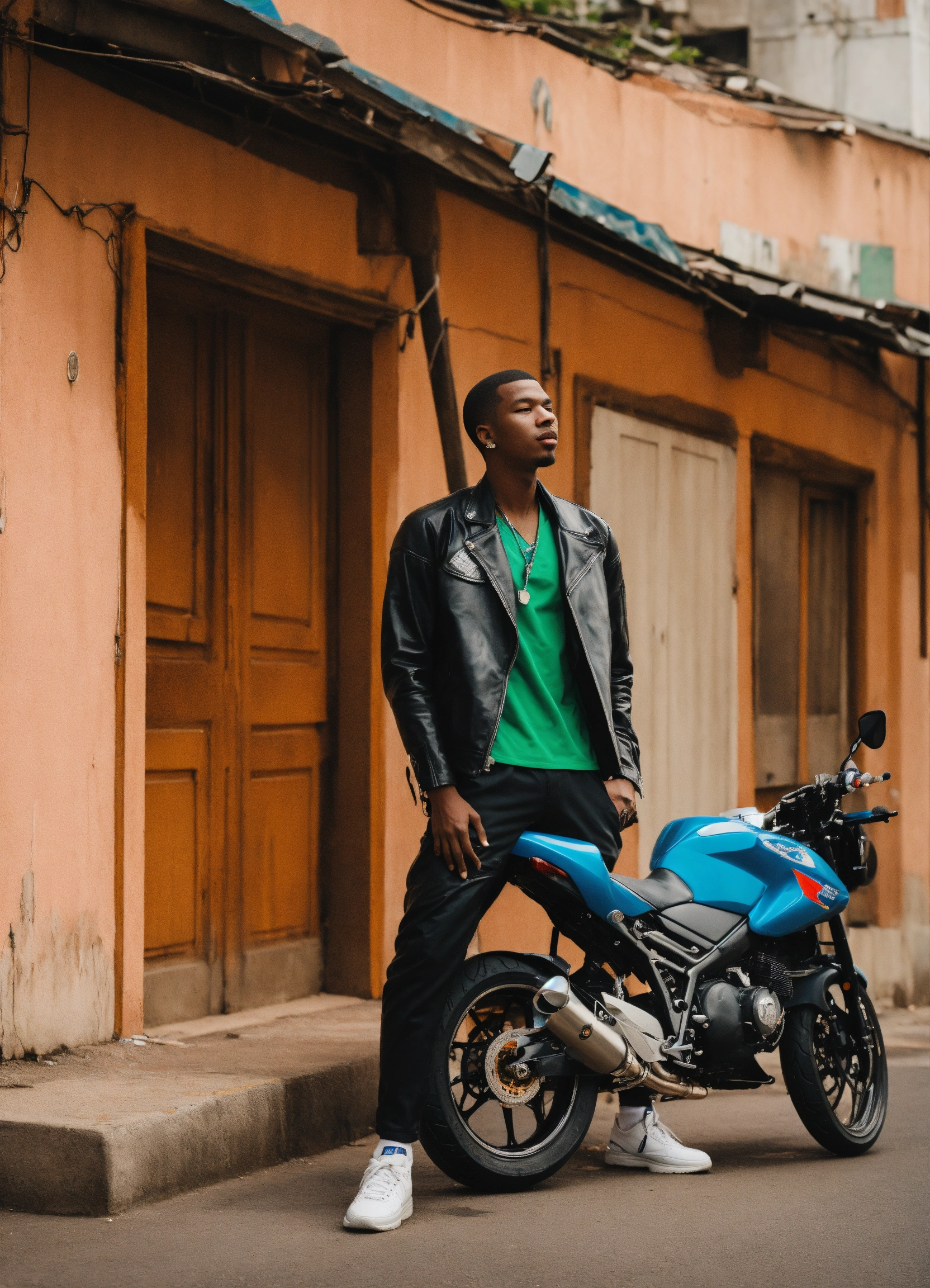 Ninho at the bottom of a building in street clothes leaning on a motorbike