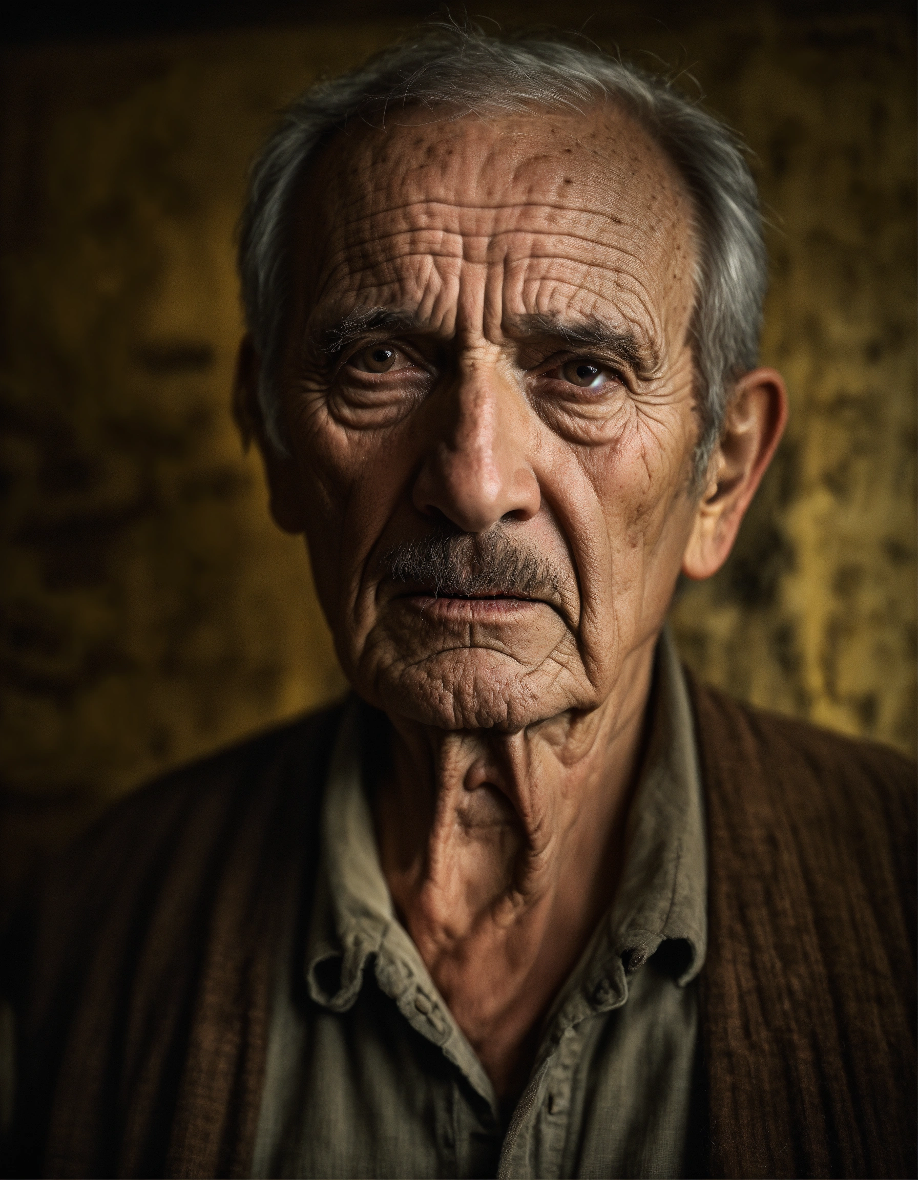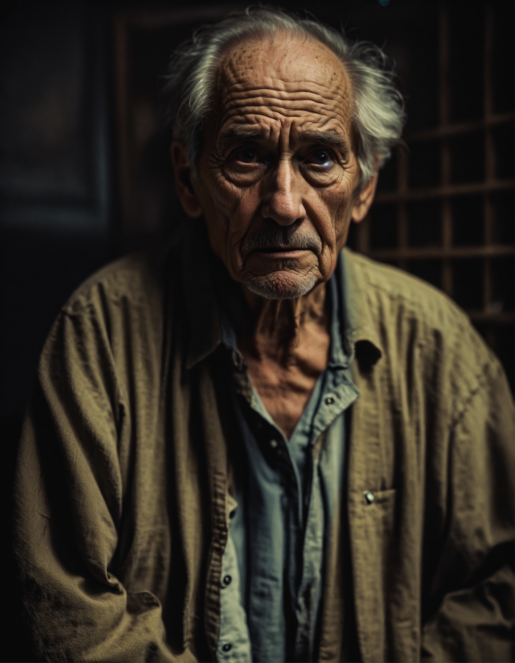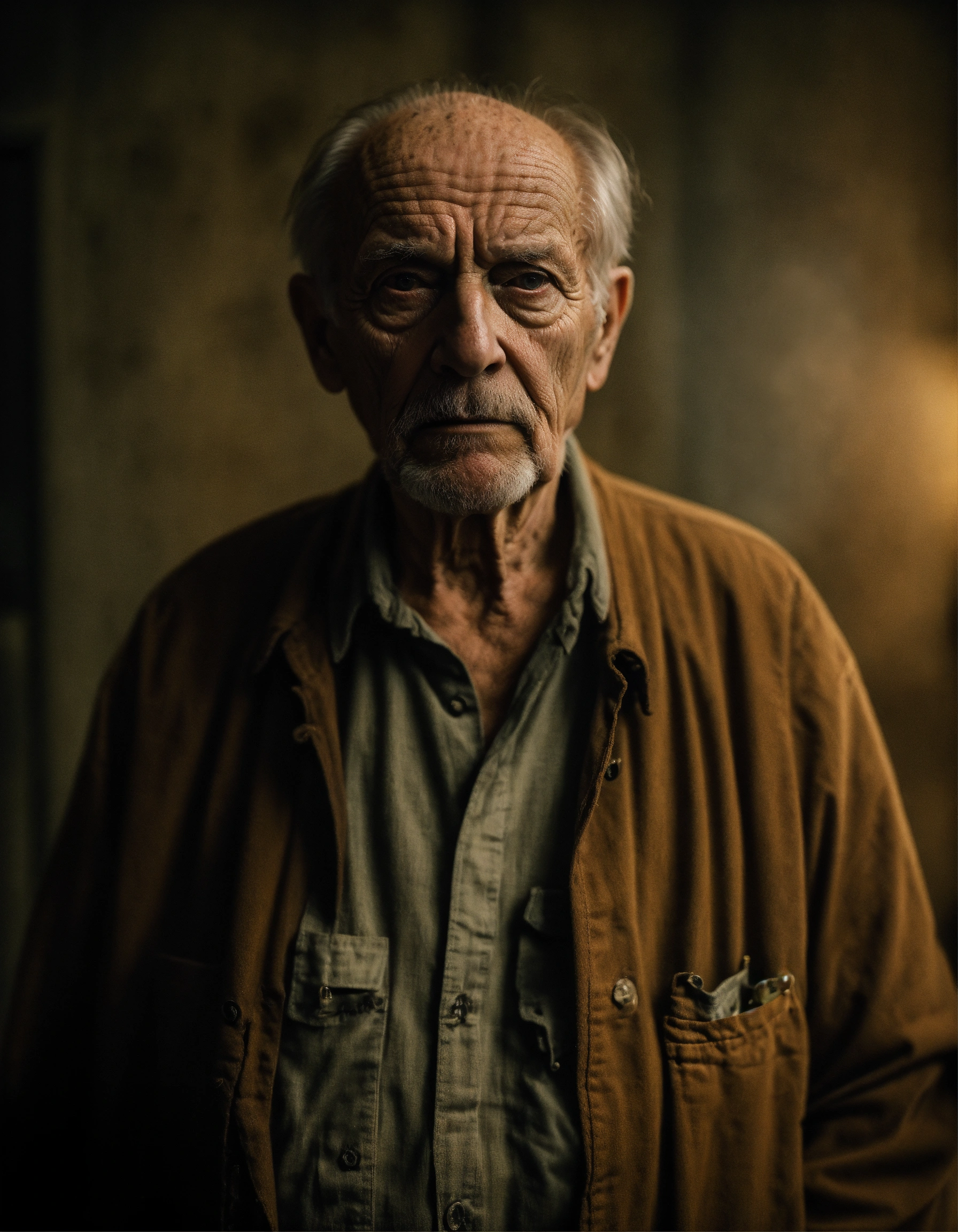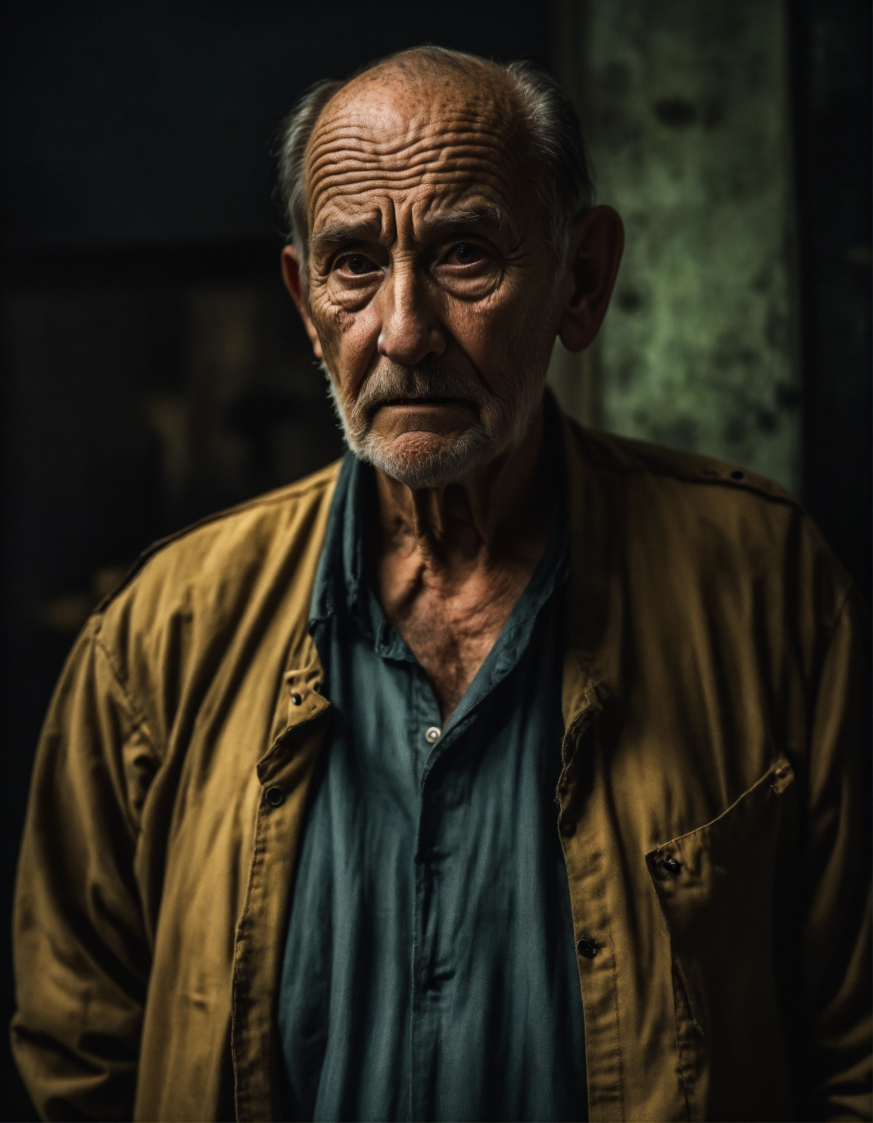 Standing picture old very scary american man, thinning hair, small little eyes, with wrinkles and dark circles telling a story, dark room background
