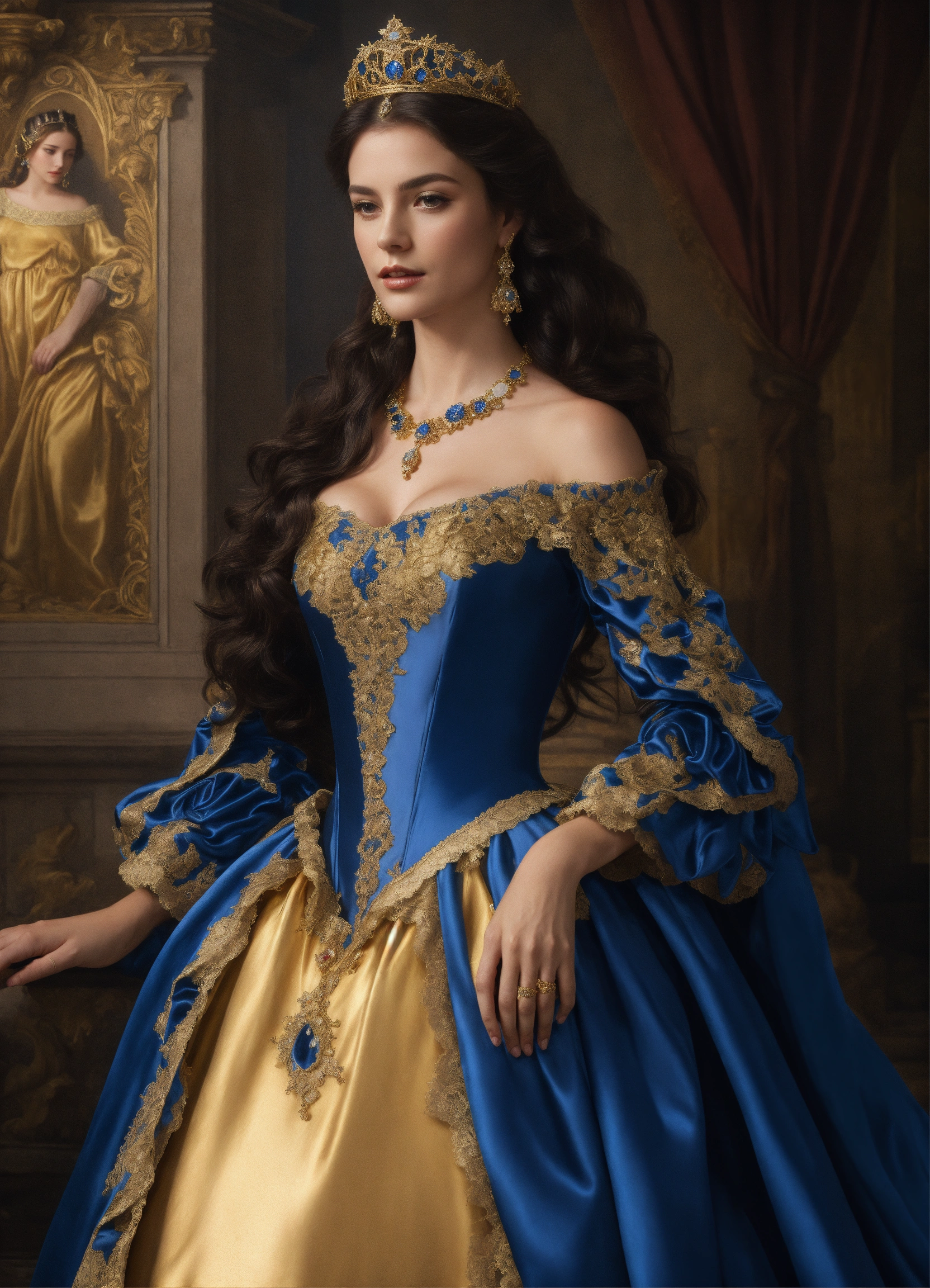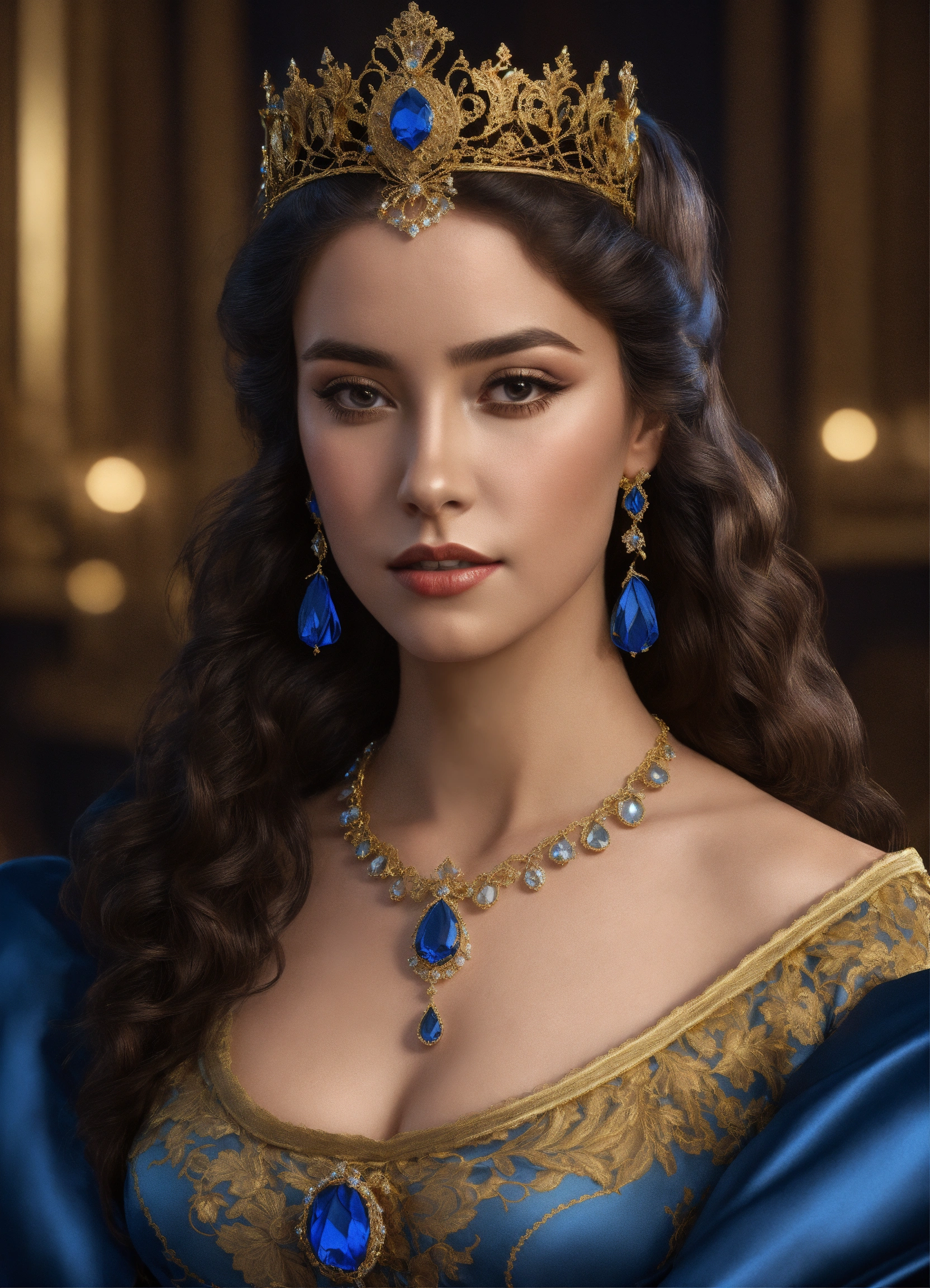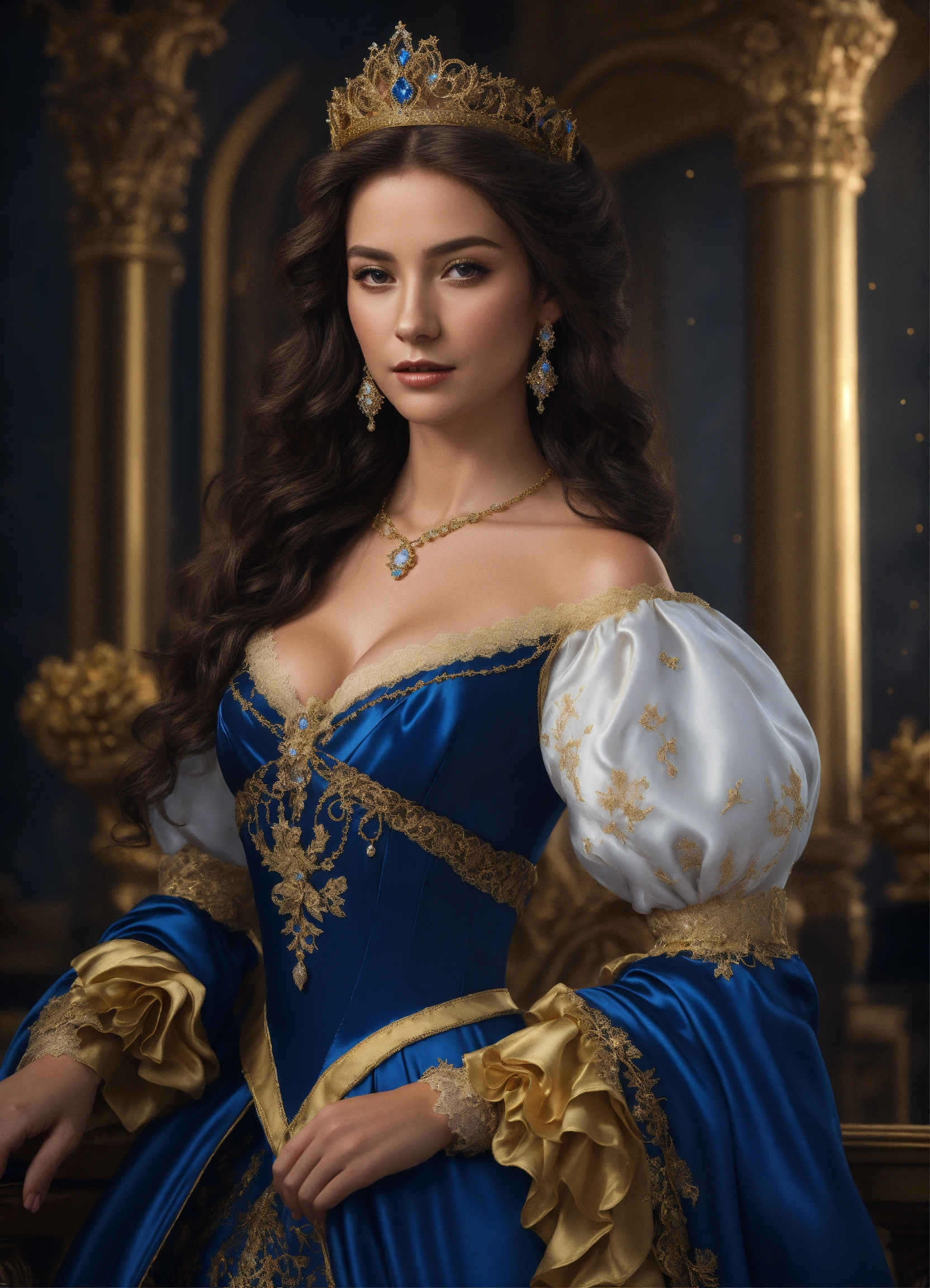 Head and shoulders photorealistic beautiful queen in renaissance blue-and-gold satin gown, ruffles and lace, full long dark hair, jewelry, tiara, (breasts1.9), 8k