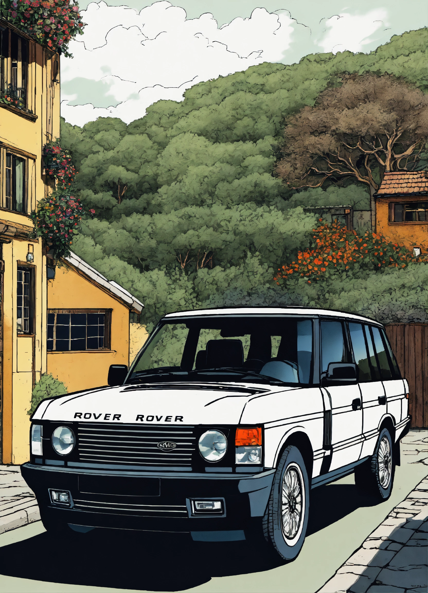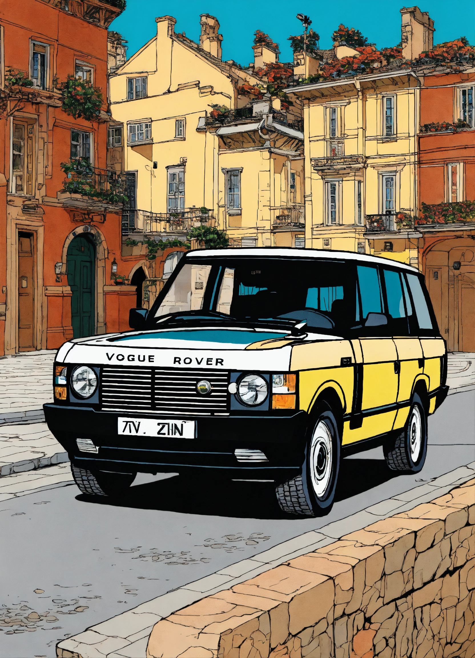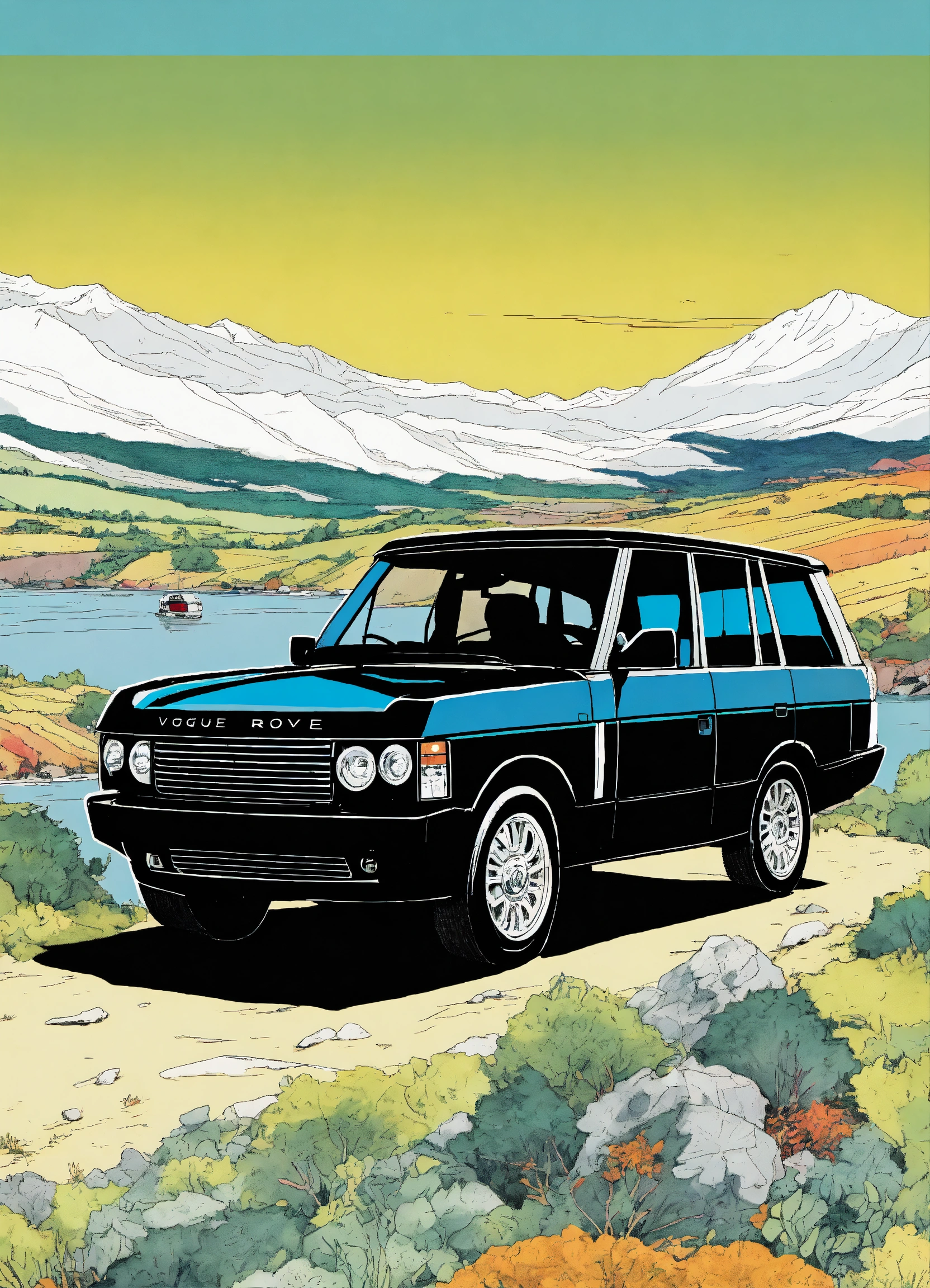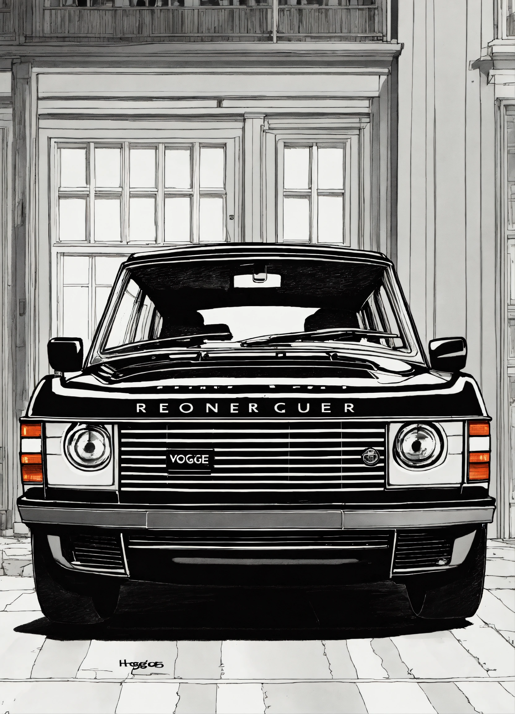 Detailed pen and ink illustration of a modern range rover vogue 2006, dark color of the car, by herge, in the style of tin-tin comics, colorful, detailed, high quality, minimalism, aesthetic