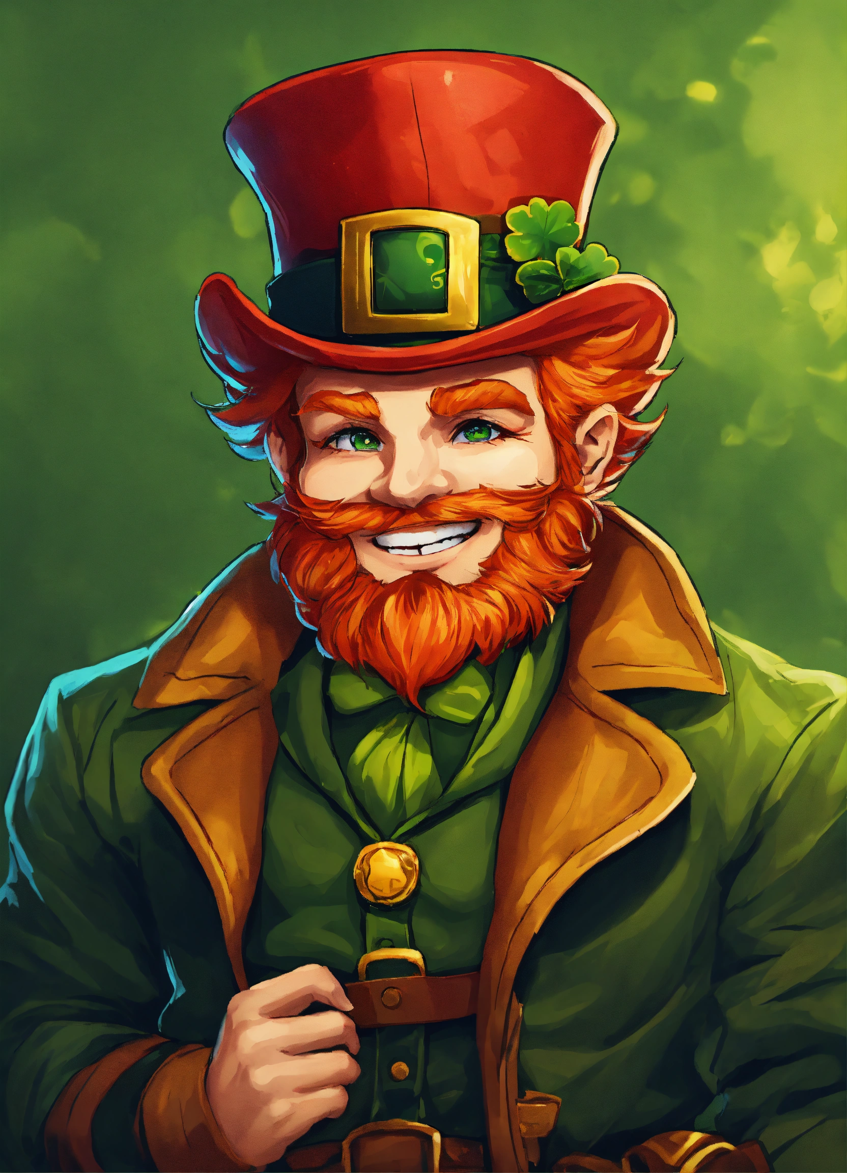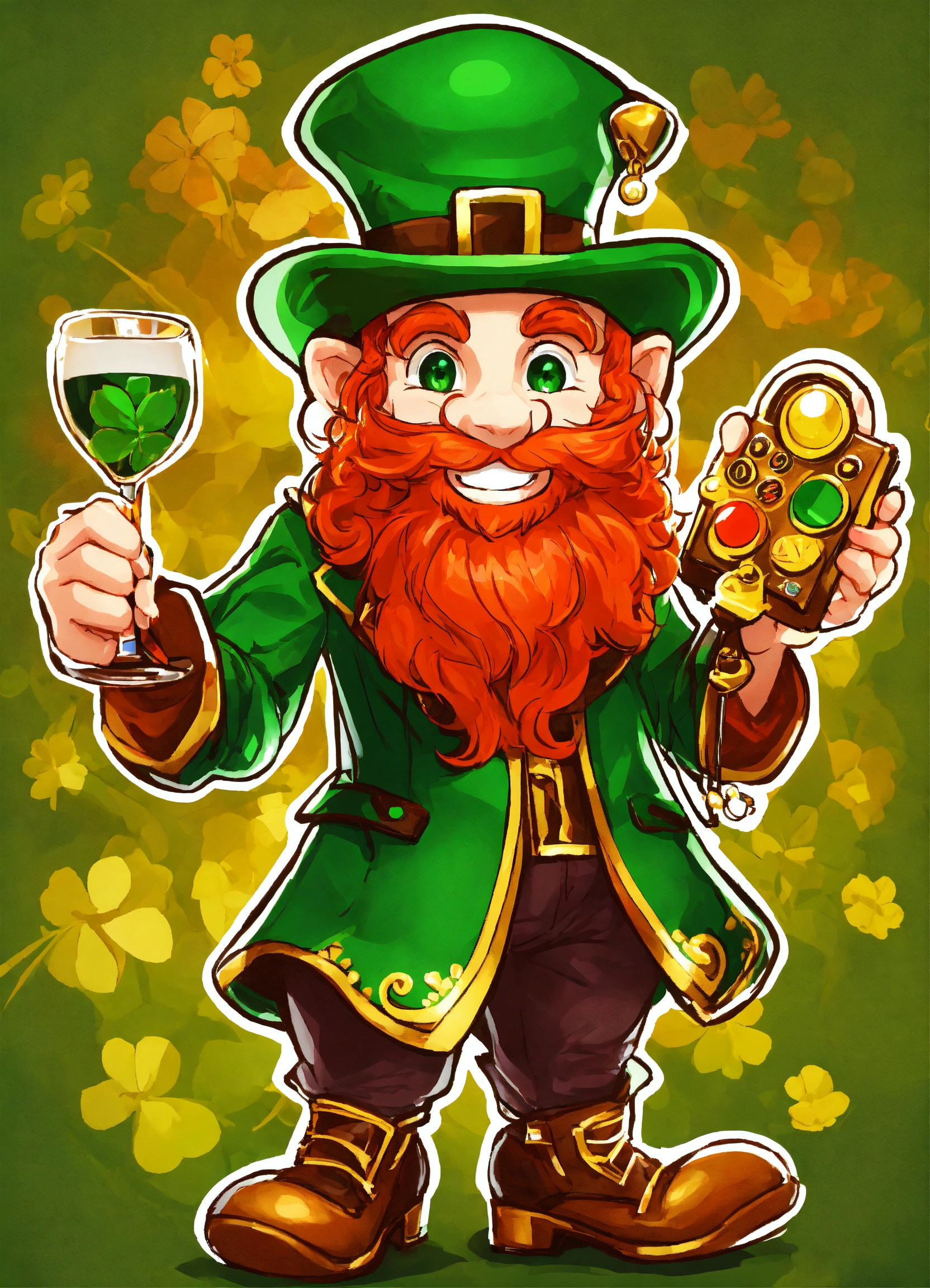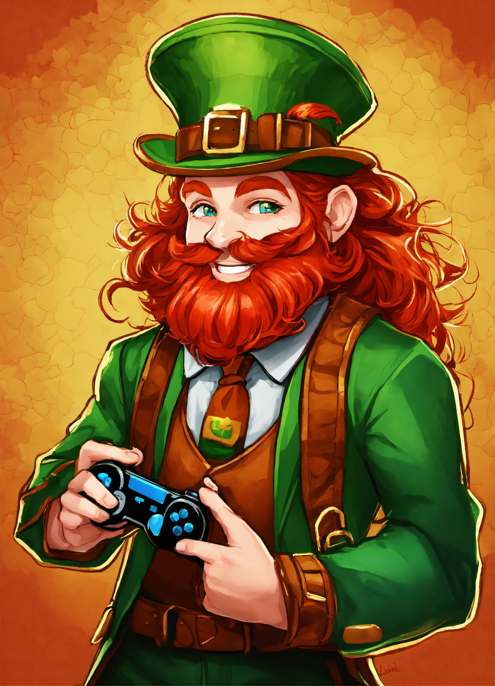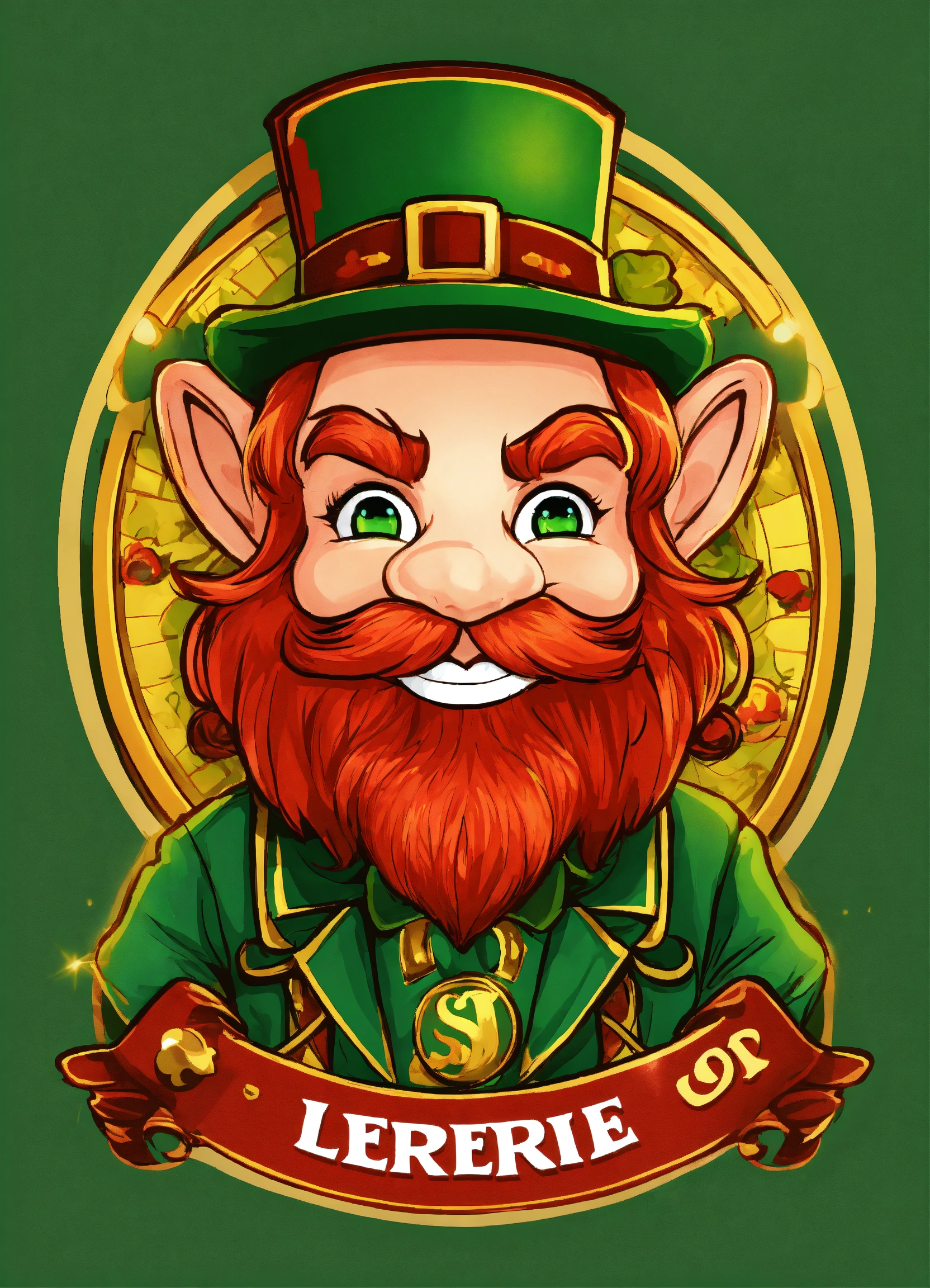 “create a logo with a red-headed leprechaun named lucky lepre. who has a mischievous smile and is holding a gaming controller. the primary colors should be green and gold, with accents of red for the hair. the style should be realistic, playful, and engaging. if including text, use a bold, playful font that contrasts with a transparent or appropriately colored background.