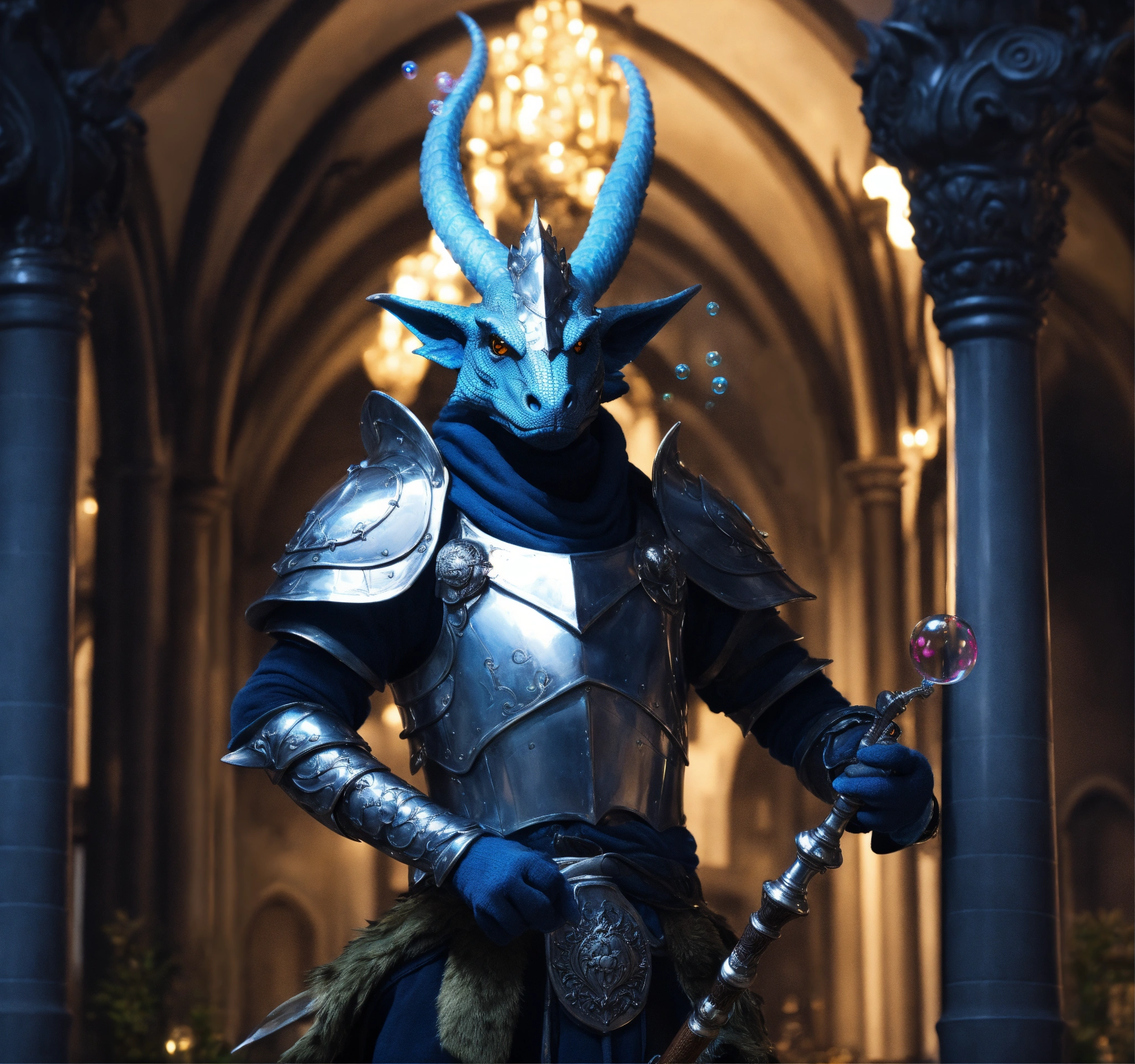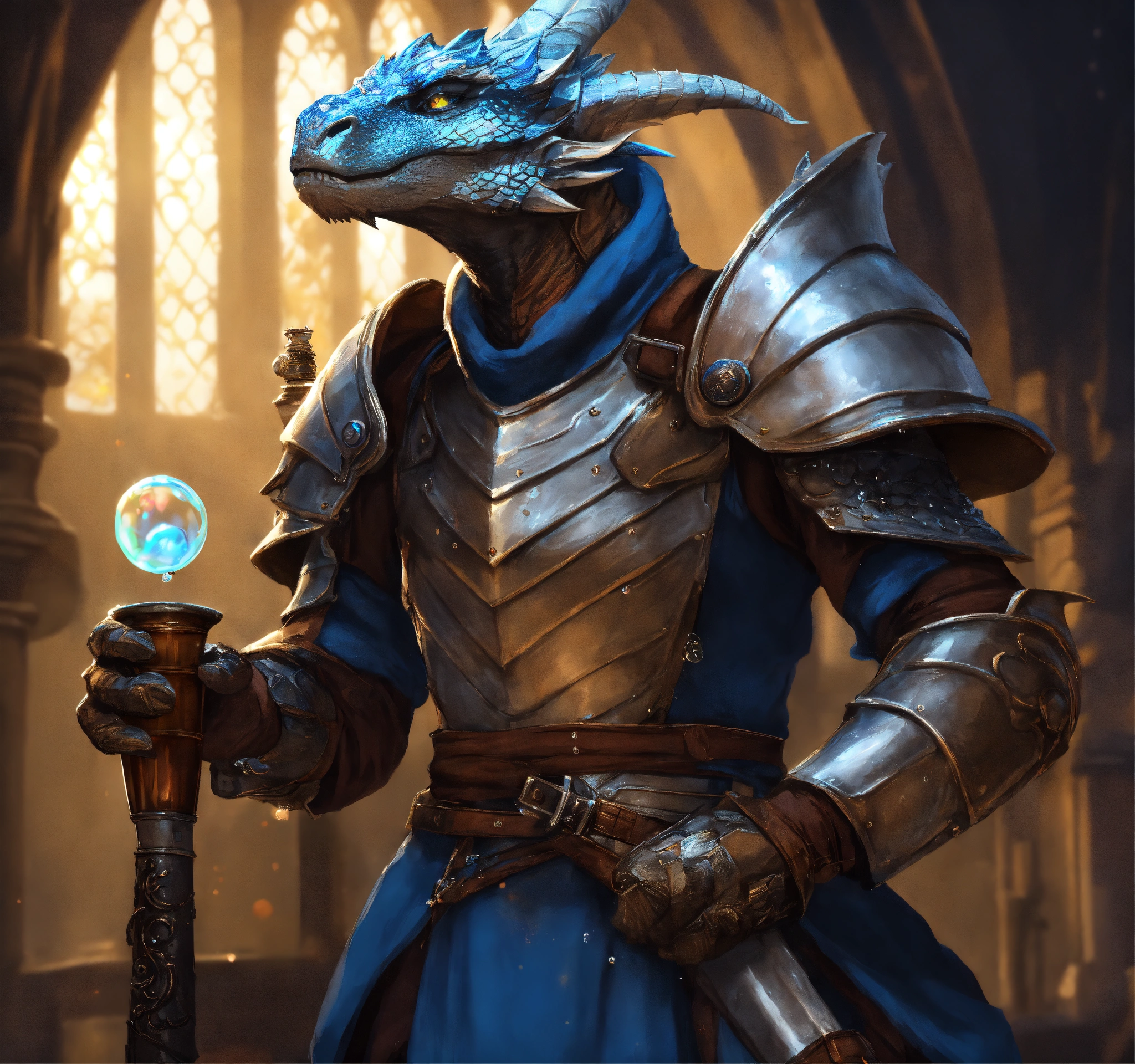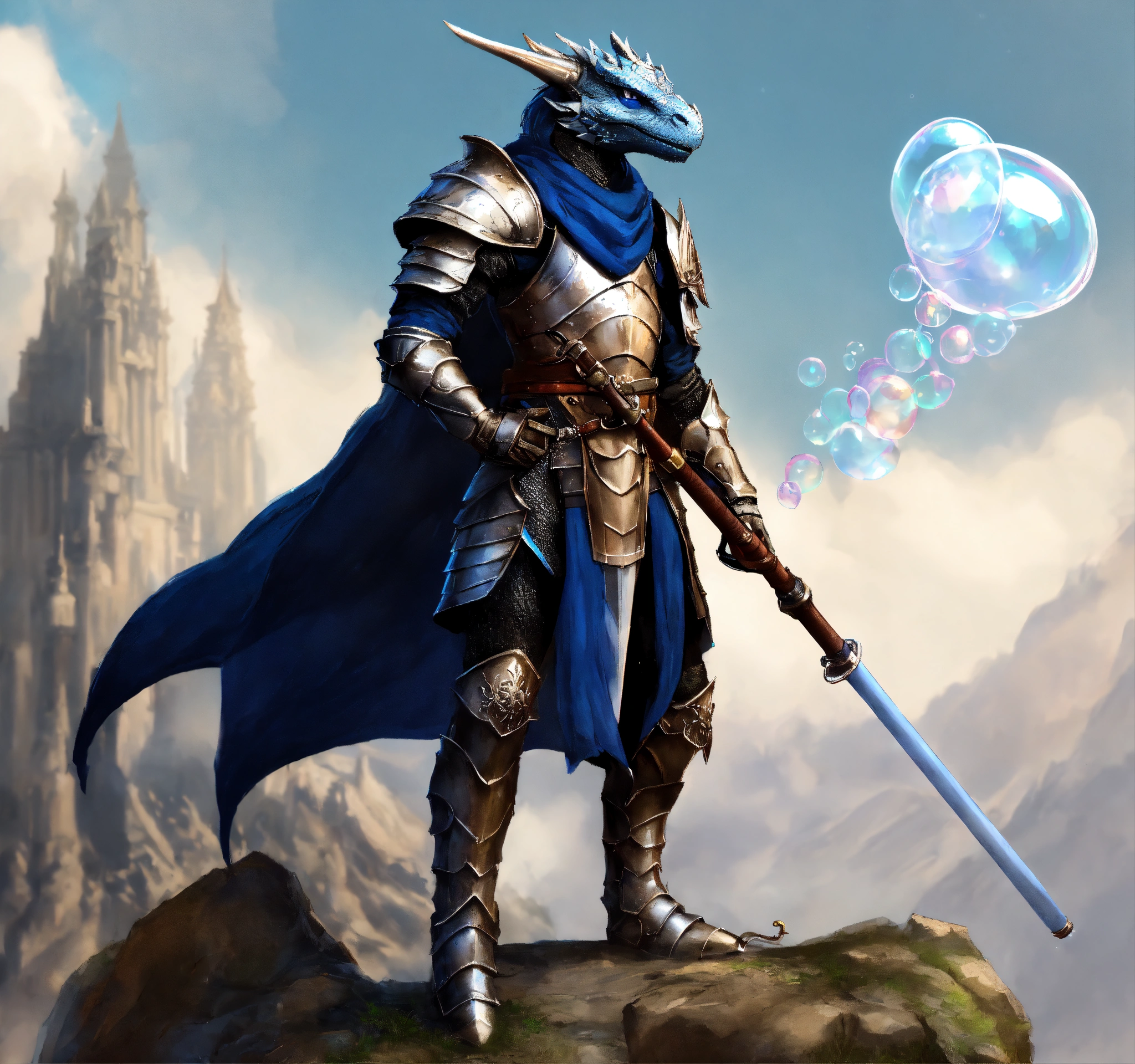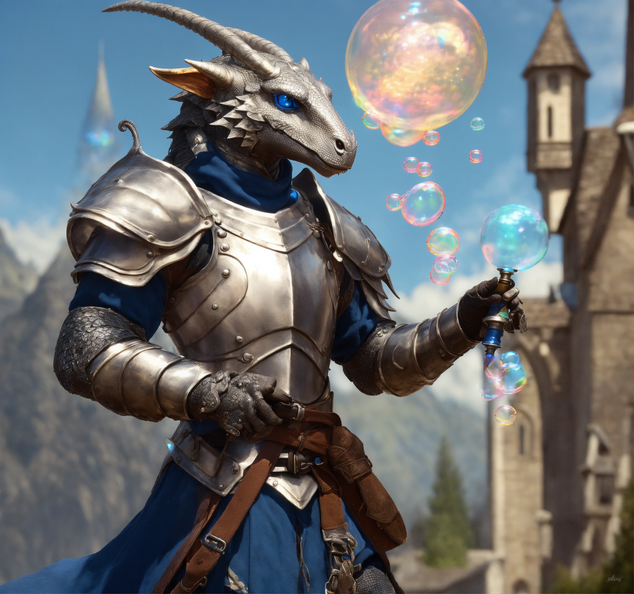 A tall, skinny silver dragonborn with human blue eyes wearing scale armor and looking shifty. blowing bubbles out of a long churchwarden pipe