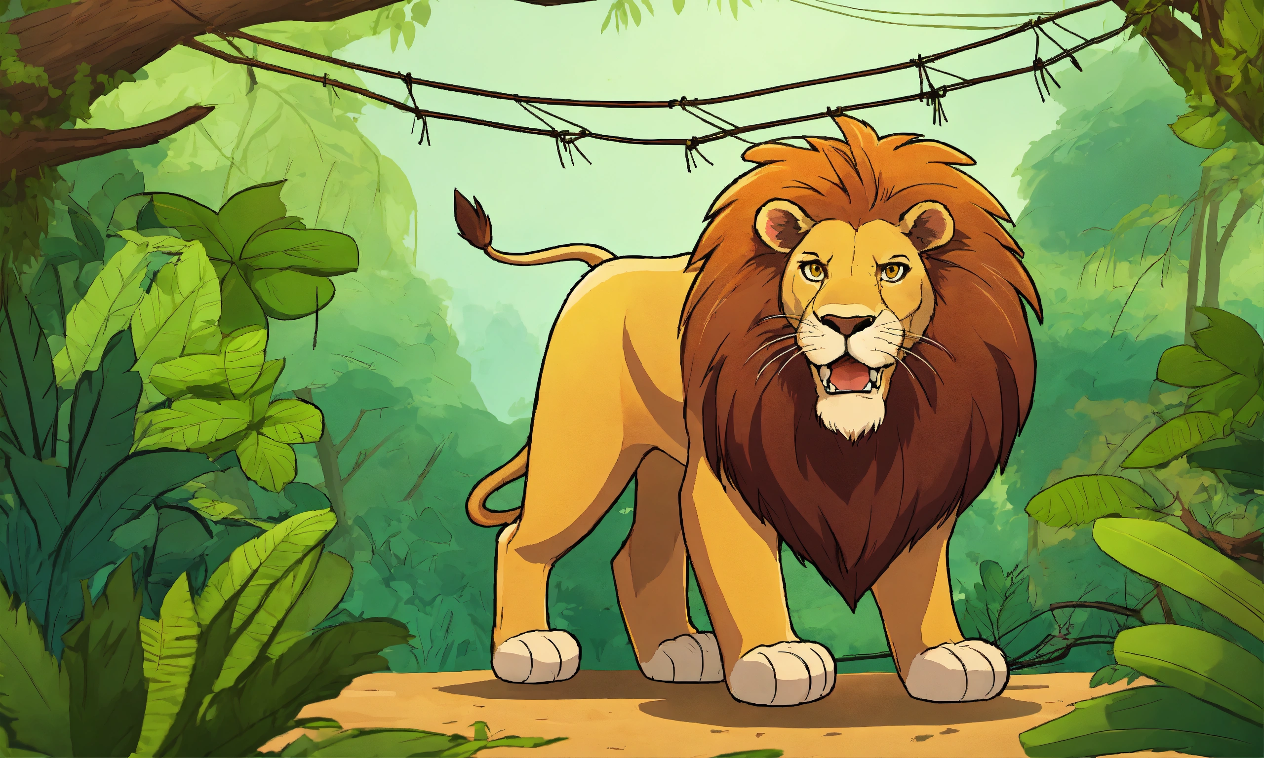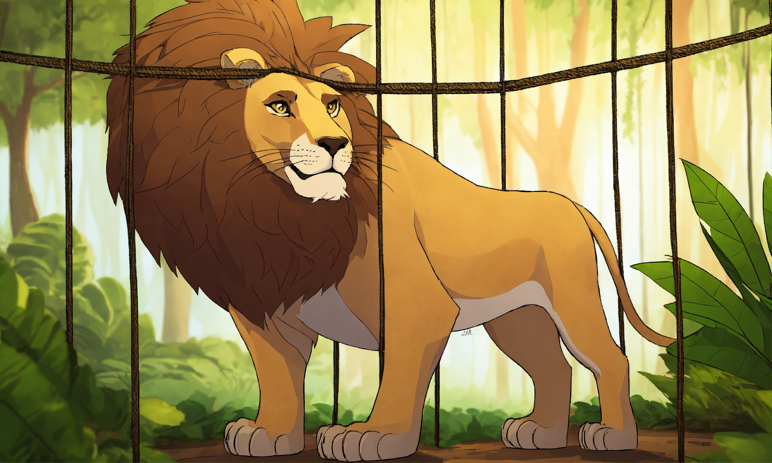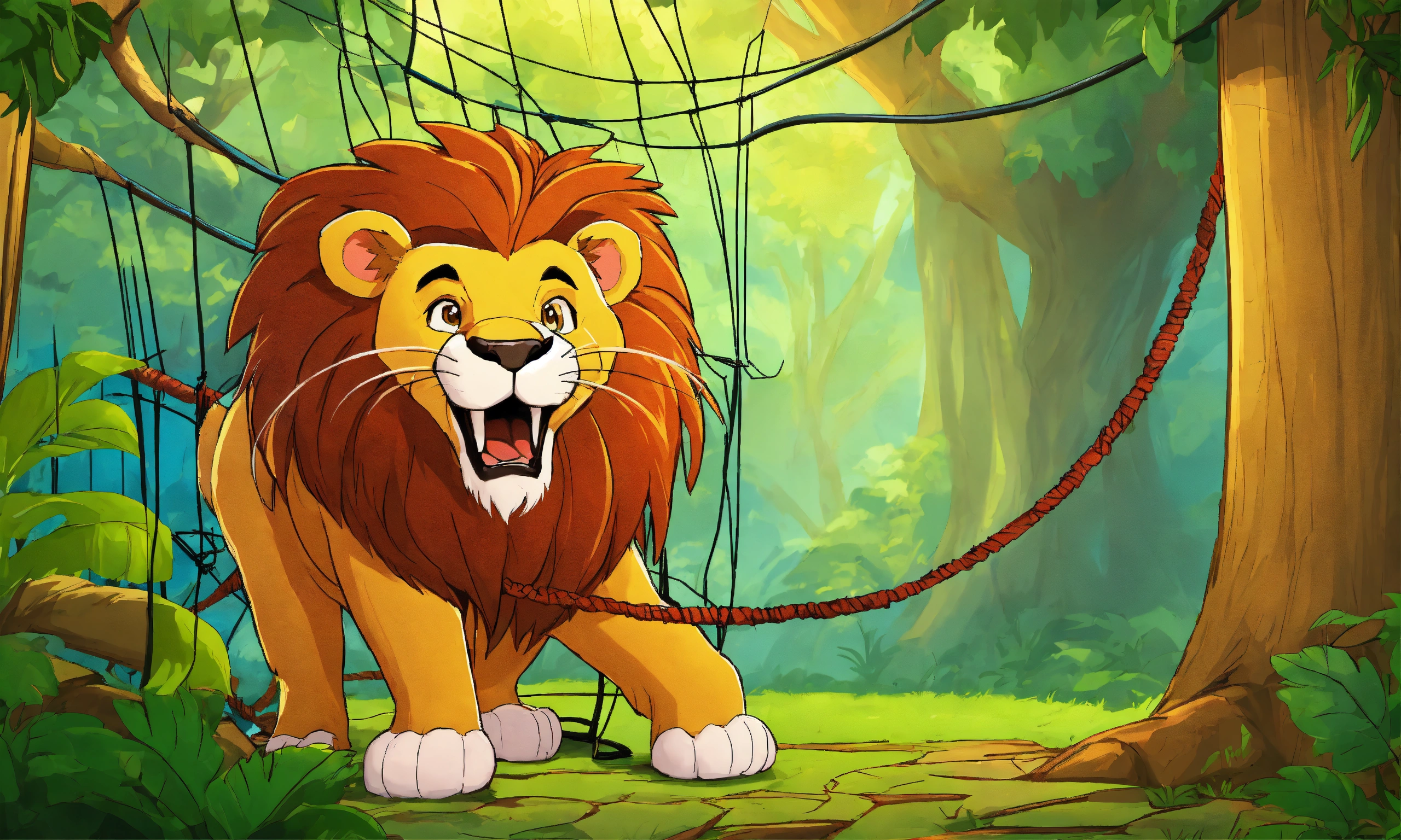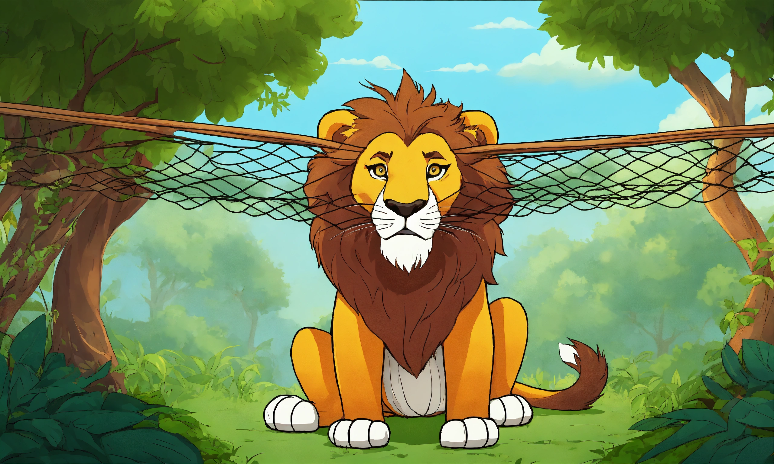 Cartoon big lion was captured and trapped in a net and hang to the tree in big jungle