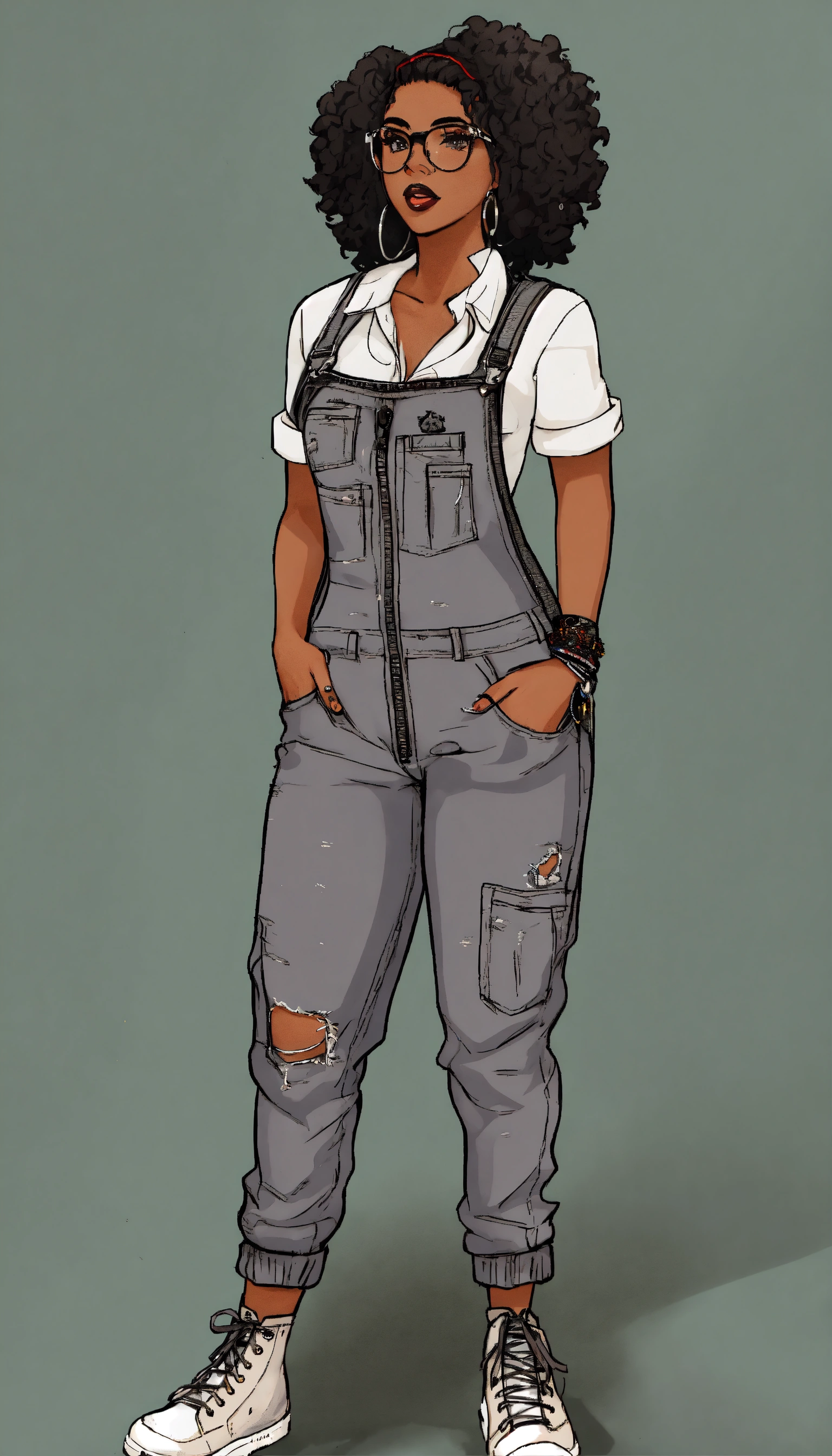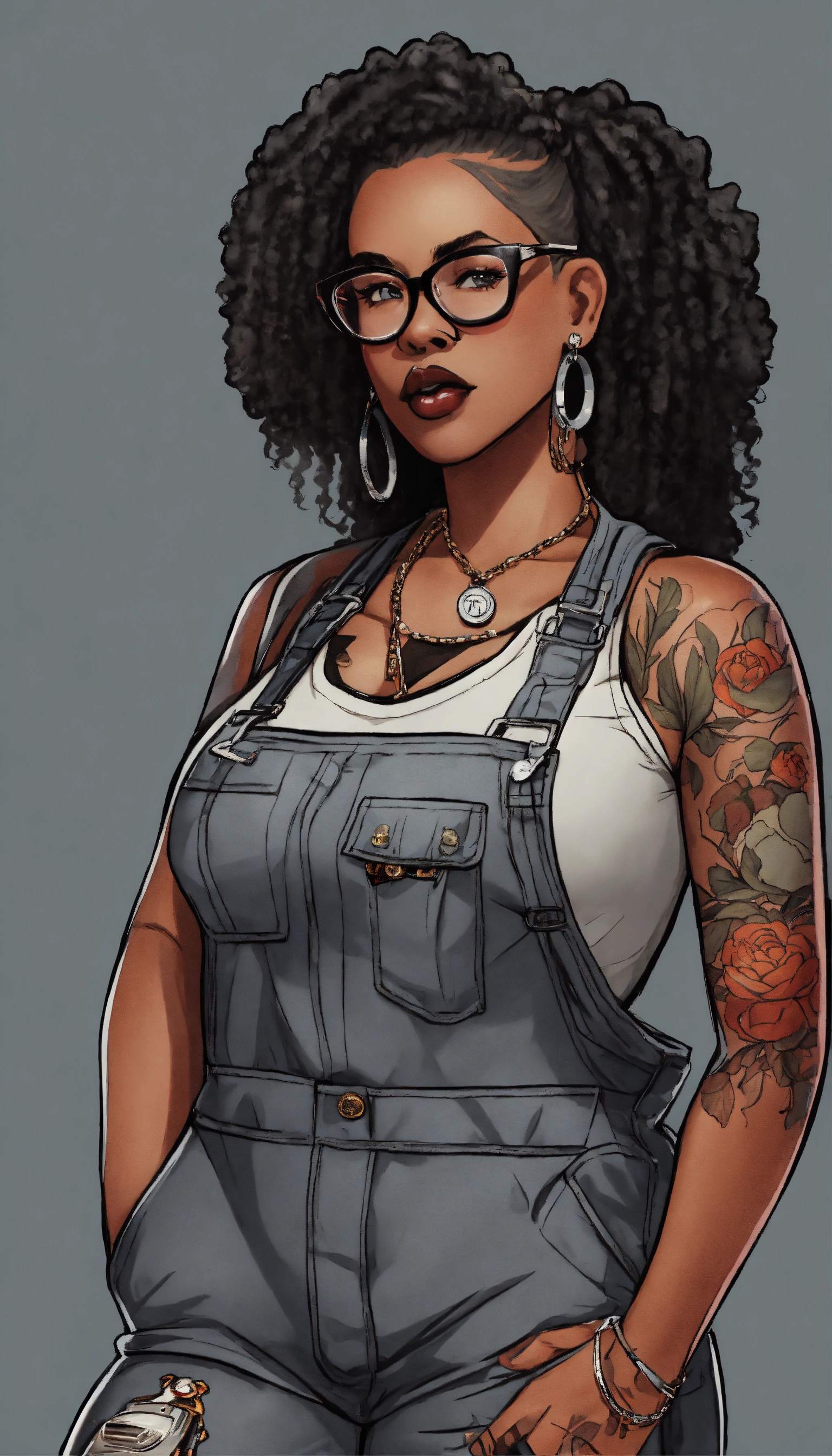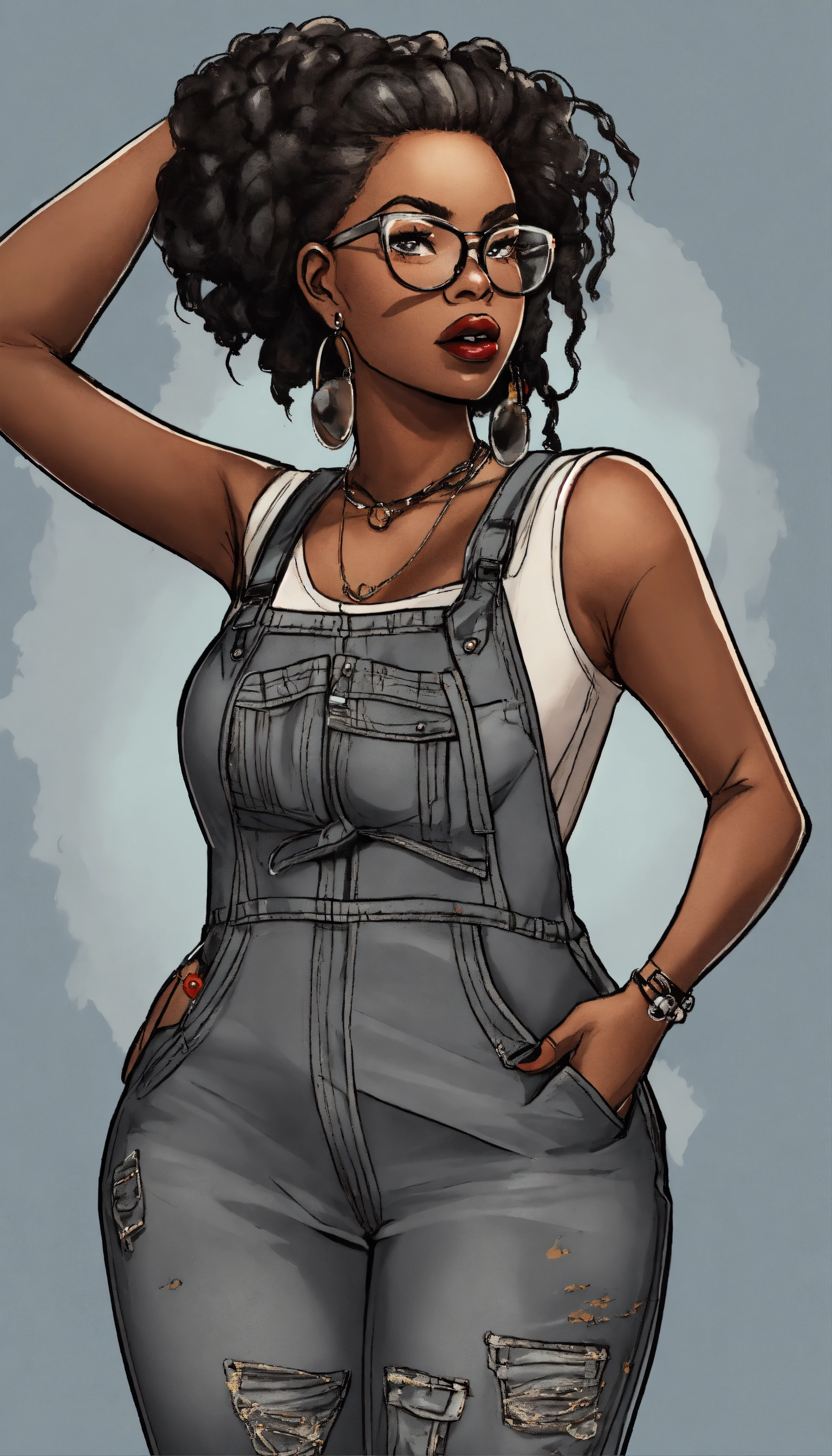 Cartoon, illustration, african american goth rockabilly full figure woman wearing glasses distressed work coveralls over a grey ribbed tank top autumn theme