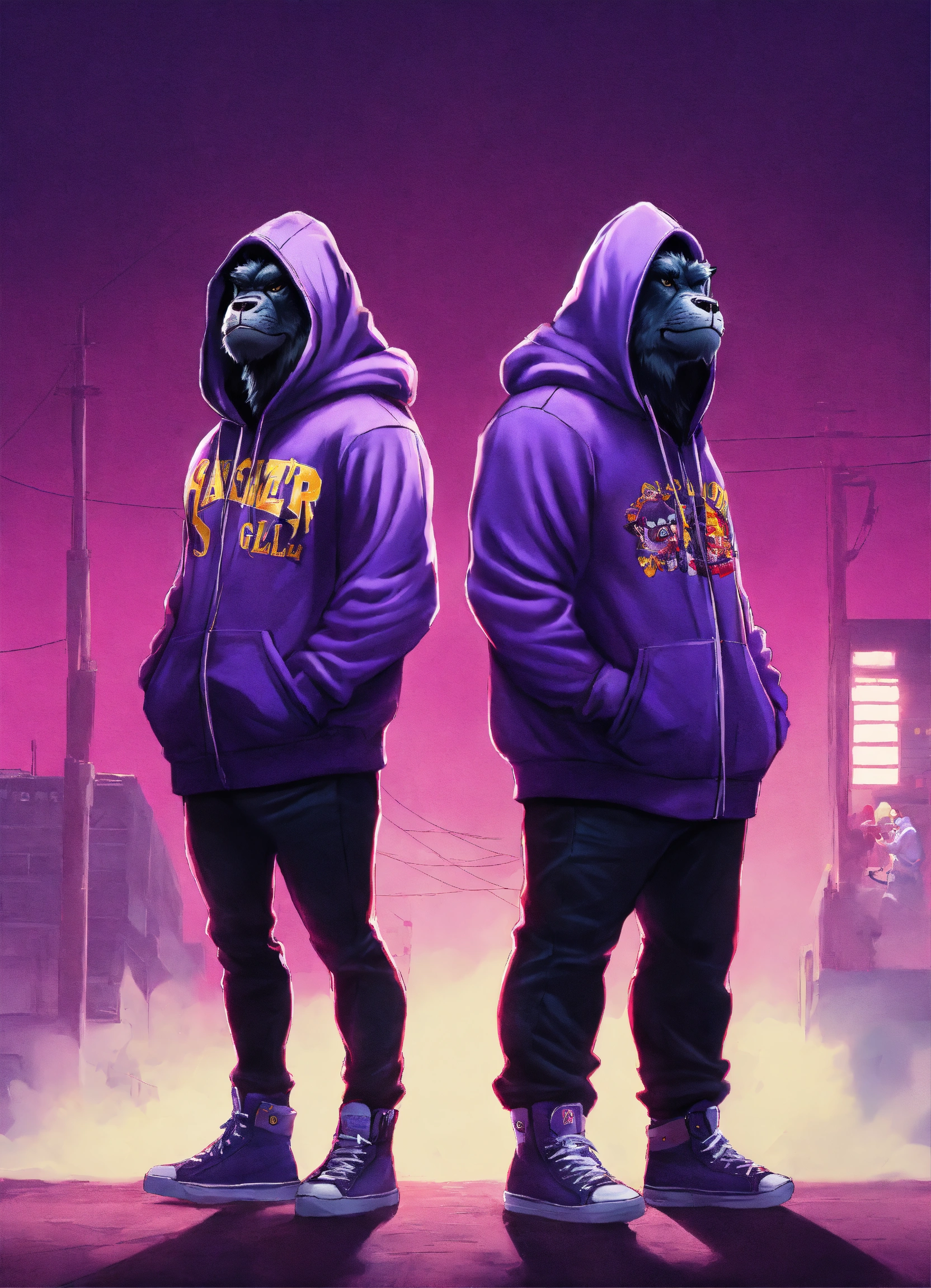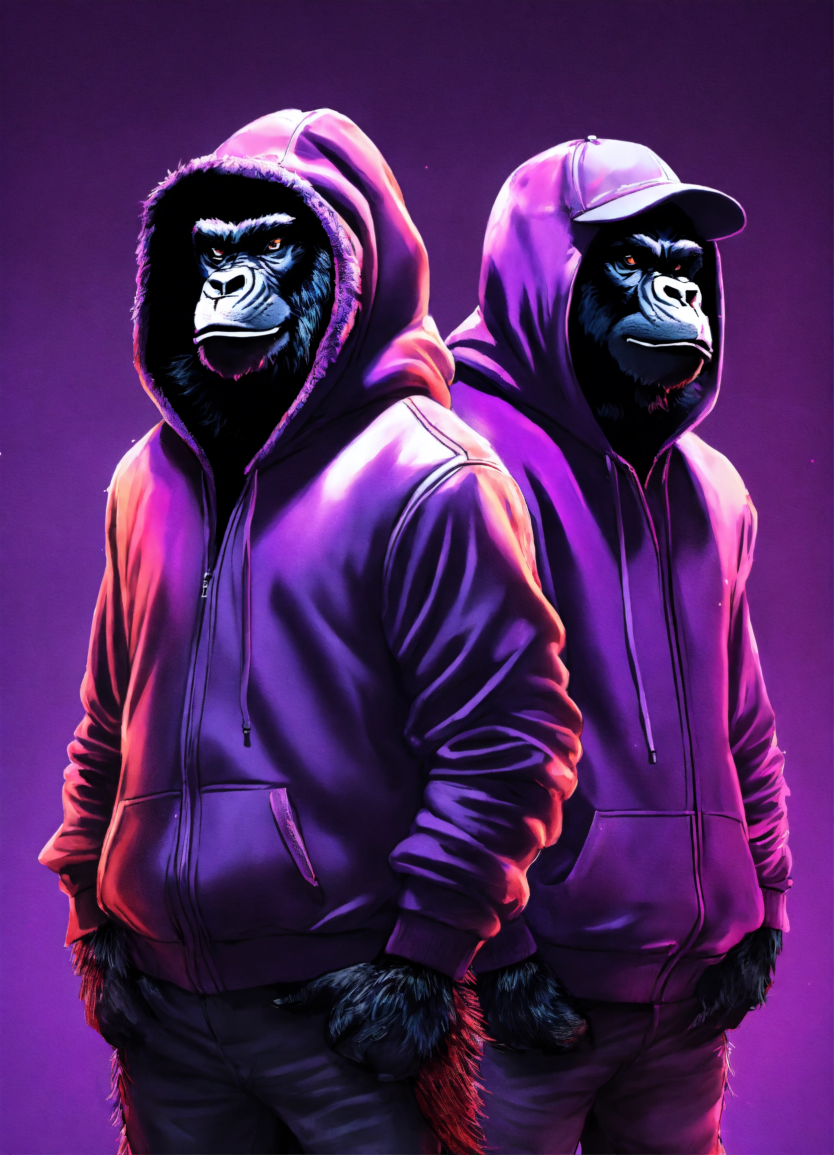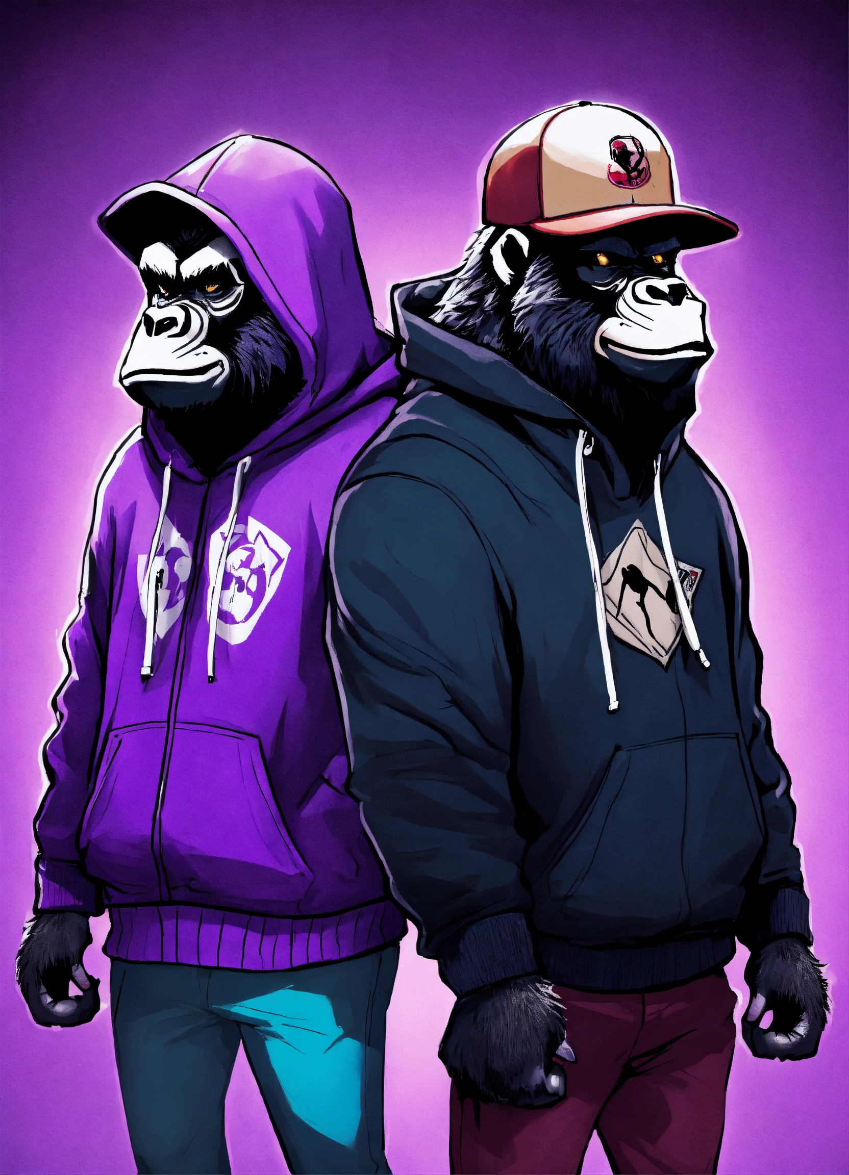 Gangster wolf and gangster gorilla wearing hoodies and baseball cap purple standing back to back