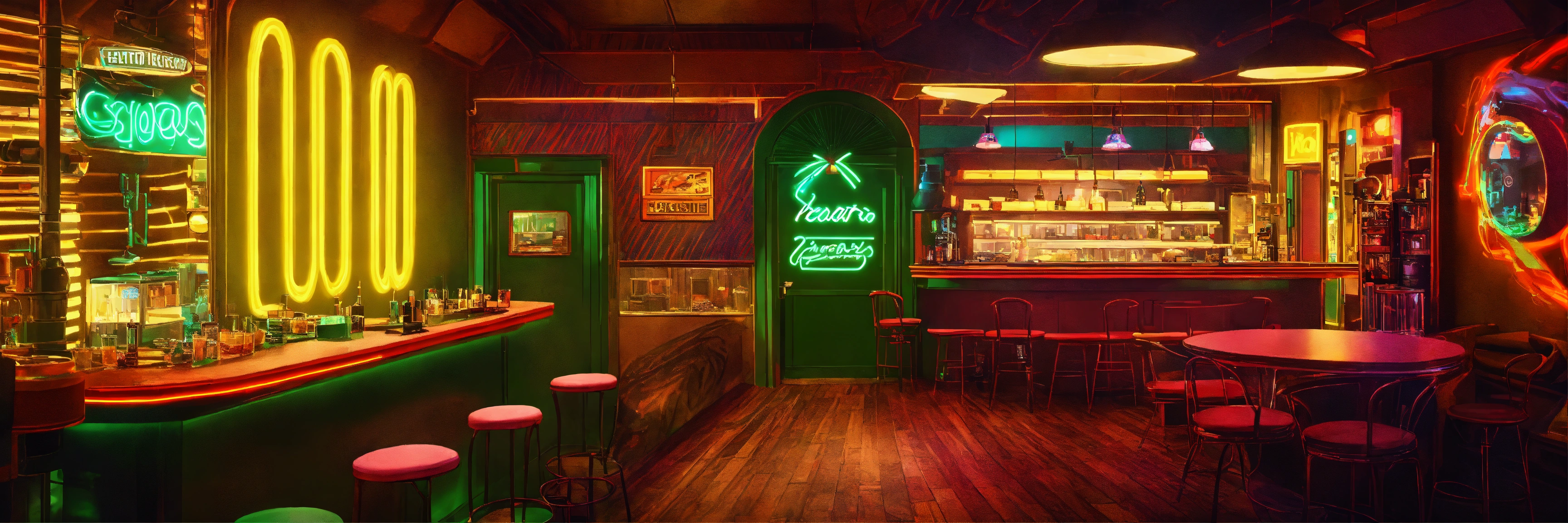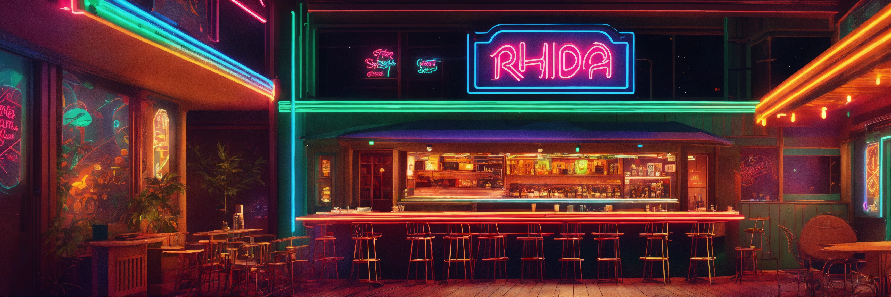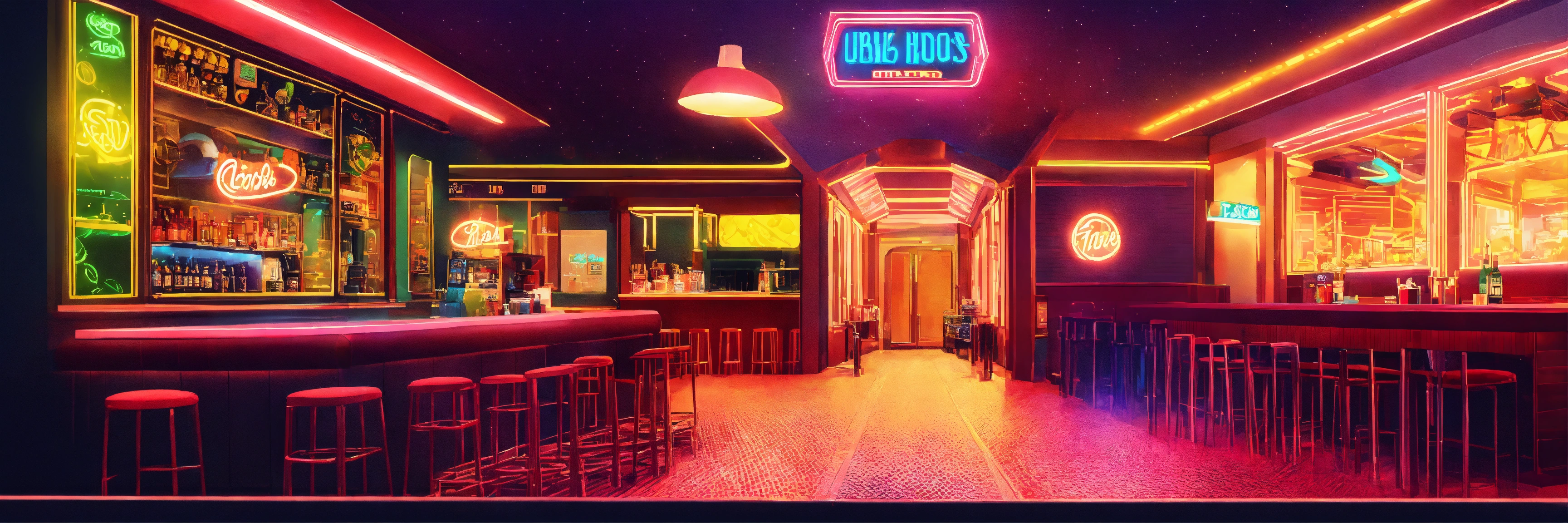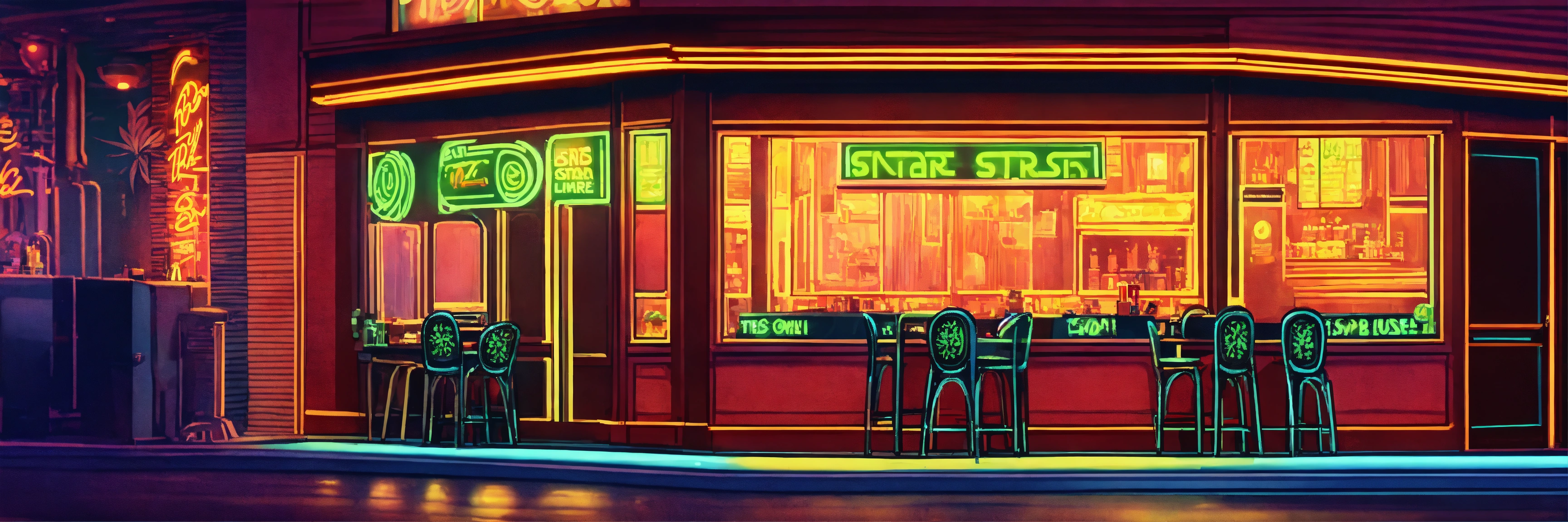 A concept of a retro bistro inspired by star wars movie with ganja shop inside, also inside should be a neon sign and some sci-fi themes, make it in the style of usa 70's and little bit about psychedelics and neon, be creative