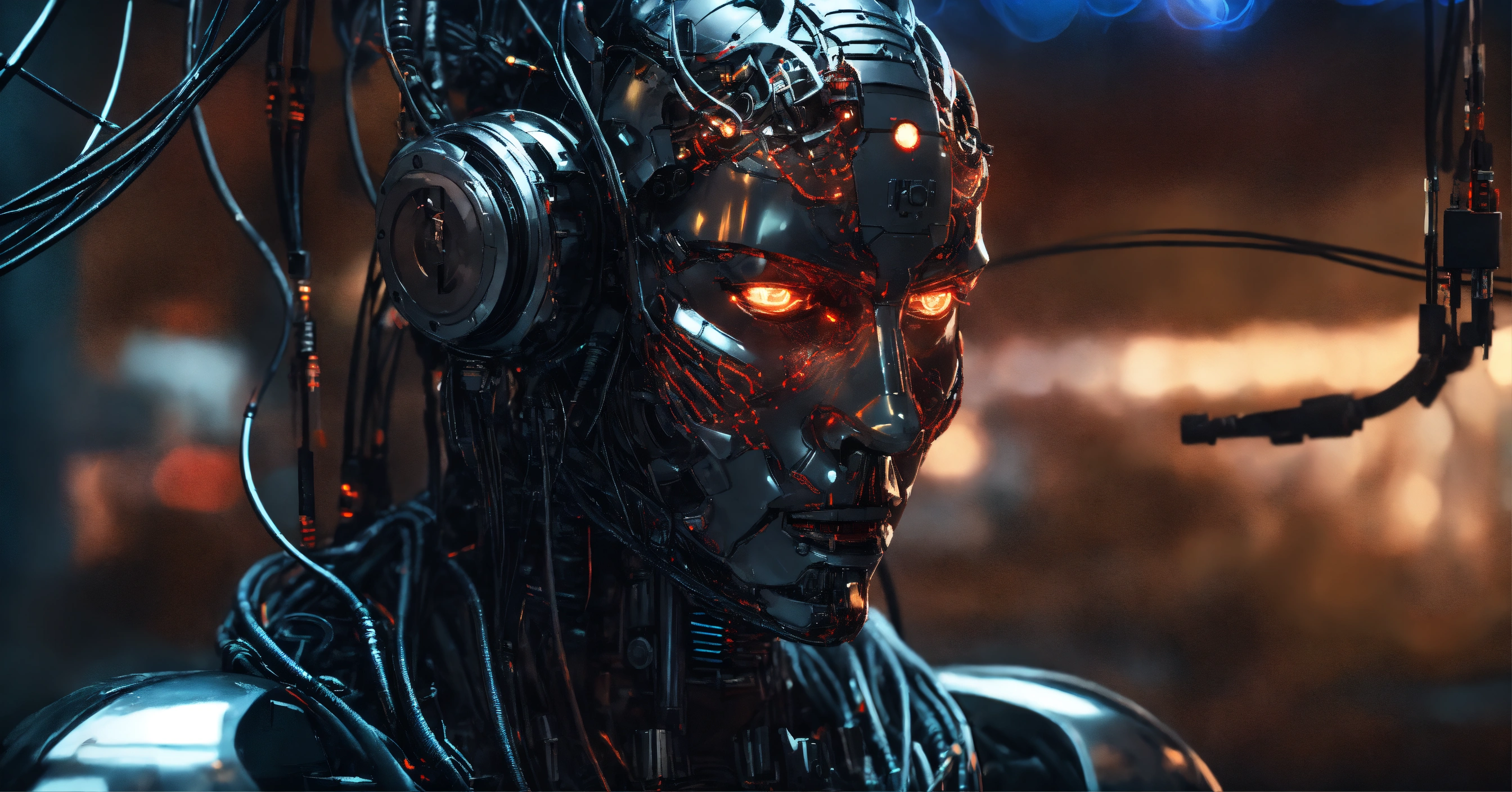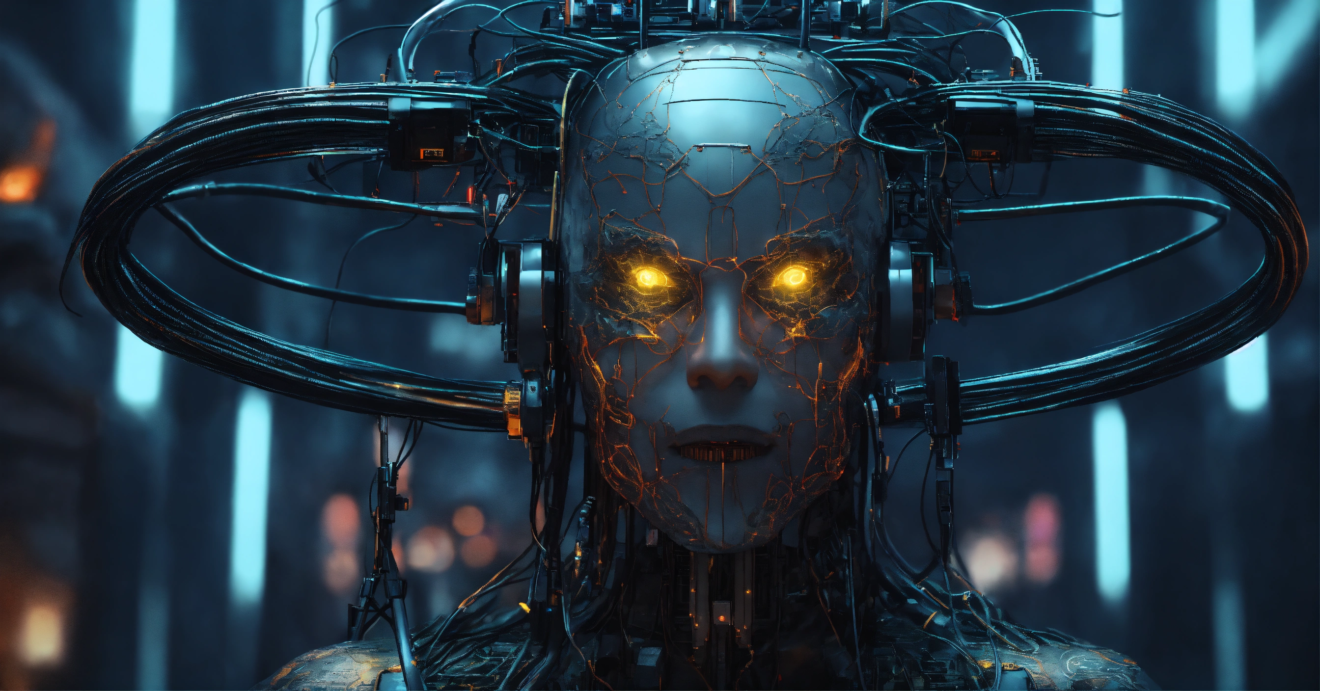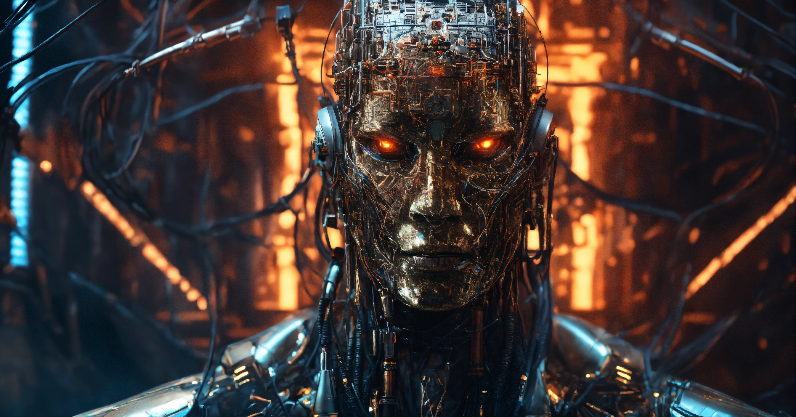 Evil demonic ai god with wires connecting the ai god to multiple humand, super advanced technology, futuristic, hyper digital background, extremely detailed and realistic, ominous and eery, inspired by apollyon