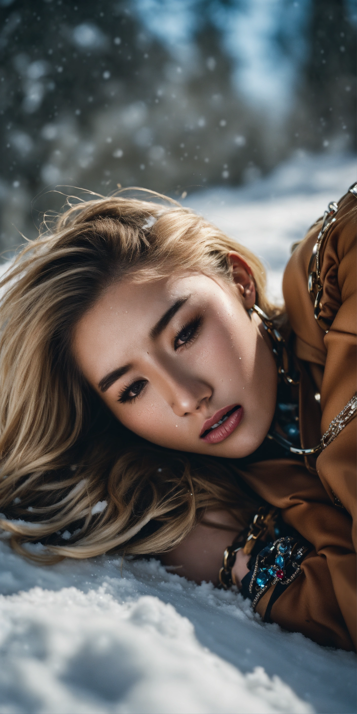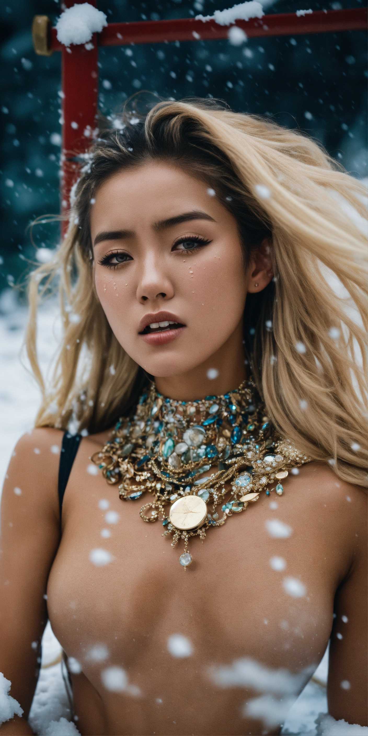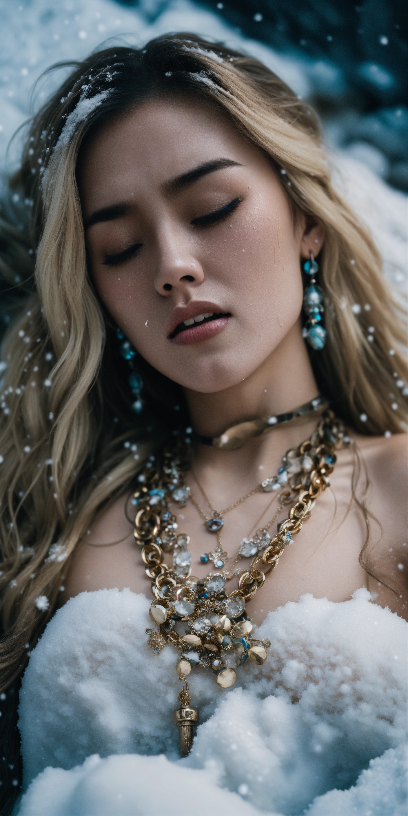 Overhead camera angle, body in snow, full body, lying down, lots of jewelry, dead, cheerleader, shiny skin, wet messy long hair, crying, screaming, very many straps, crying, distressed, many gorgeous young women, handcuffed, barefoot, blonde hair, asian women, very pale skin, fitness influencer, highly detailed, dramatic shoot, sharp focus, 4k uhd, cinematic lighting, tense.