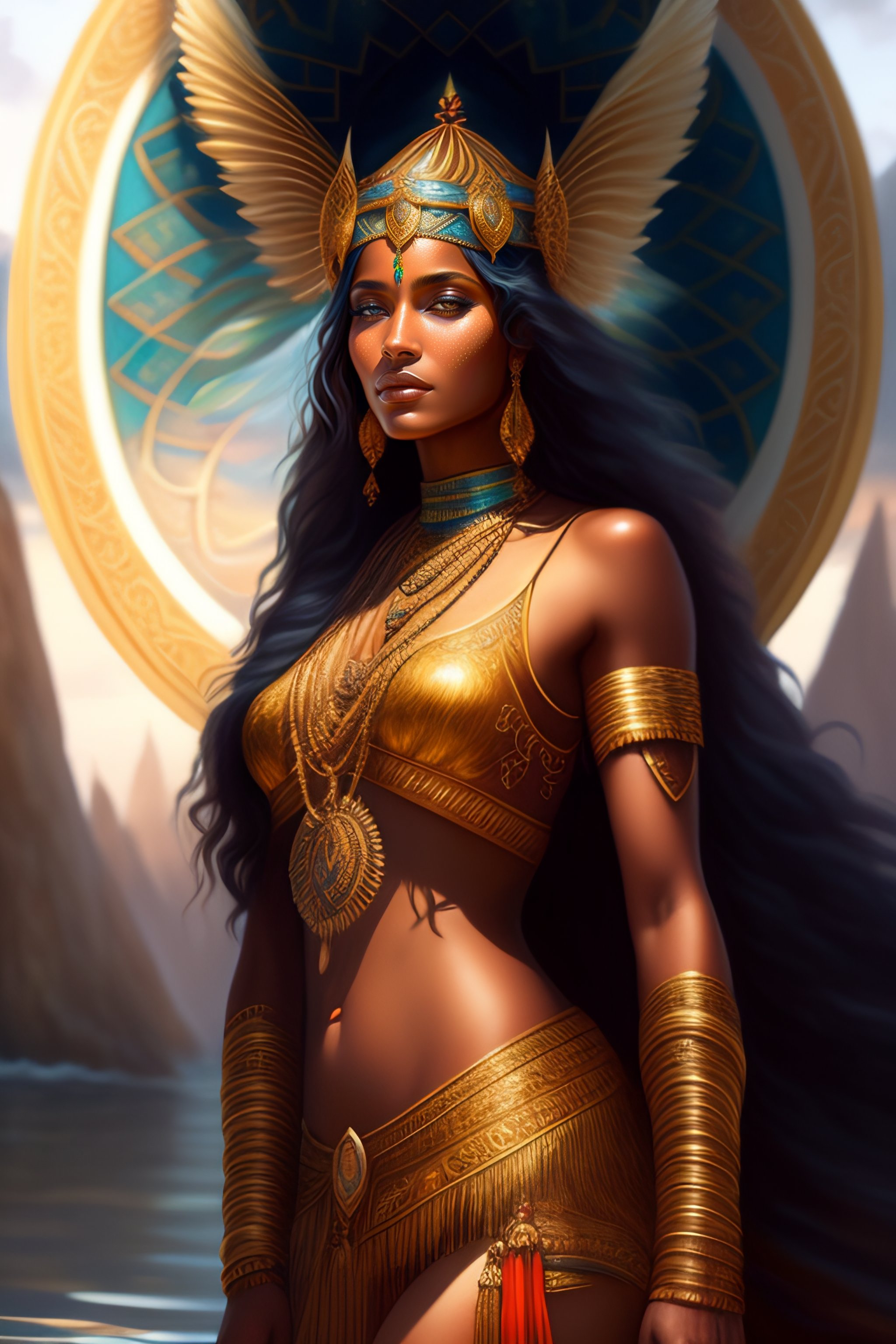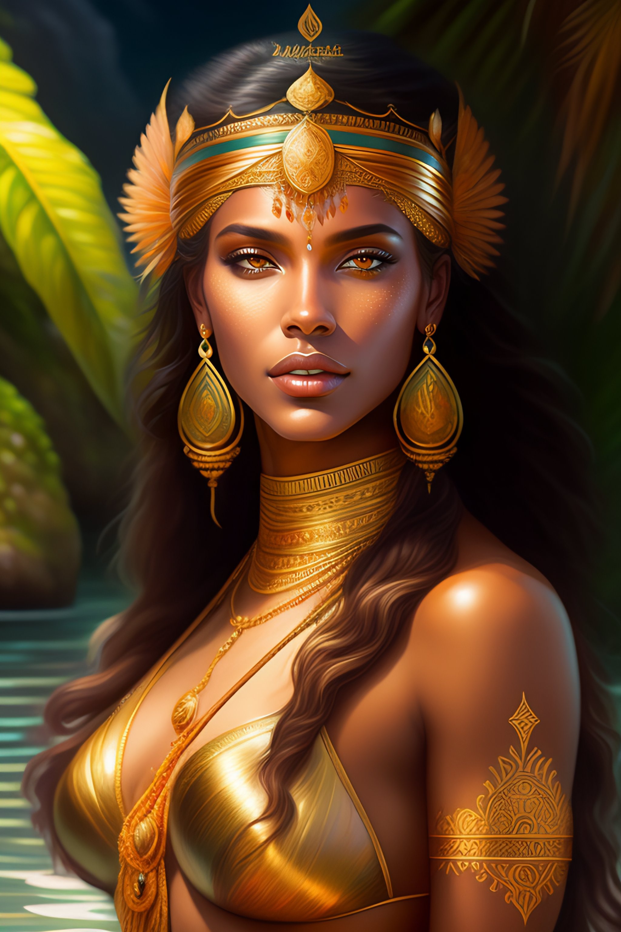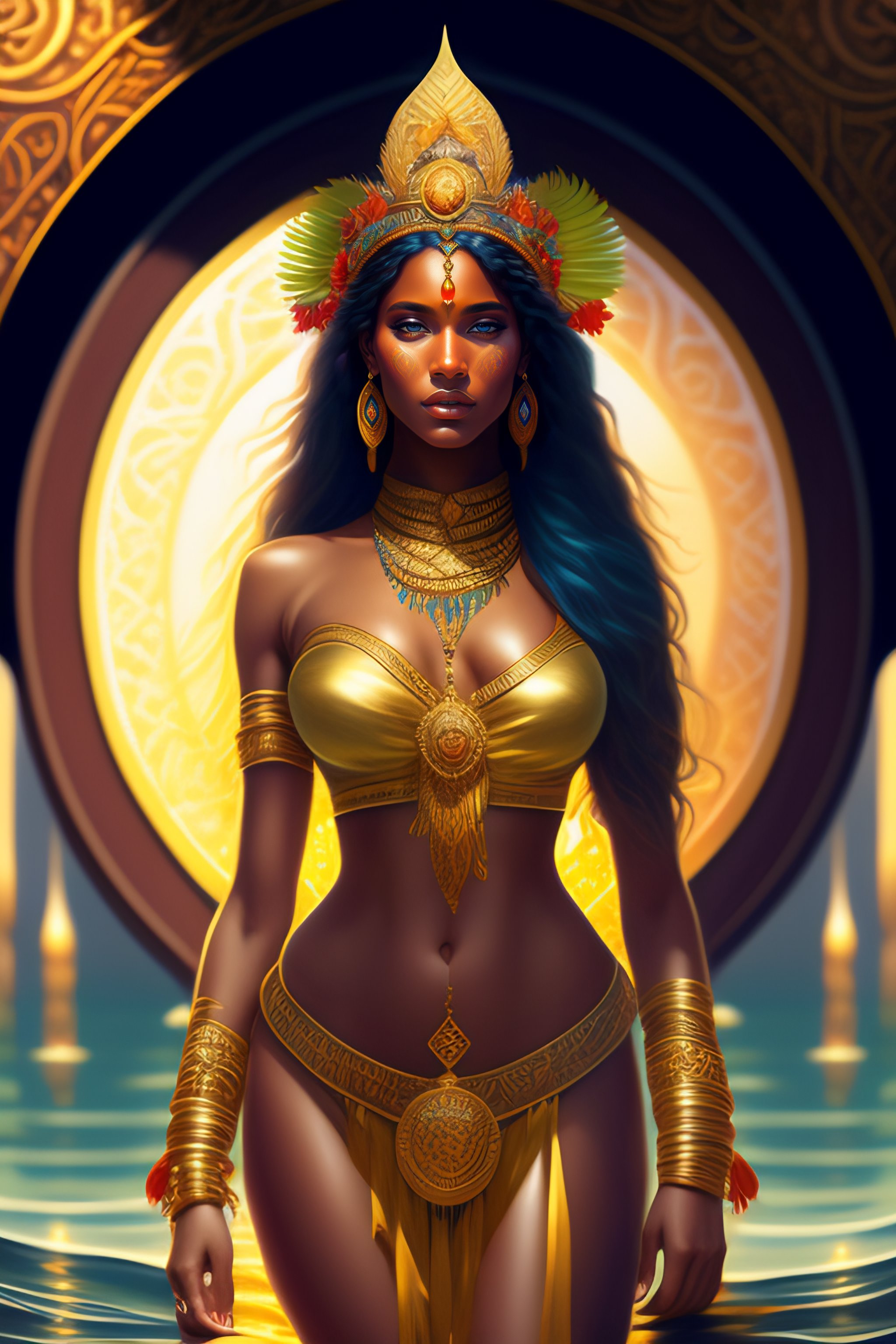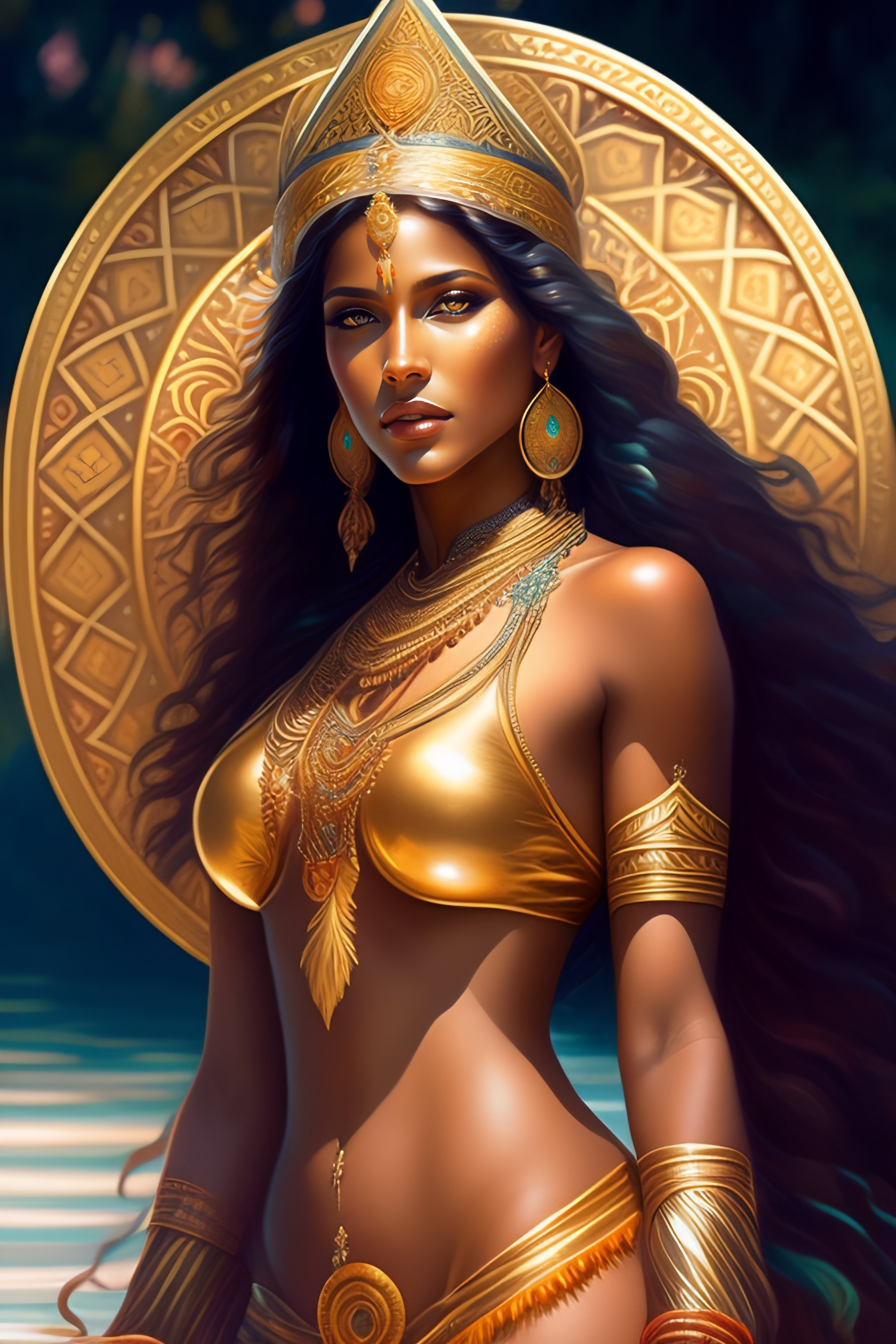 Image of goddess brazilian indigenous goddess jaci on lagoon, d & d, beautiful, renaissance, fantasy, intricate, elegant, hindu, highly detailed, digital painting, artstation, concept art, smooth, sharp focus, illustration, art by artgerm and greg rutkowski and alphonse mucha