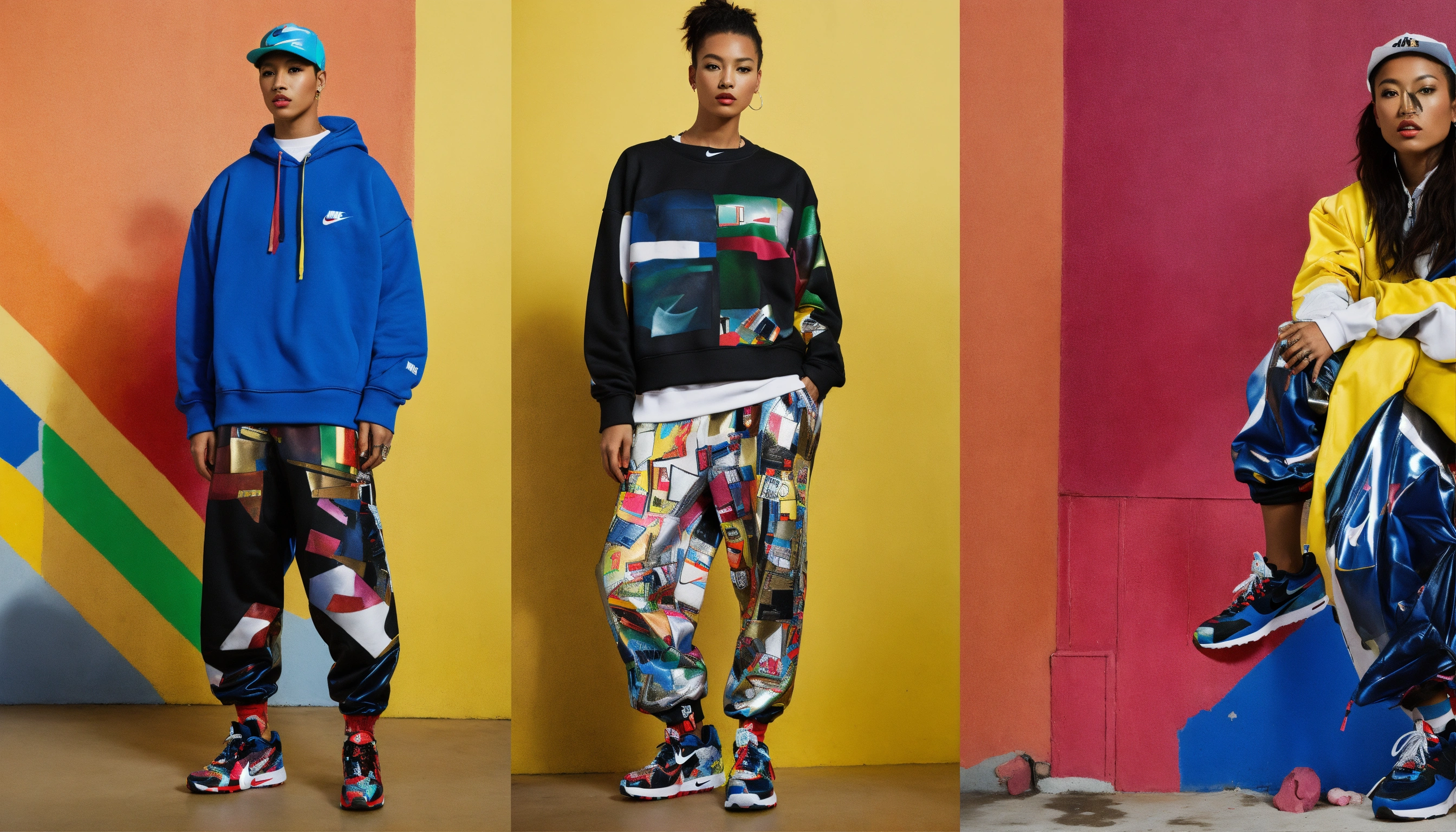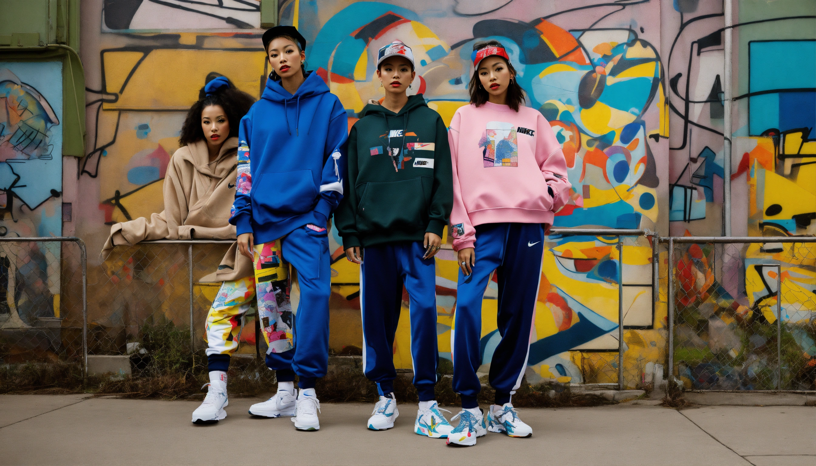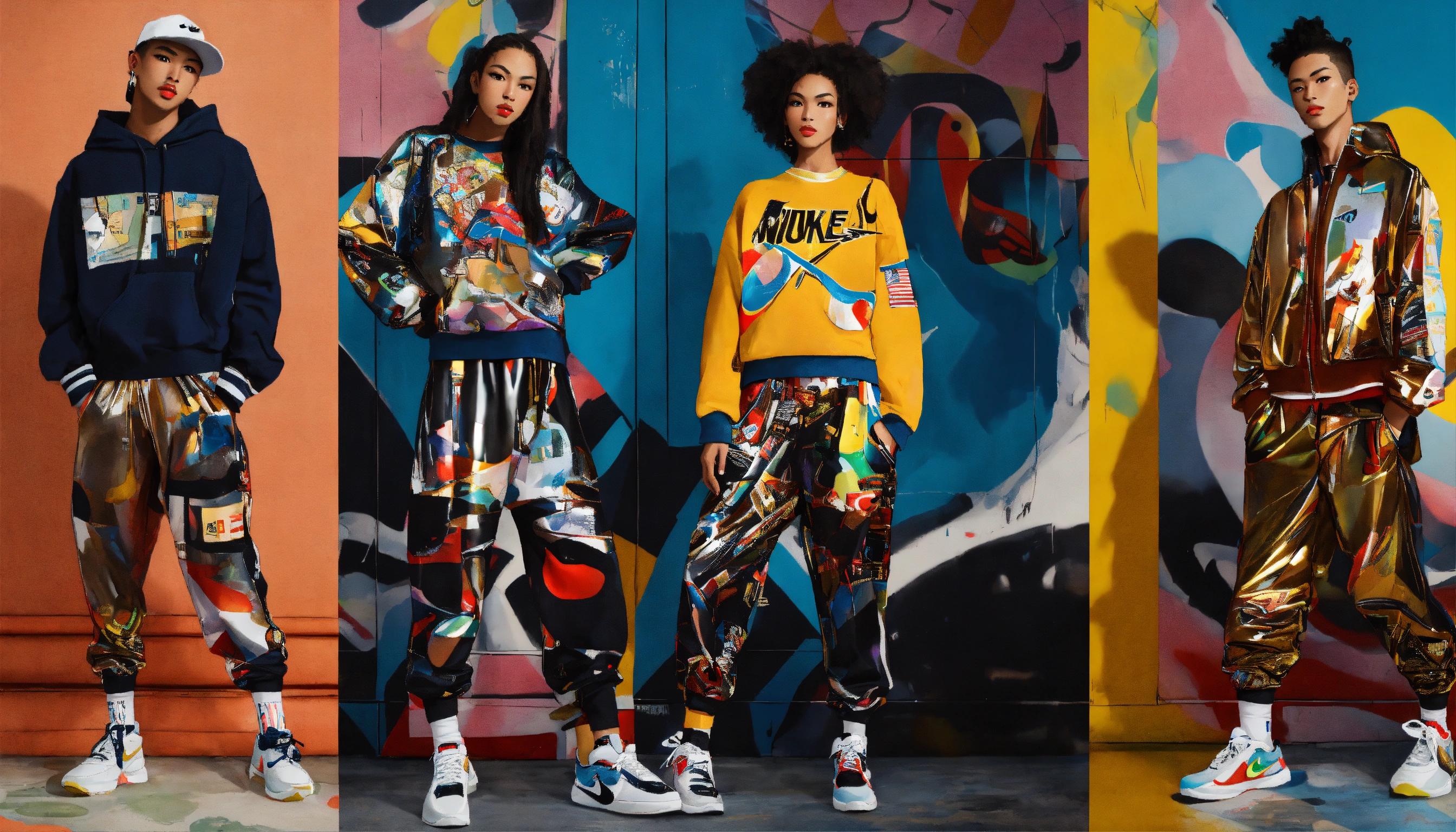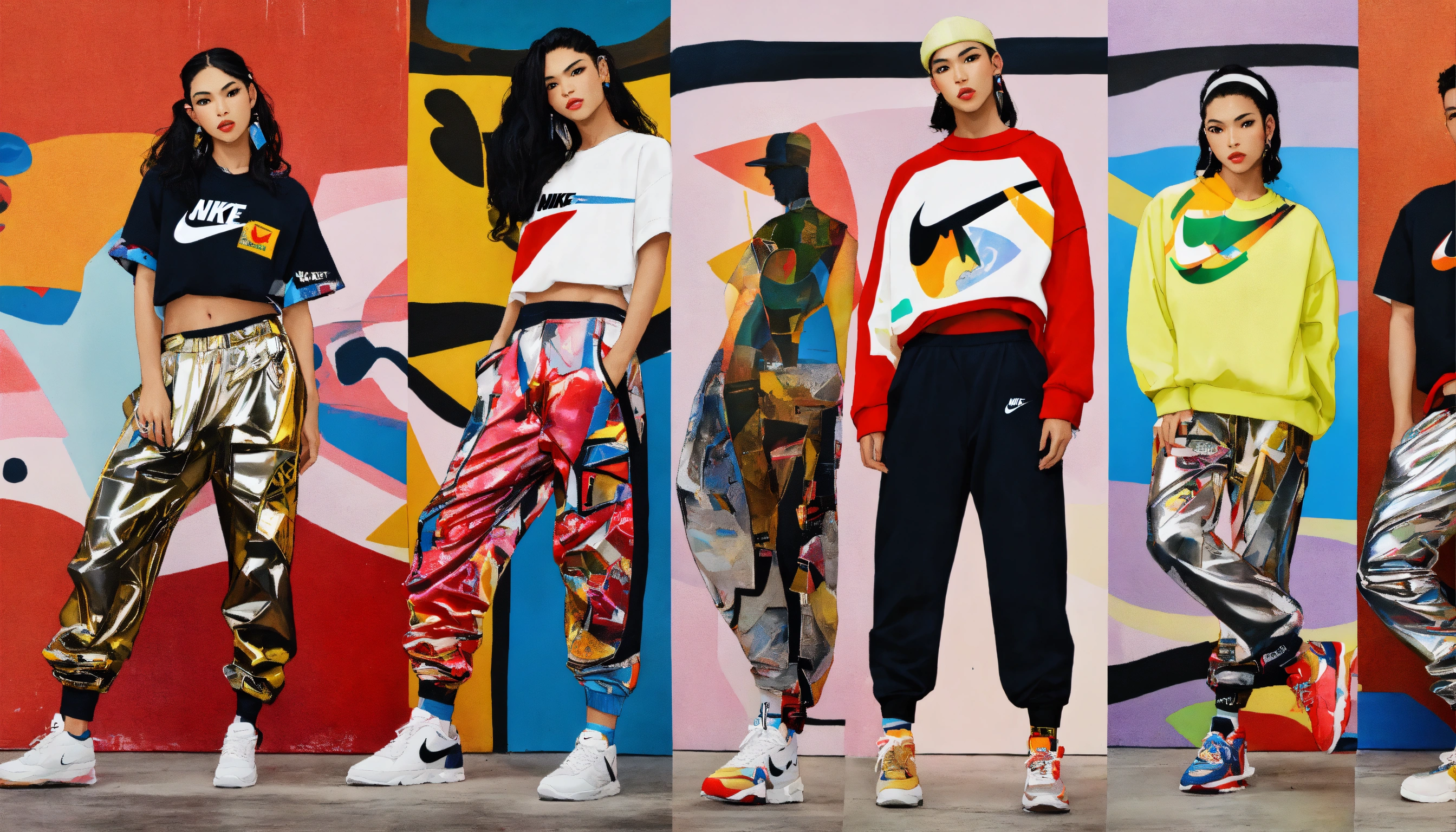 Dream model chola american, pinup, nike sweatshirt and metallic-pants, futuristic shoes, team photo of mixed and matched outfits, graffiti/kandinsky collaged clothing selects, line sheet lookbook nigo human made