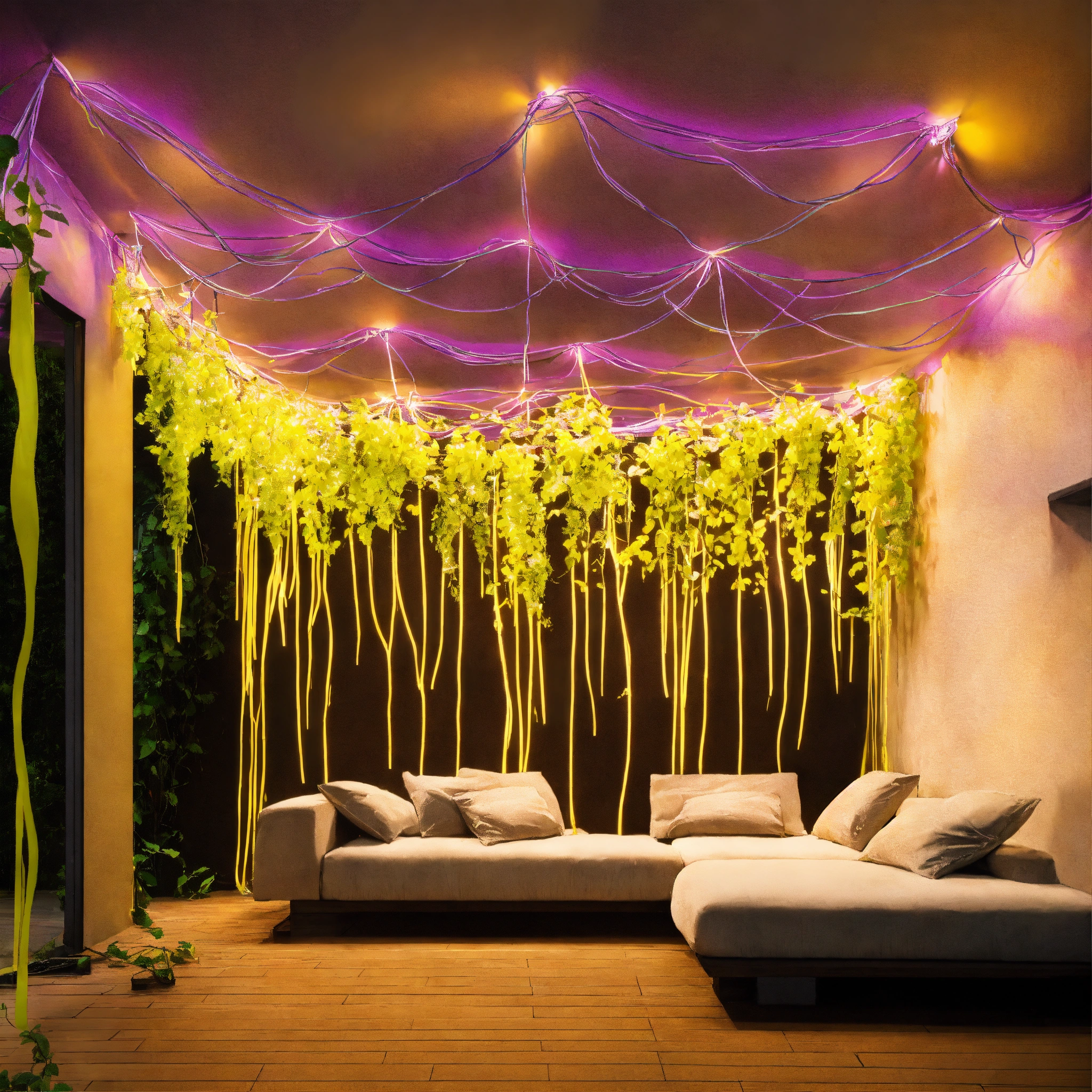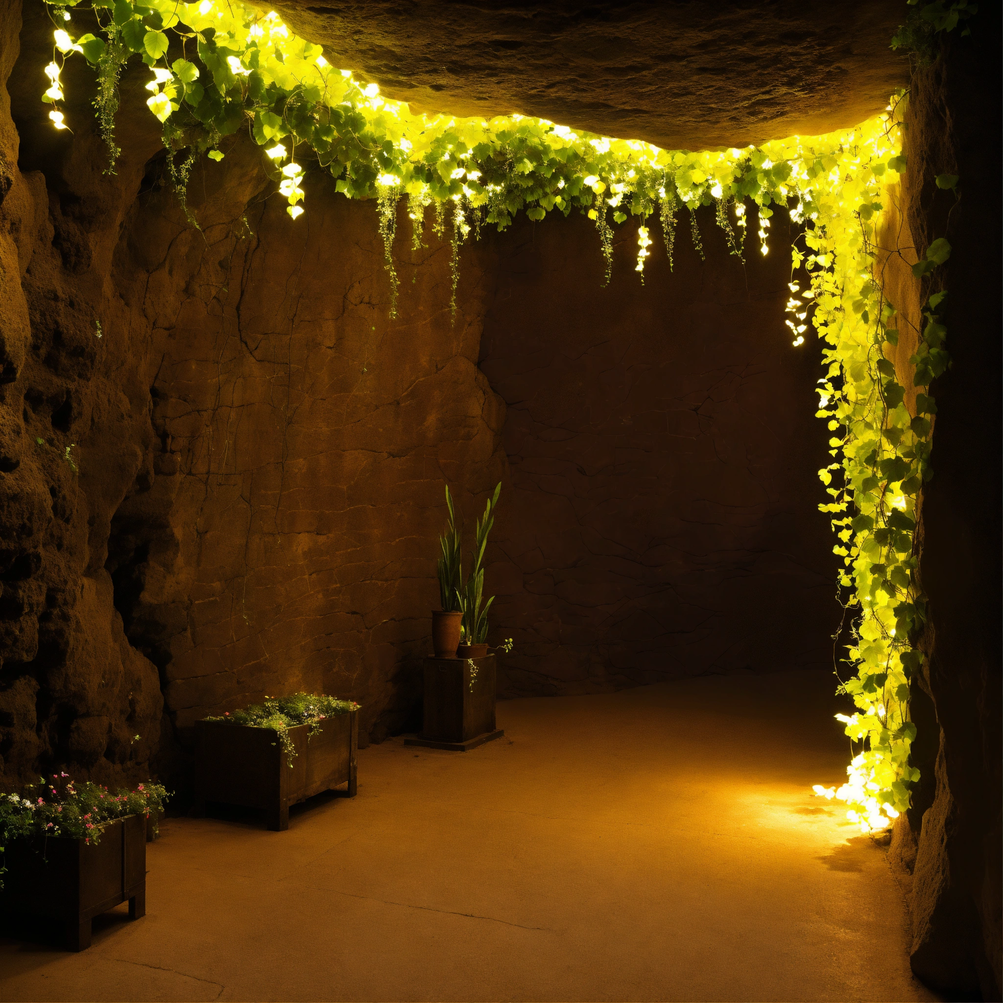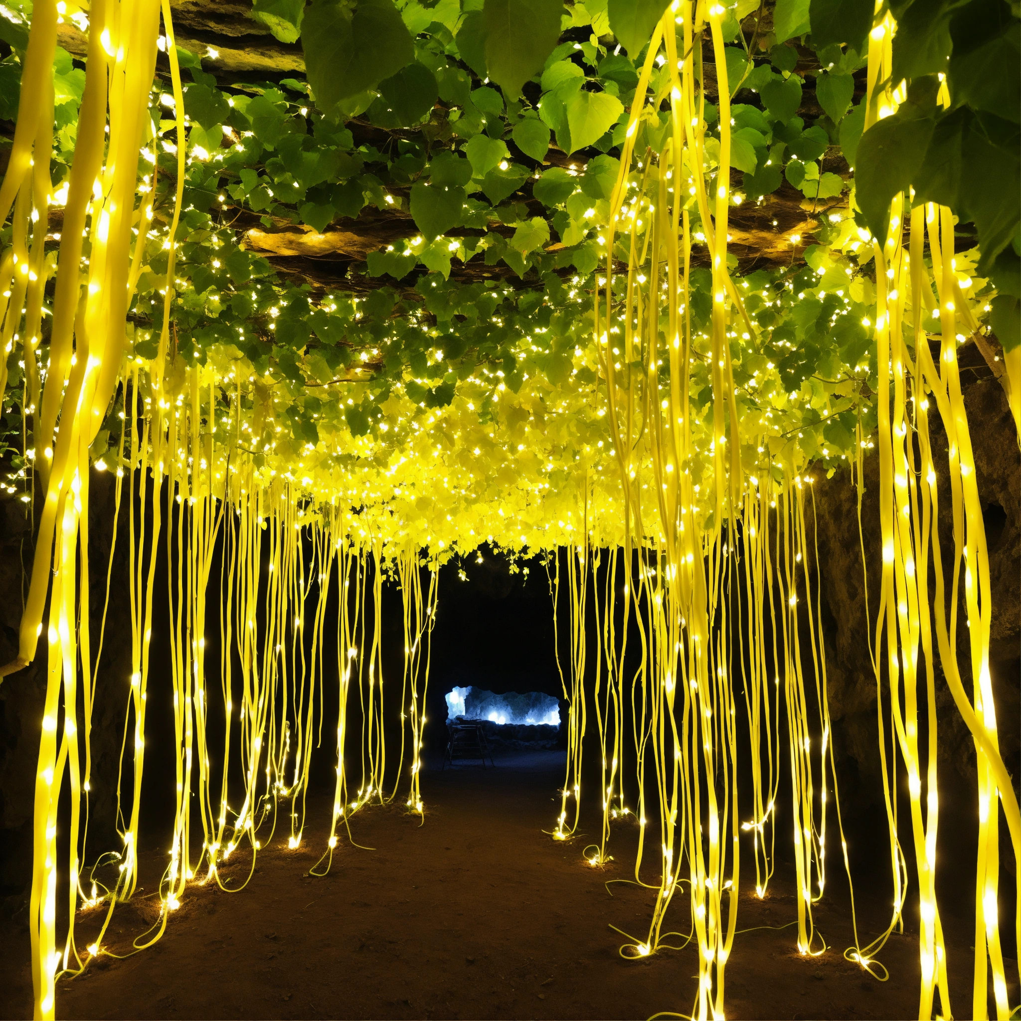 Luminous vines climbing plants with tendrils that emit a yellow glow, providing an organic, natural lighting solution for cave walls or structures\