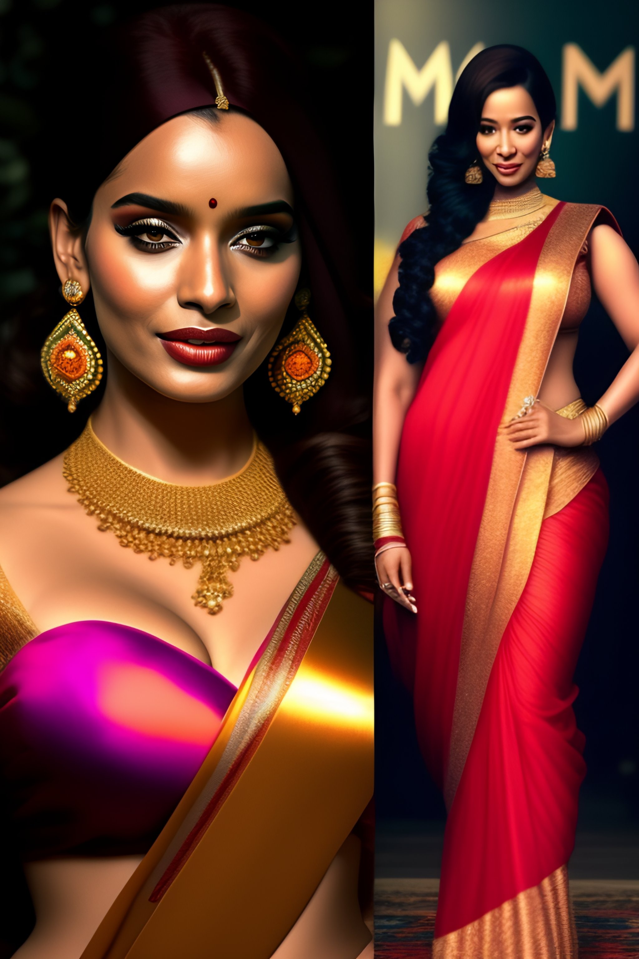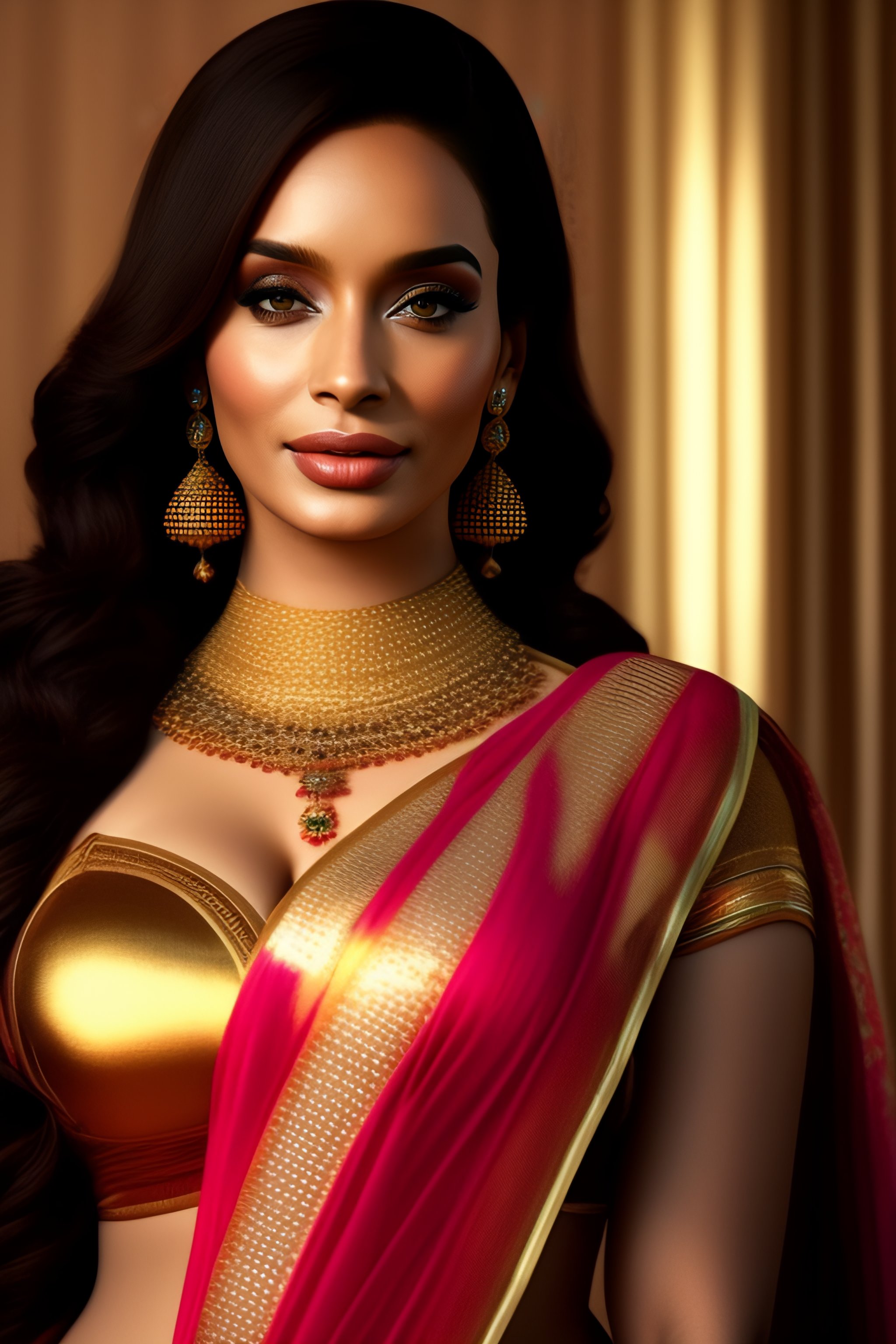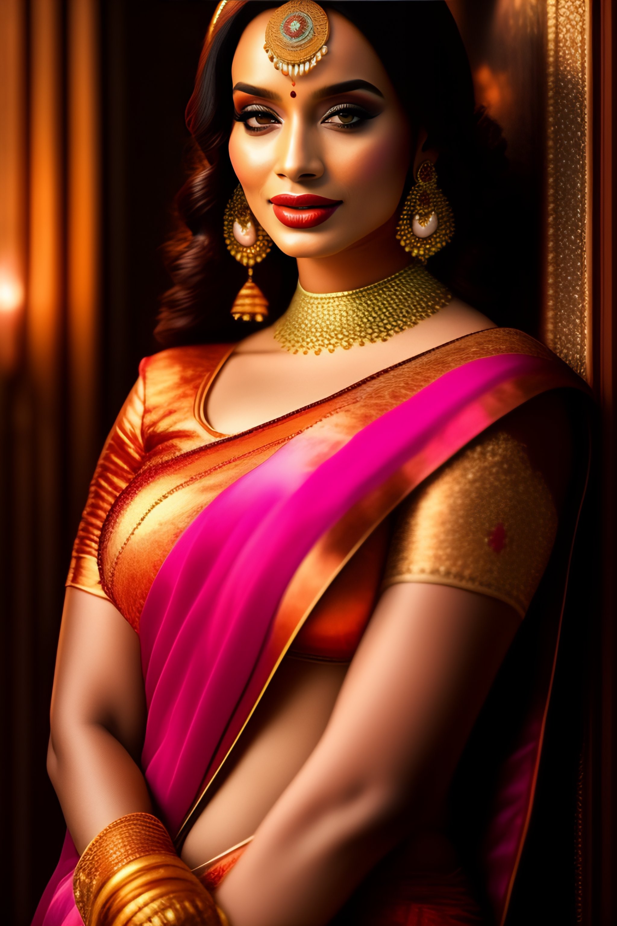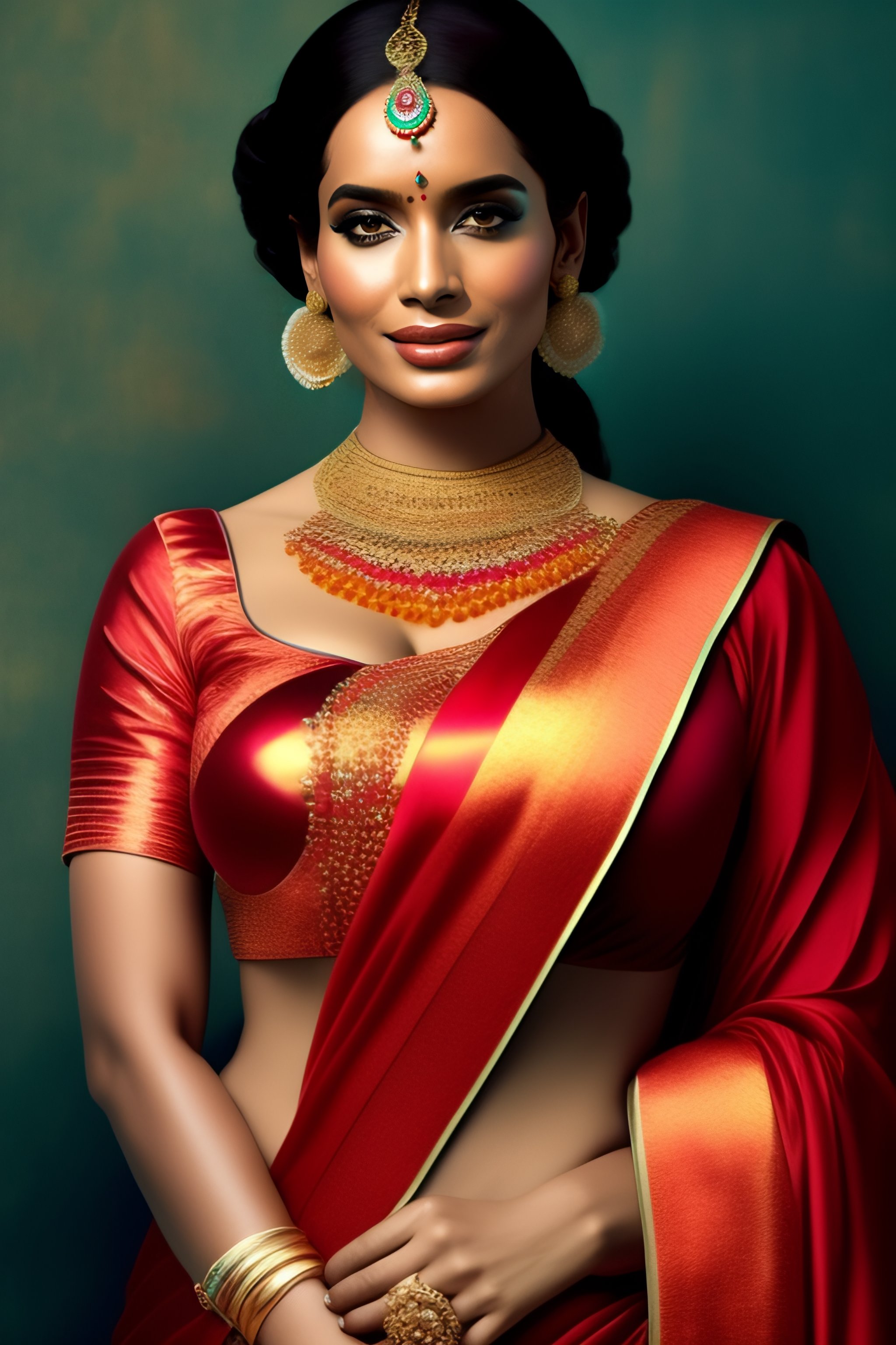 Young north indian girl in a saree, christina hendricks, massive downblouse, fit body, wearing saree, wearing kebama, vogue photoshoot, maxim photoshoot, ultra realistic, fair skin