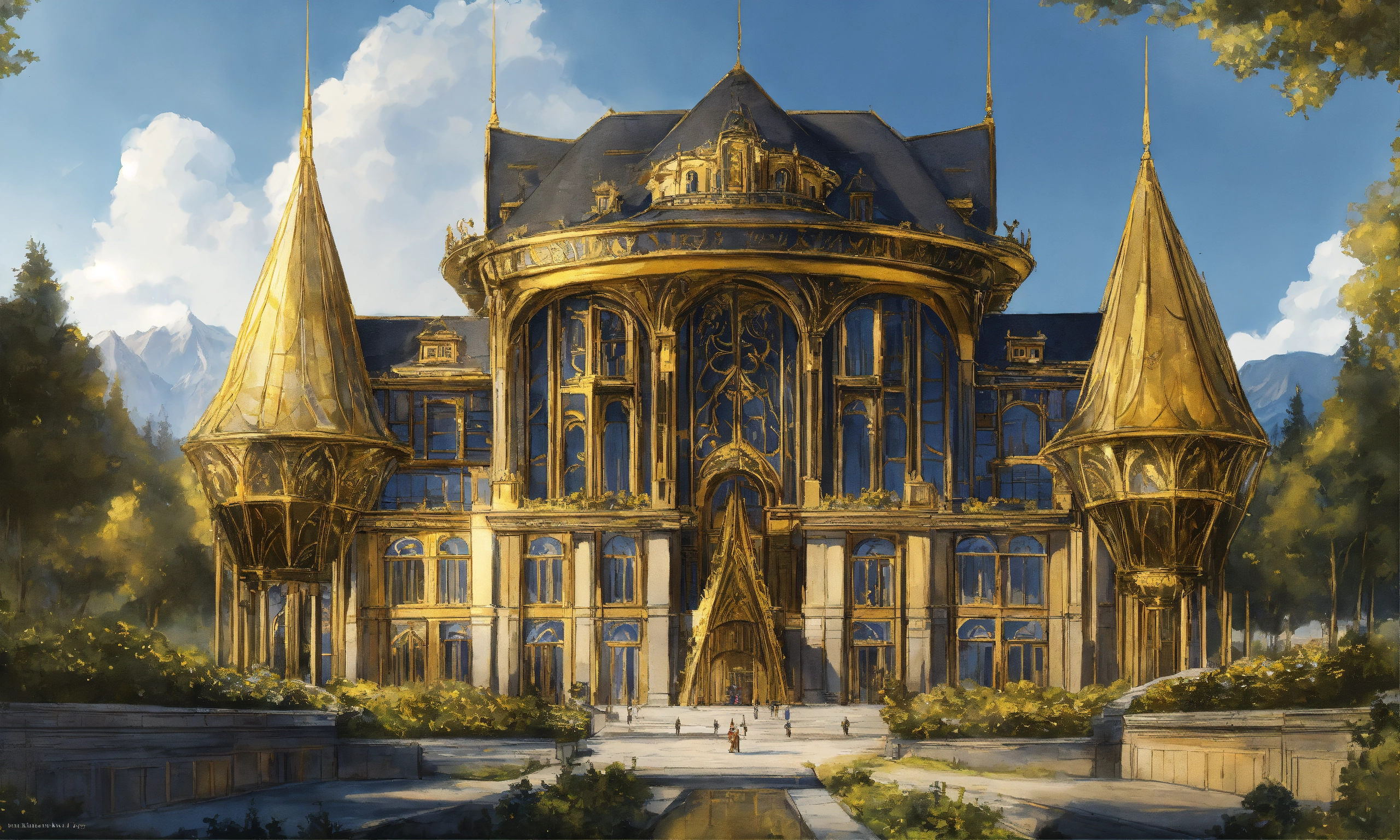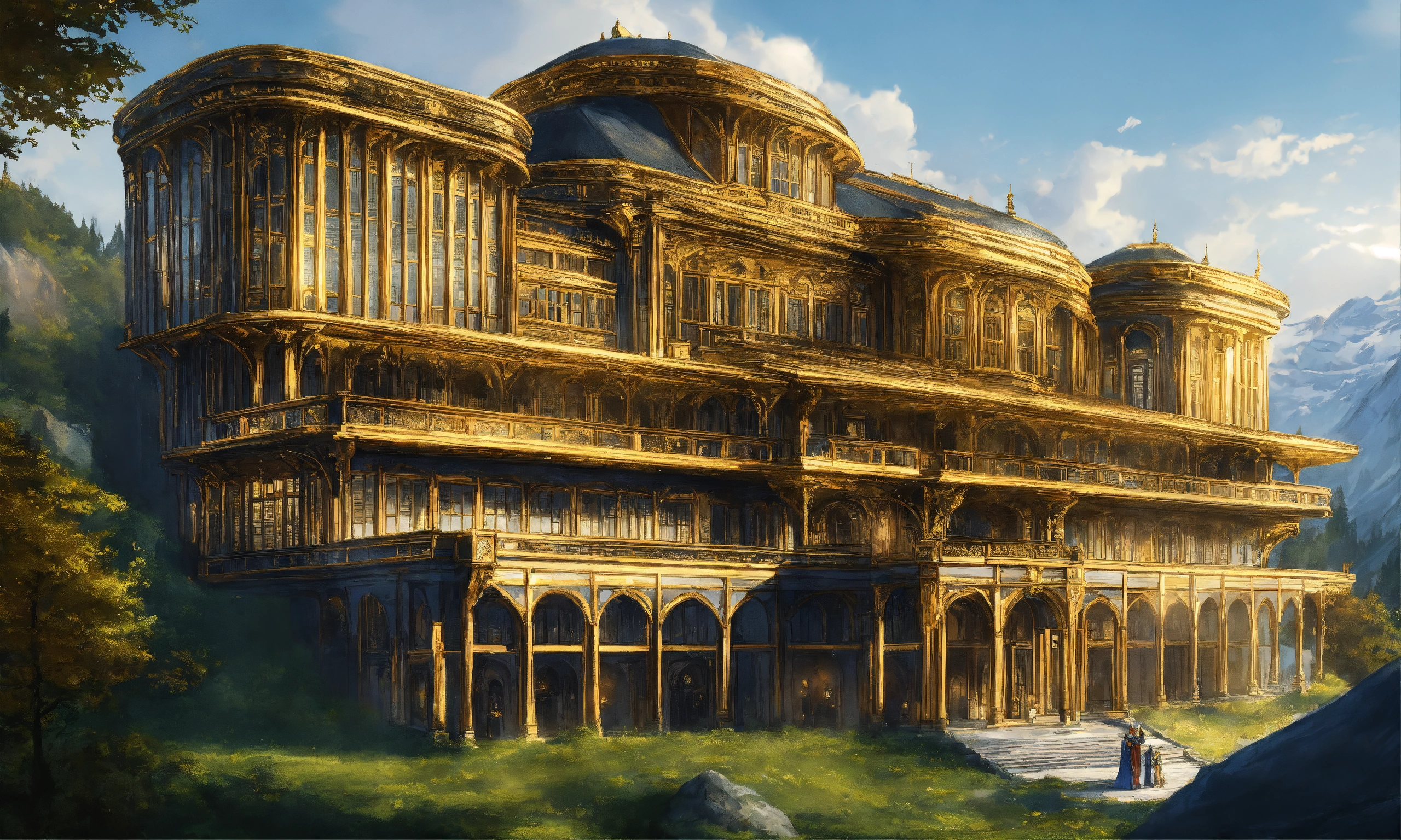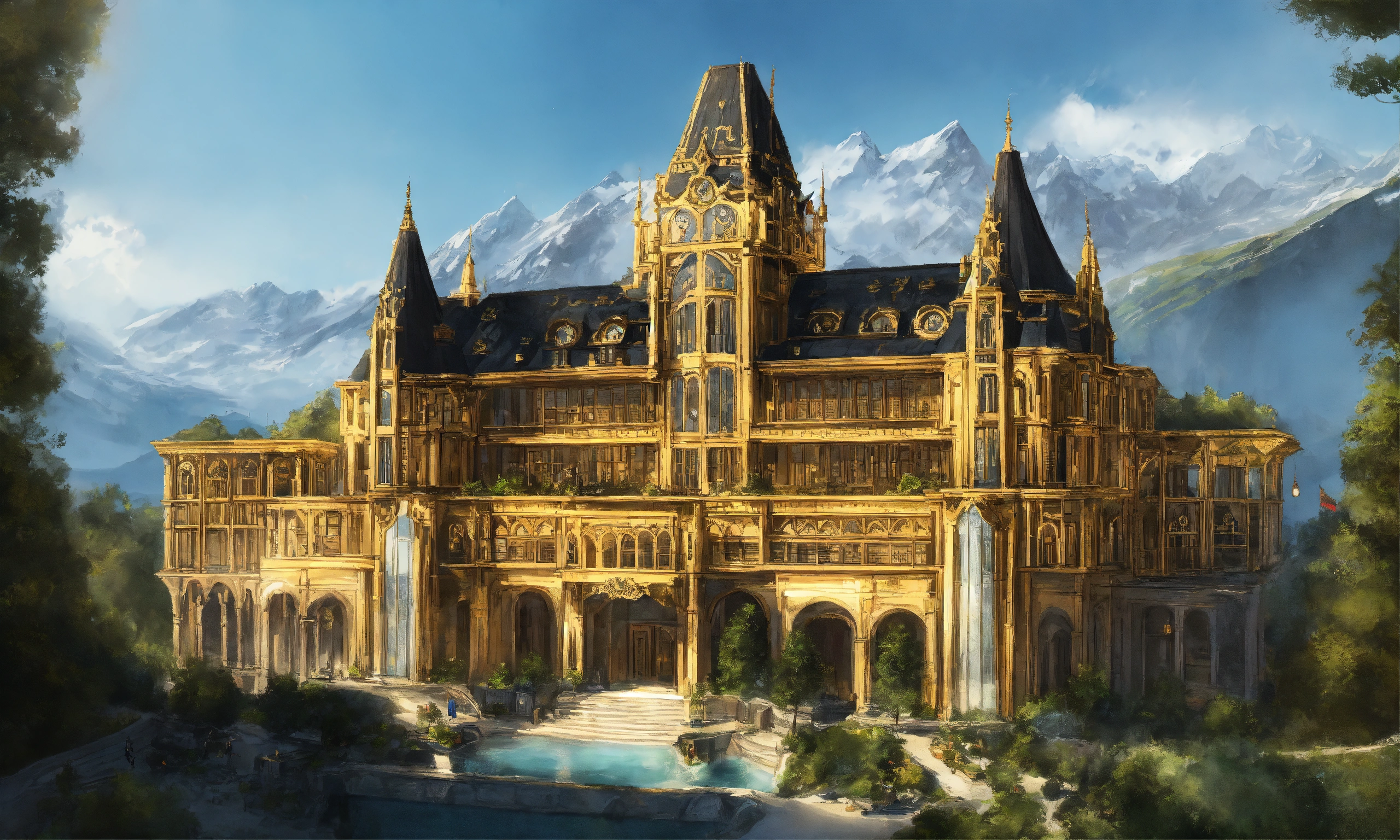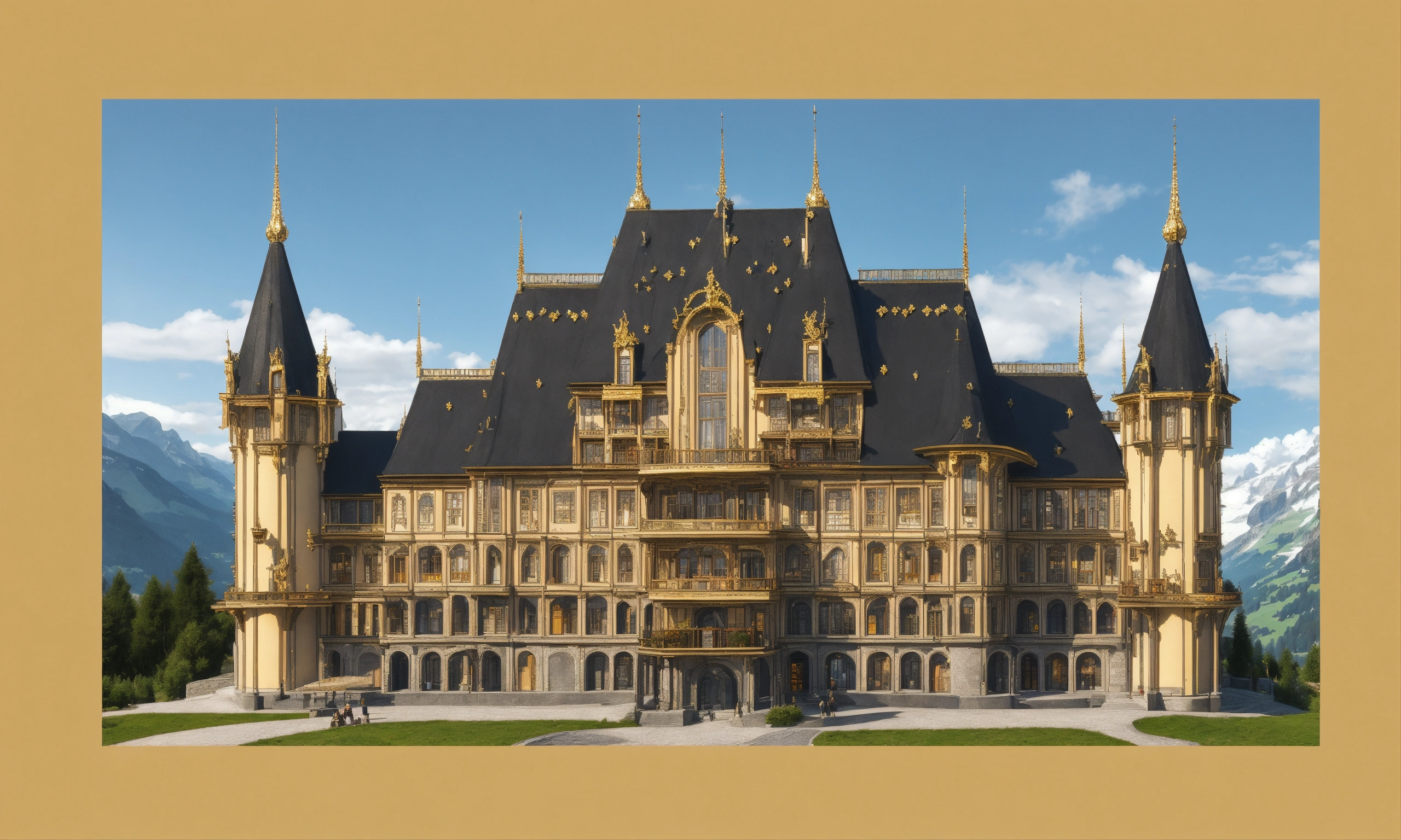 Drawing of the full image of a massive black and gold elegant high elf sci fi palace in switzerland, elven architecture, clear blue skies