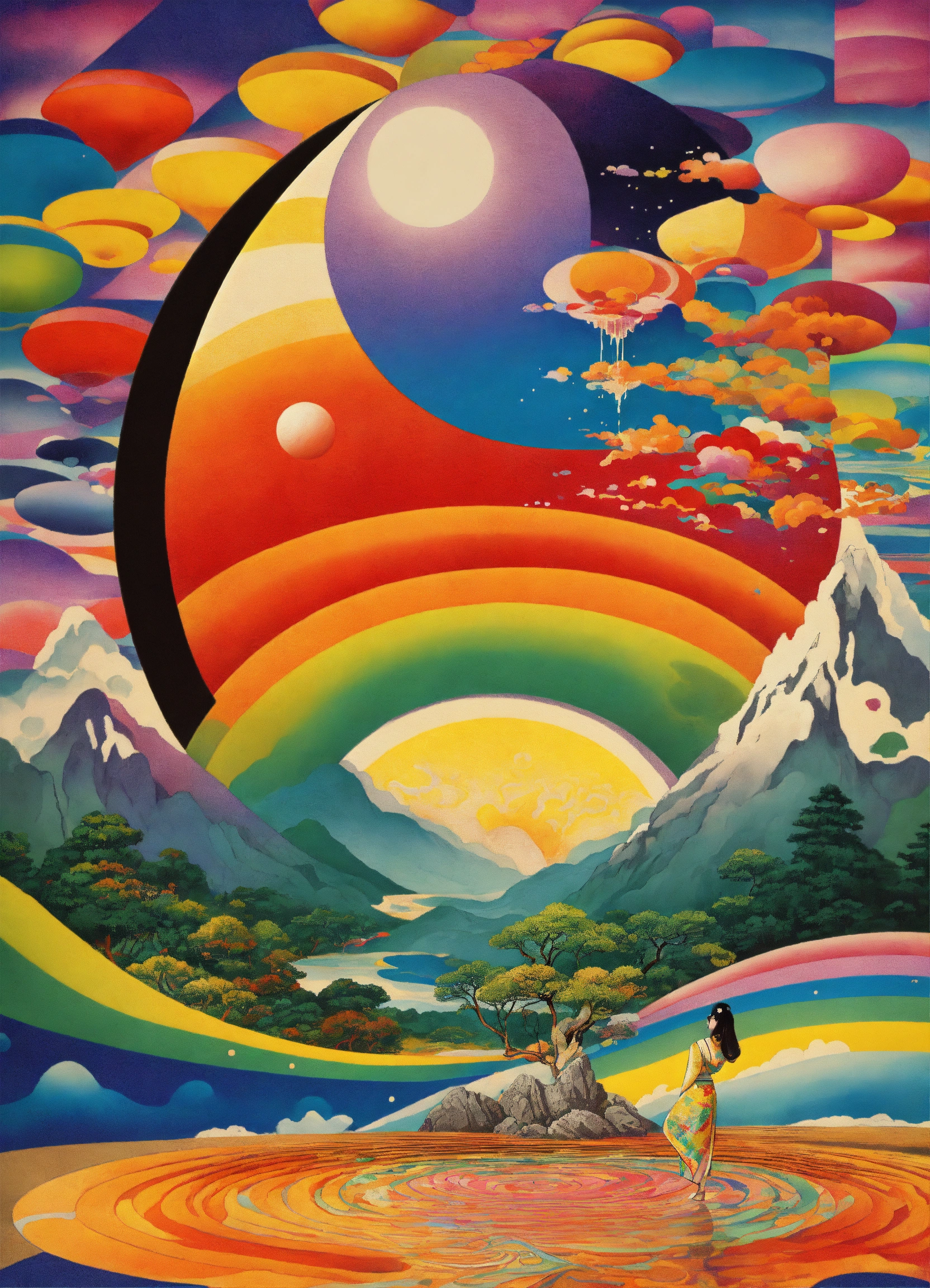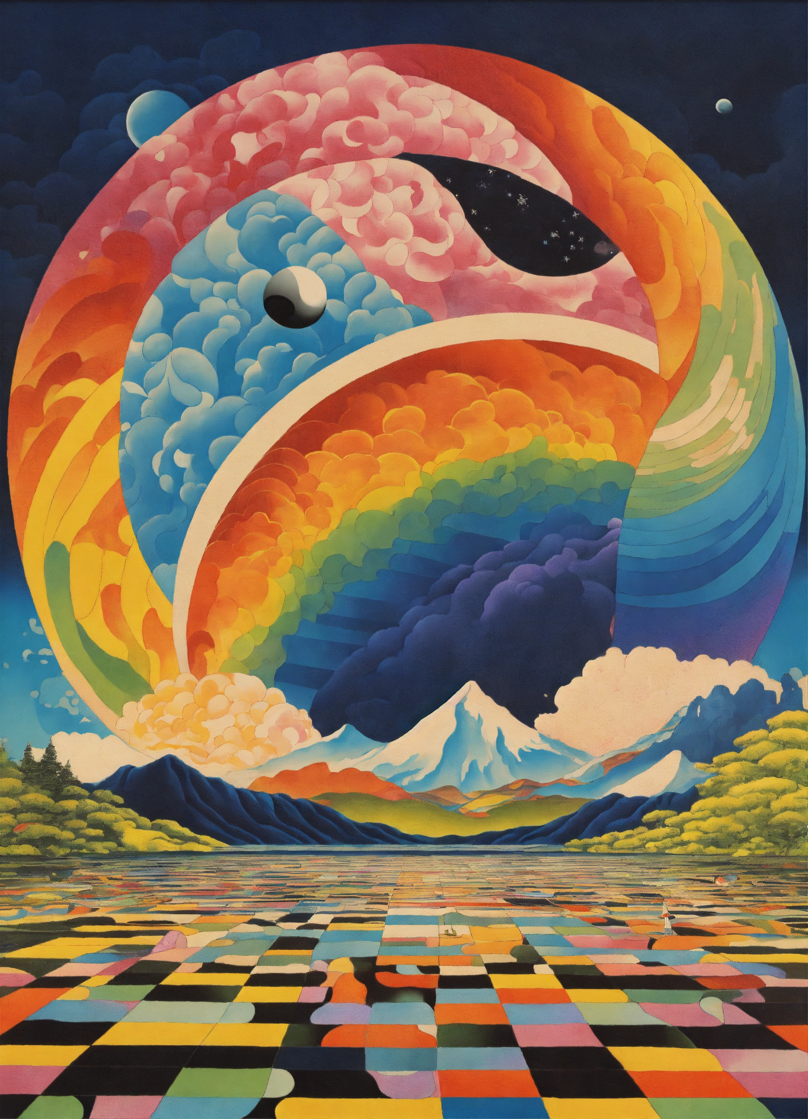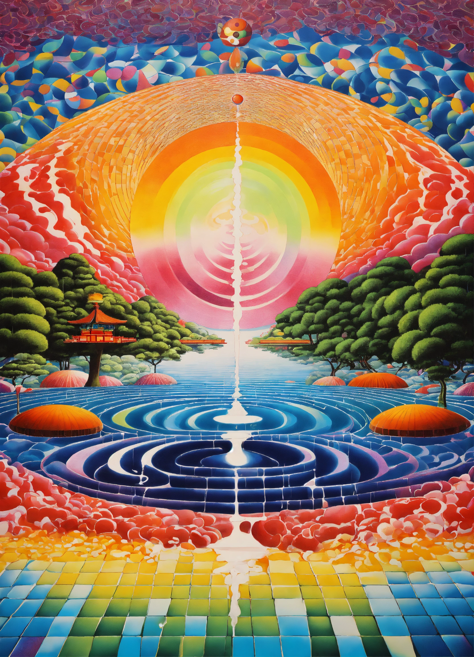 Japanese vintage poster, psychedelic ying yang dripping, melting, cosmic realm, distorted geometric background, wavy chequered flooring, rainbow abstract cosmos merging into zen garden meets dream dimension by maurtis cornelis escher