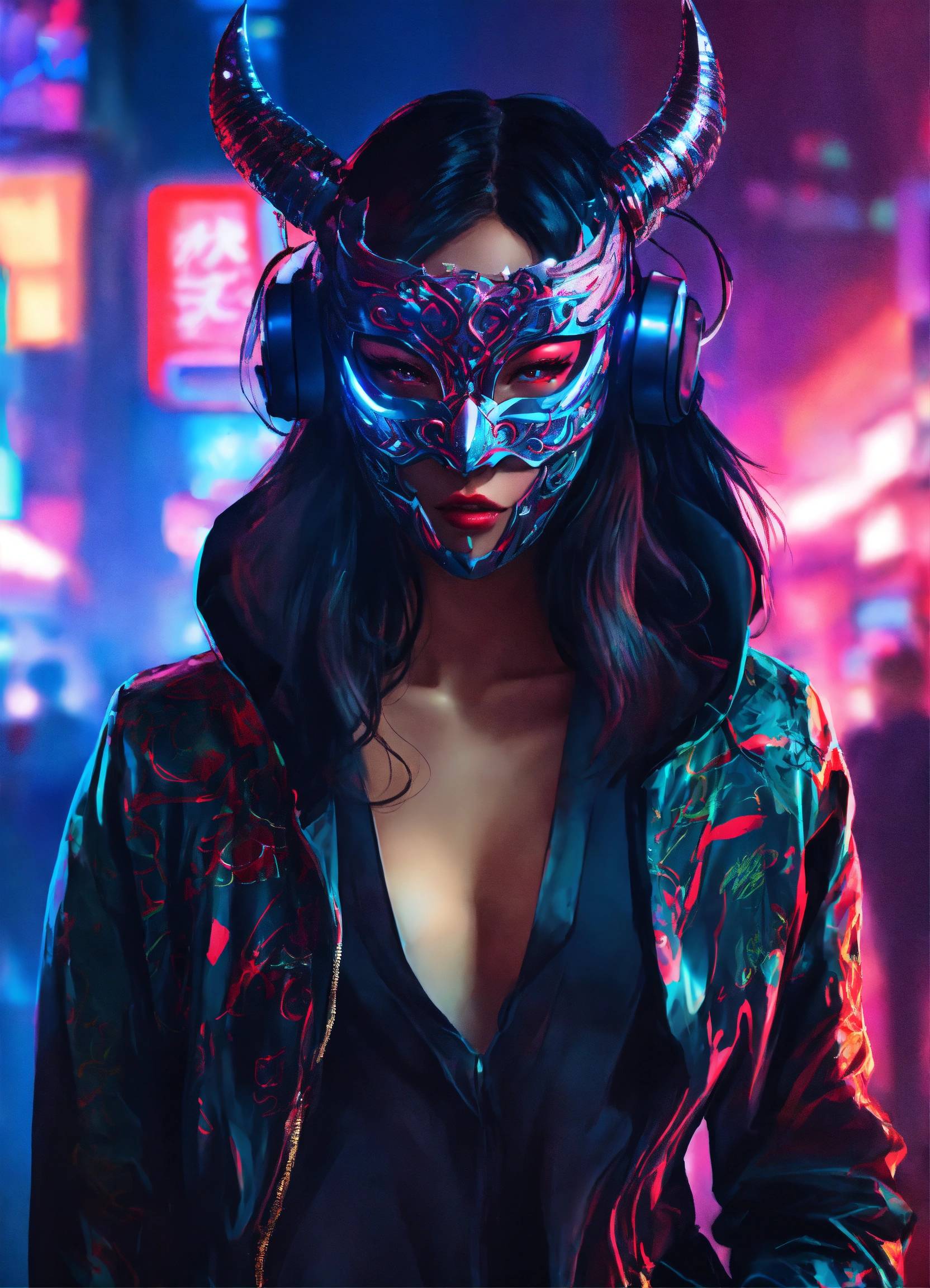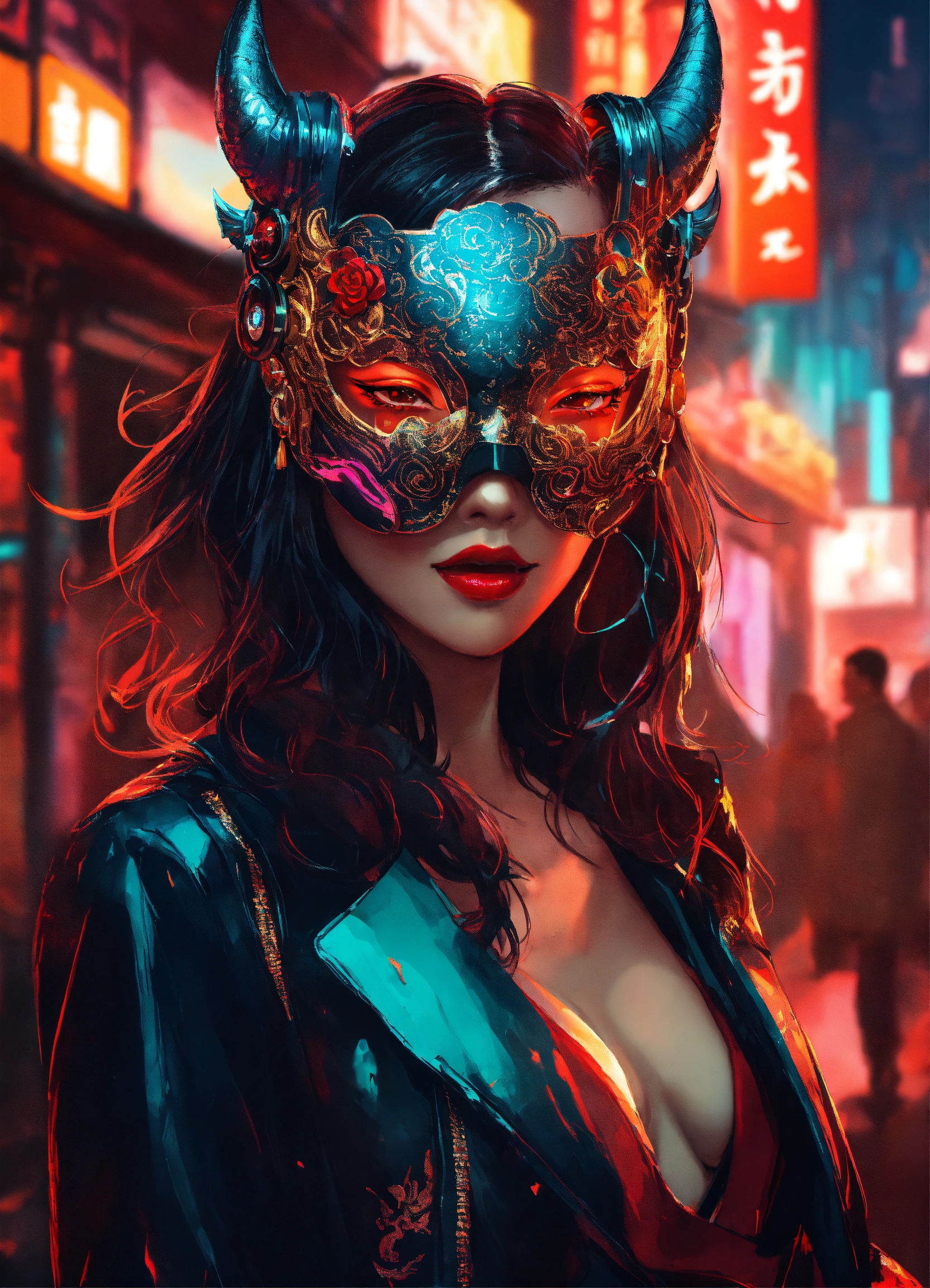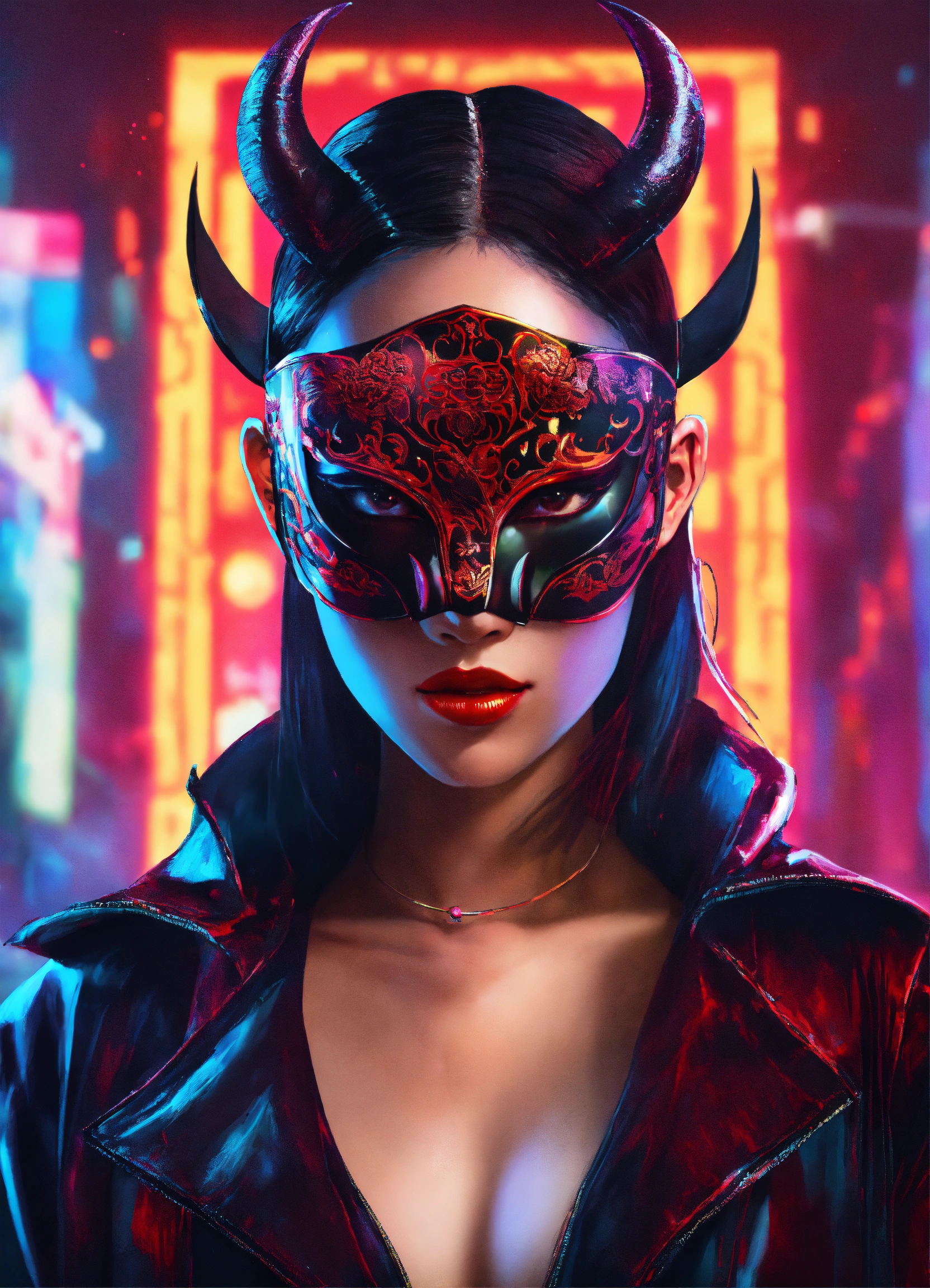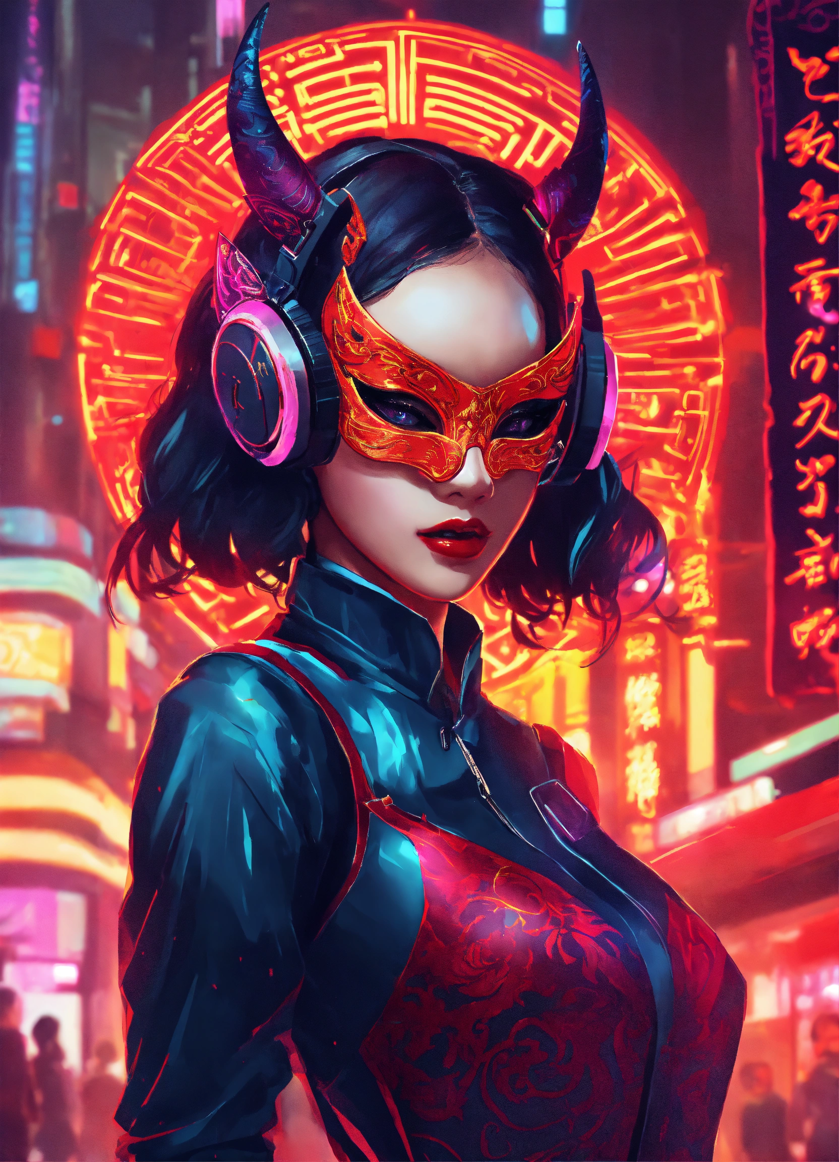 Chinese cyberpunk in glamorous with demon mask at a masquerade trendy, sophisticated, and sneaky with high-tech clothing and street smart in a high-tech club. vibrant digital illustration