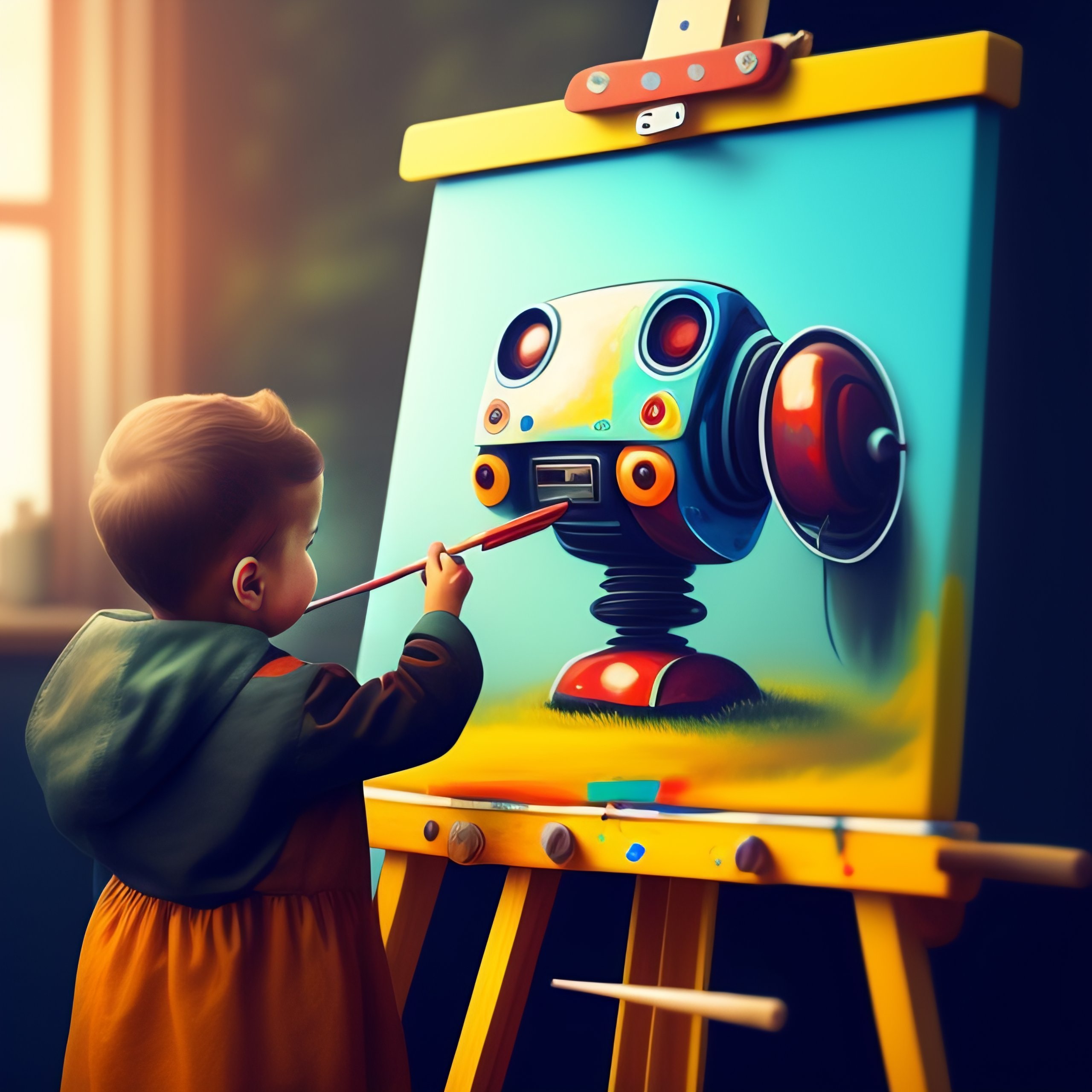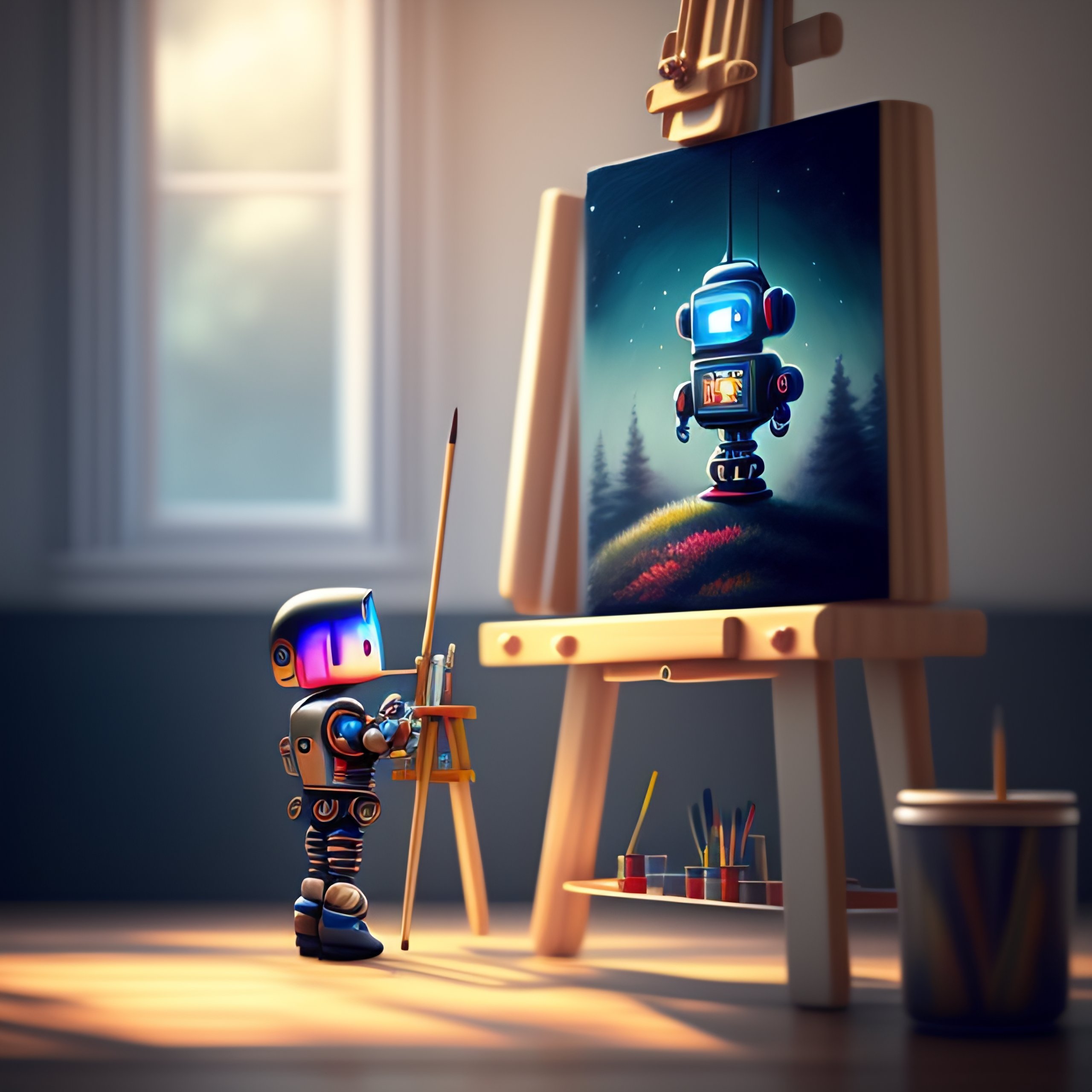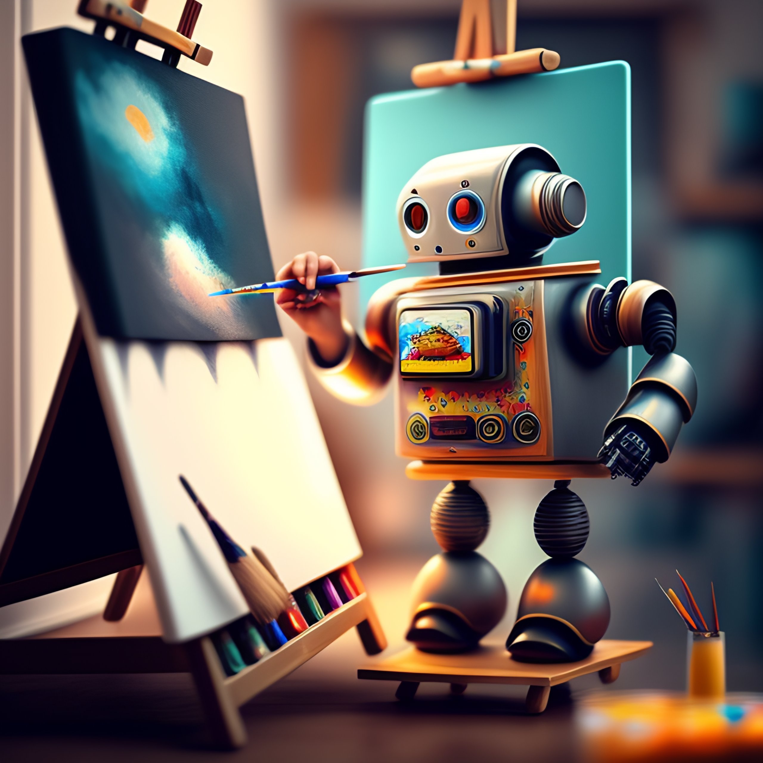 A cute robot artist painting on an easel
