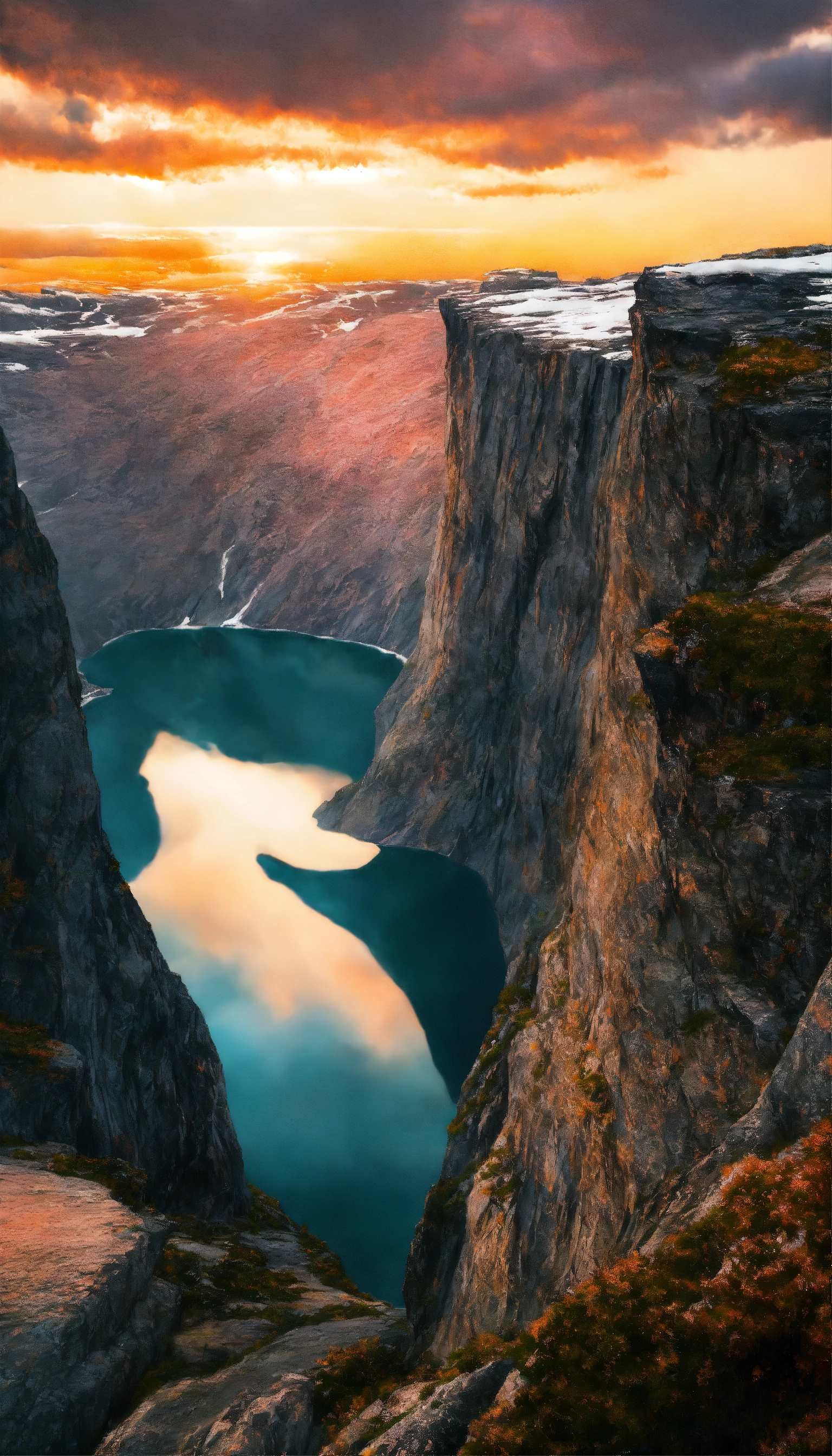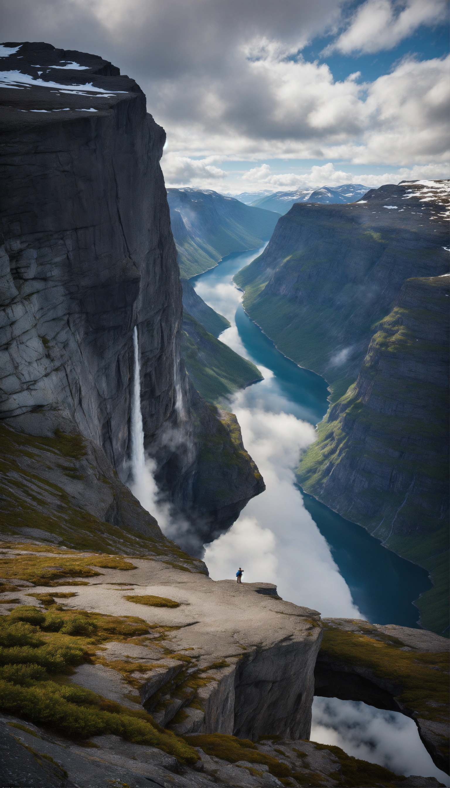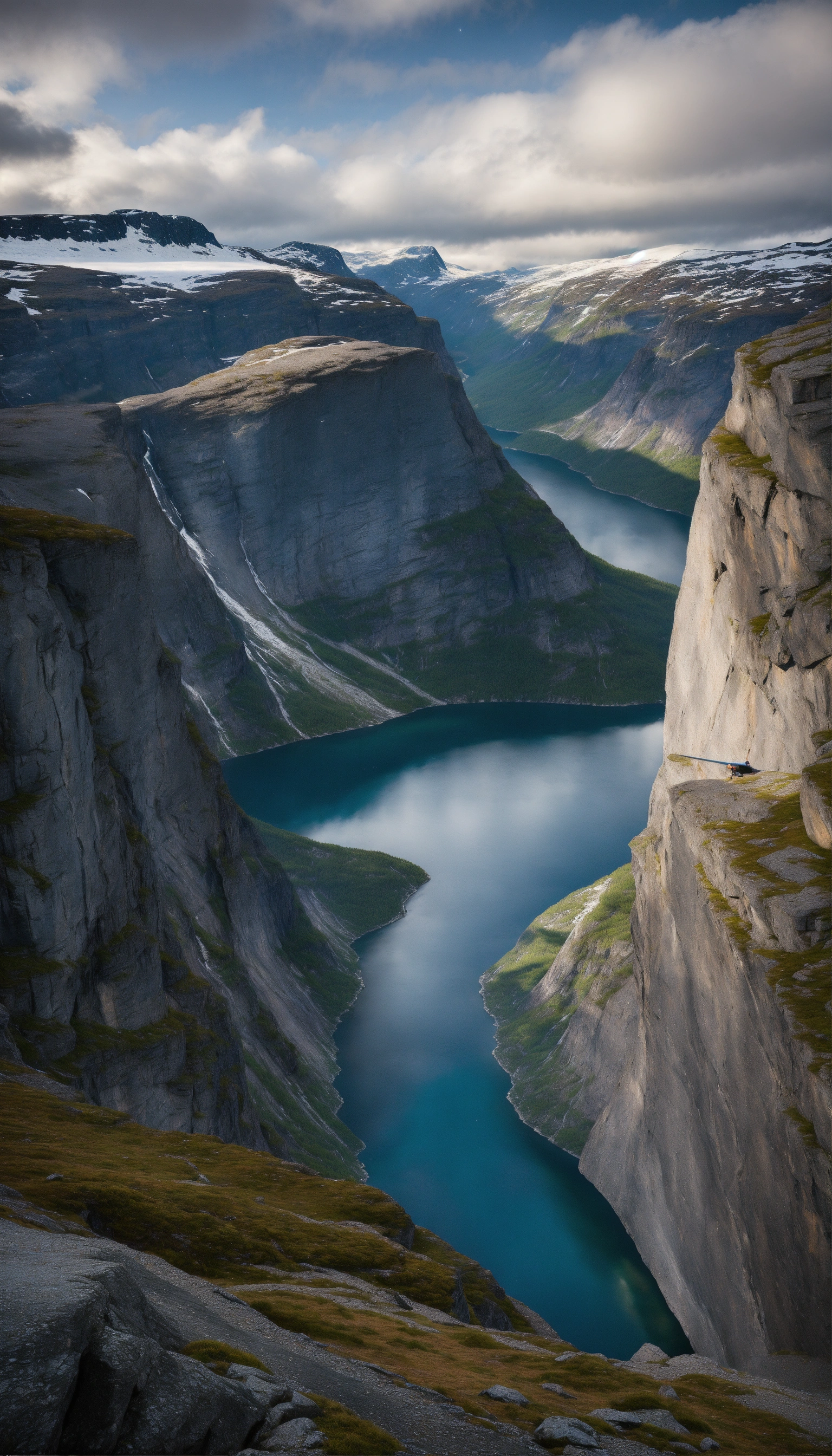 Trolltunga rock in norway, resembling a jutting devil's tongue, is majestic and wondrous. the mountainous space is sketched with pencil strokes, sharp, and clear.
