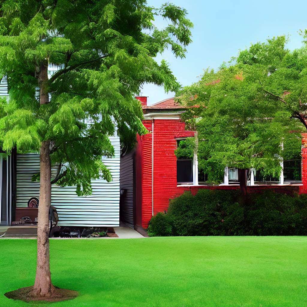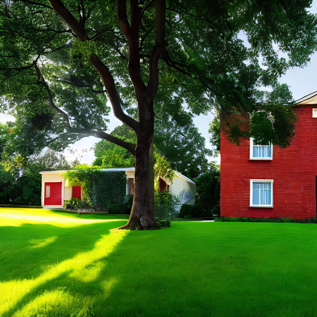 “a green tree swaying in the wind” and “a red brick house located behind a tree” and “a healthy lawn in front of the house”