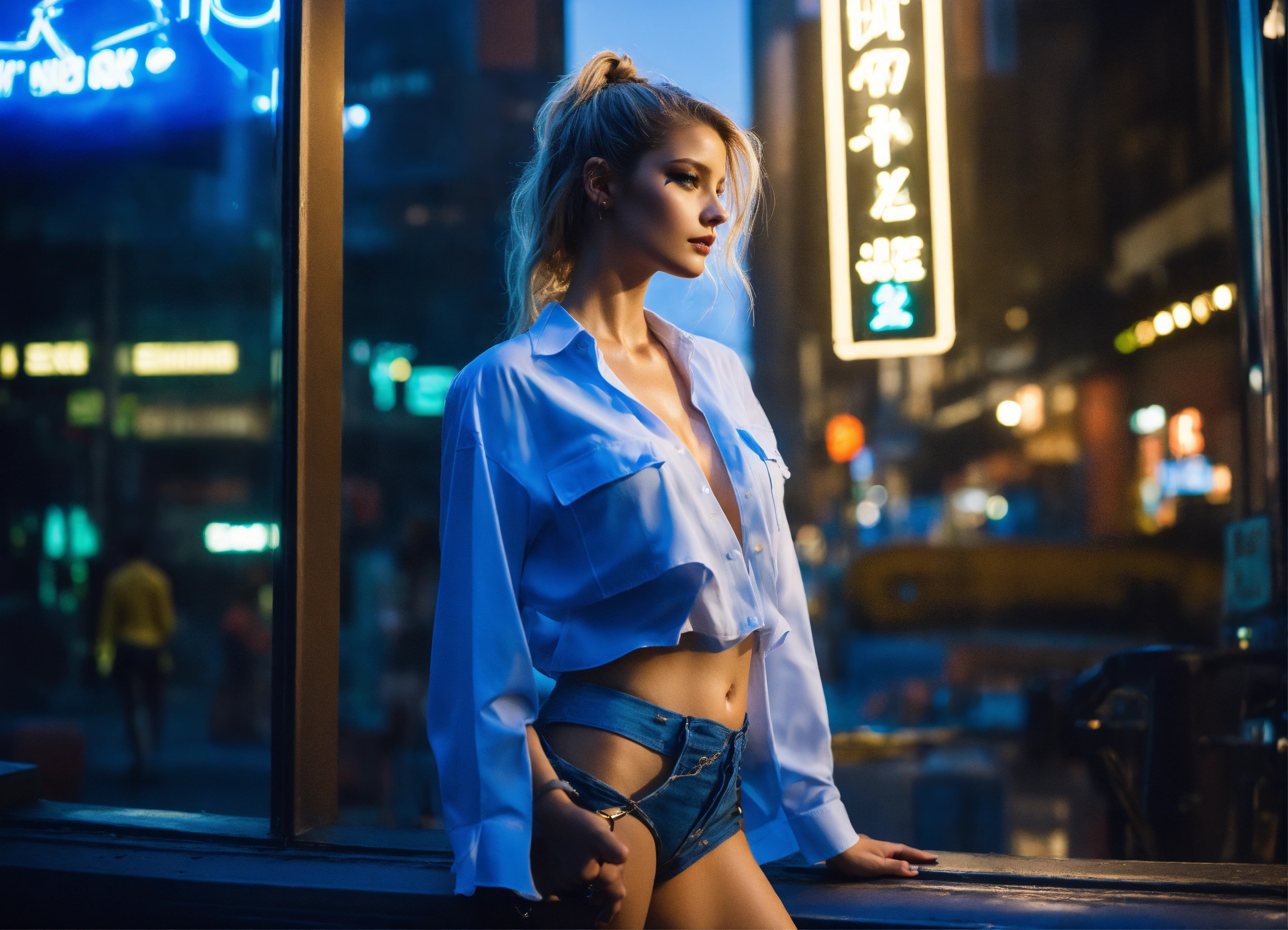 Top down back, full body, photo, cyberpunk dream girl, futuristic, sunny weather, street city window, open shirt, wearing blue and white, 8k, extreme make-up, blond, laetitia casta, neon, night