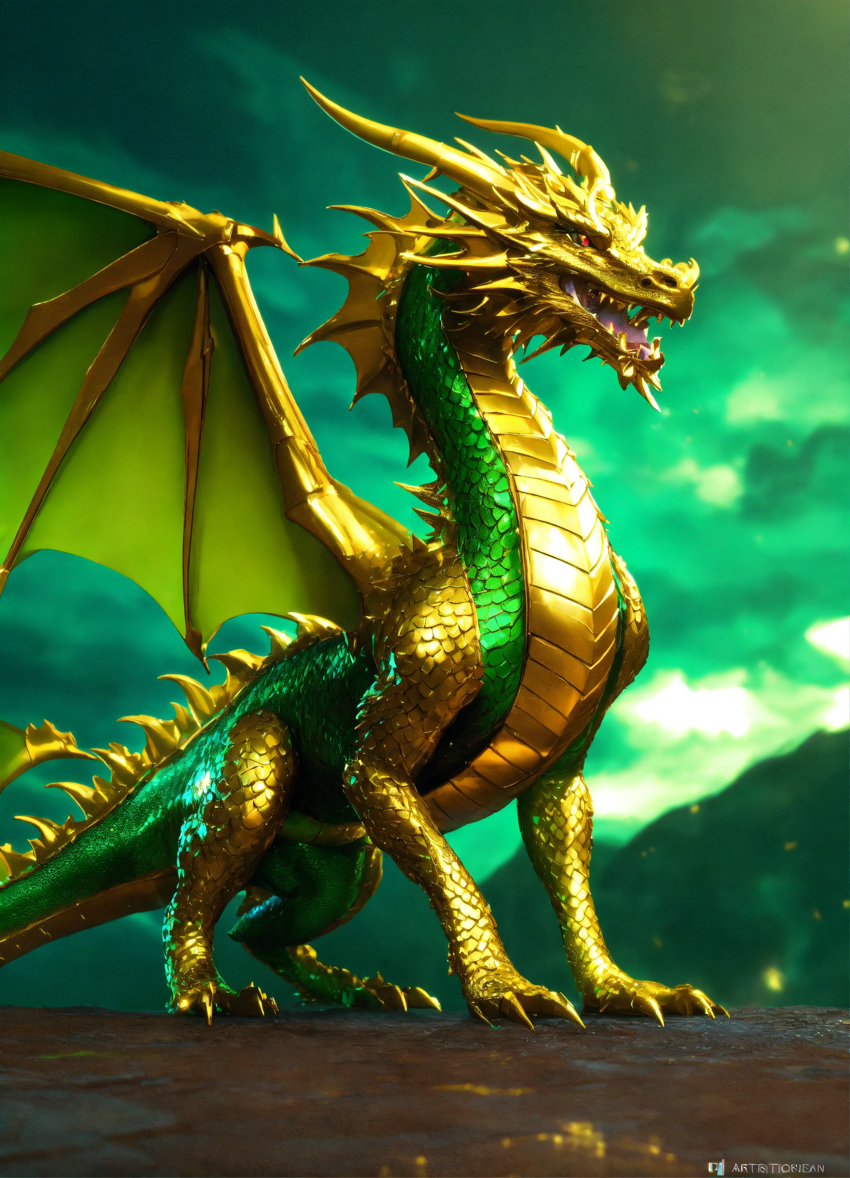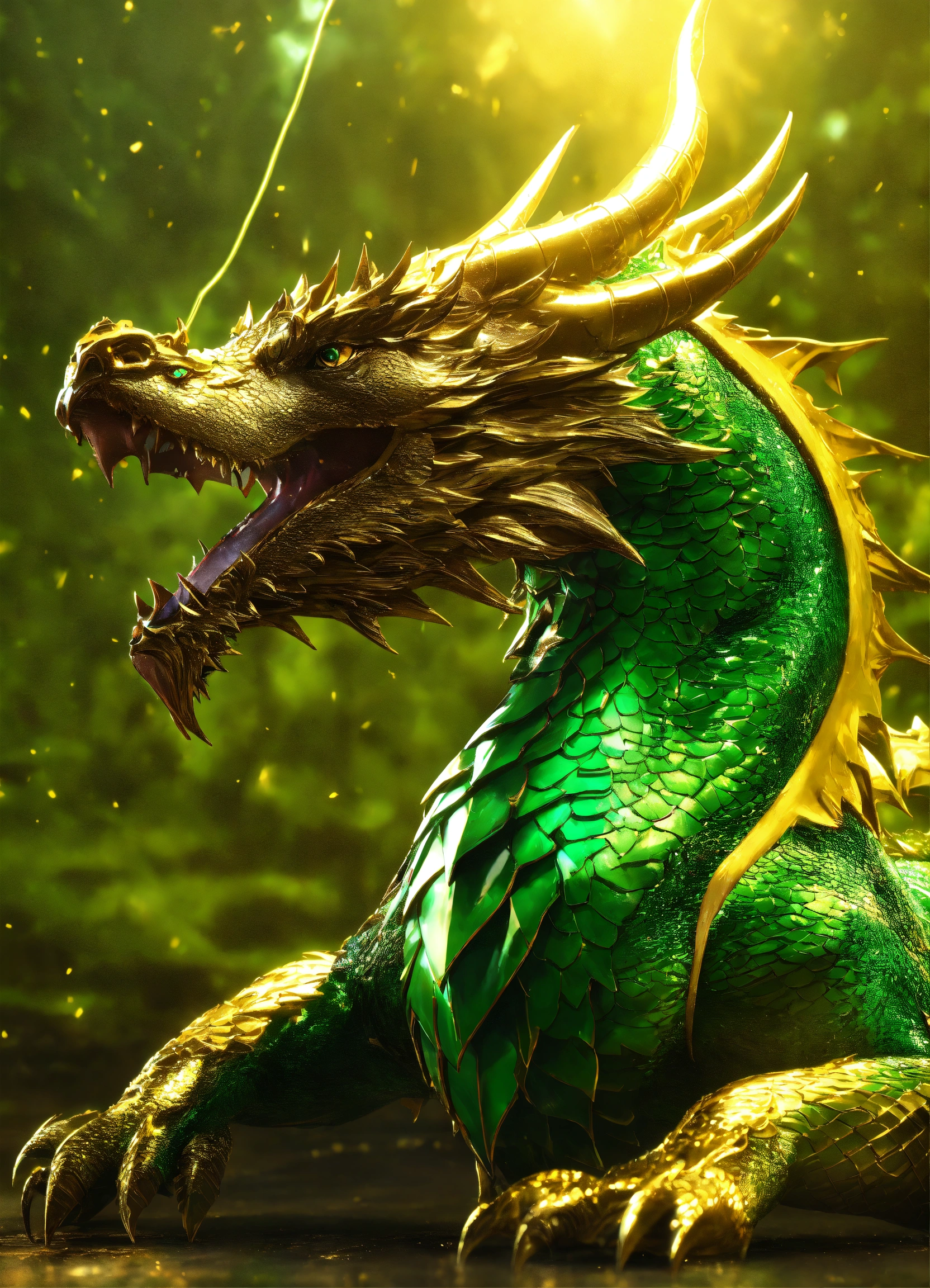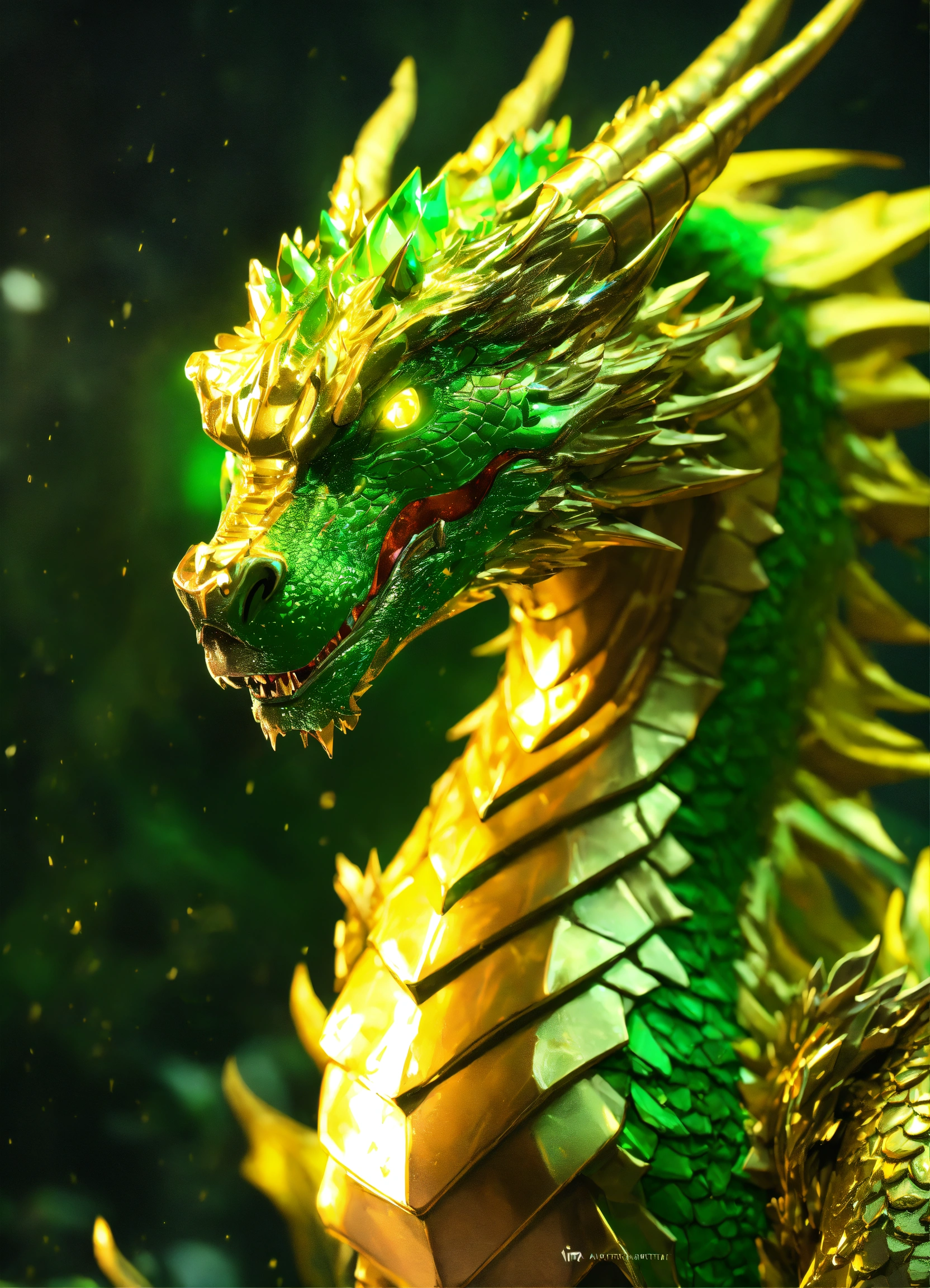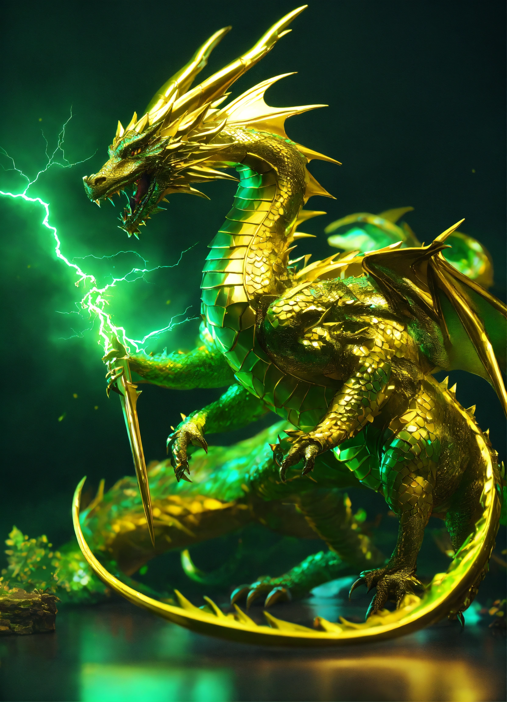 Metallic gentle dragon in yellow and green colors. volumetric lightning, octane render, 4 k, hd, realistic reflections, extremely high detailed, soft lightning, trending on artstation, masterpiece, high resolution, bronze, gold, soft lightning