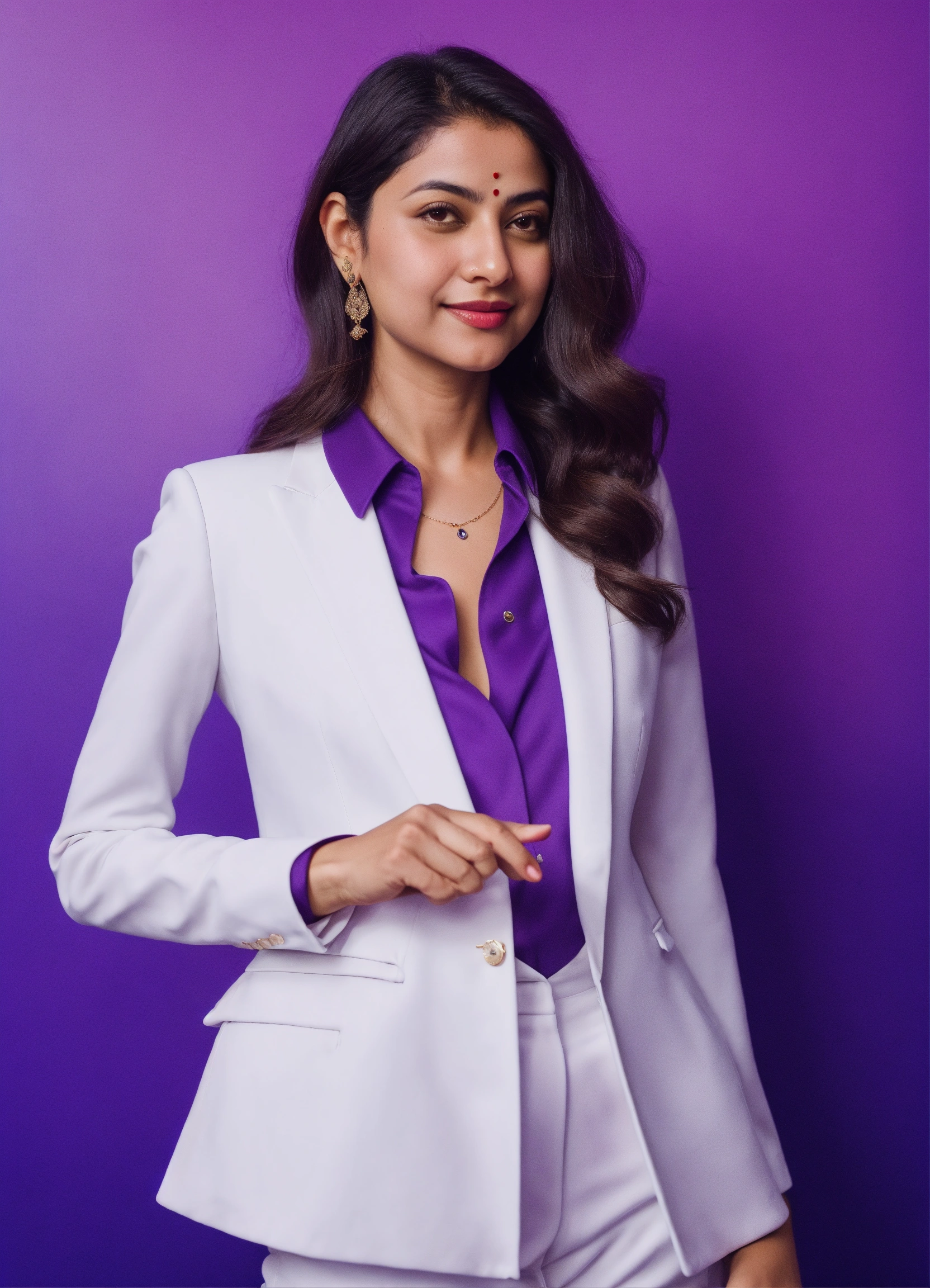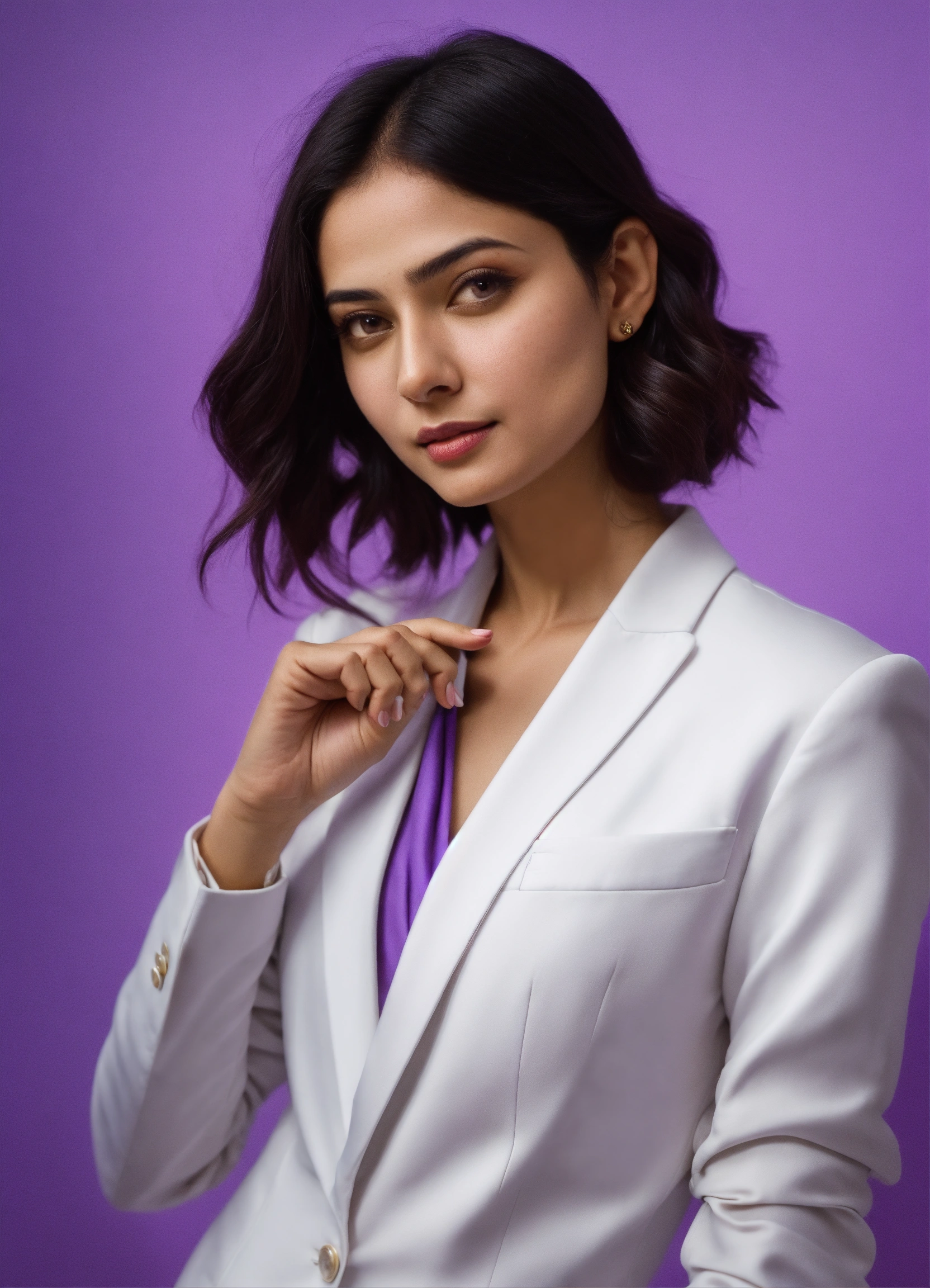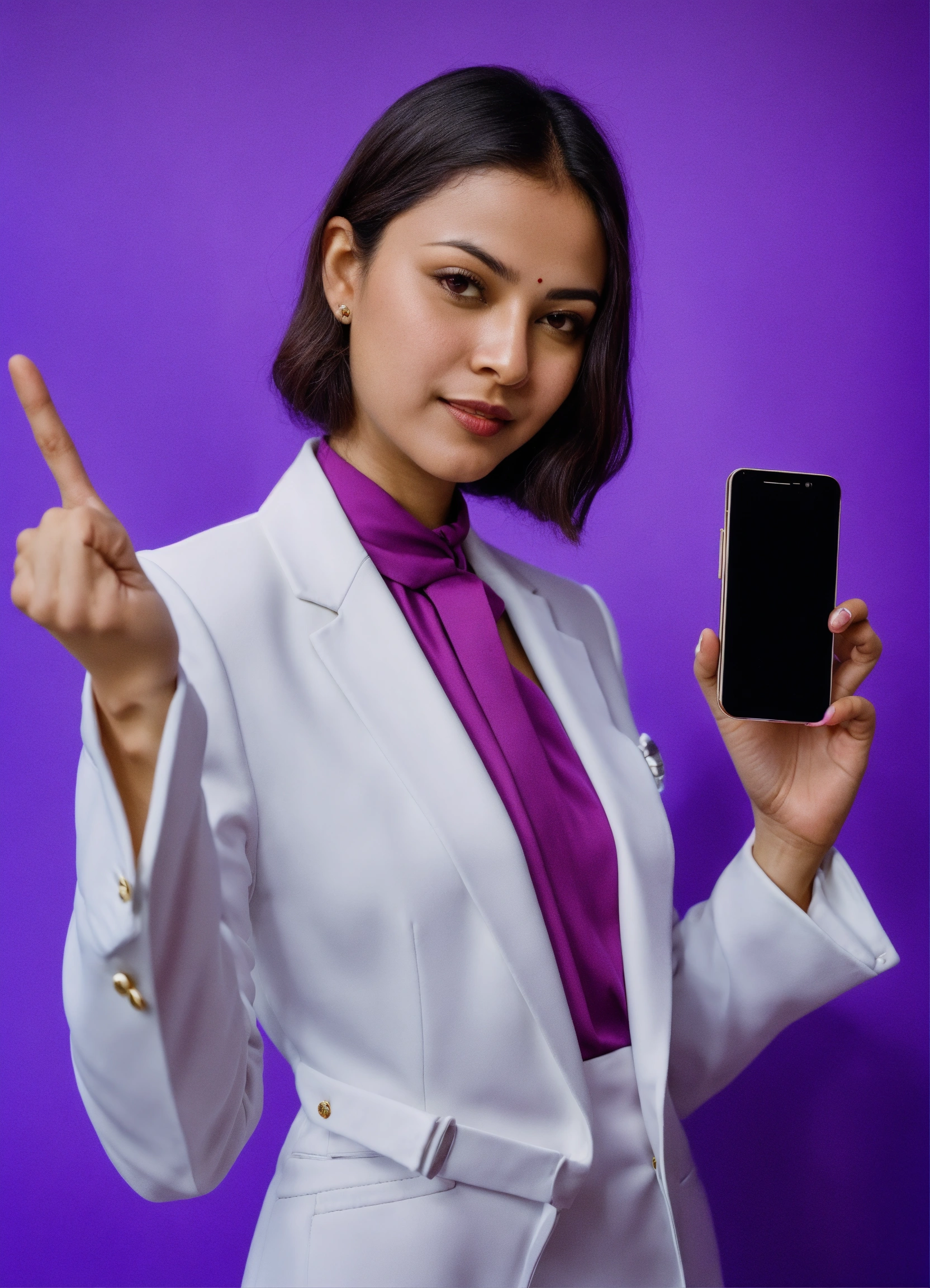 Ravshana kurkova, pointing with hand to augmented reality, smart, in an elegant white suit, top view, beautiful, perfect composition, violet background