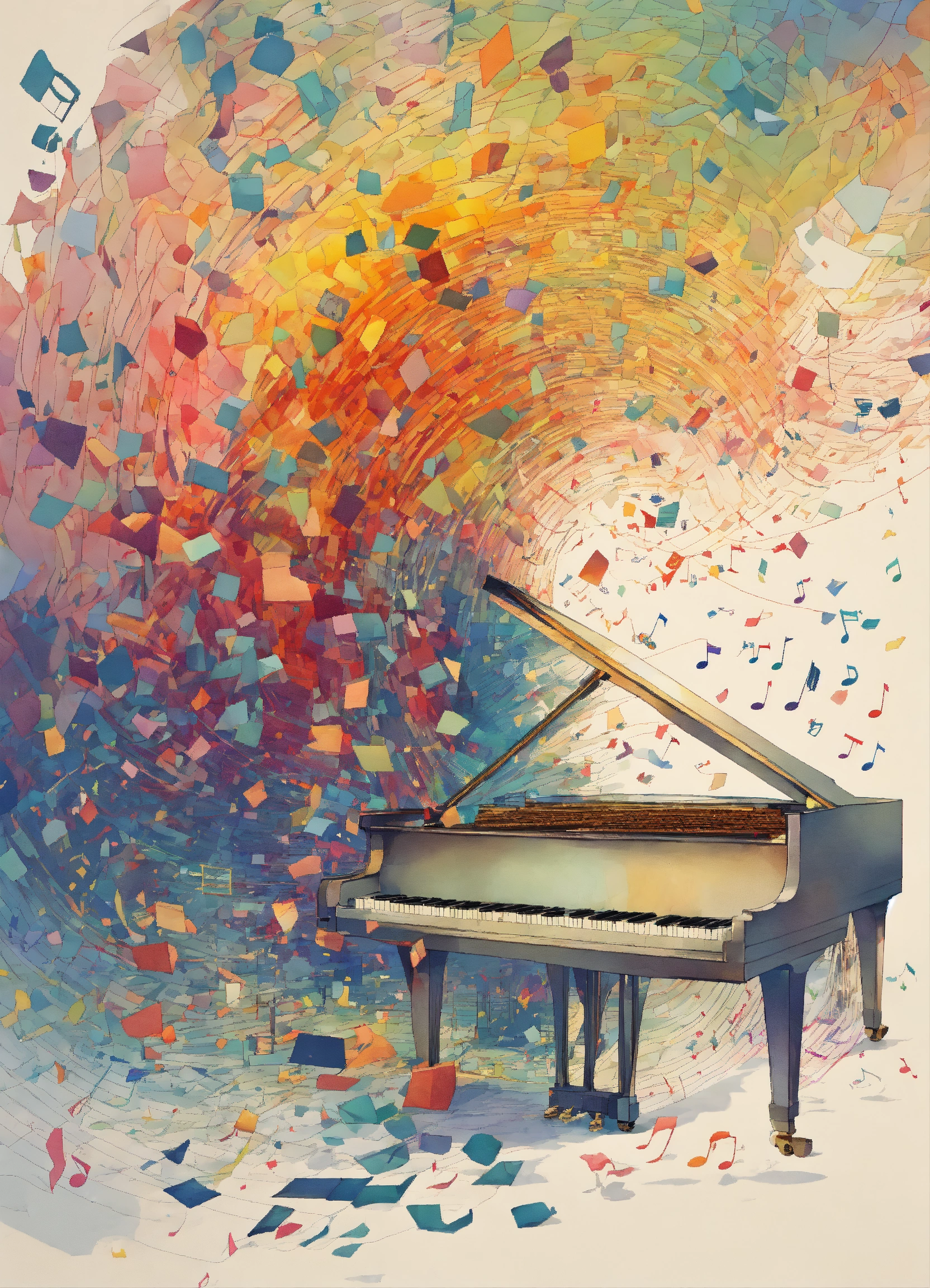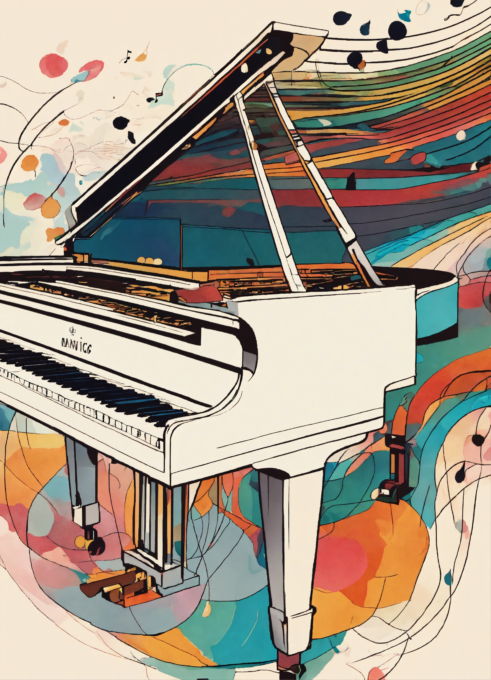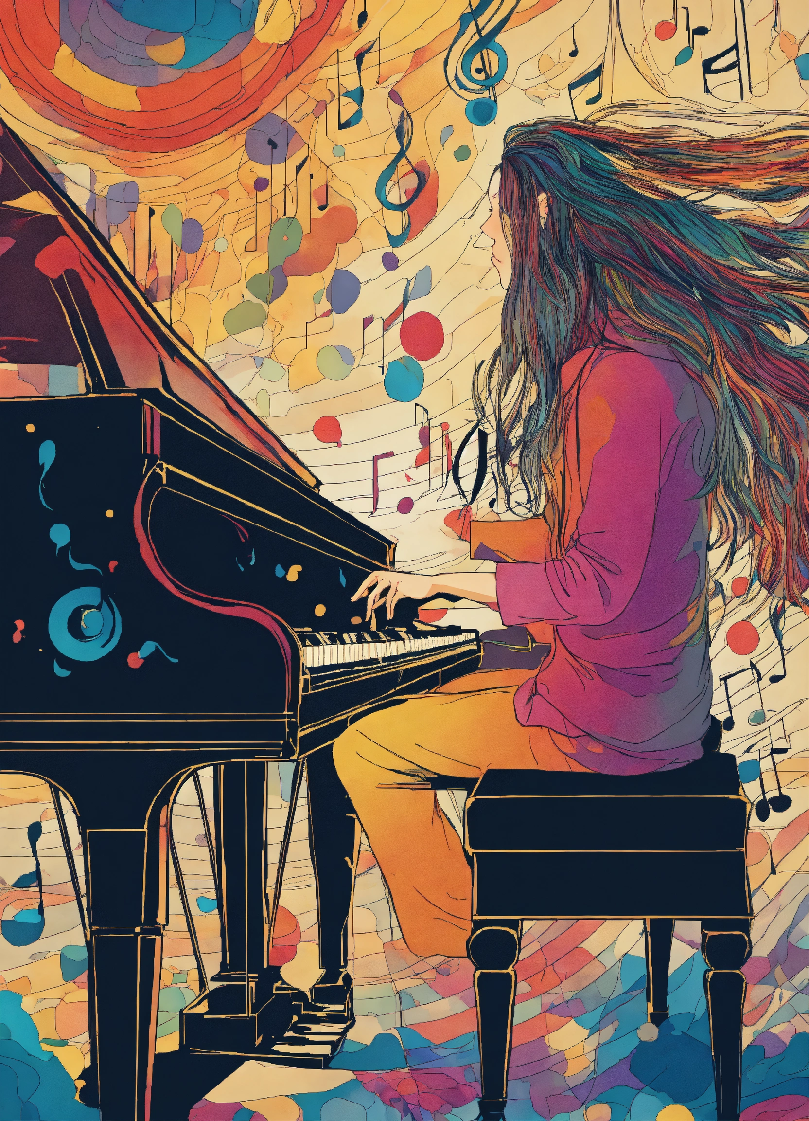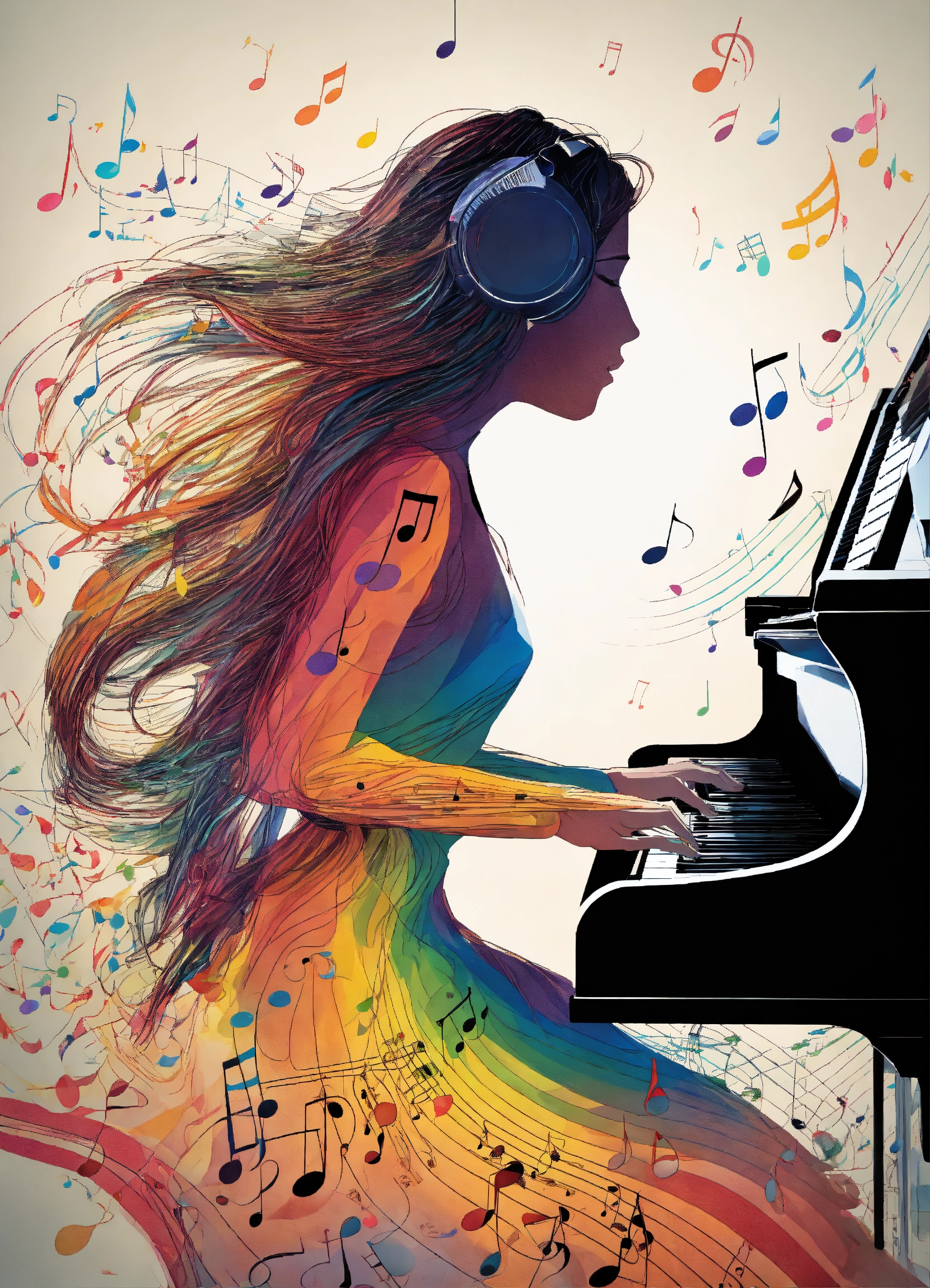 " view of a pianist with long hair playing music, centered, lots of colorful musical notes symmetrically filling the air, perfect line art, few faded colors, white sheet, smooth hyperdetailed professional line art, represent the feeling of hearing music"