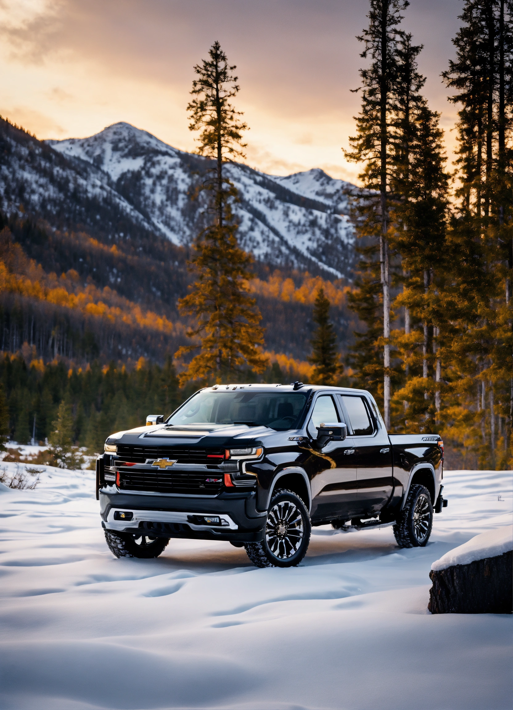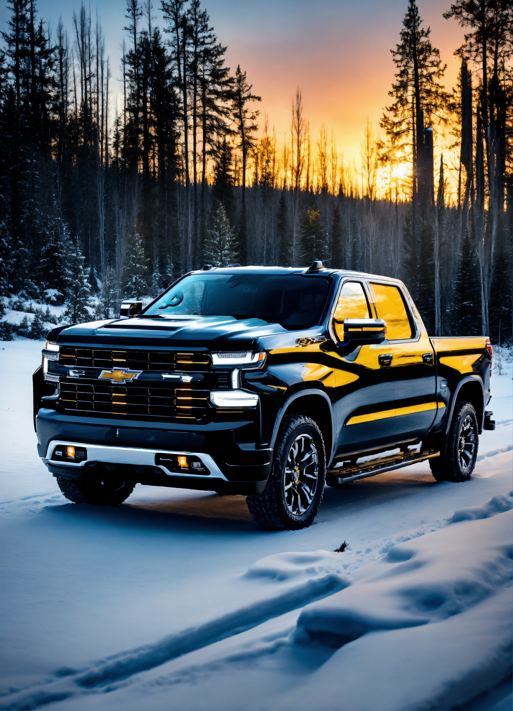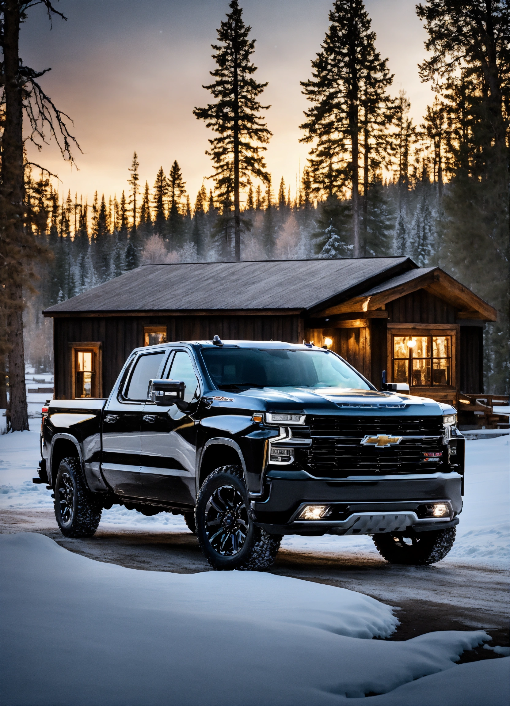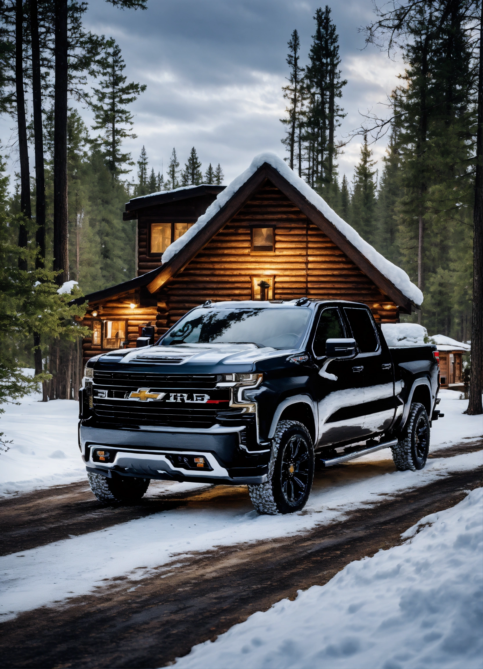 2023 chevy silverado black with gold trim wood cabin snow landscape woodland background