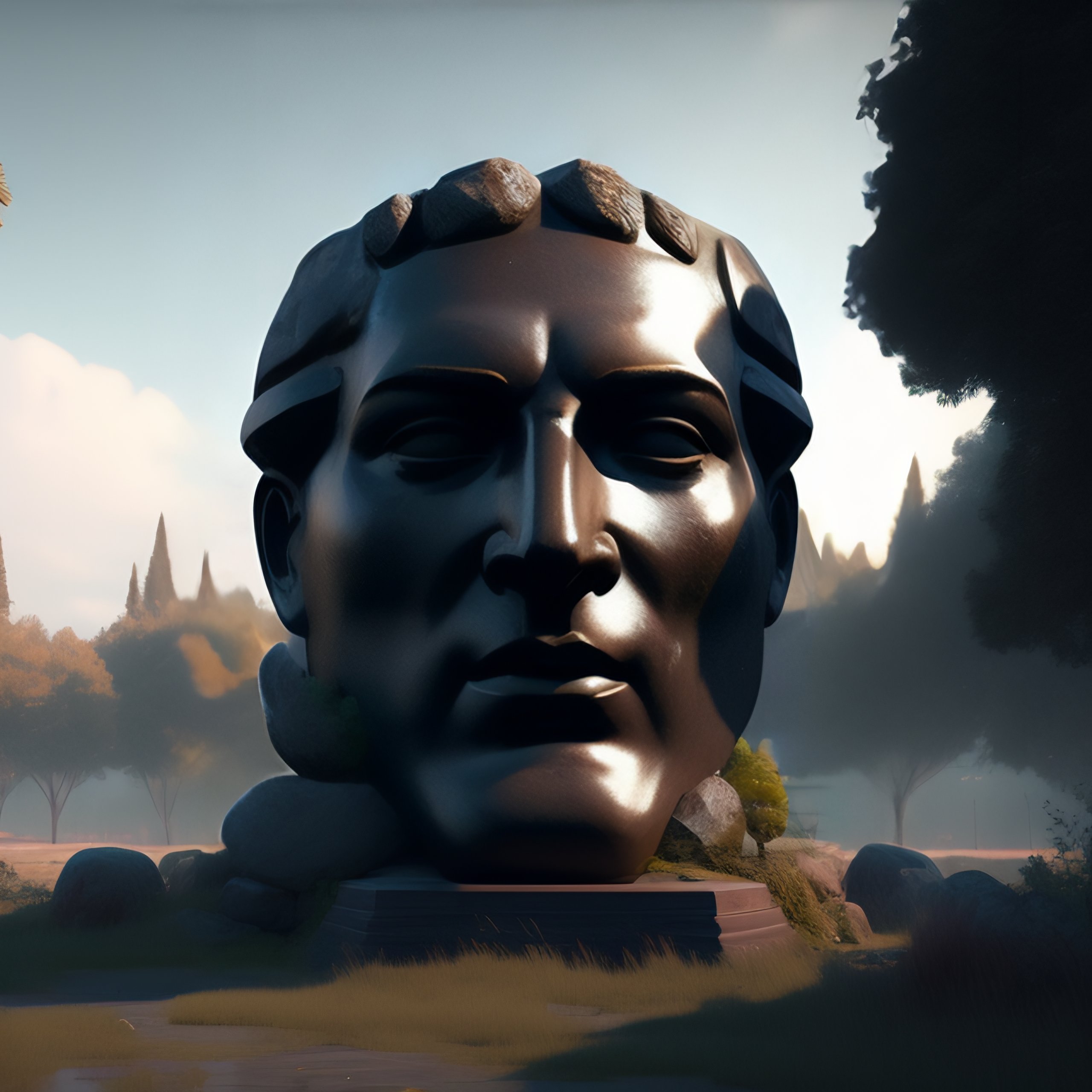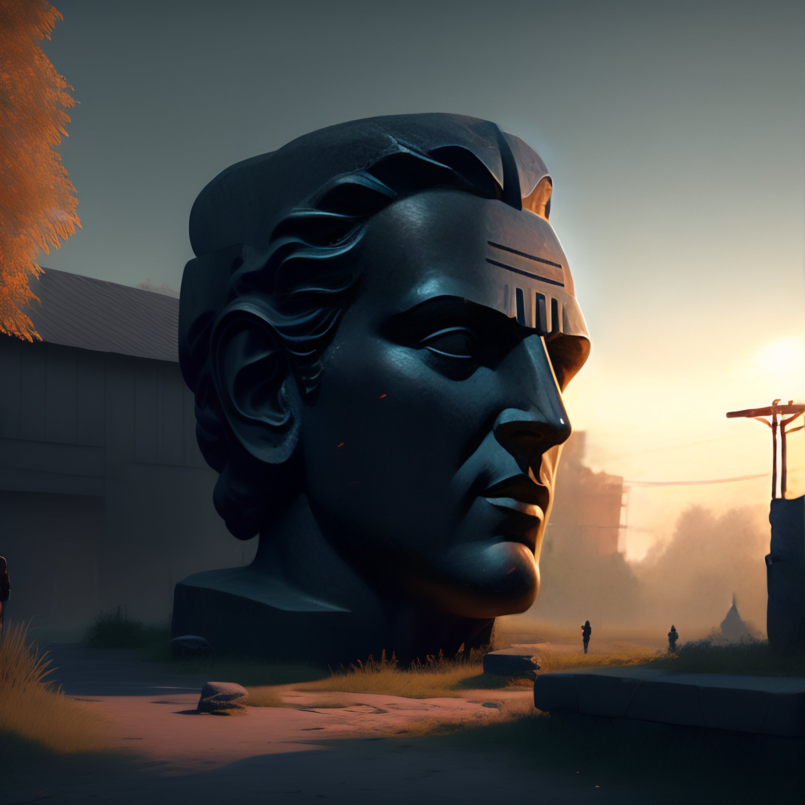 Big huge stone greek head statue broken in half fallen to the ground and broken into several pieces inside old statue factory repeated many times in series, big rocks, octane rendering, warm moody lighting, wide angle lens, low view, in the style of pixar animation, trending on artstation, 8k, cinematic, hyperrealism, high details, matte painting, trending on artstation, cgsociety, dark scene by by greg rutkowski and simon stalenhag and nora twomey