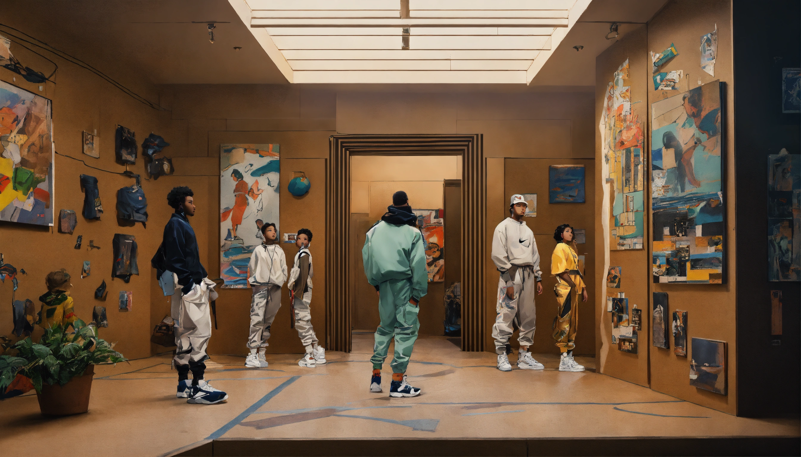 ((cartooned)) artwork in frame, canvas lettering|bodies surreal amalgamation of people, dynamic dancing flow, drawing masterpiece, illustration of black jetsons, boondocks, dream model chola american, pinup, nike sweatshirt and metallic-pants, cartoon futuristic shoes, (french animation), twins photo of mixed and matched outfits, /minimalism collaged clothing selects, nigo human made, isolated-white-cube space creole, slate beige grey, ink|smoke, surprise highlights, monochrome monochromatic, sfmoma brutalism, hyperspective