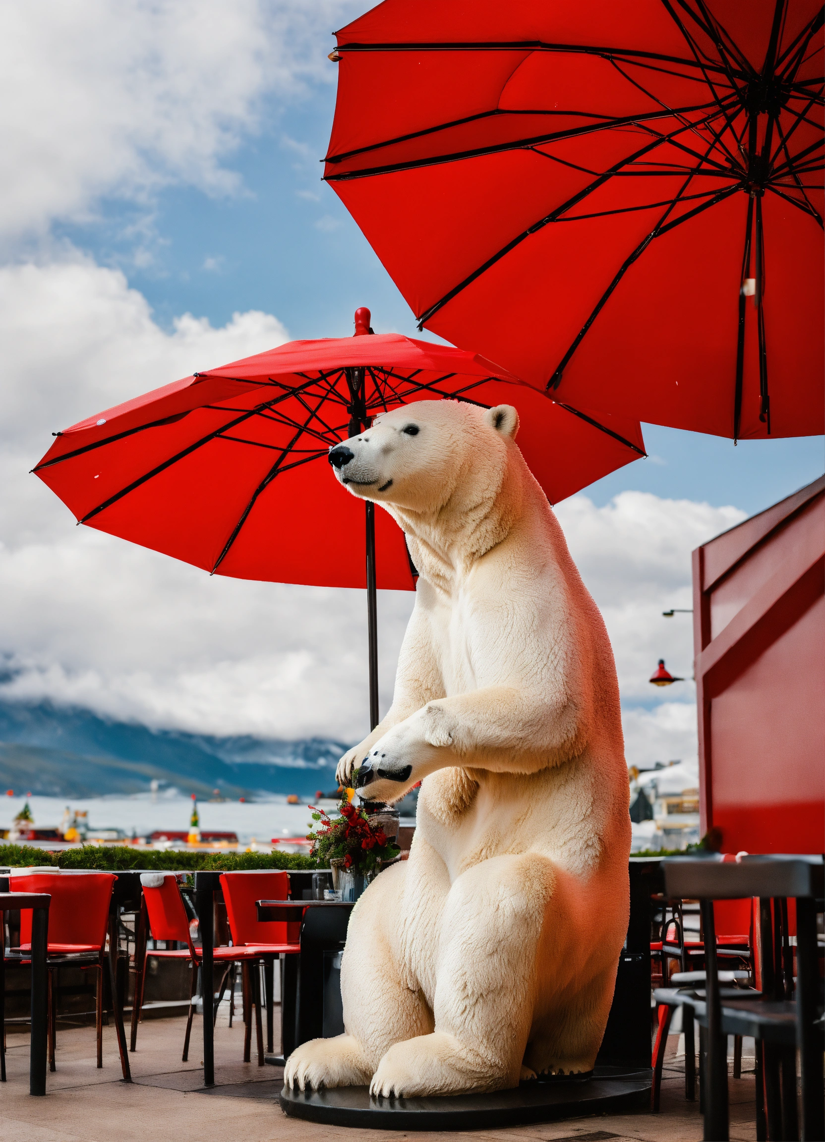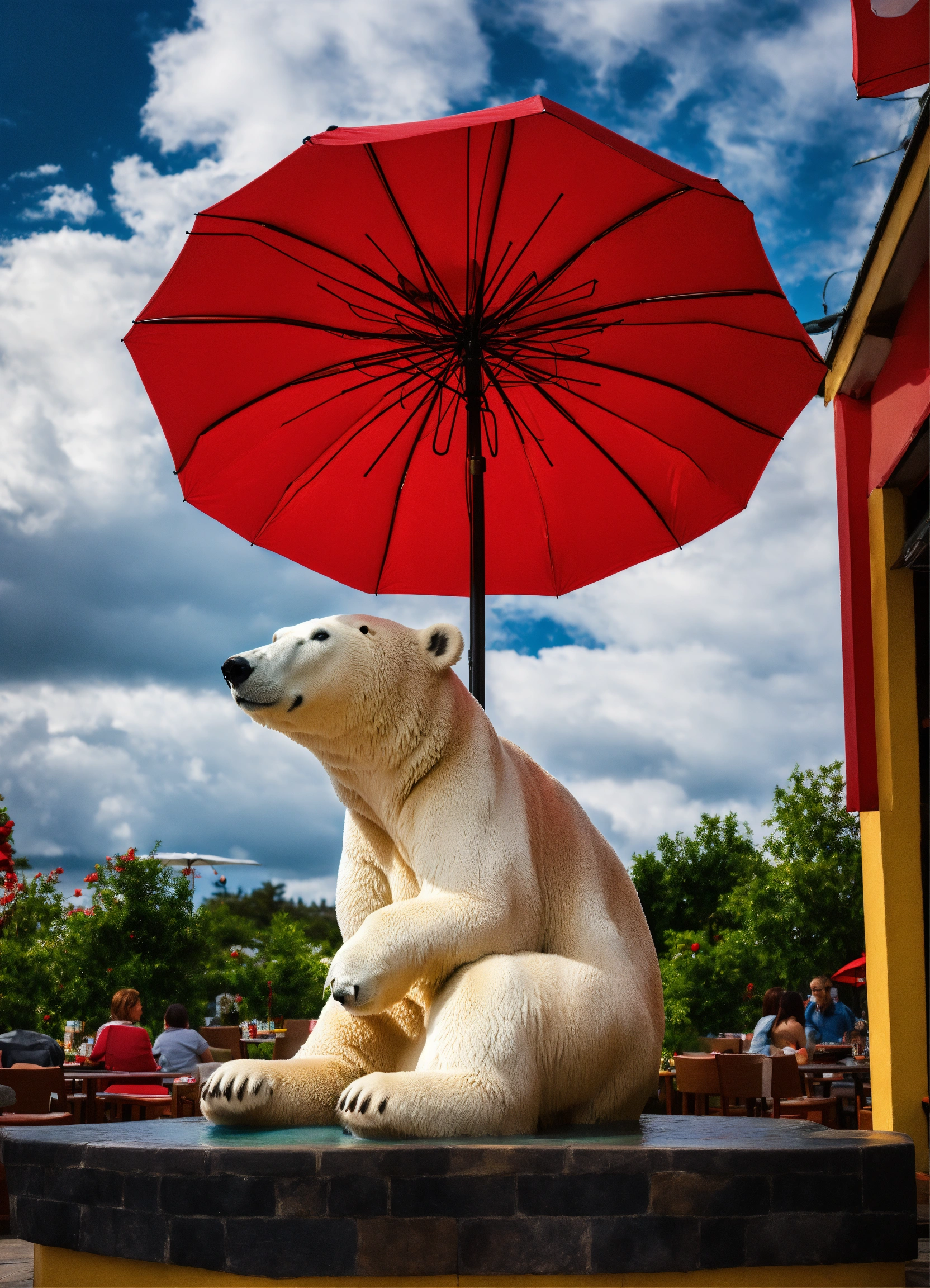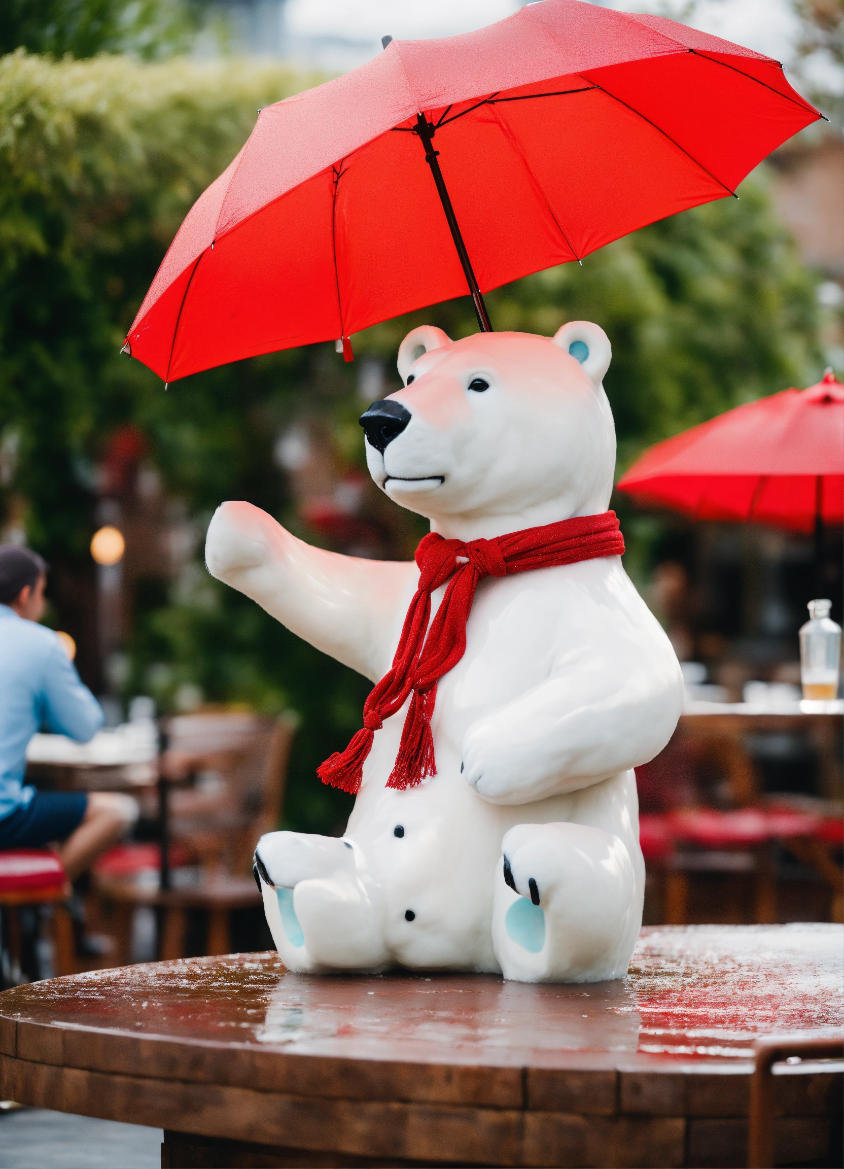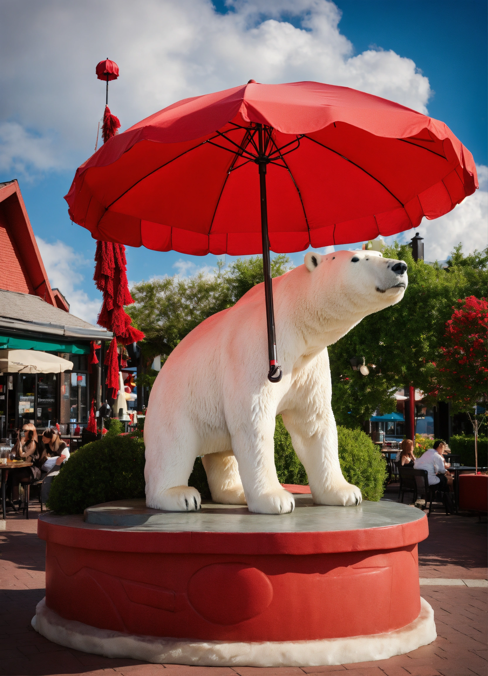 Abstract polar bear statue on a fluffy cloud holding a red umbrella outside restaurant