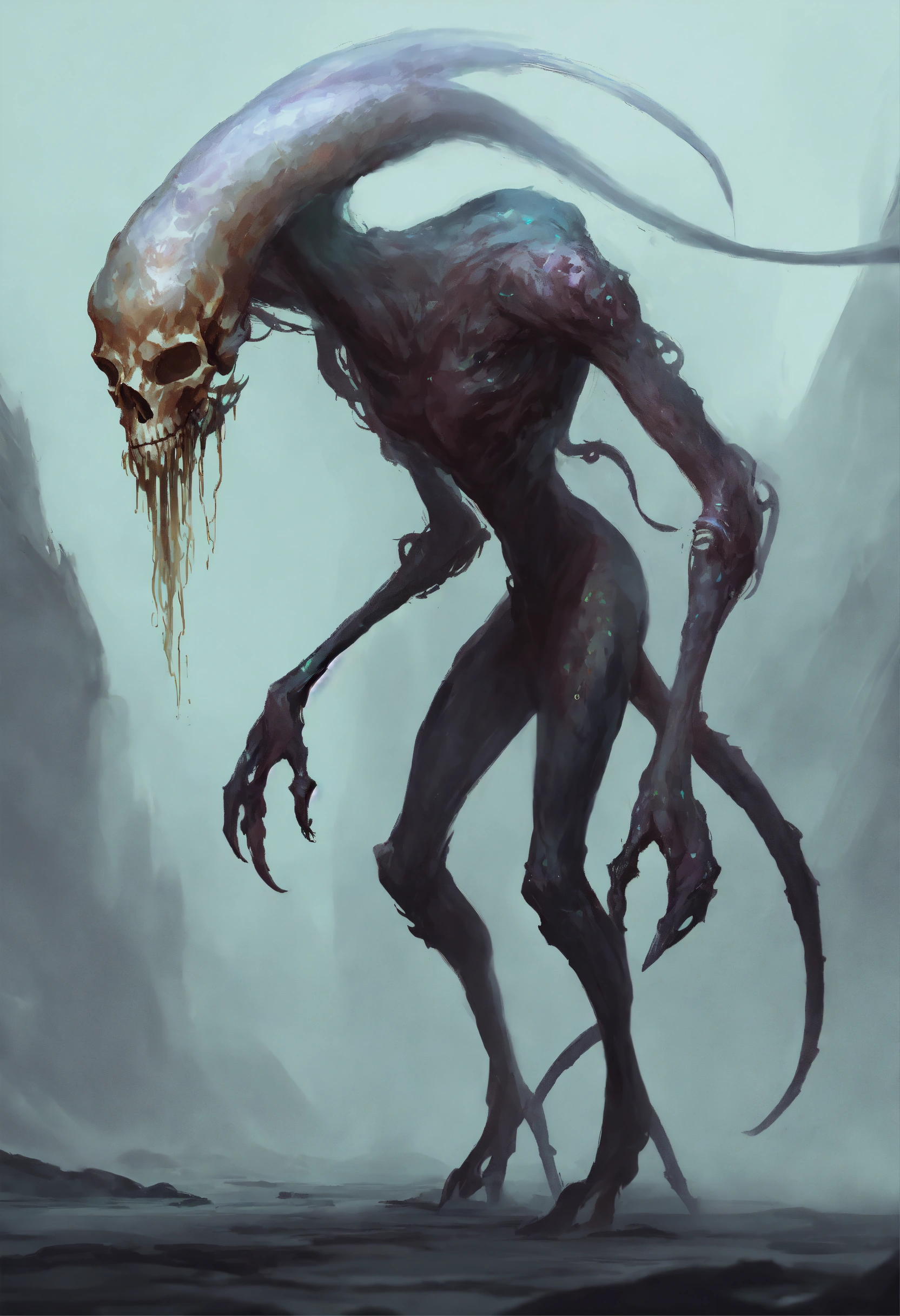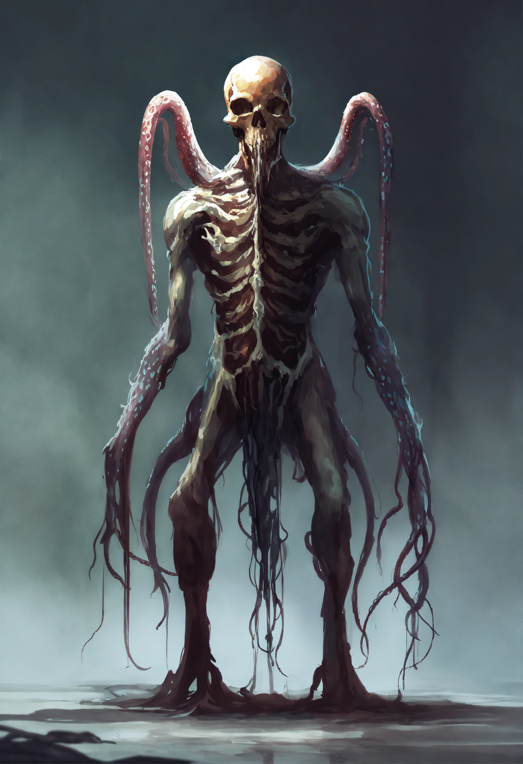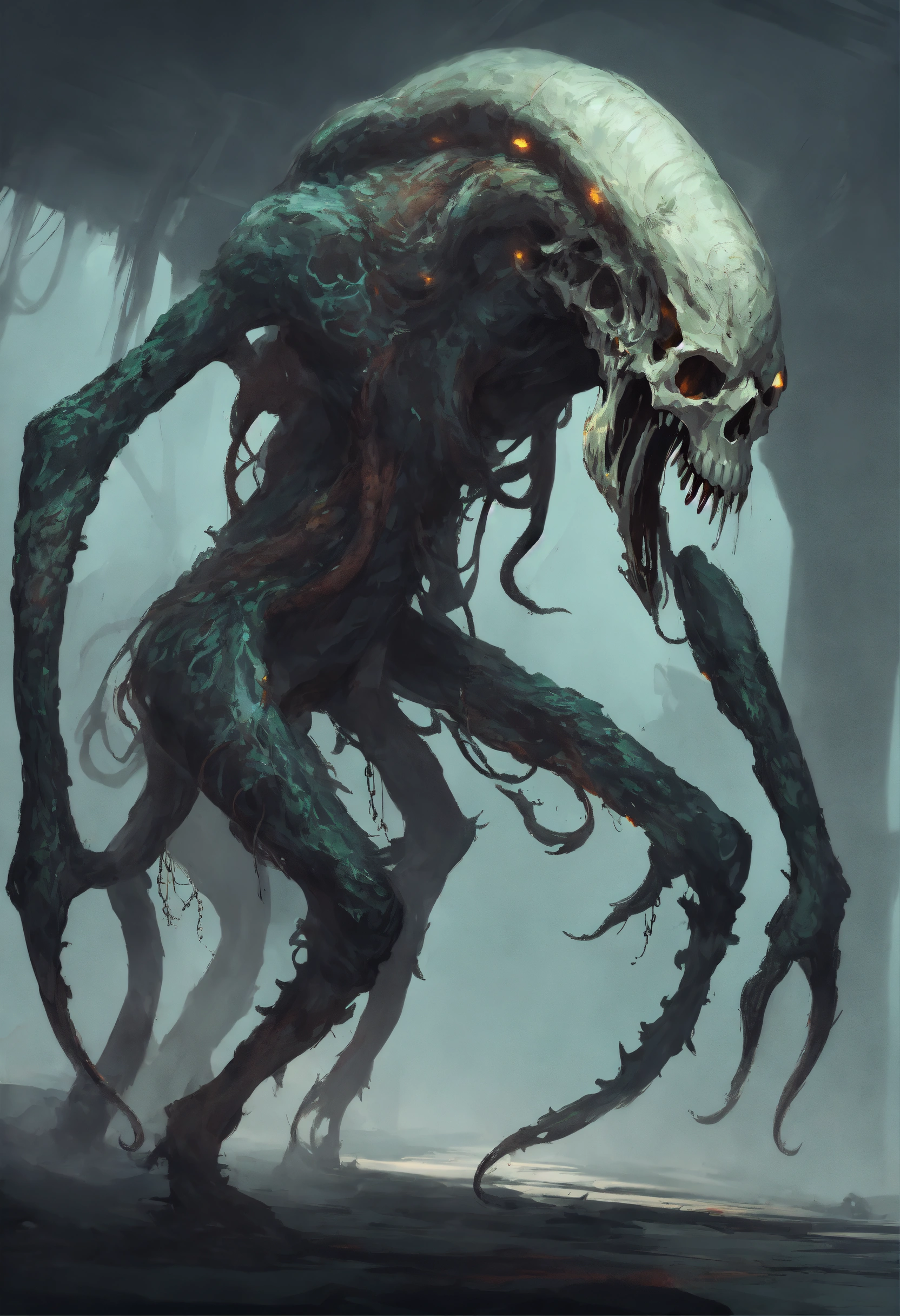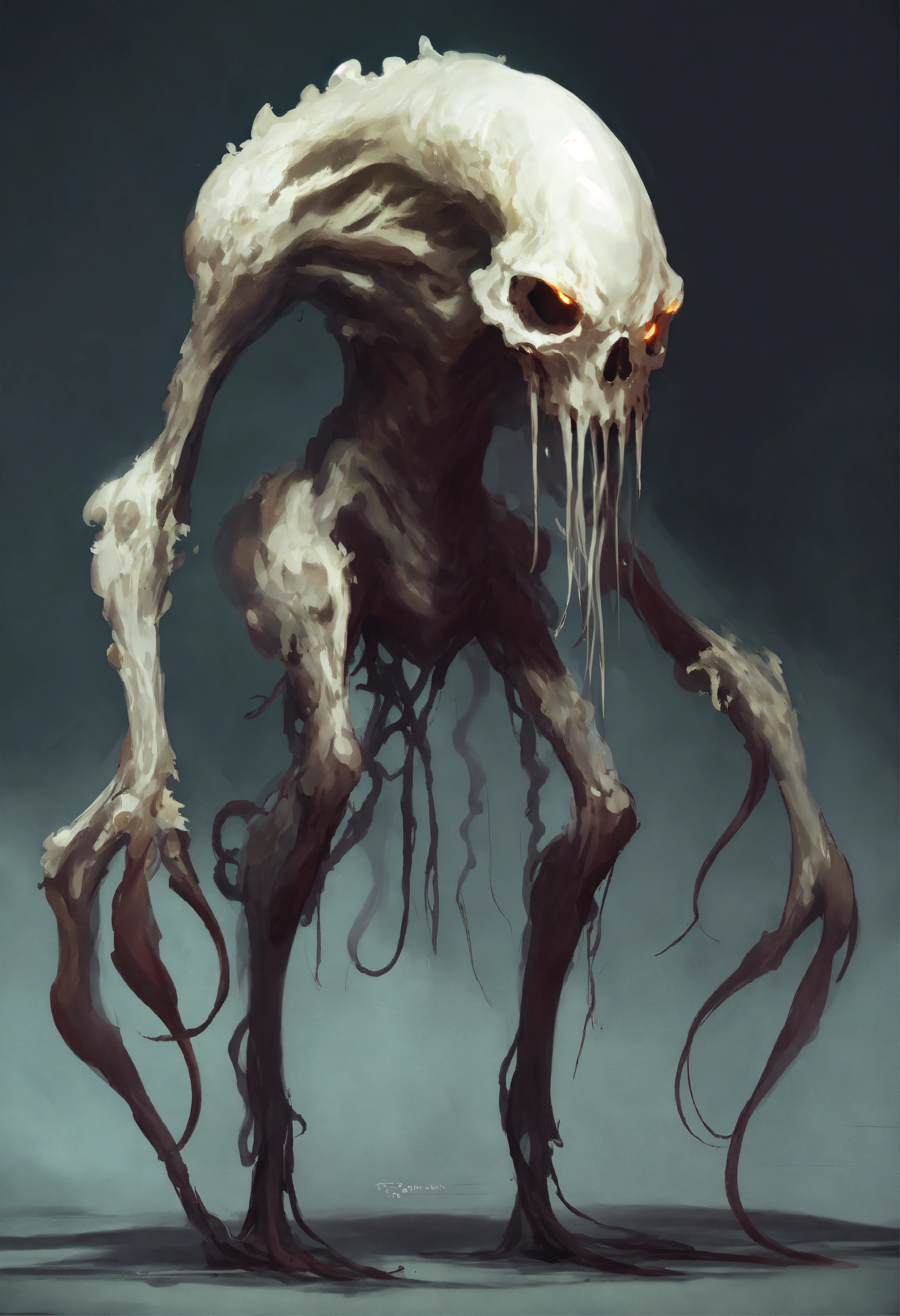 Concept art, side view, digital paintng, skiny ghostly monster, head with skull front, two long legs, tentacle arms, dark skin, clean white background