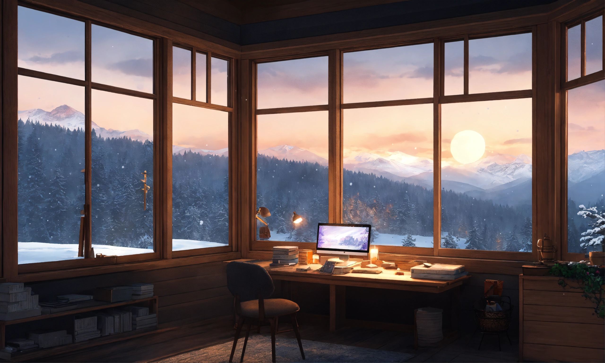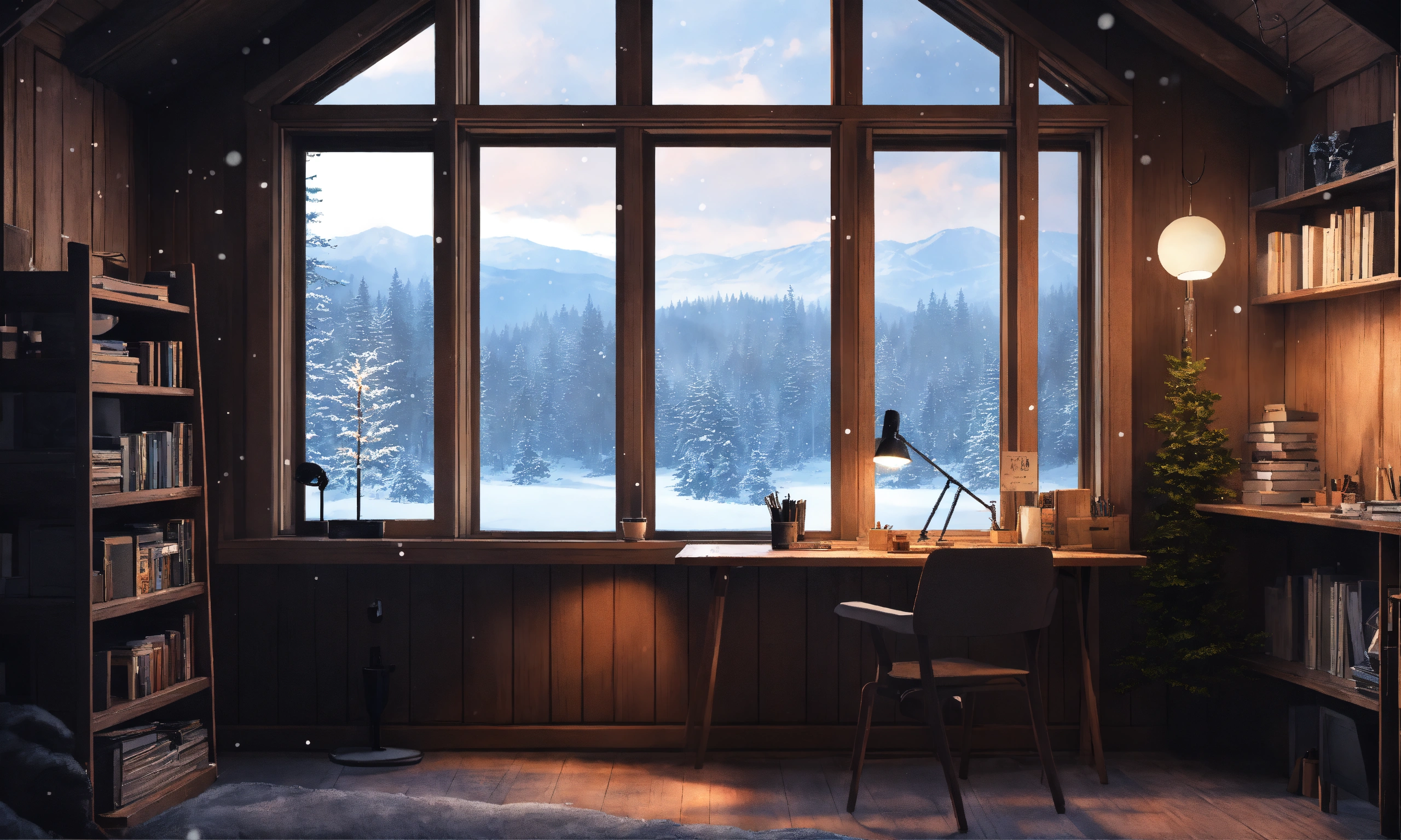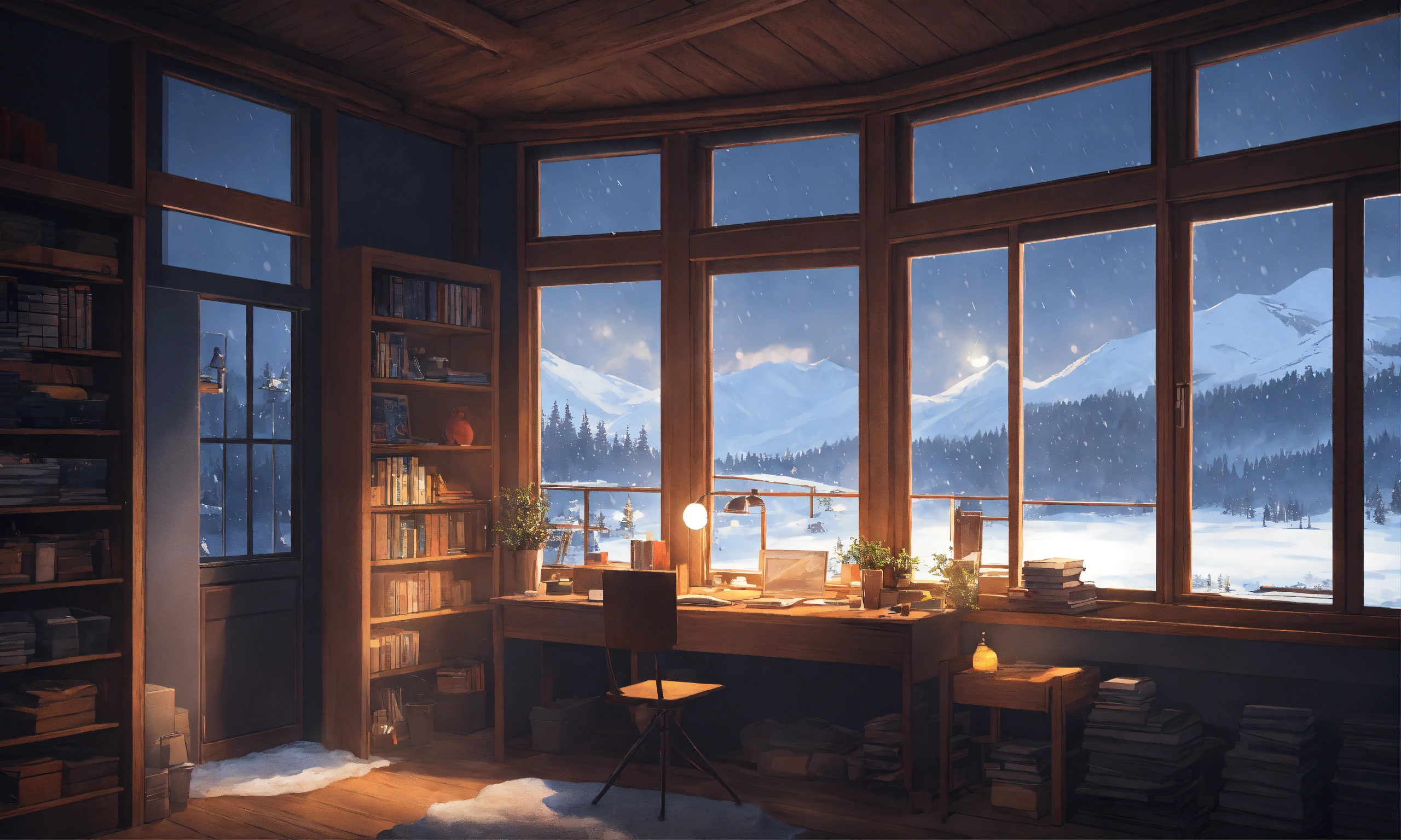 Study room in forrest cabin, dark grey washed tints, studio ghibli, big centered window view over landscape, wooden desk against window, snowing outside the window and winter night, wooden tints, anime/lofi style, minimalistic design