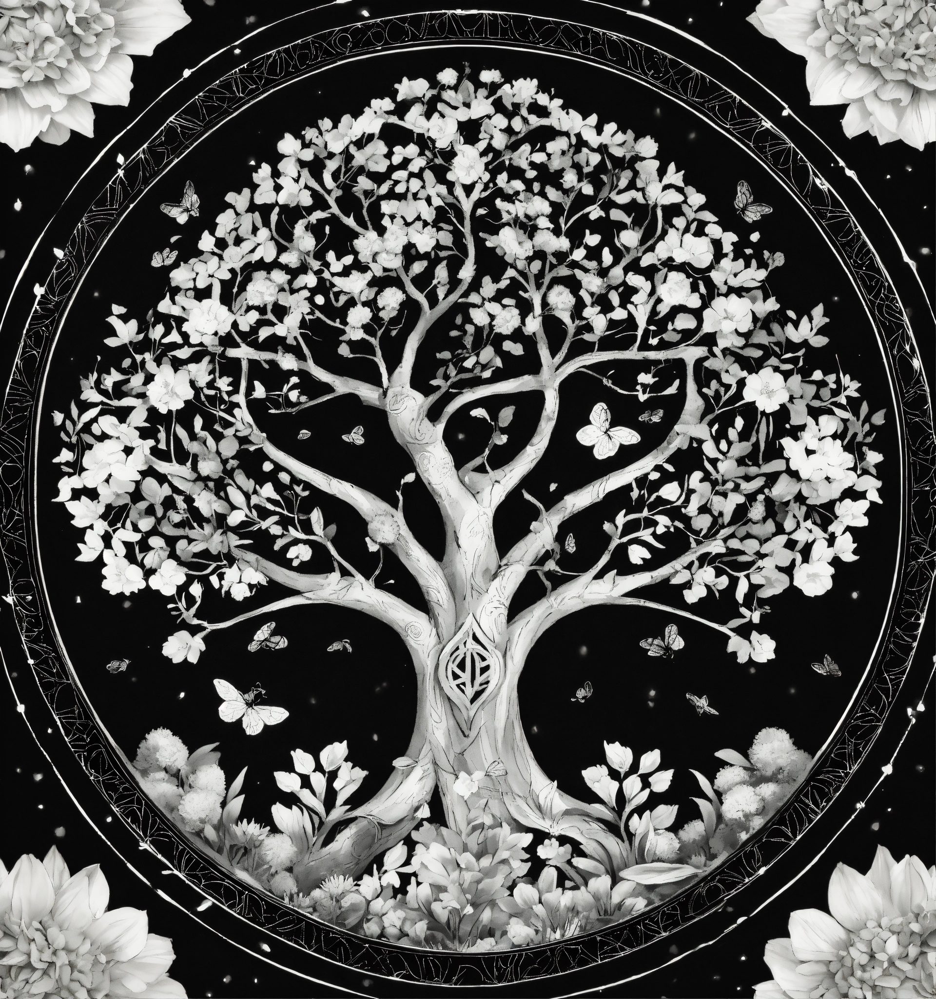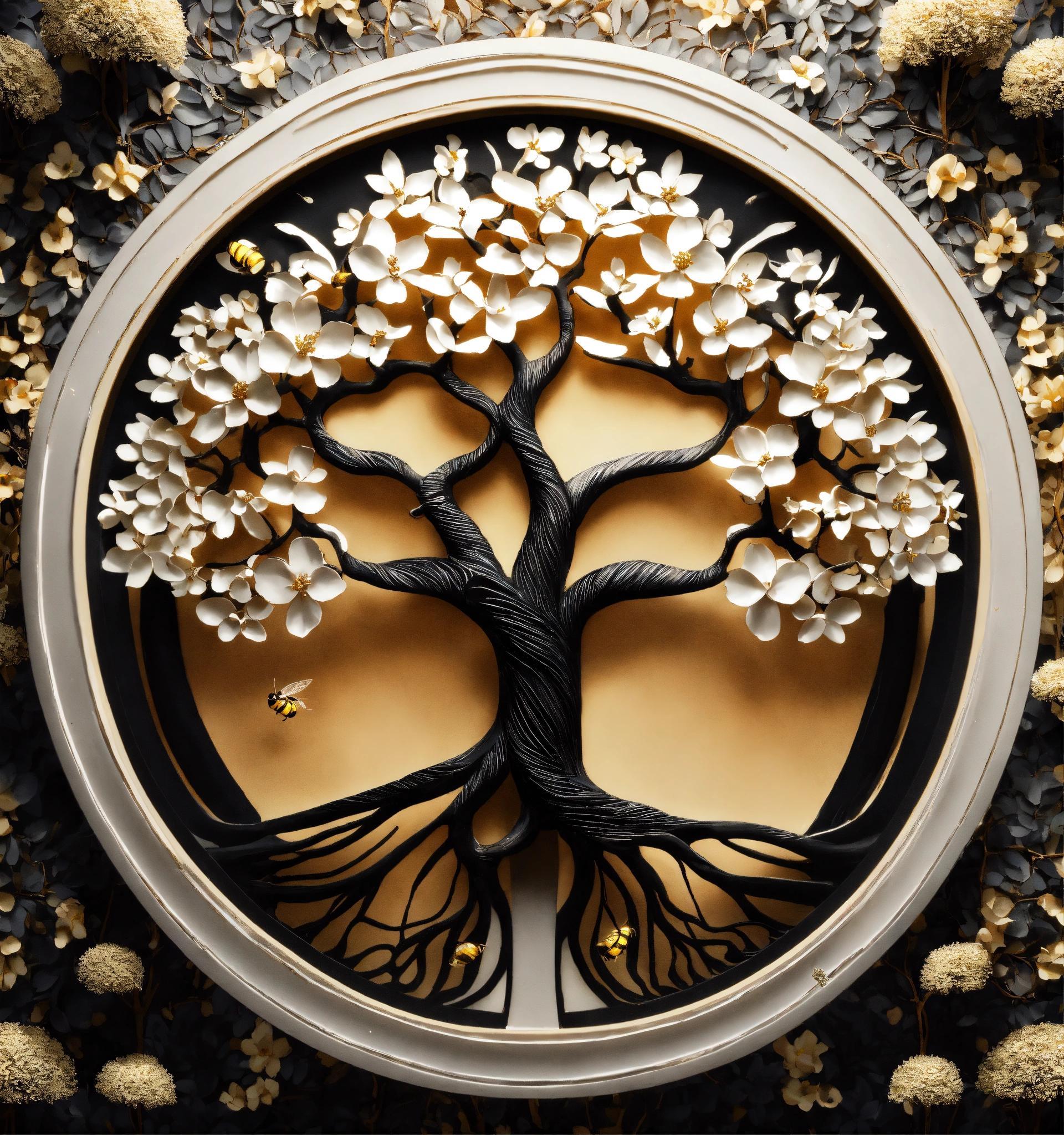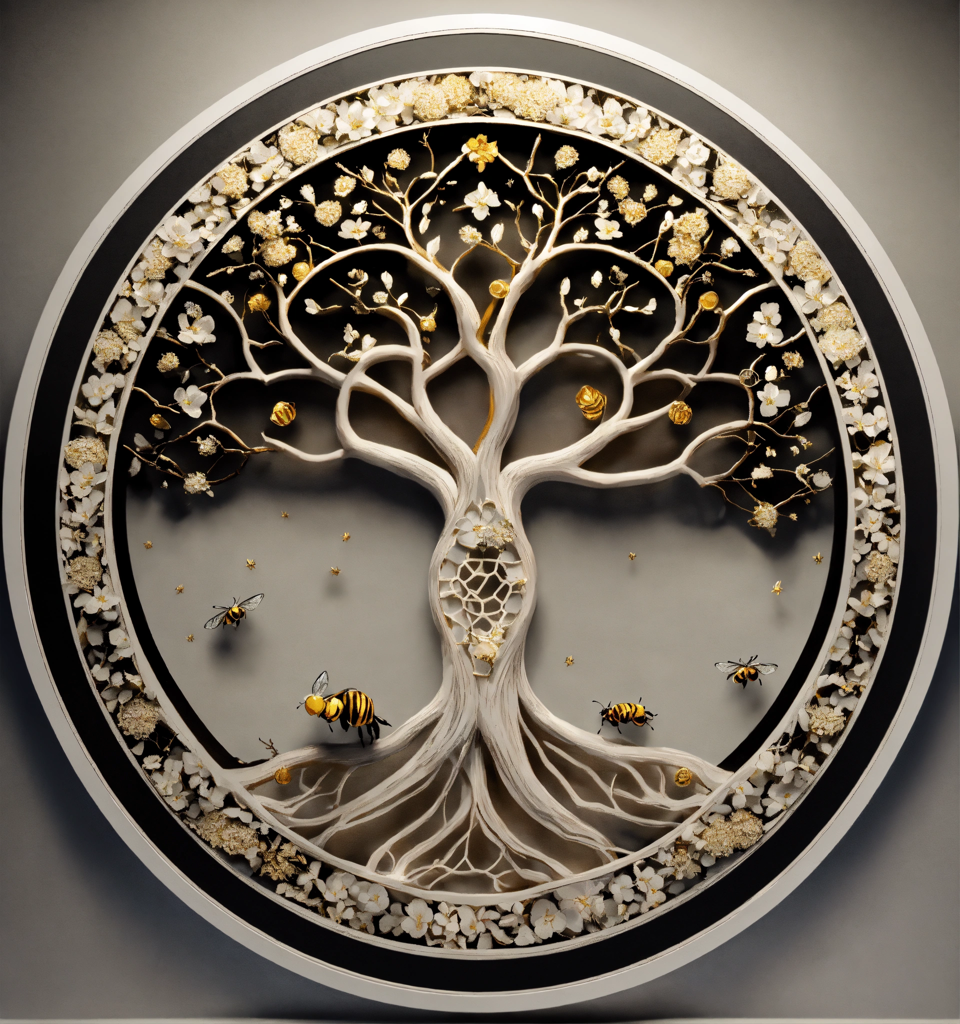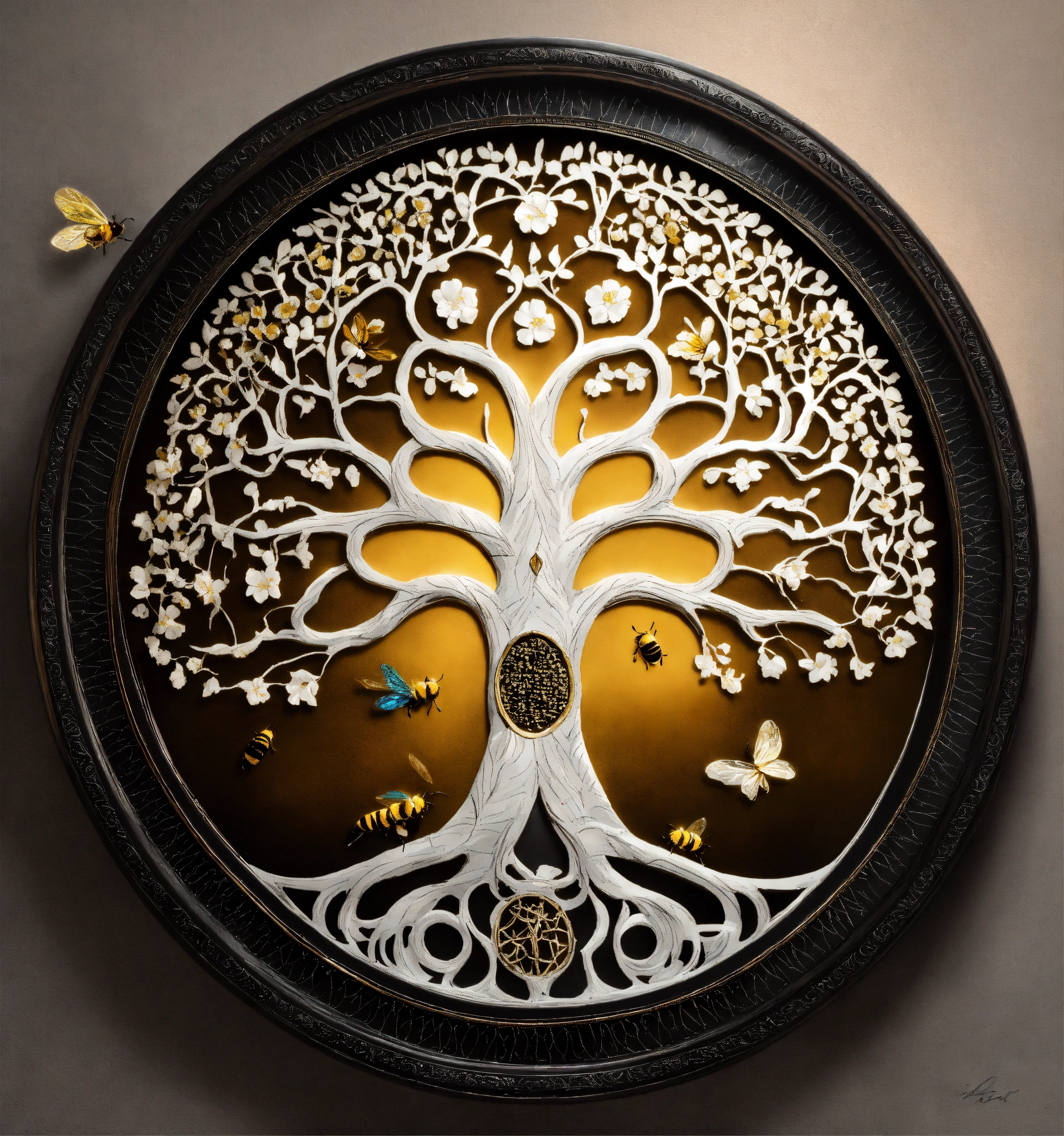 Highly detailed beautiful organic tree of life, sharp focus, dynamic lighting, elegant harmony, beauty, masterpiece, white and black, no symmetry geometry, fantasy, simple, realistic texture tree, no background, circular framed +inside frame bees + honeycombs + flowers