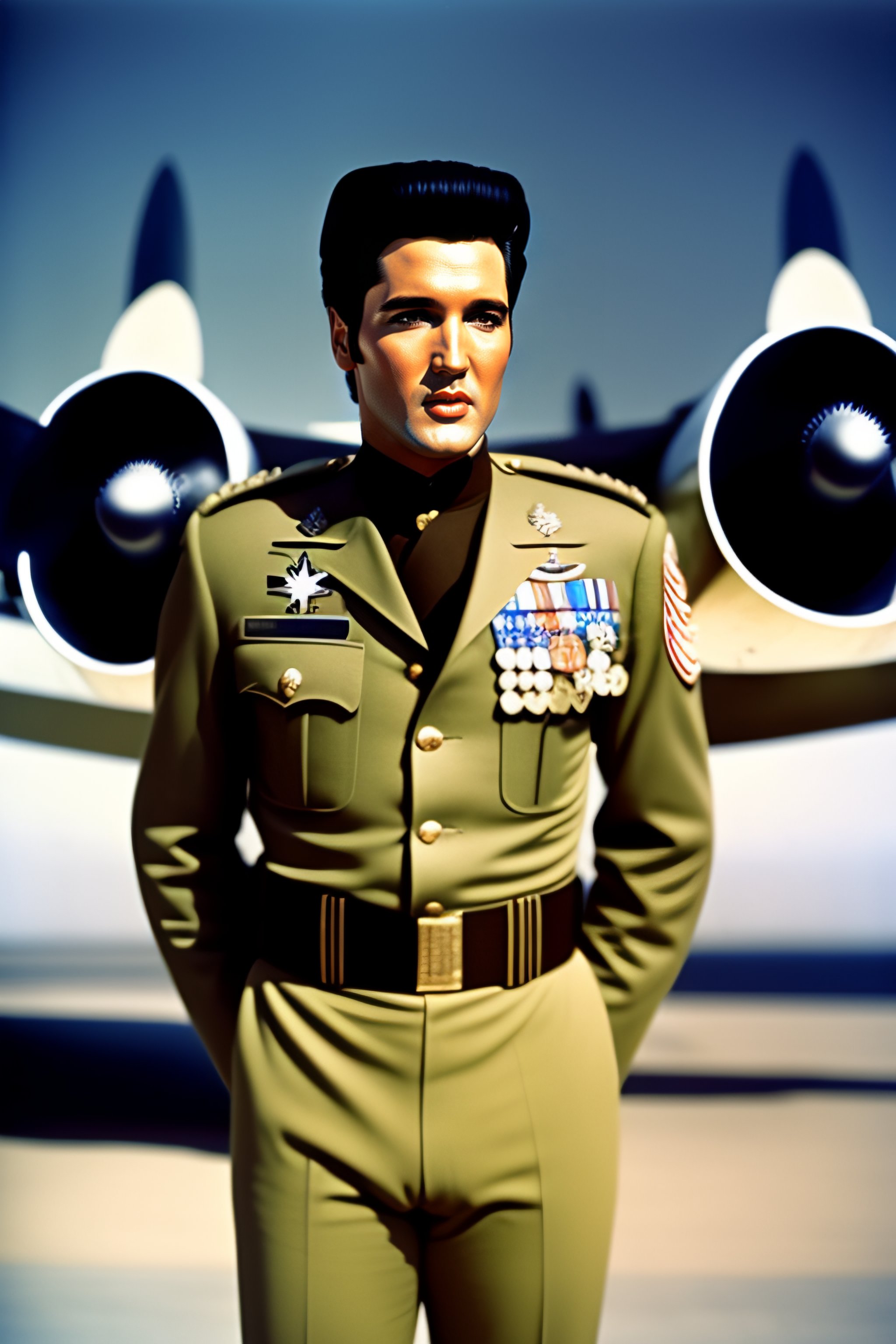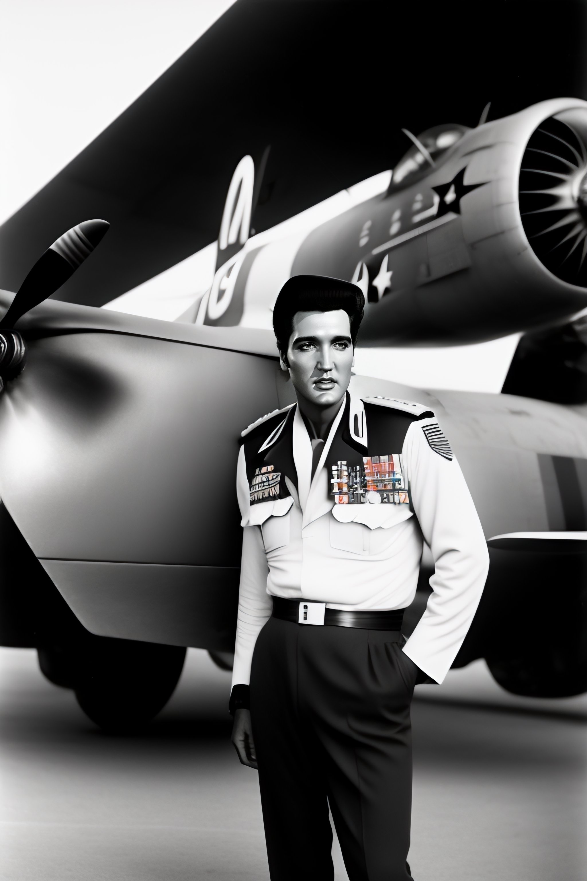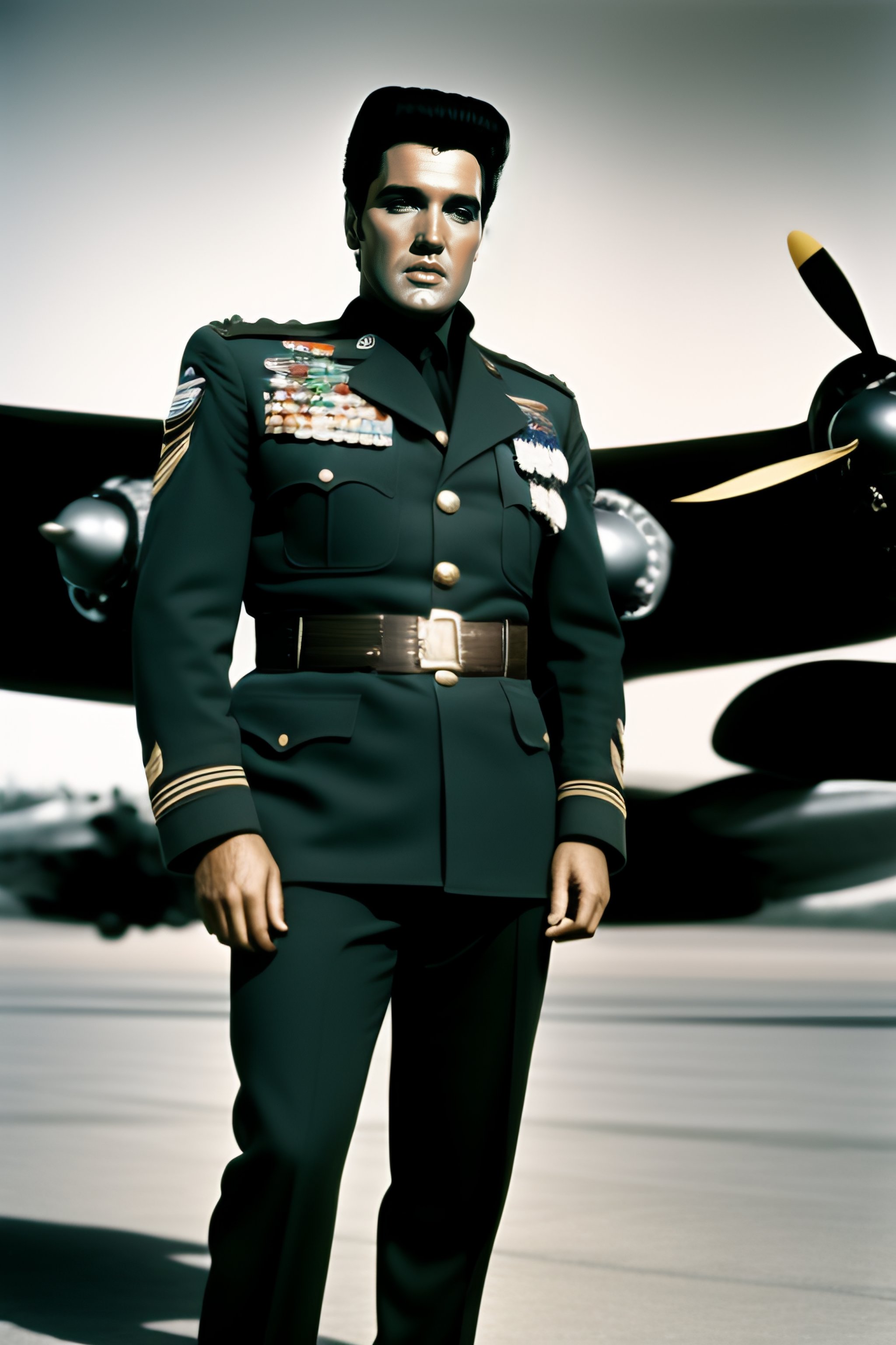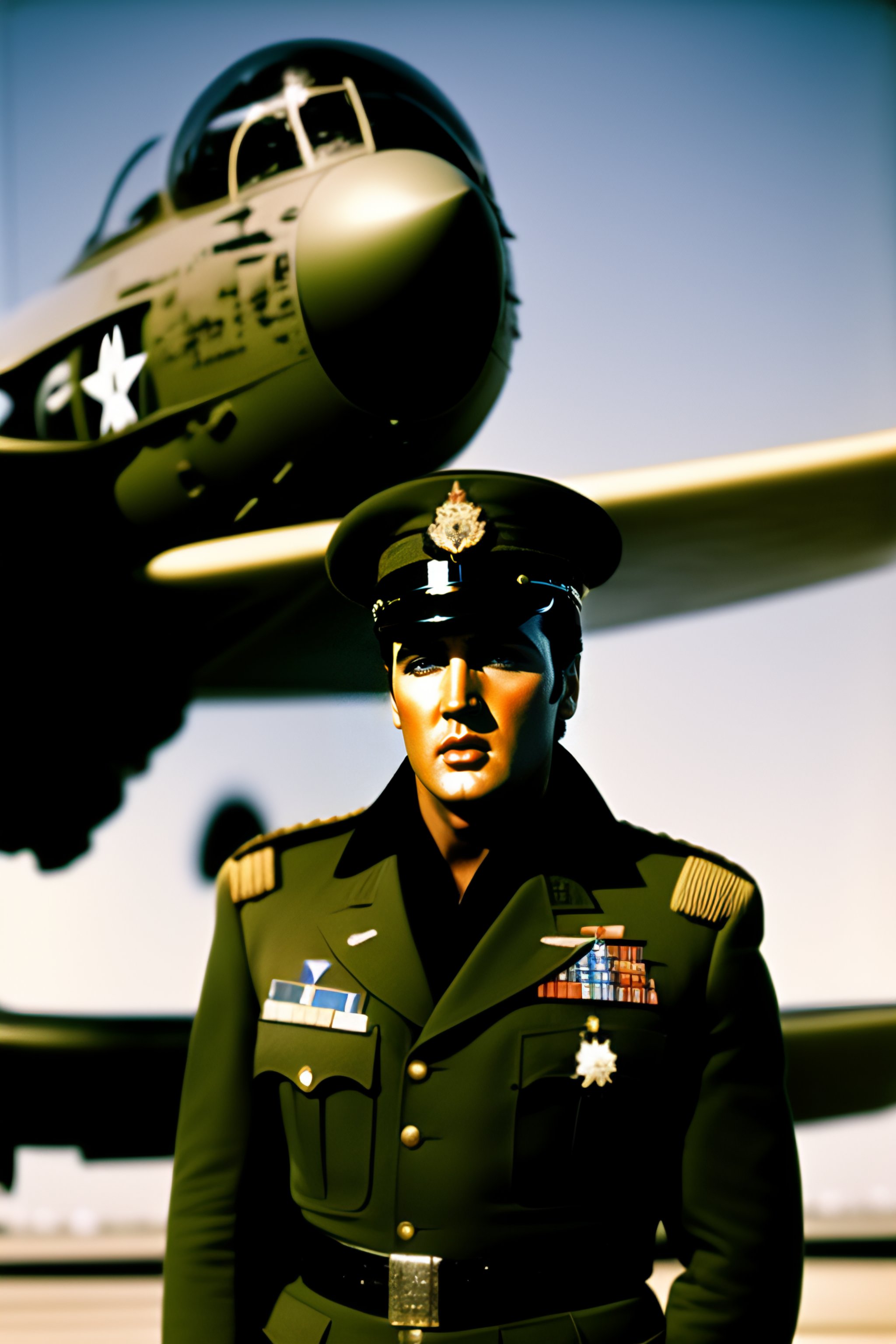 Elvis dressed in military pilot uniform standing near a world war 2 dauntiless fighter plane