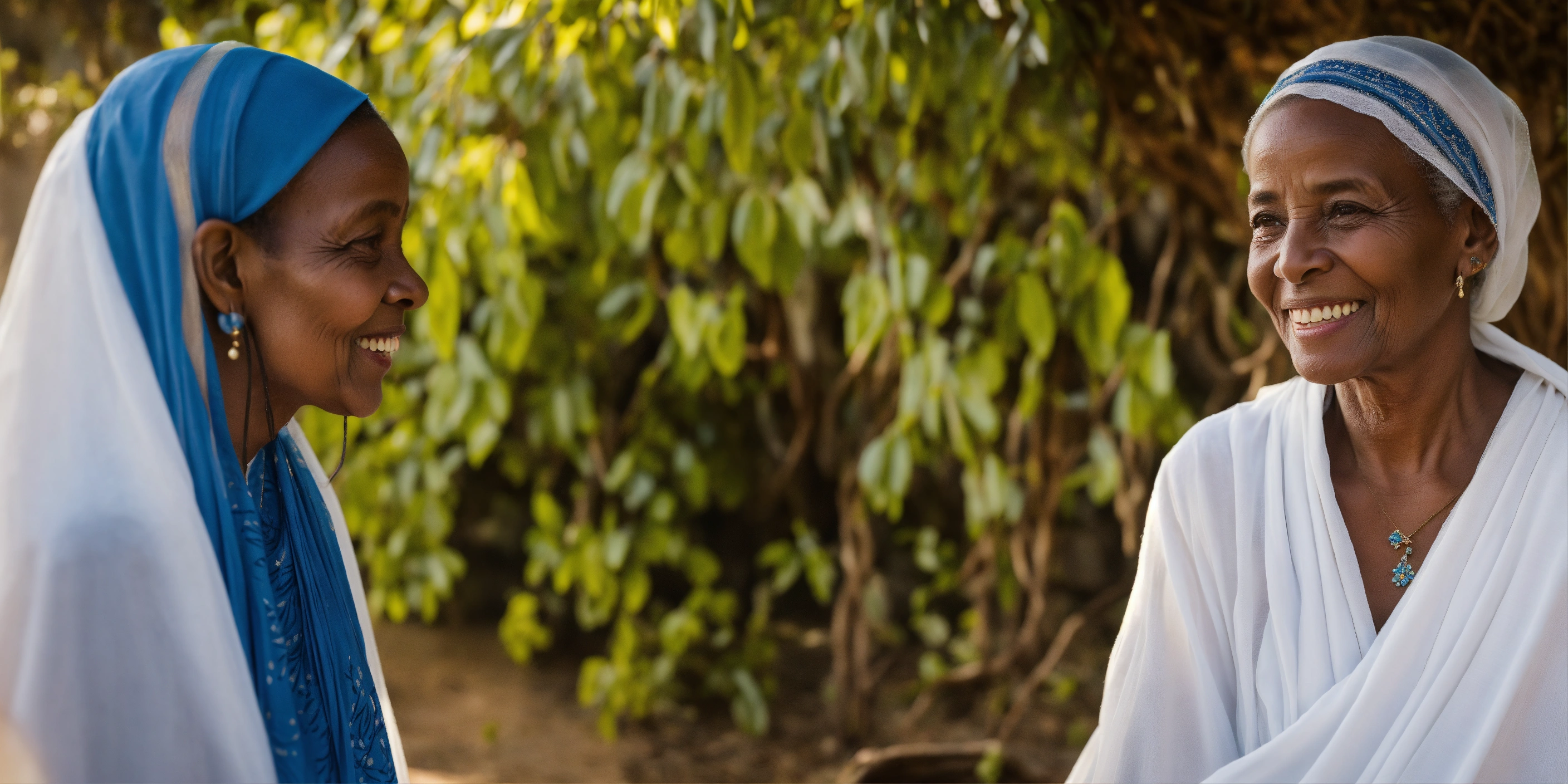 Illustrate a picture of 2 women. one is young and the other is old. the young woman is a pretty, young 14-year-old ethiopian black woman. she is wearing a white garment with a simple white cotton veil with a blue stripe. she has a kind, pious face. the old woman is a 70-year-old ethiopian black standing near a table. anna is wearing a simple pleated cotton garment and veil with blue stripes on its edge and white natural fringes. the 70-year-old lady has a kind, trusting, and joyful face. they look at each other with joy and happiness. they are in a pretty temple. fantasy. photorealistic 8k