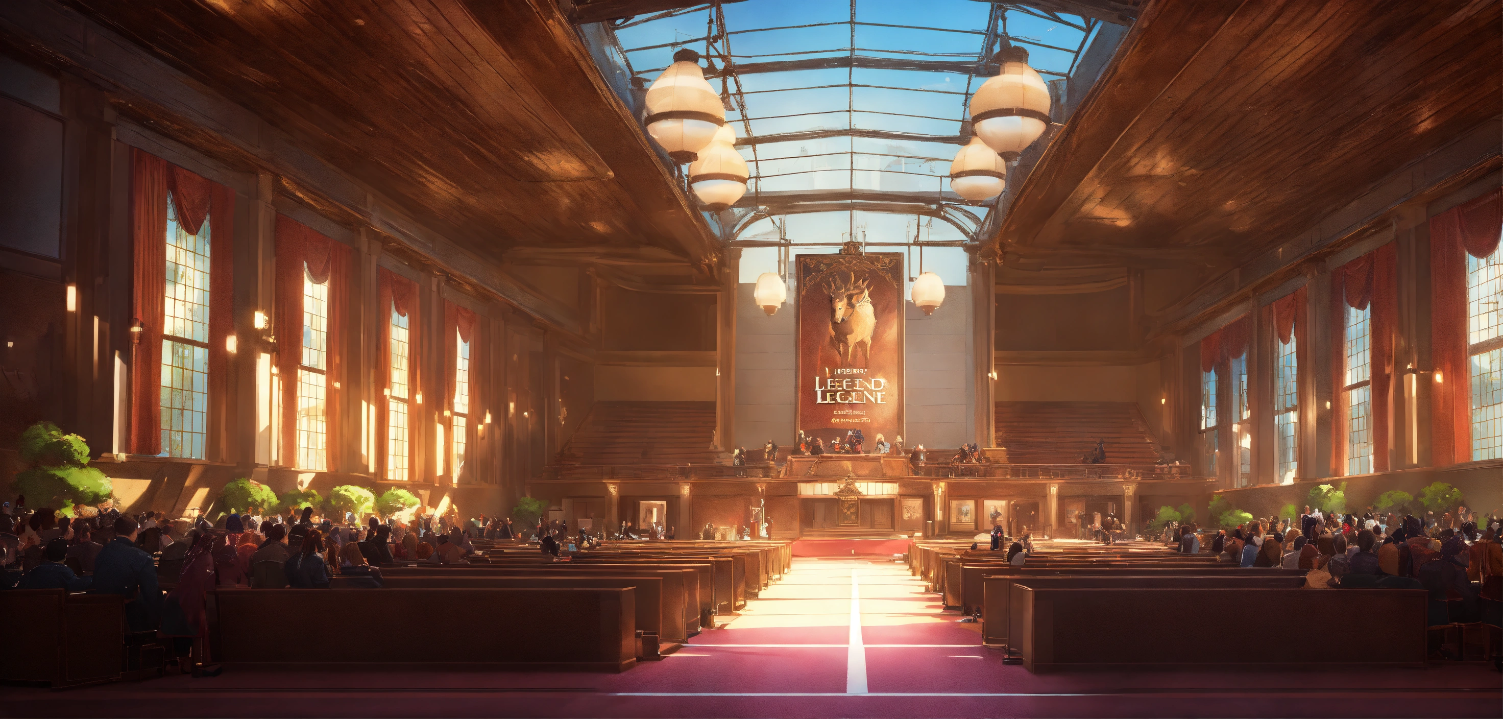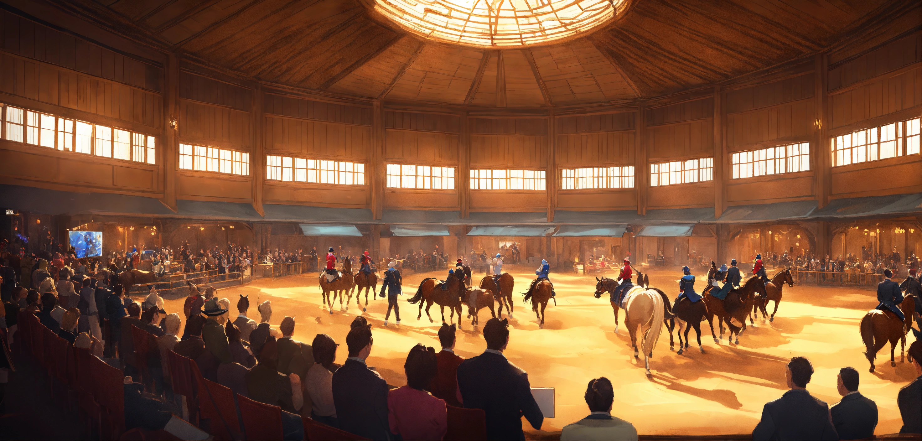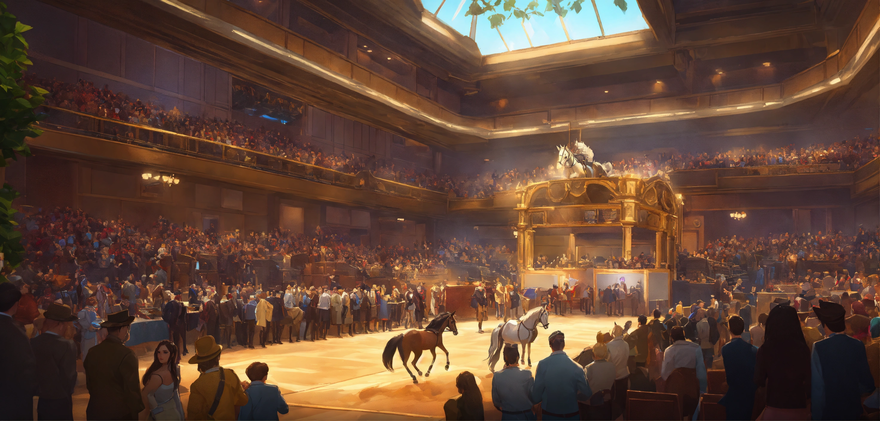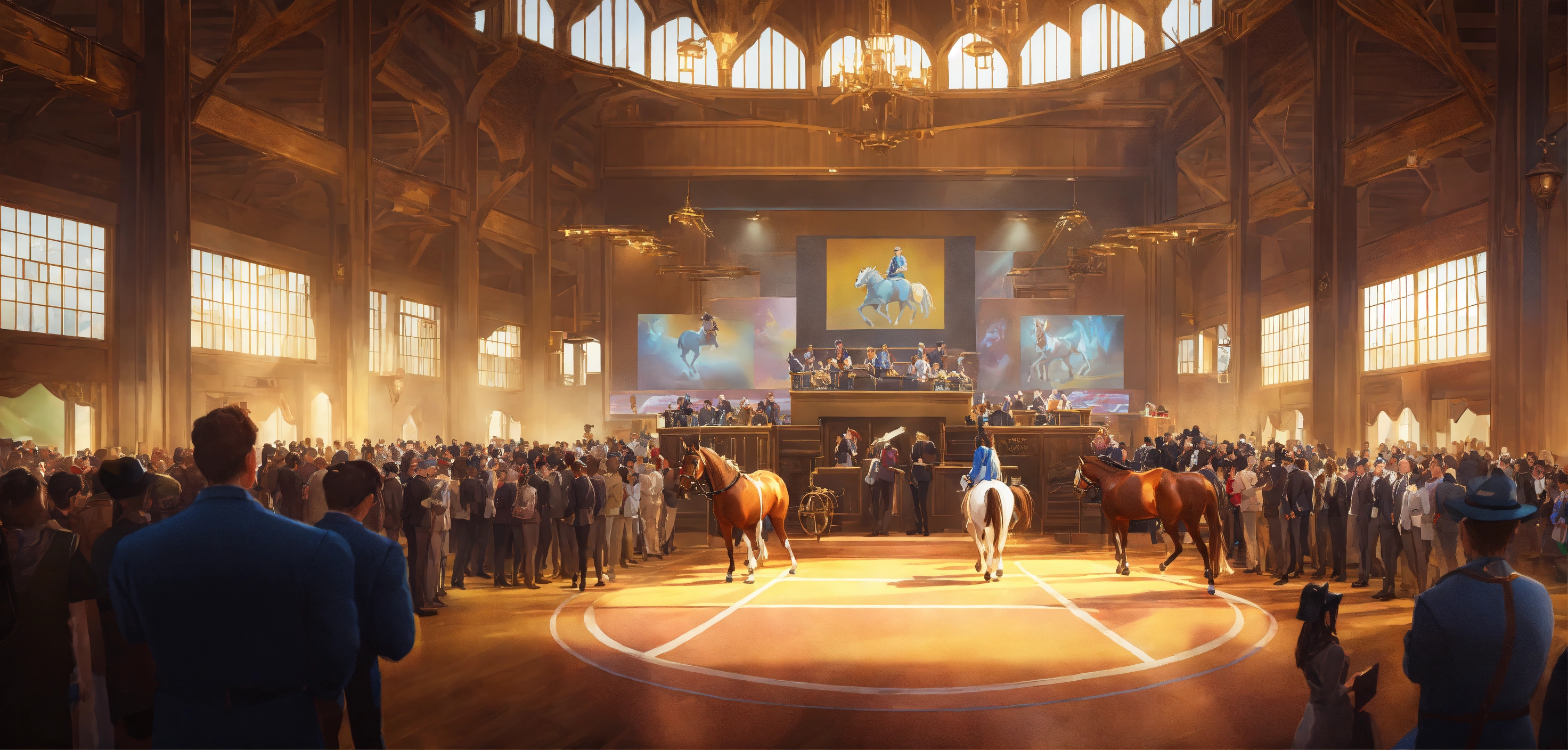 A highly detailed league of legend dynamic illustration of the horse auction in modern event hall, by joshua raphael, by artgerm, by huyy nguyen, by cj xander, by jennifer wuestling, by diep duong van, by huyy nguyen, by grafit studio, volumetric lighting, 3d render, 4k resolution, trending on artstation, masterpiece, close up frame, cinematic shot, sport competition, epic, keeneland sales, inside hall with stands, lot of armchairs with people, one horse in centre only with light, a windowless hall with a horse stand