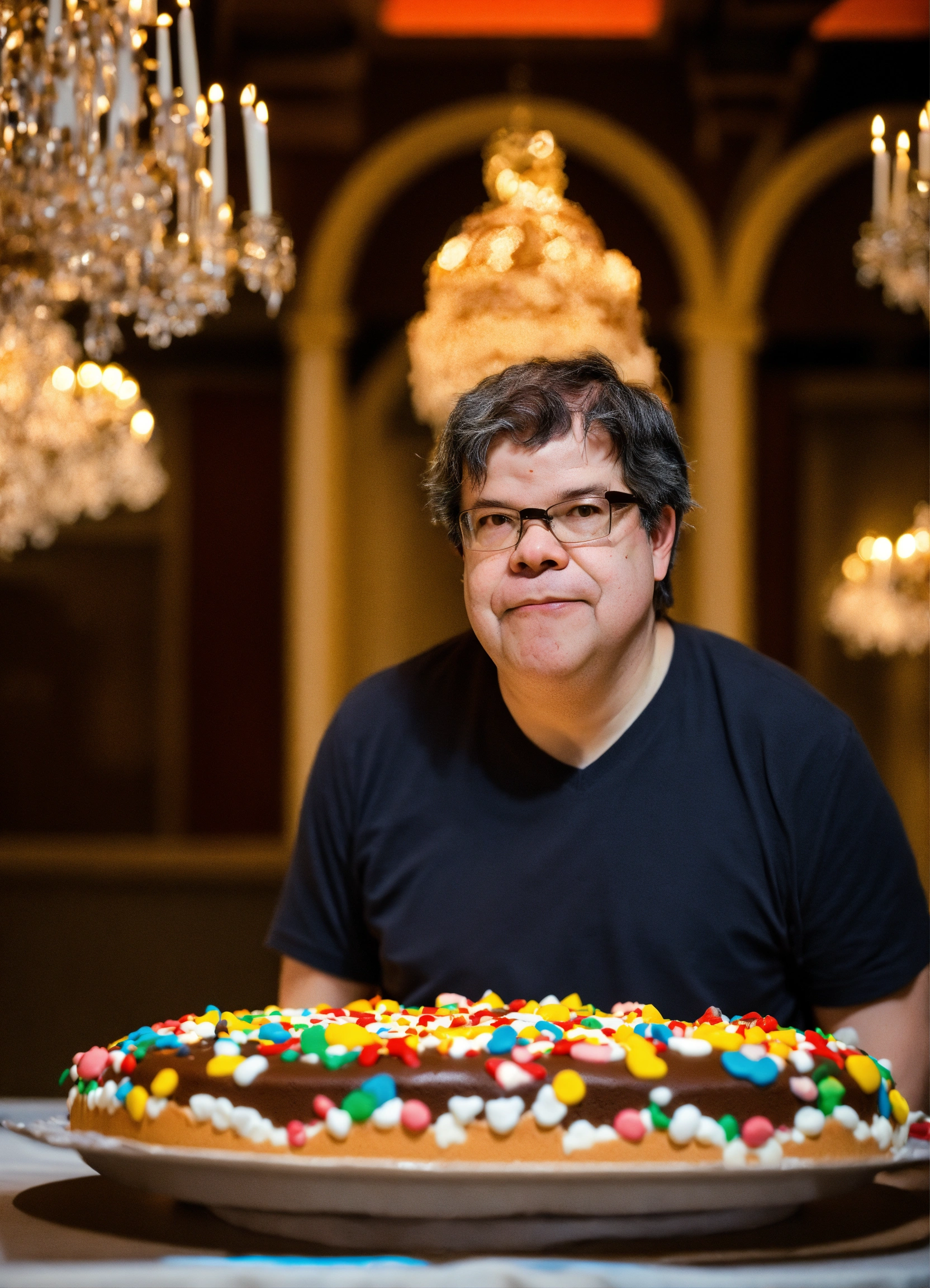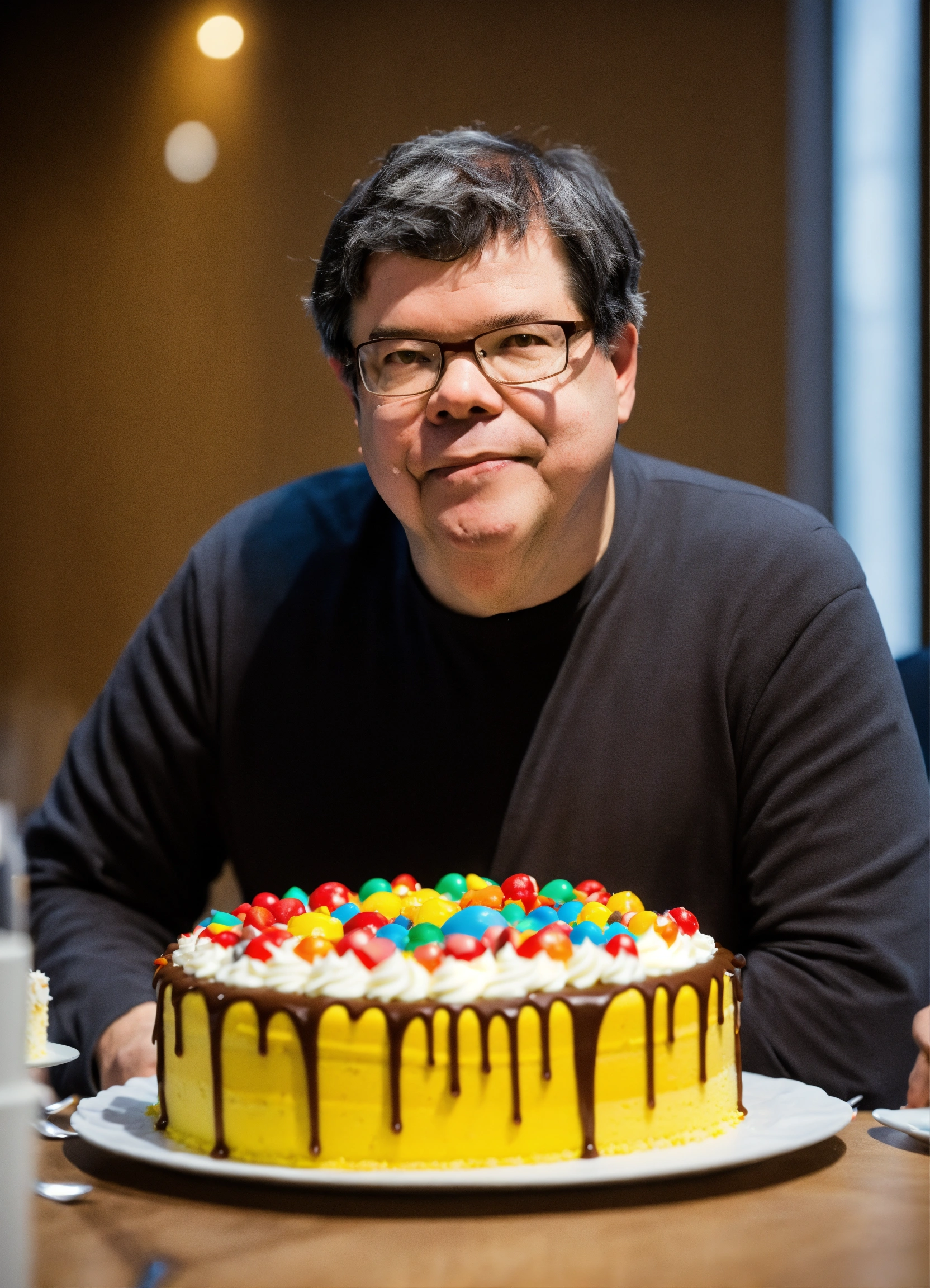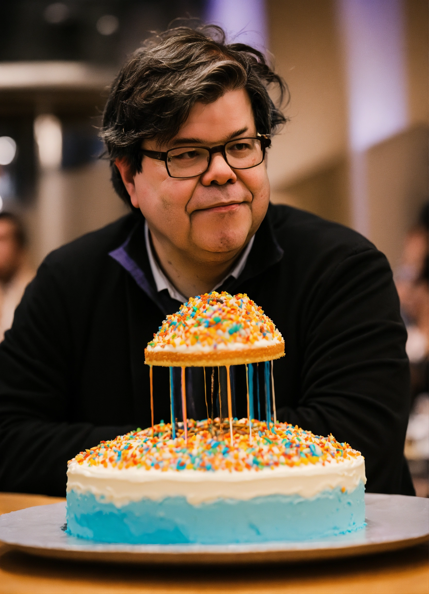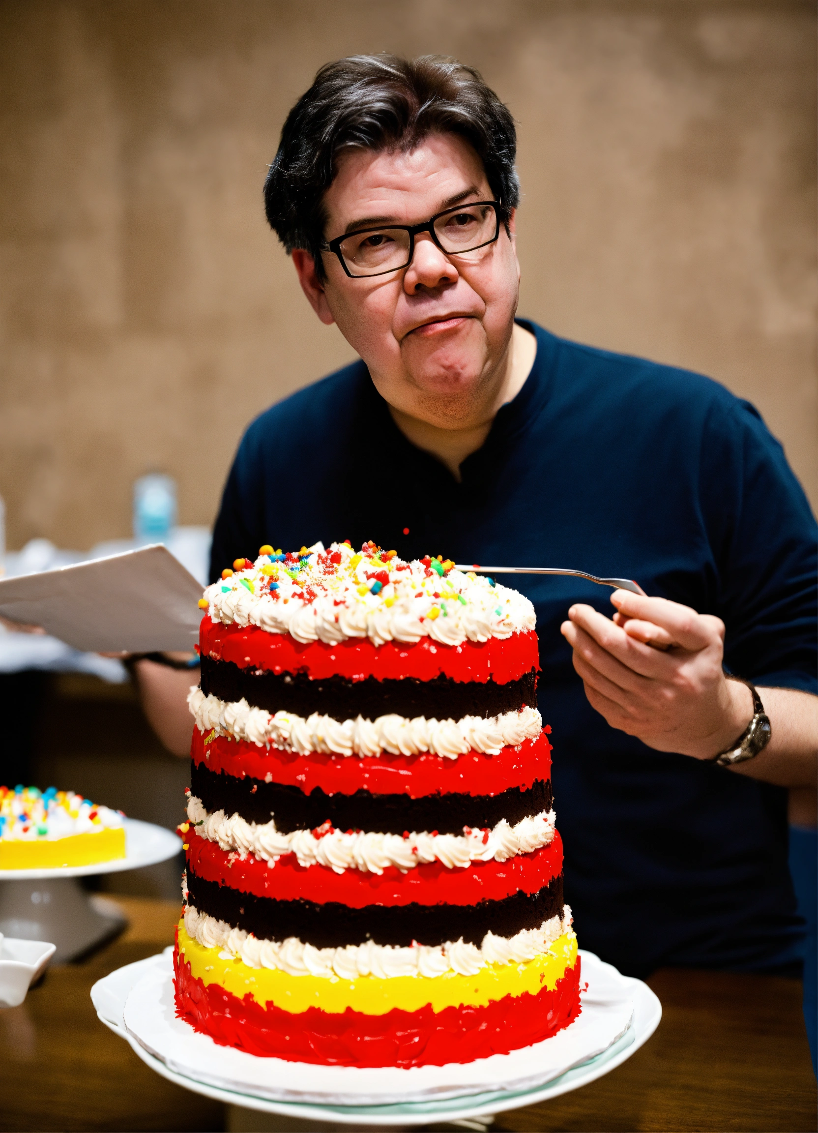 Yann lecun eating a massive cake with the cake next to him
