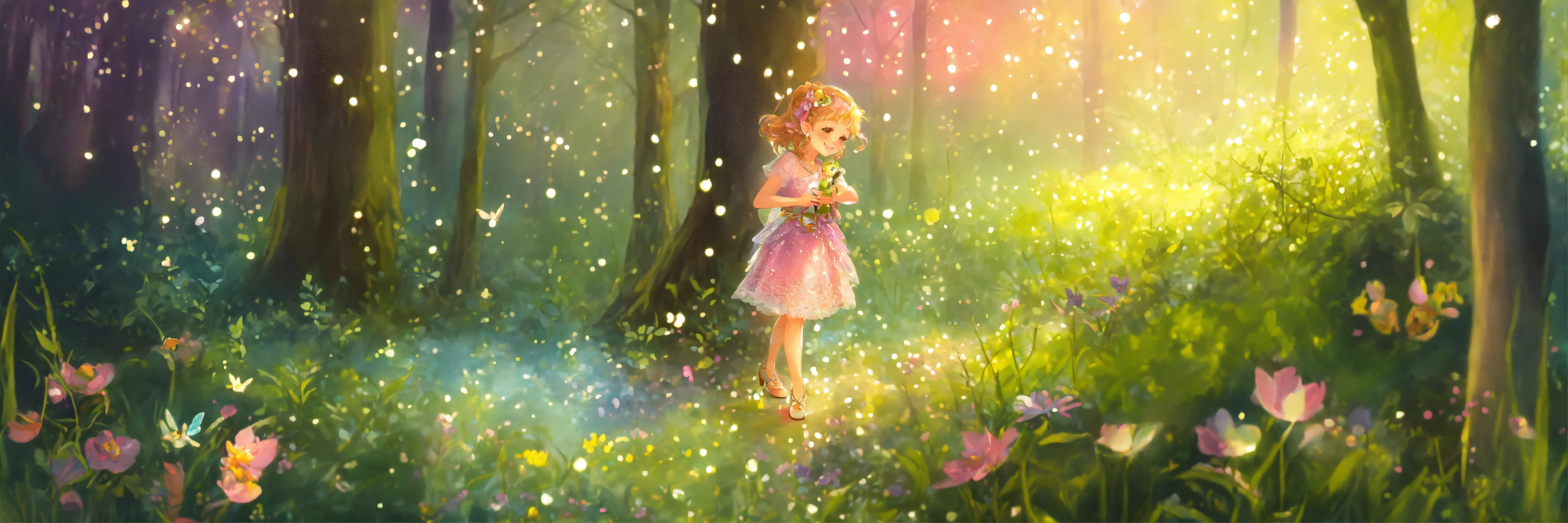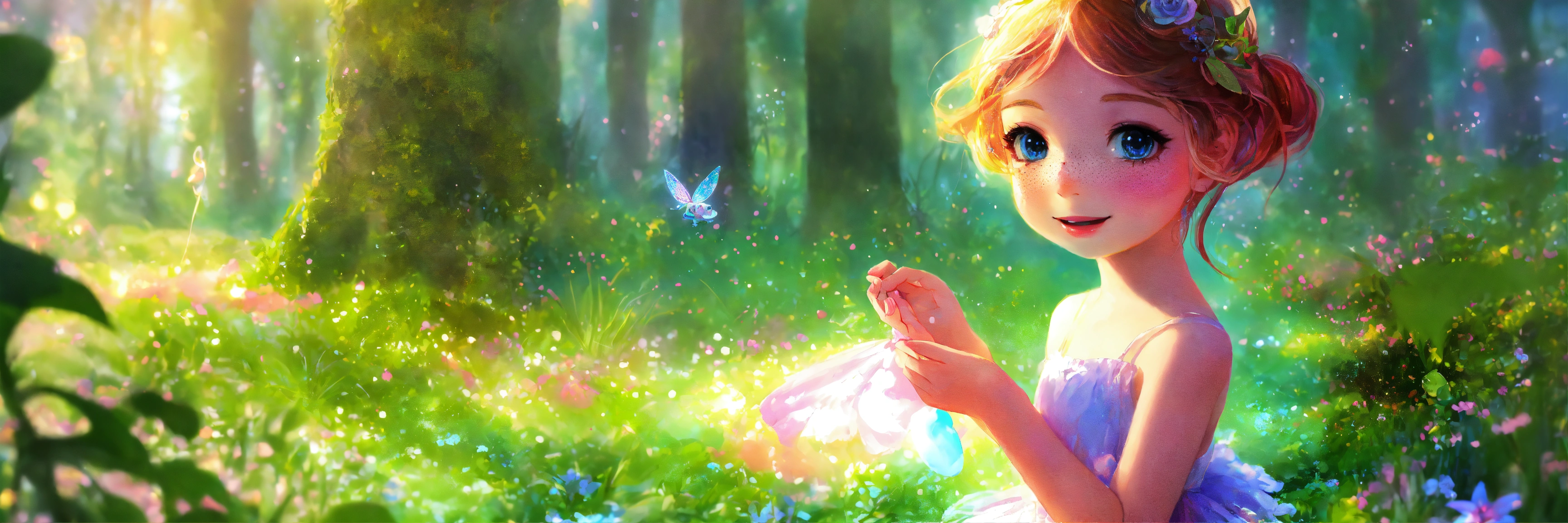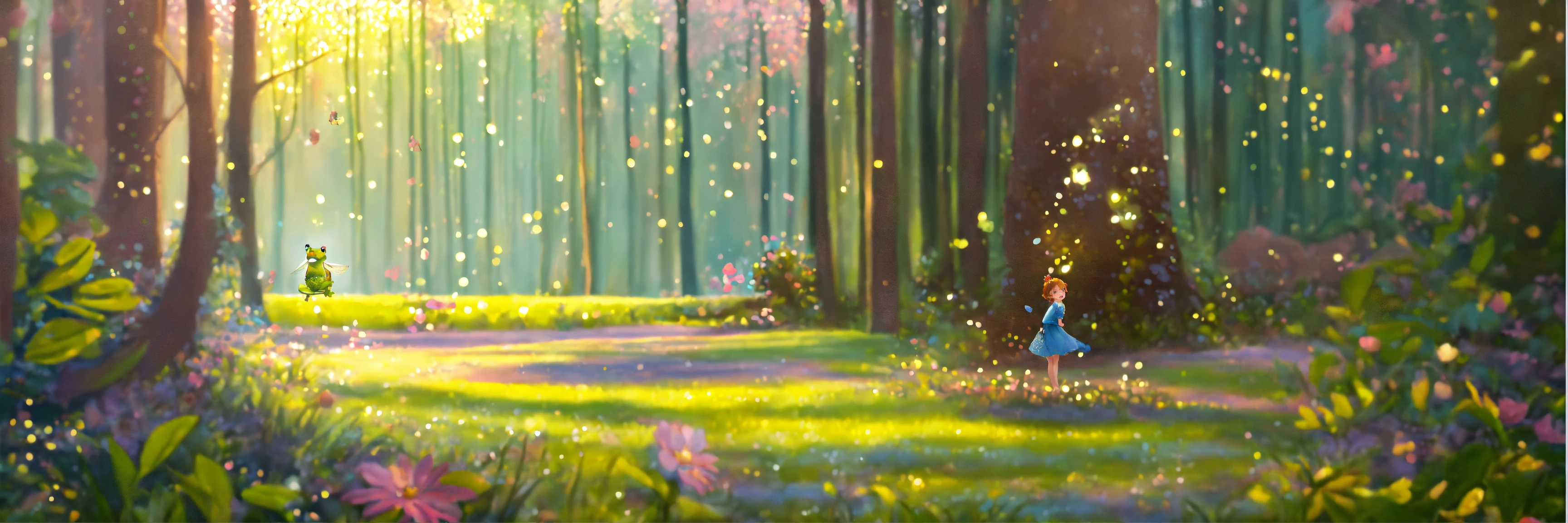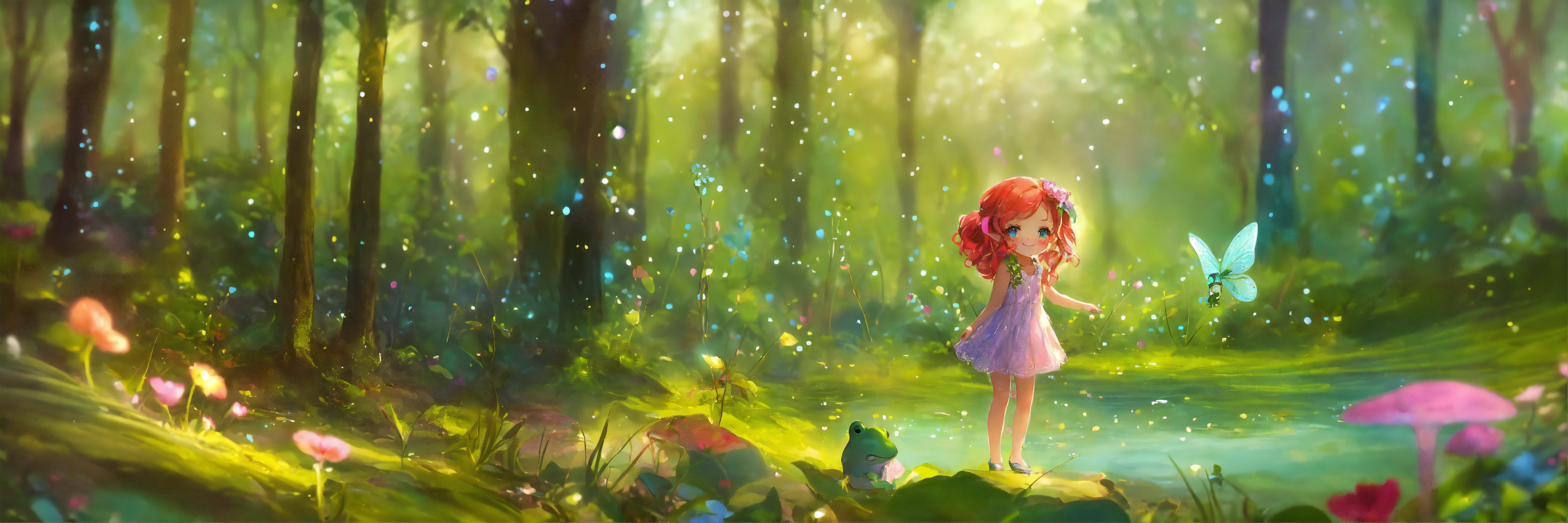 Shabby chic, dreamy, pastel glitter, forest, freckled fairy girl, spinning, magical fairy tale, abstract artistic style. “hello, little frog, ” deyse greeted with a smile. "what a beautiful song you are singing."