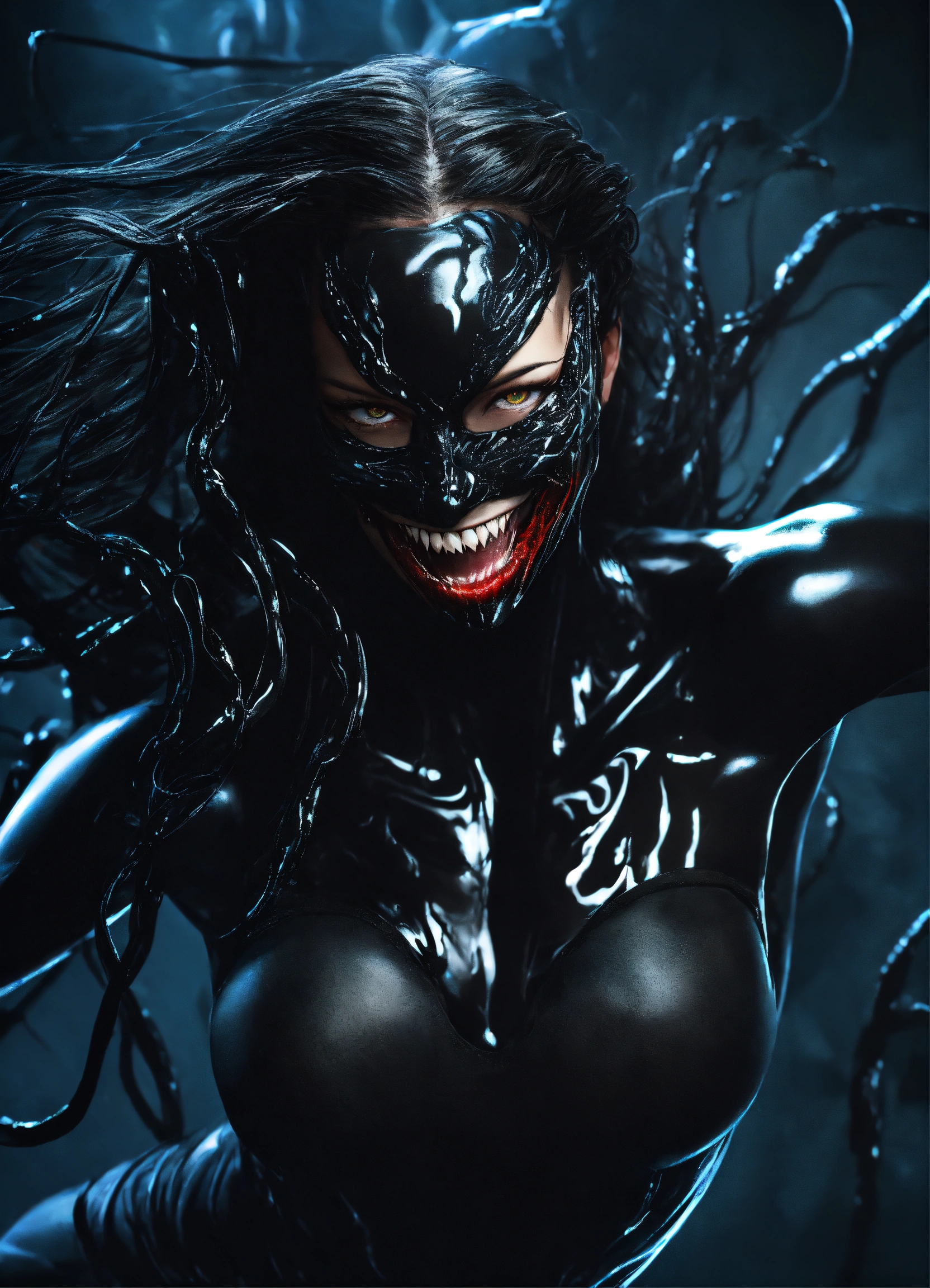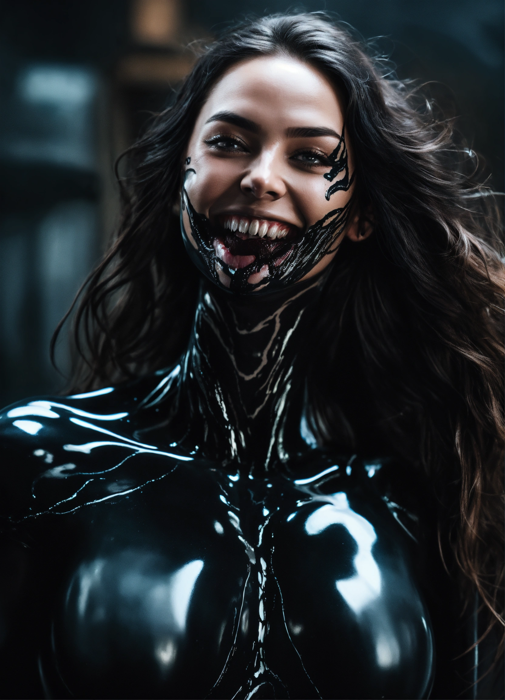 An ultrarealistic photograph of woman transforming venom symbiote, laying in dark black liquid, full body, long hair, evil smile, evil glowing eyes, venom symbiote on skin, liquid short top, liquid short pants, venom symbiote, 8k